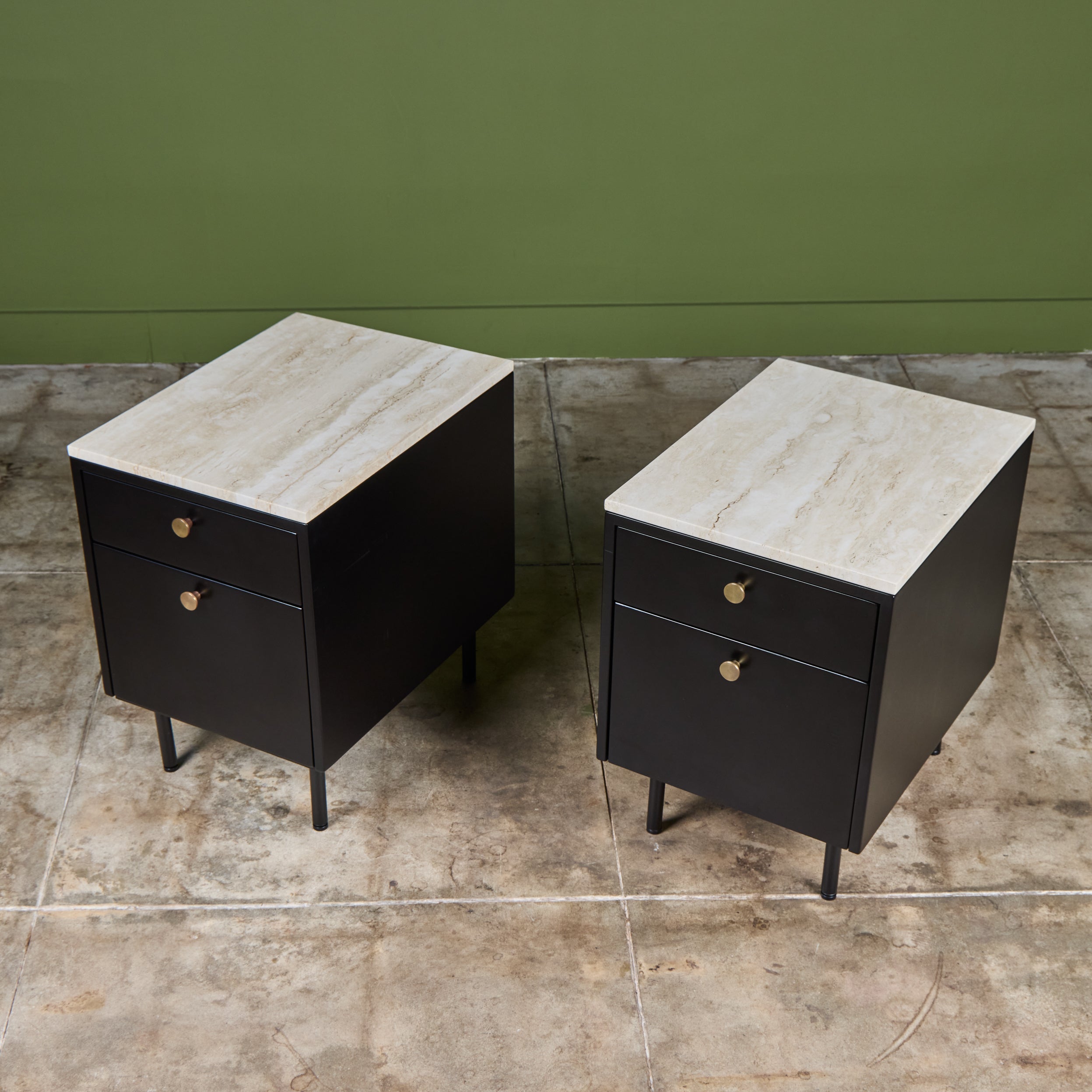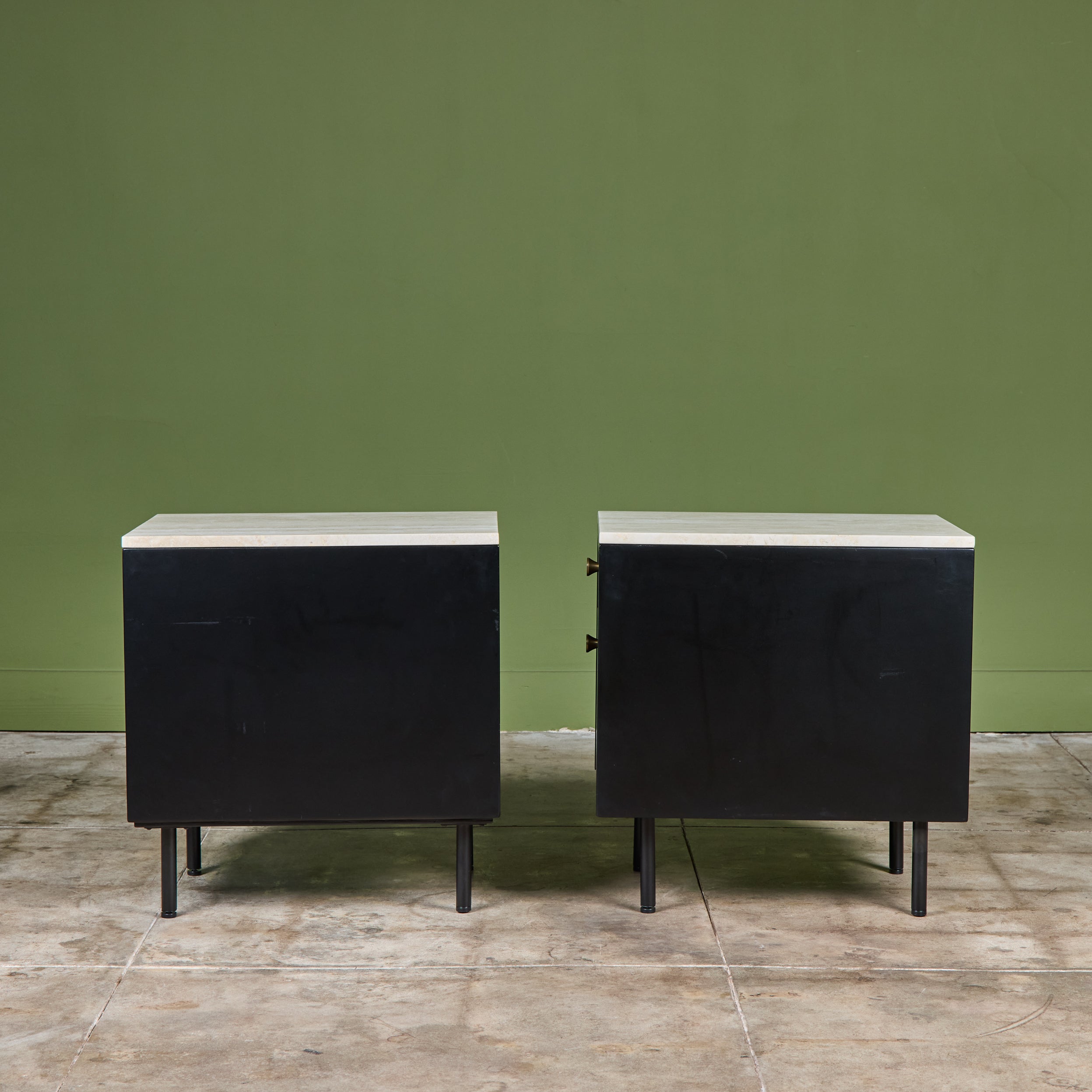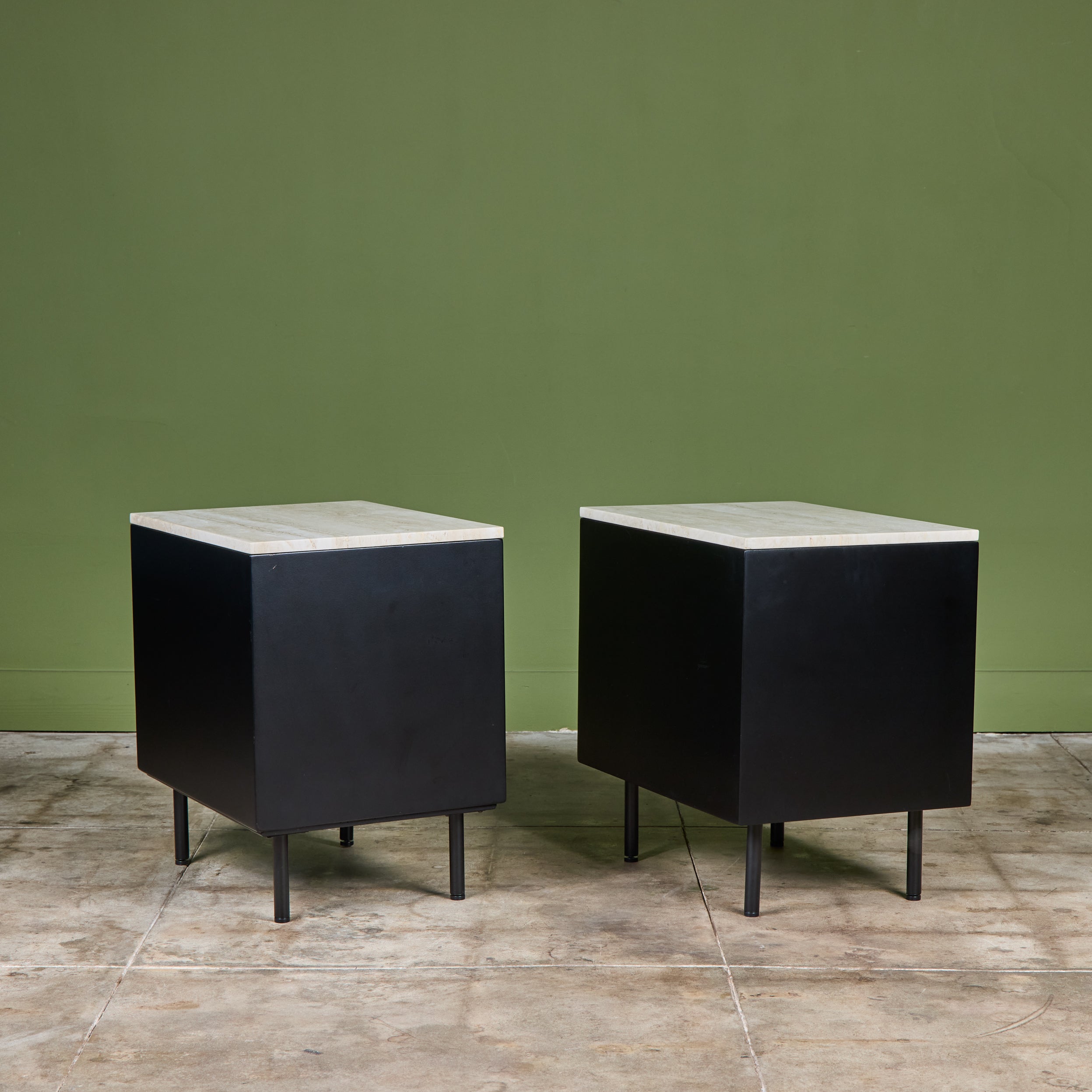 Pair of Black Lacquered Nightstands with Travertine Table Tops