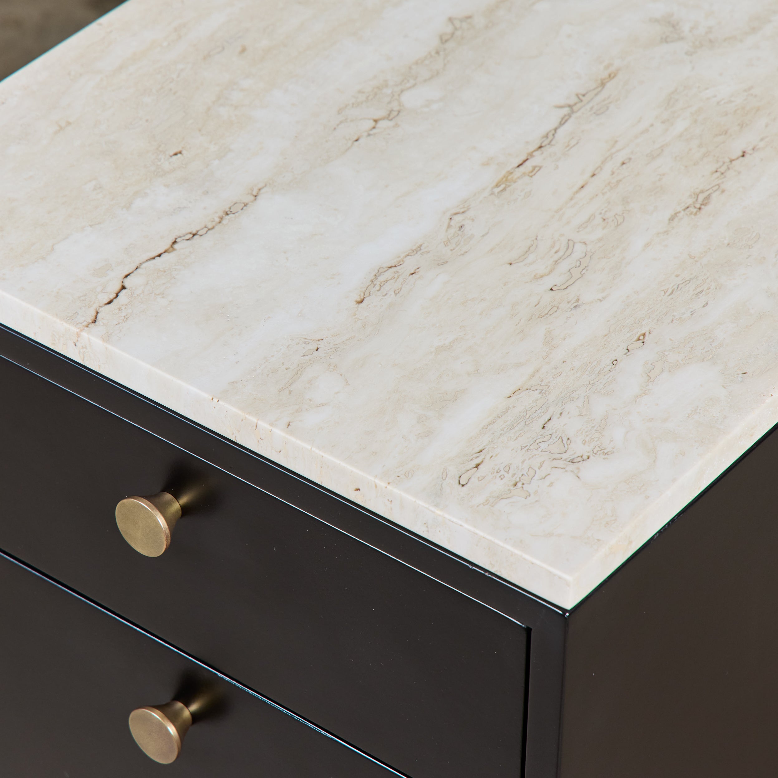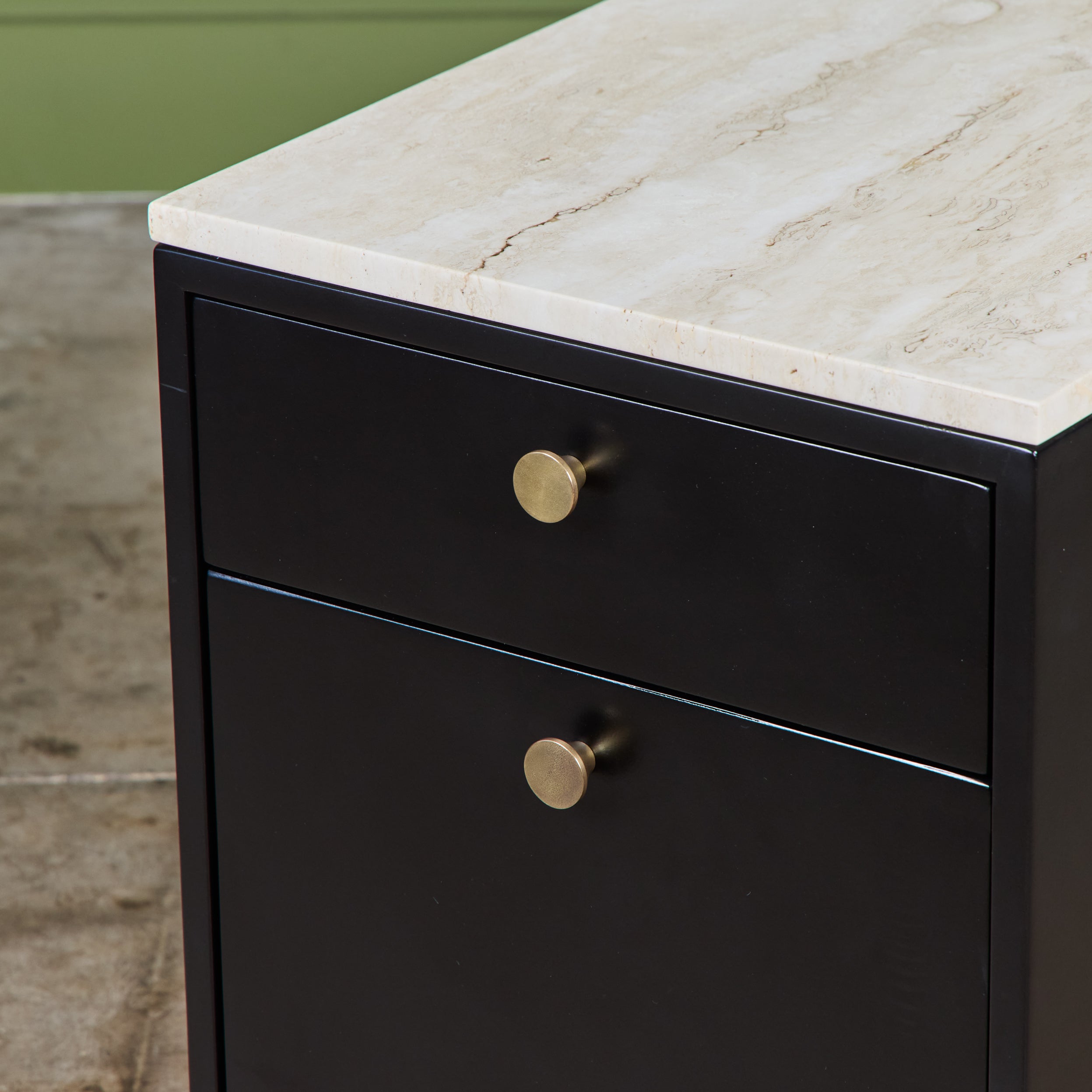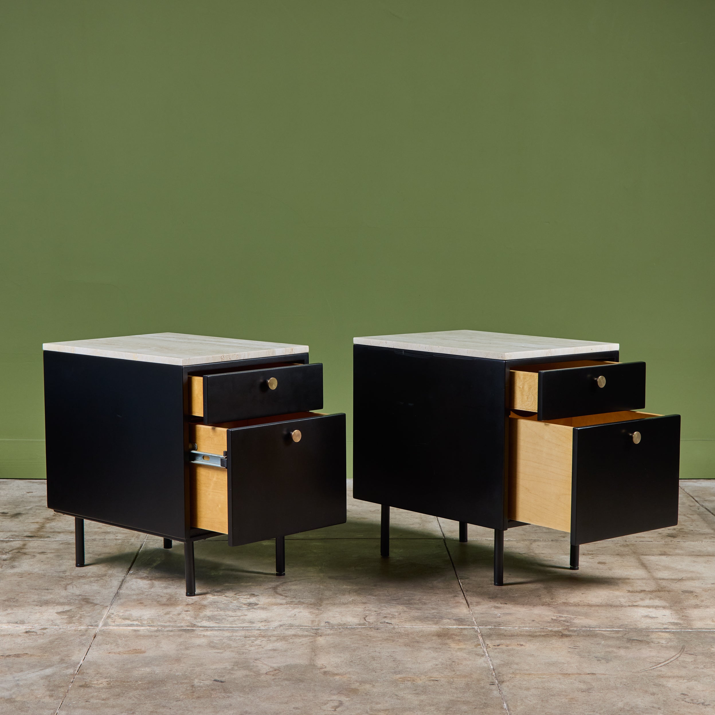 Pair of Black Lacquered Nightstands with Travertine Table Tops