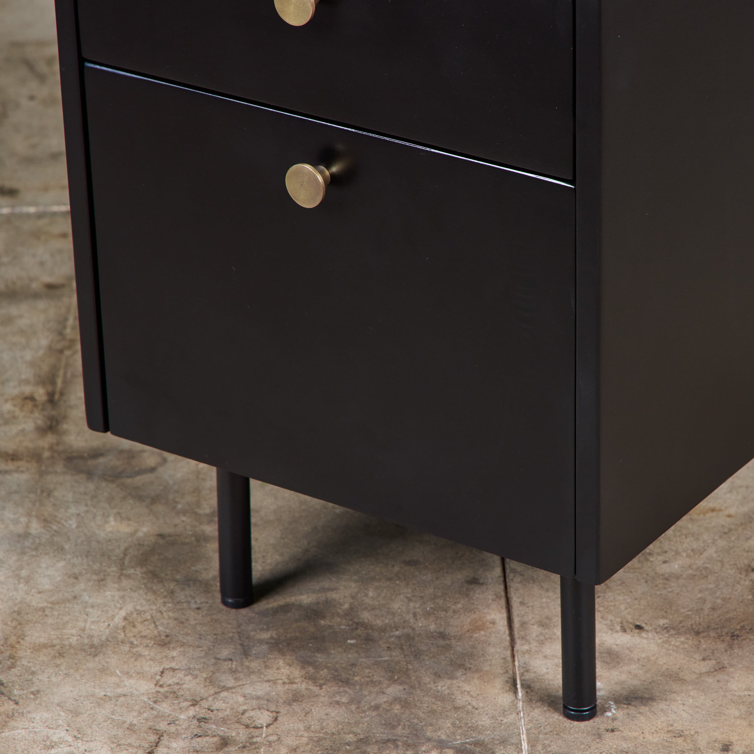 Pair of black lacquered nightstands feature two drawers, an upper shallow drawer and a lower depper drawer. Each nightstand has brass knobs and travertine stone table tops.