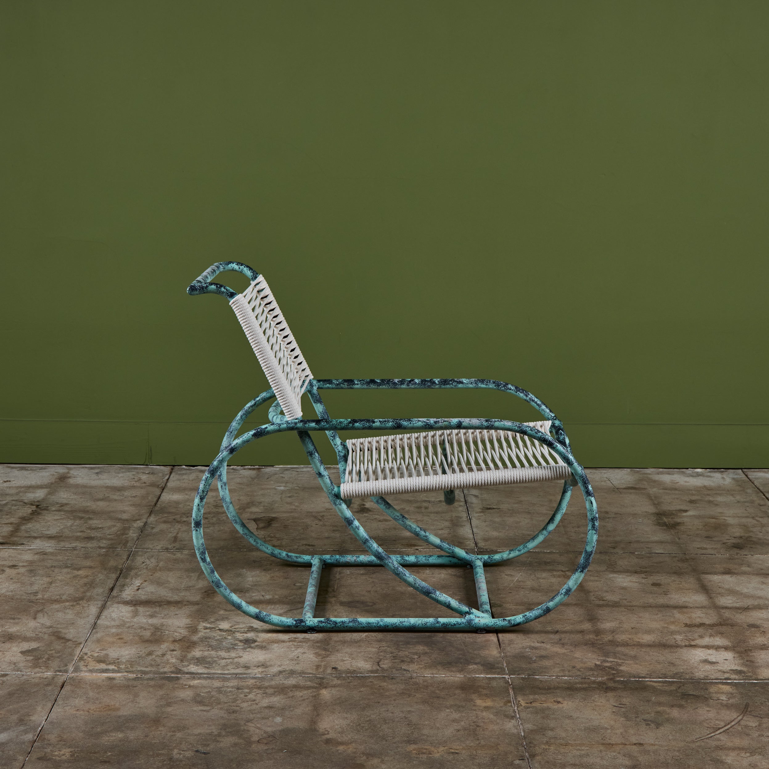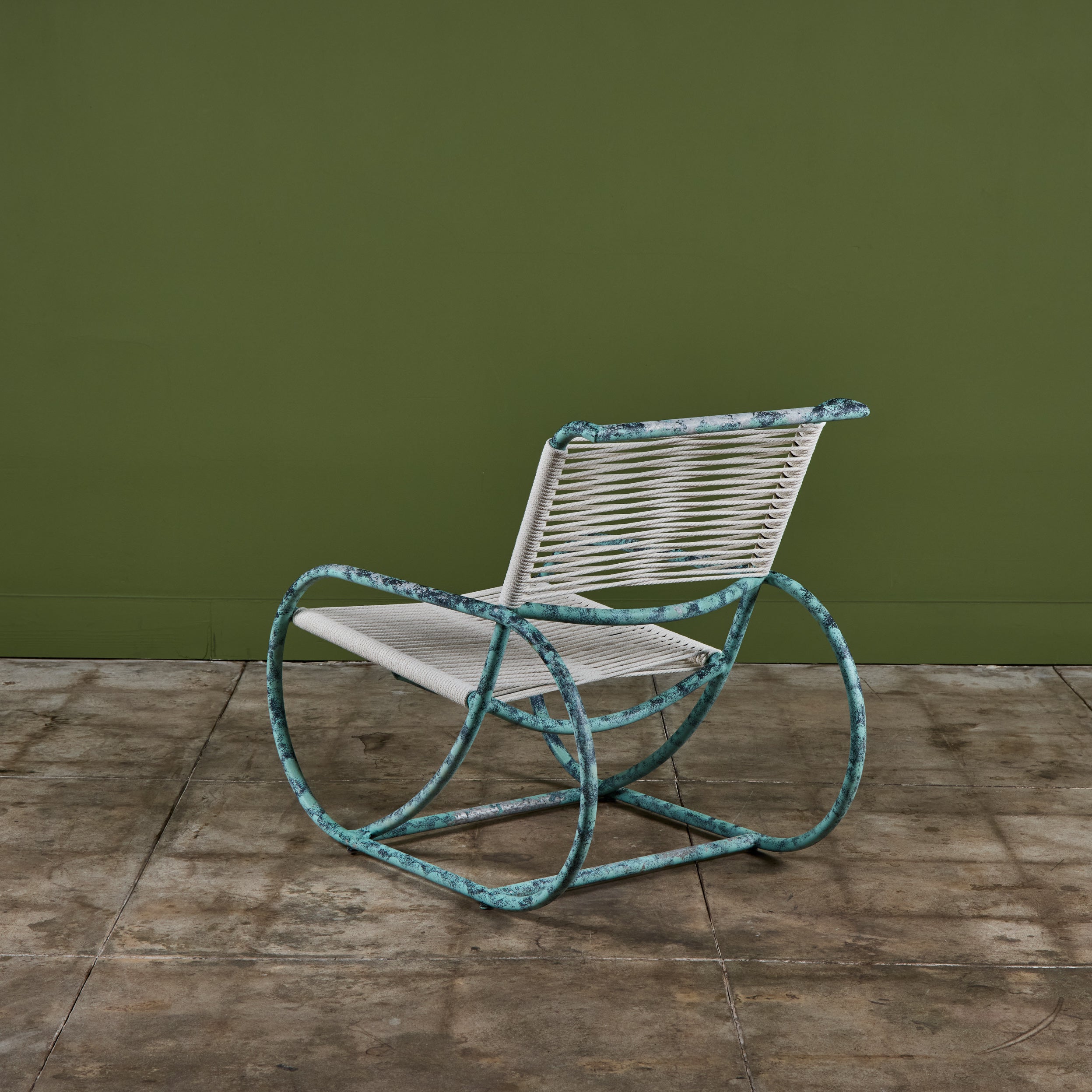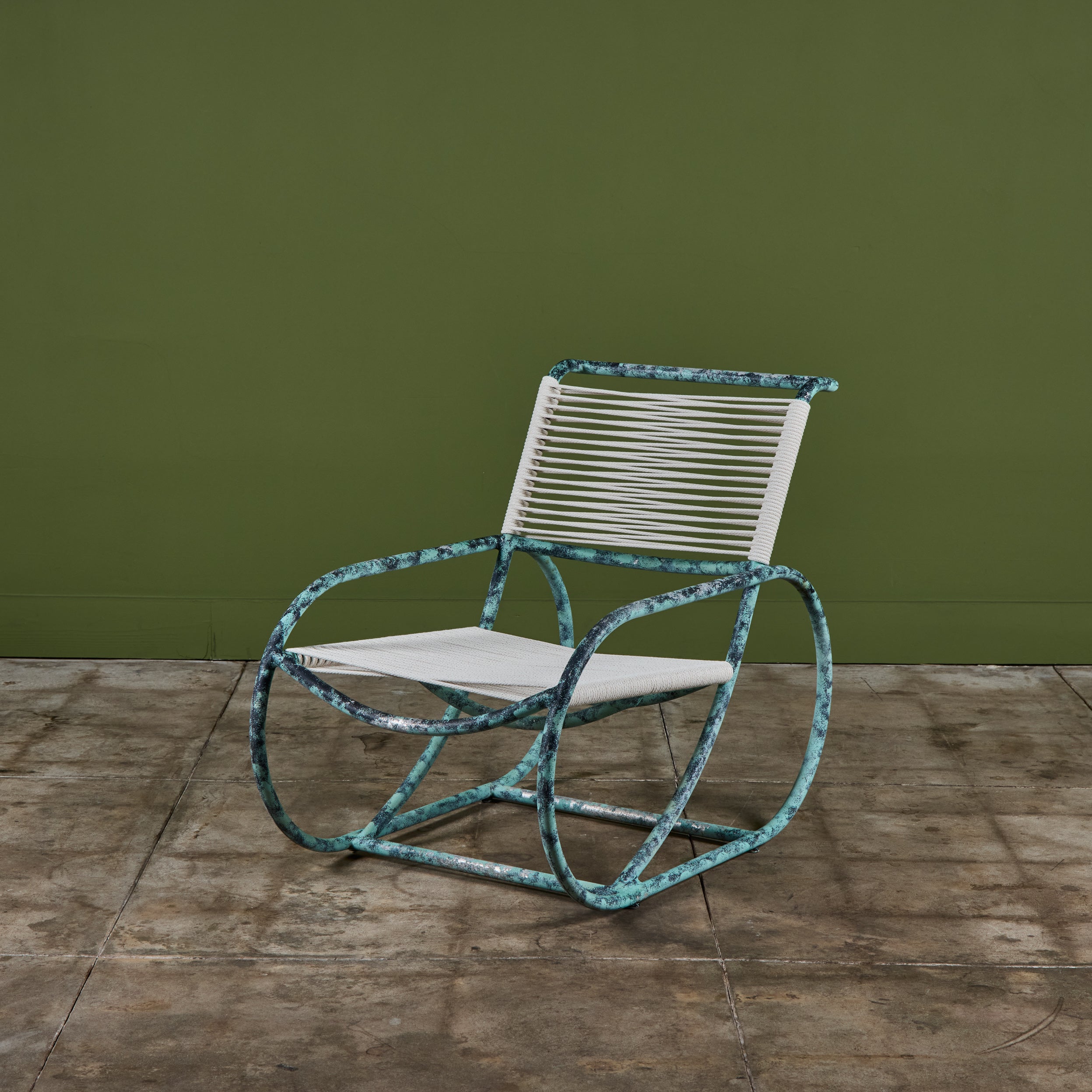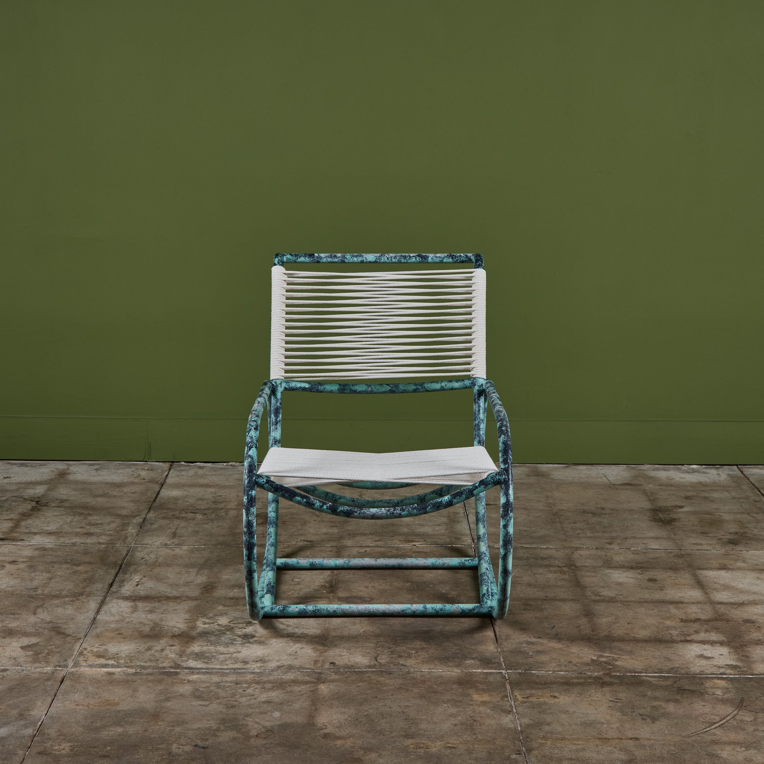 Lounge chair by Kipp Stewart for Terra of California, USA, c.1970s. The lounge chair features an aluminum tube frame with applied faux patina and new cotton rope that has been woven to the same pattern and specification as was originally on the chair when it was produced.
