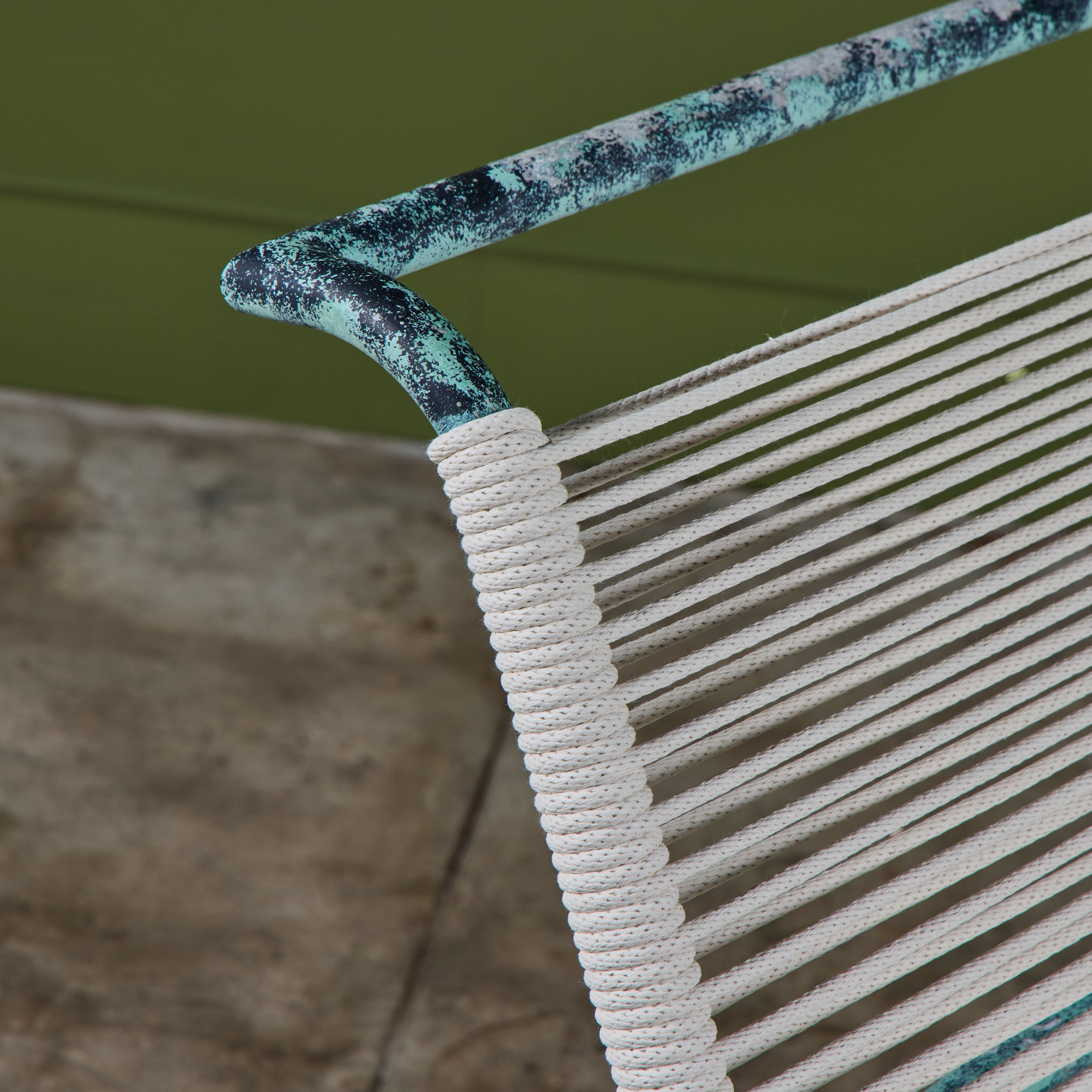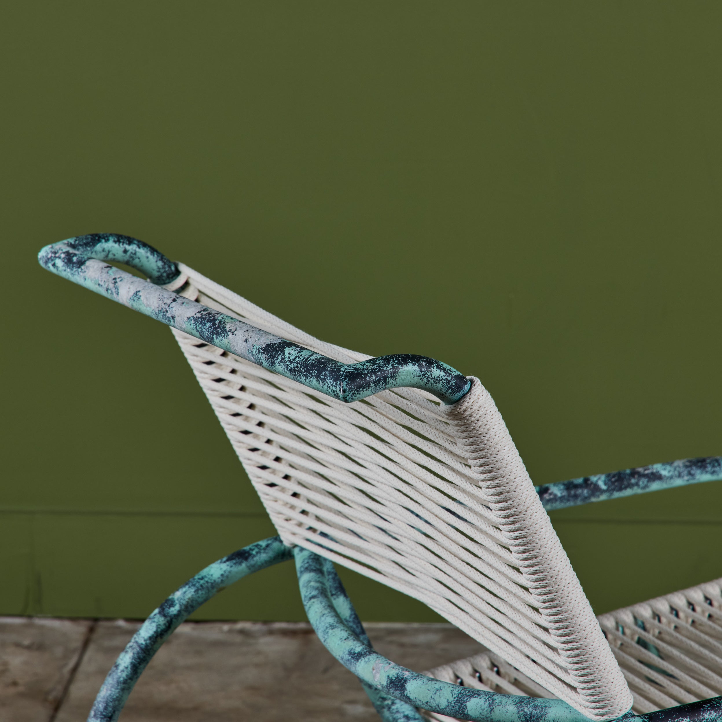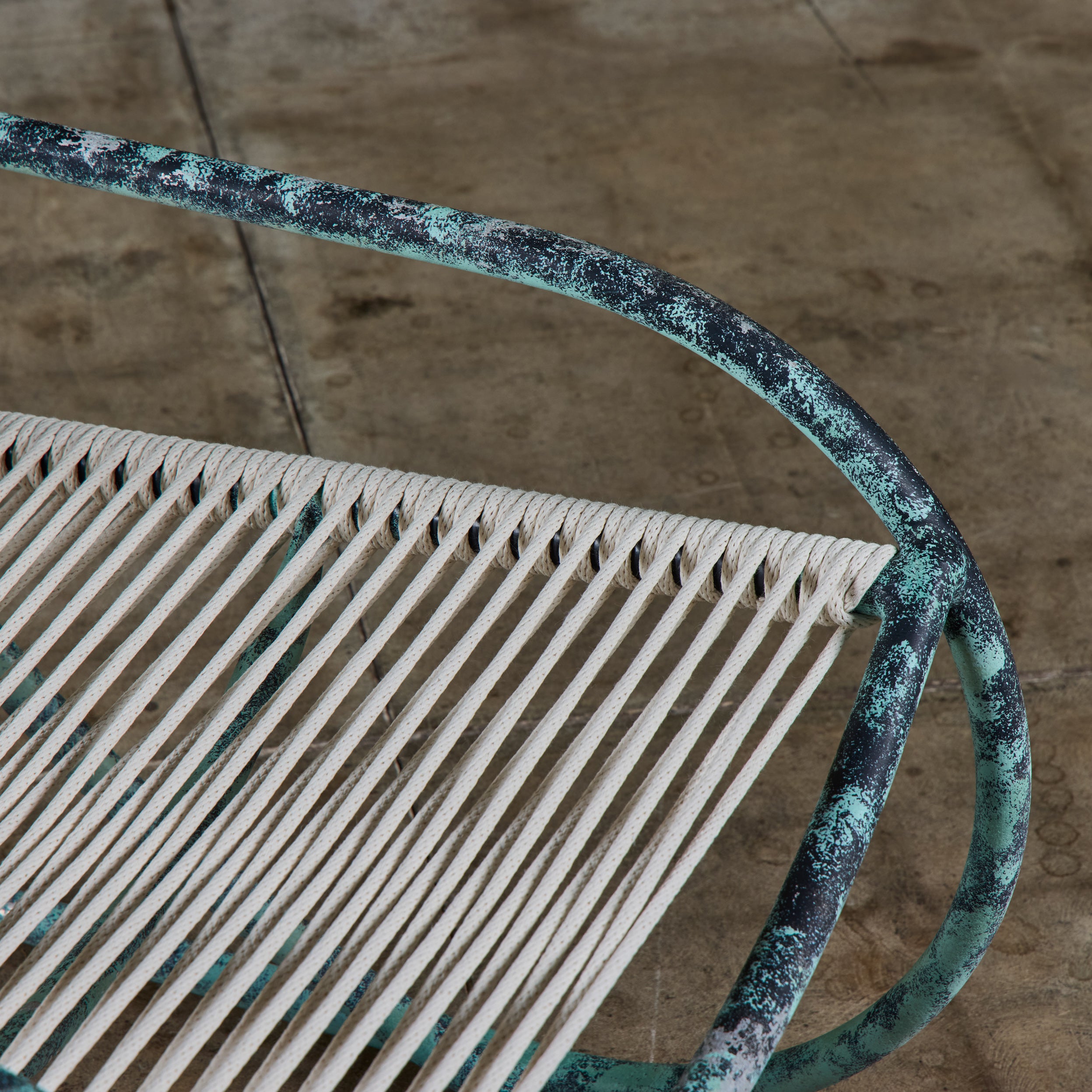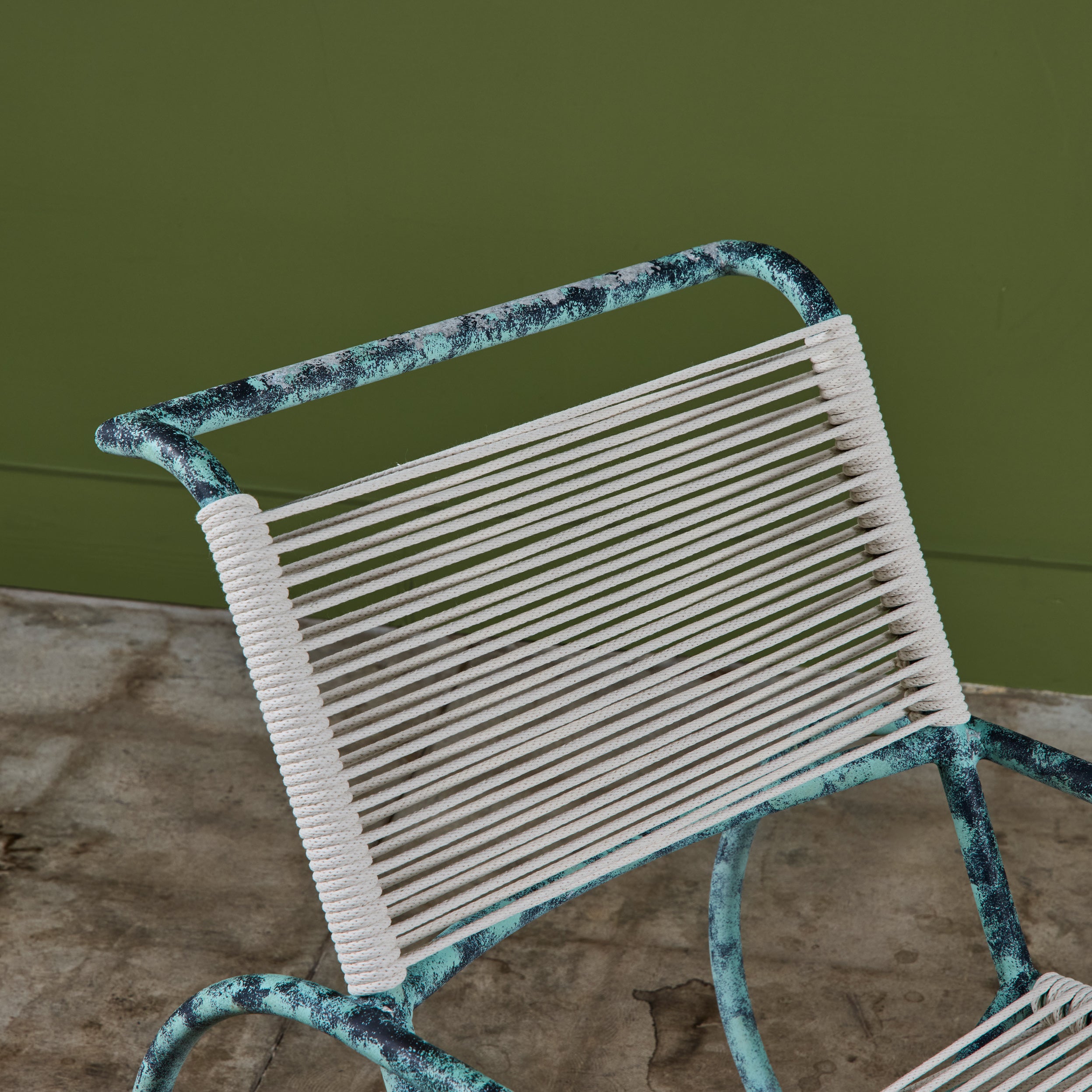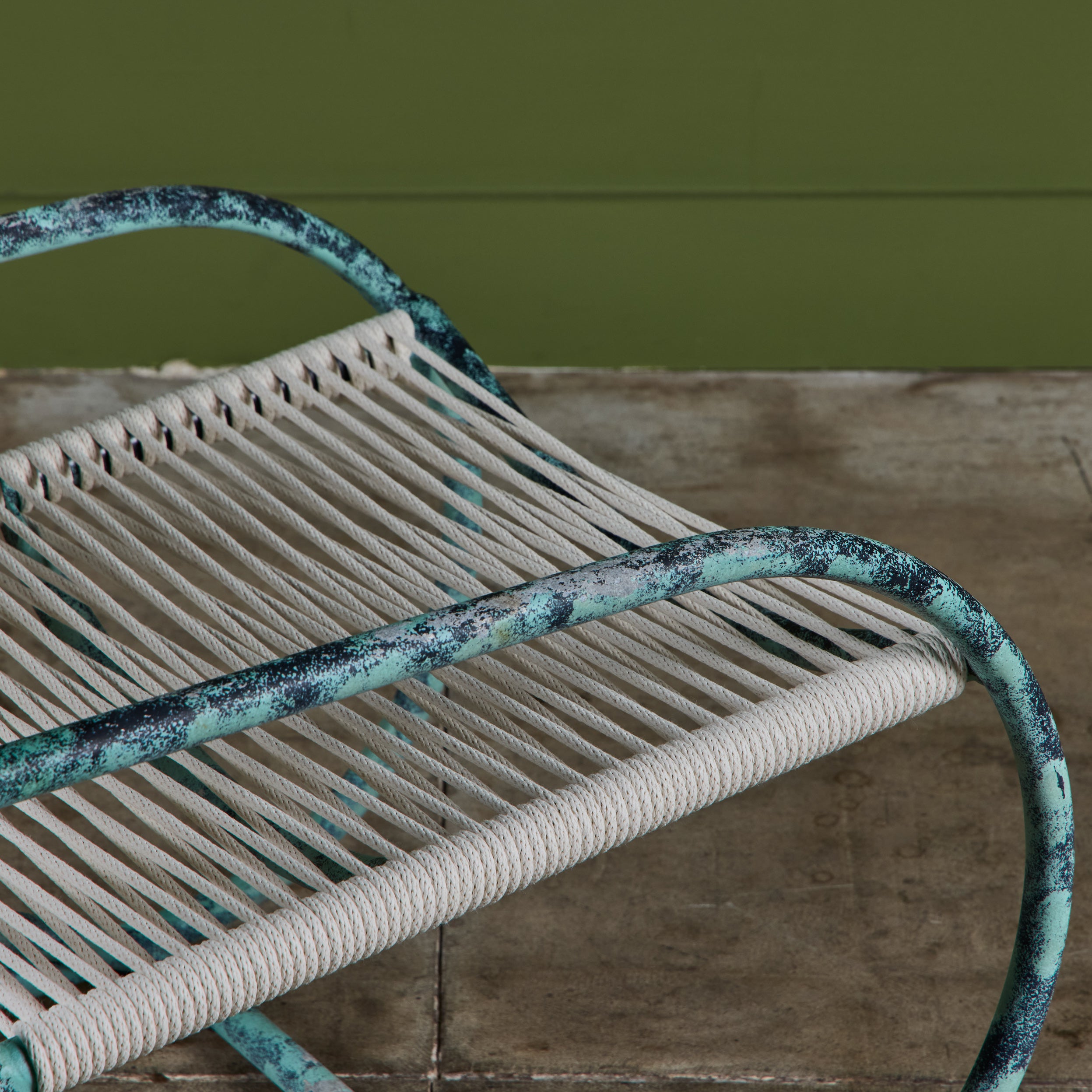 Lounge chair by Kipp Stewart for Terra of California, USA, c.1970s. The lounge chair features an aluminum tube frame with applied faux patina and new cotton rope that has been woven to the same pattern and specification as was originally on the chair when it was produced.