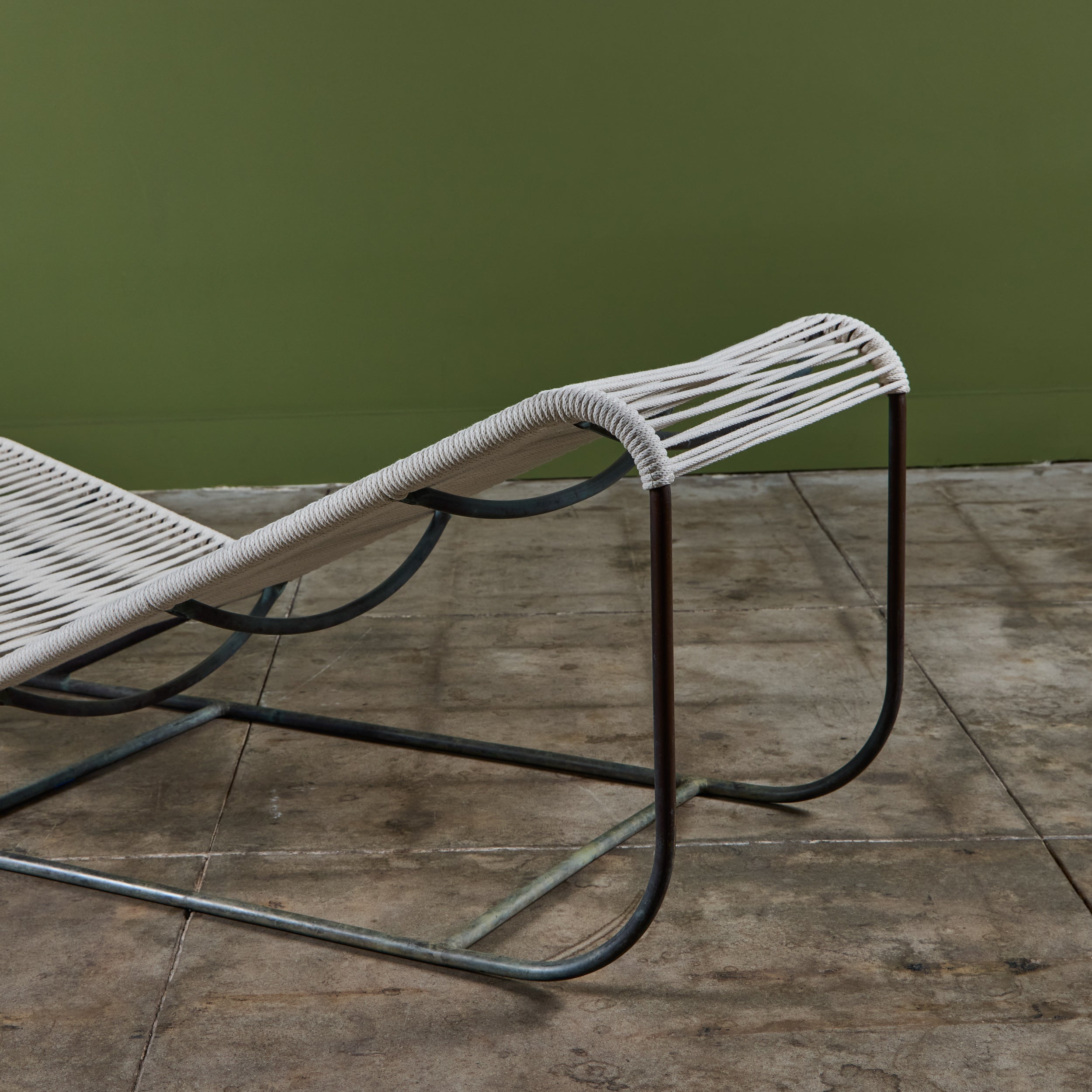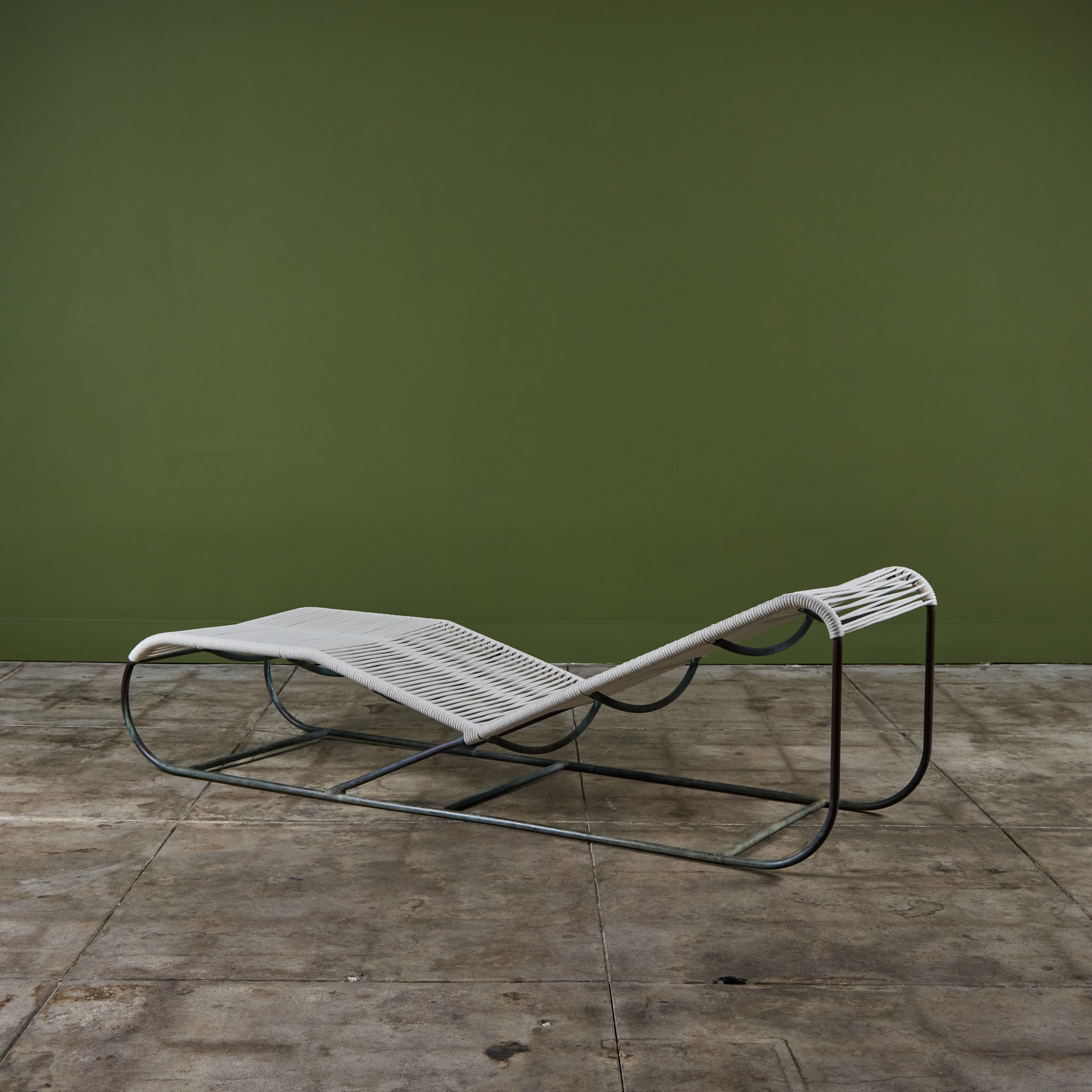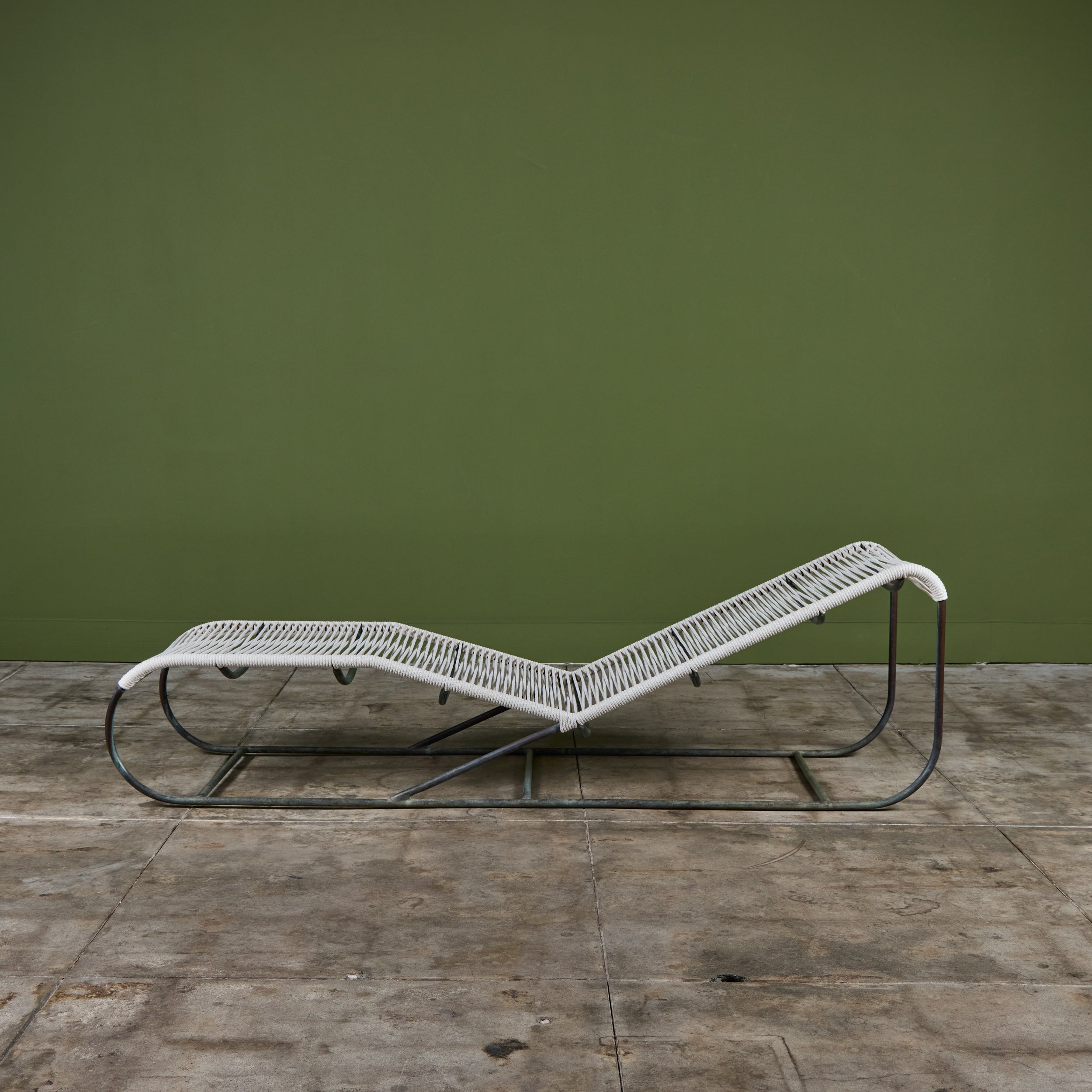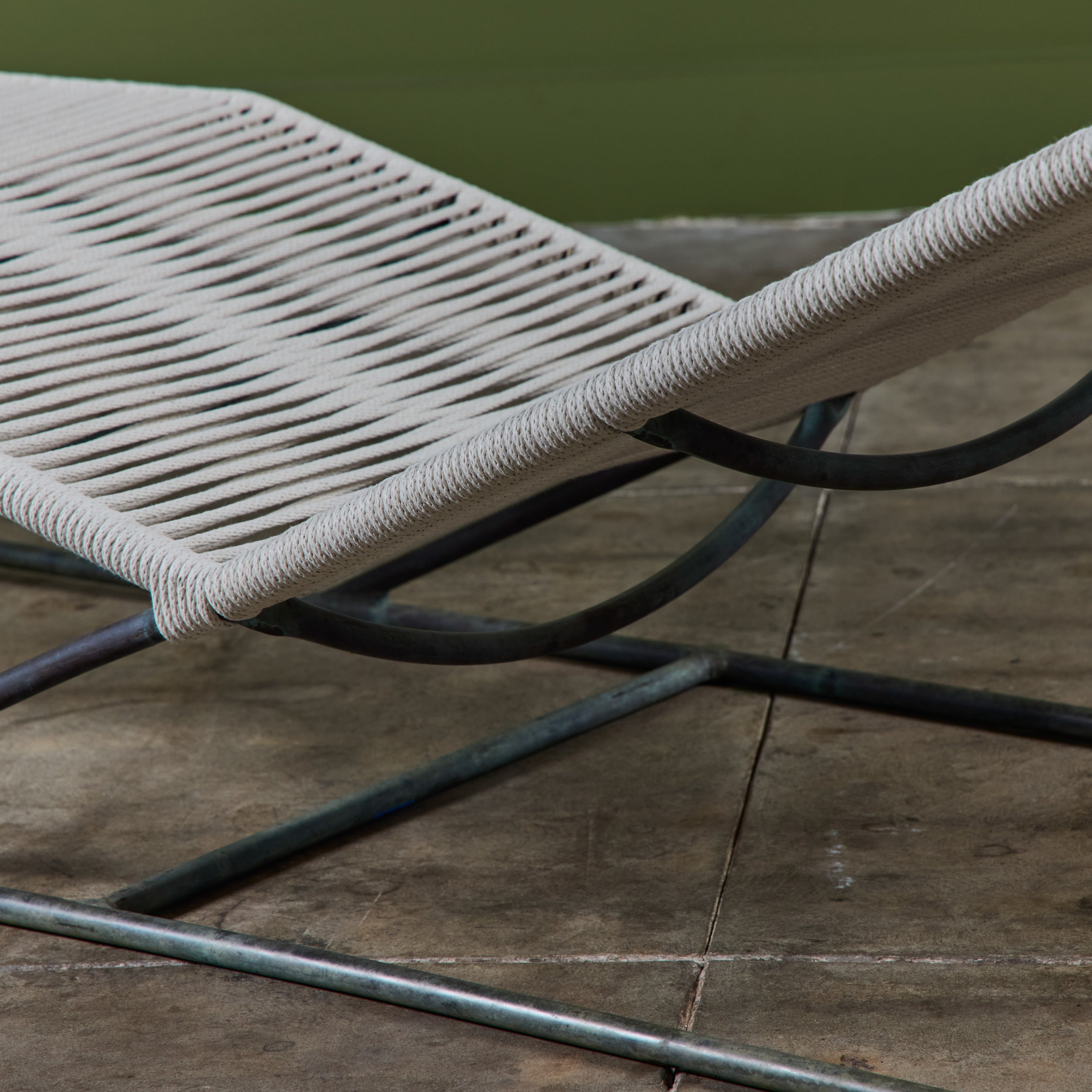 Chaise lounge chair by Kipp Stewart for Terra of California, USA, c.1970s. The chaise features a patinated bronze tube frame with new cotton rope that has been woven to the same pattern and specifications as was originally done on the chaise when it was originally produced.