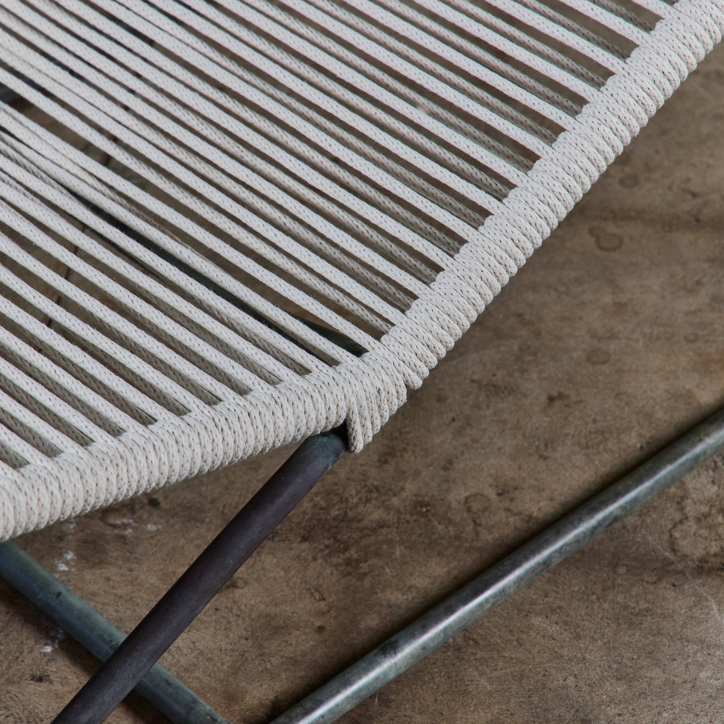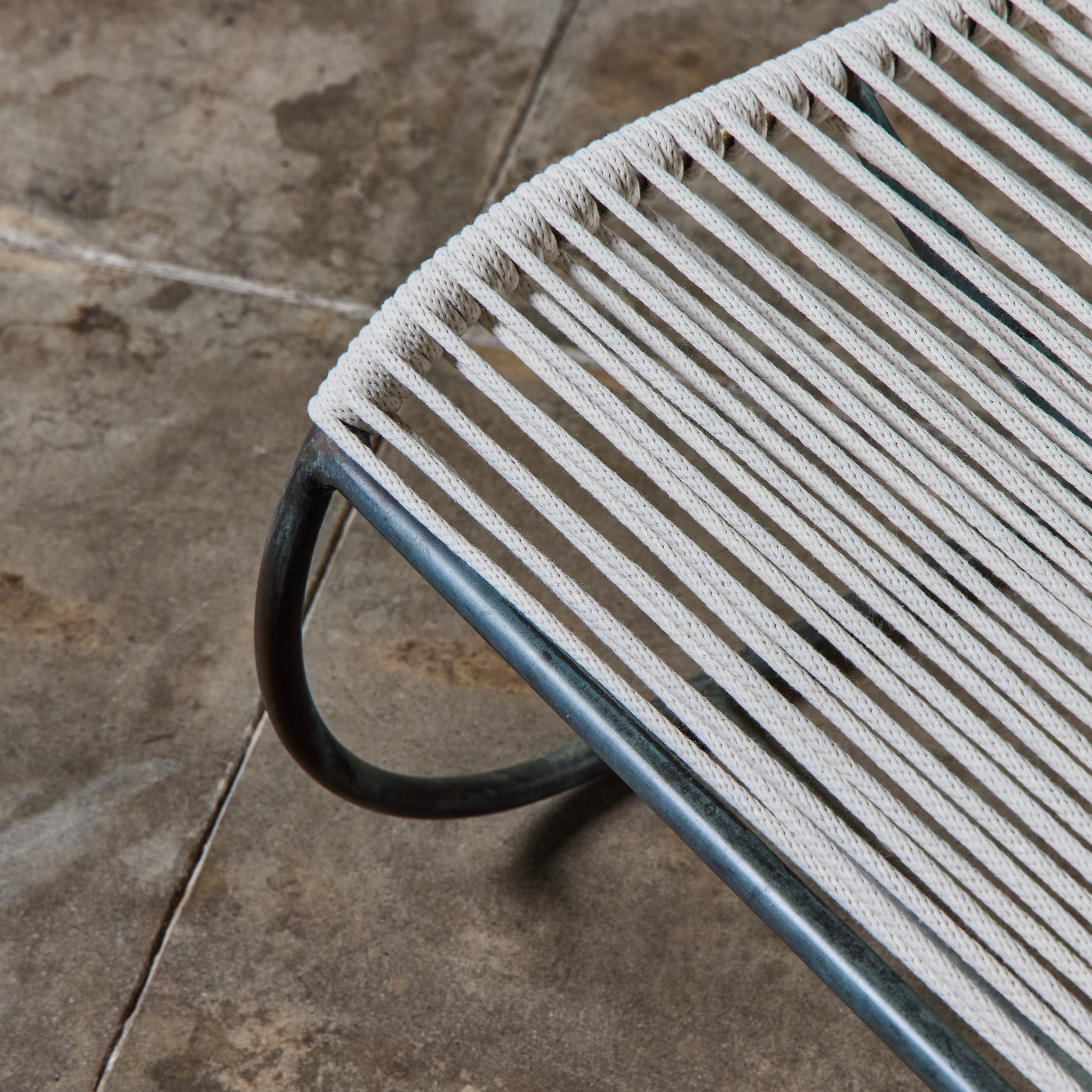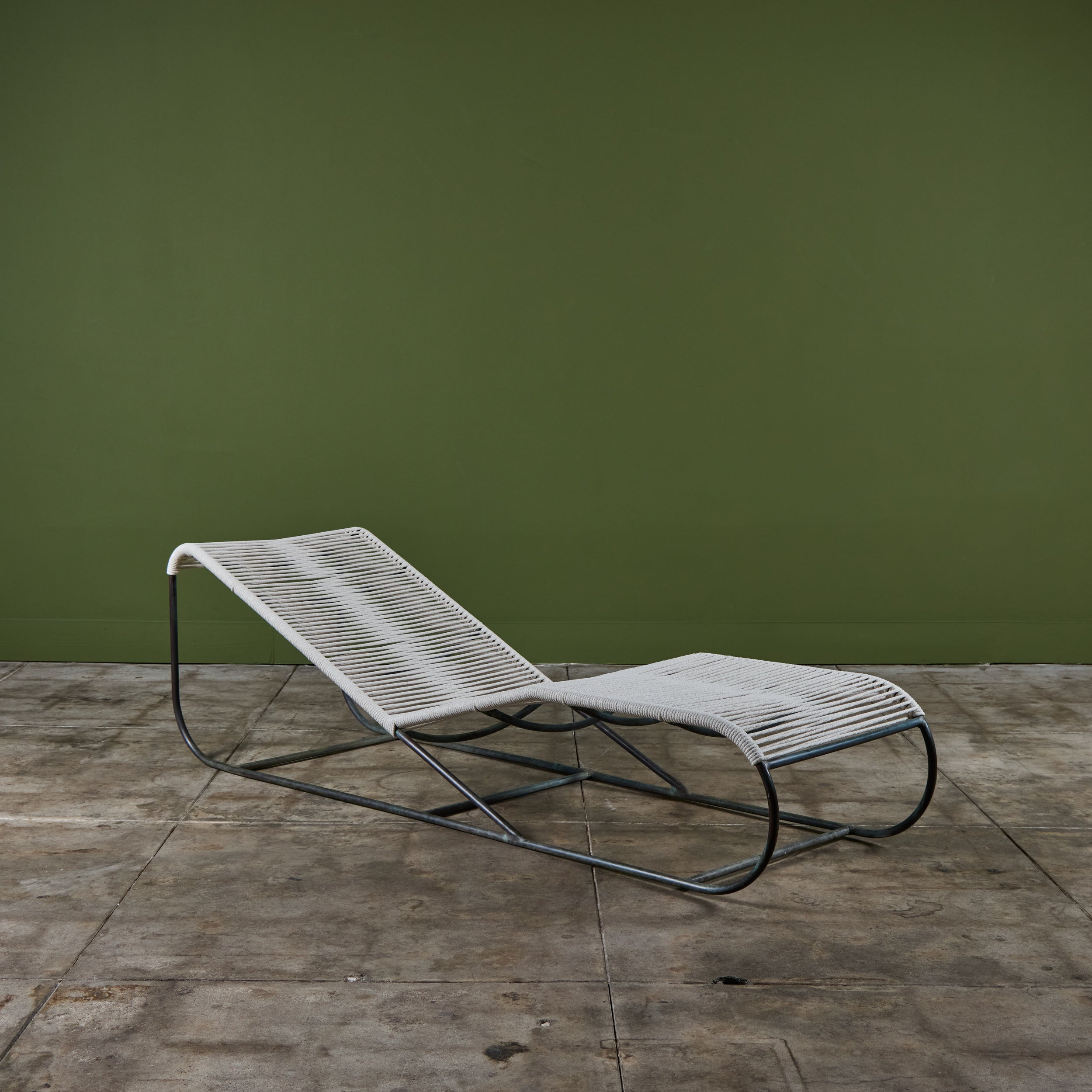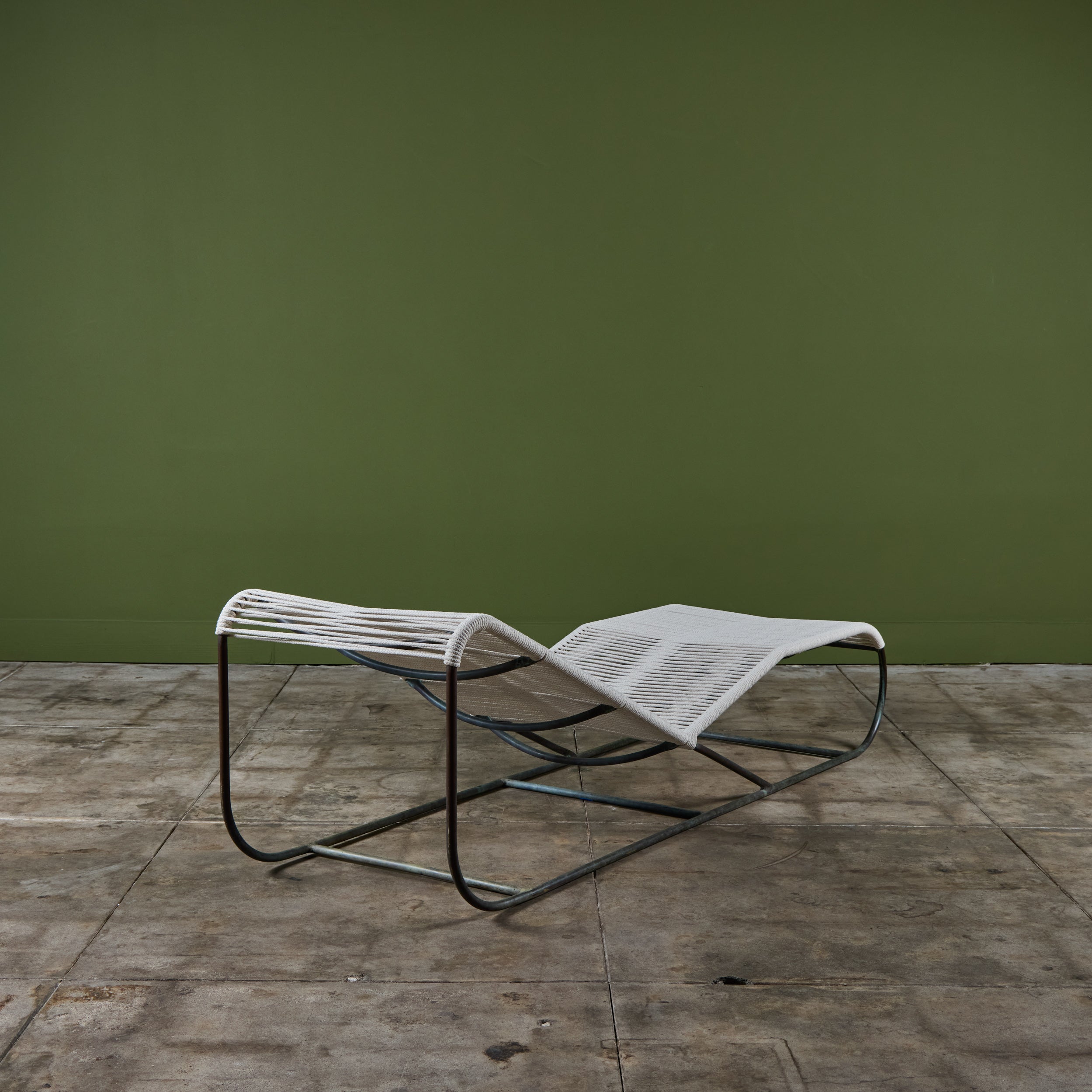 Chaise lounge chair by Kipp Stewart for Terra of California, USA, c.1970s. The chaise features a patinated bronze tube frame with new cotton rope that has been woven to the same pattern and specifications as was originally done on the chaise when it was originally produced.