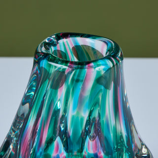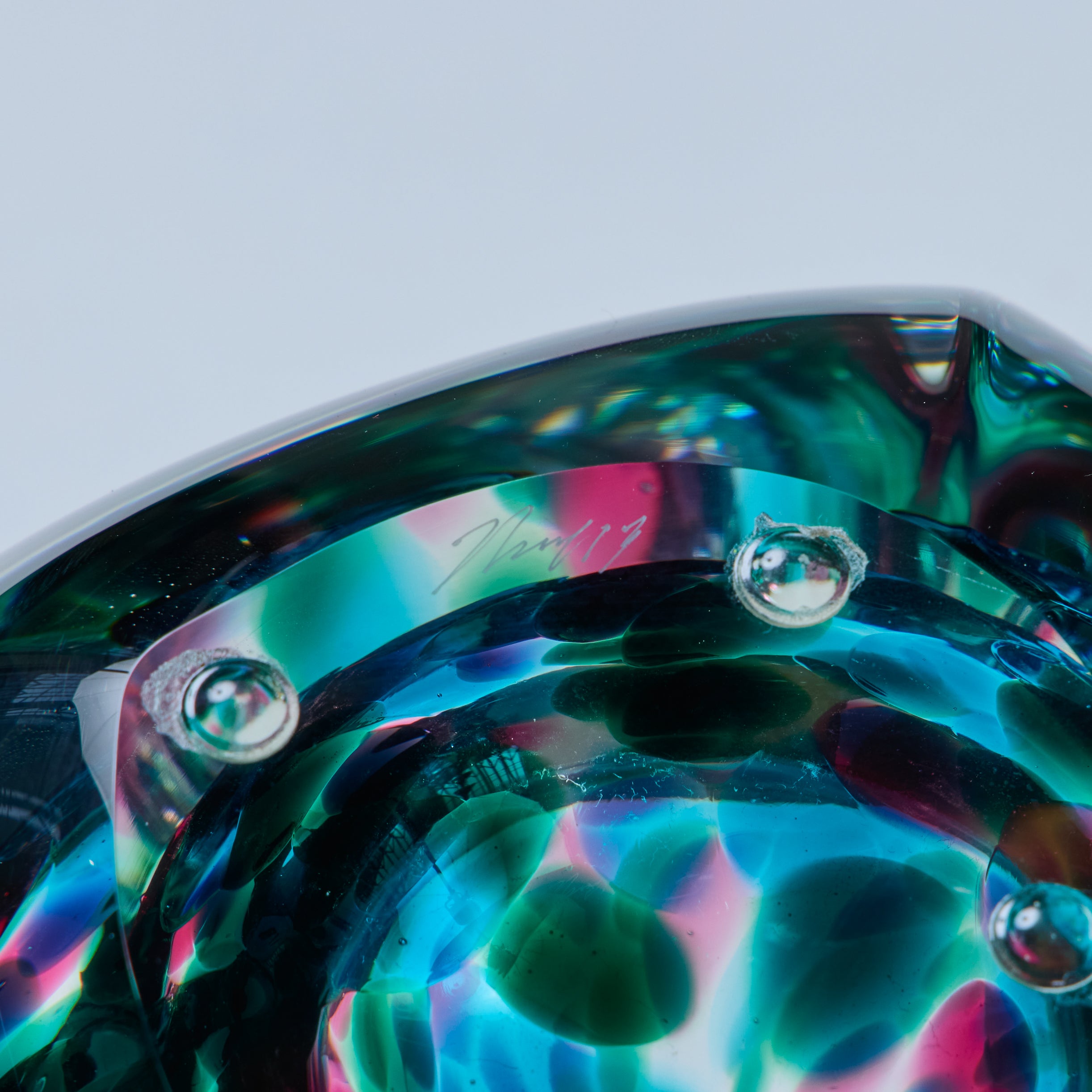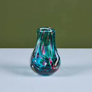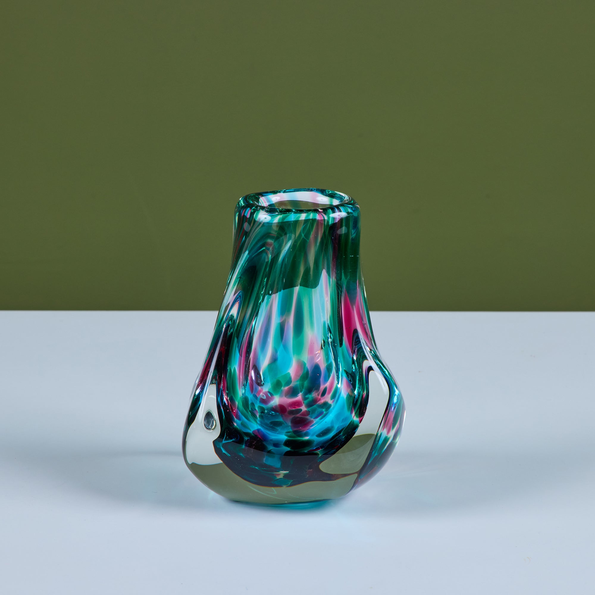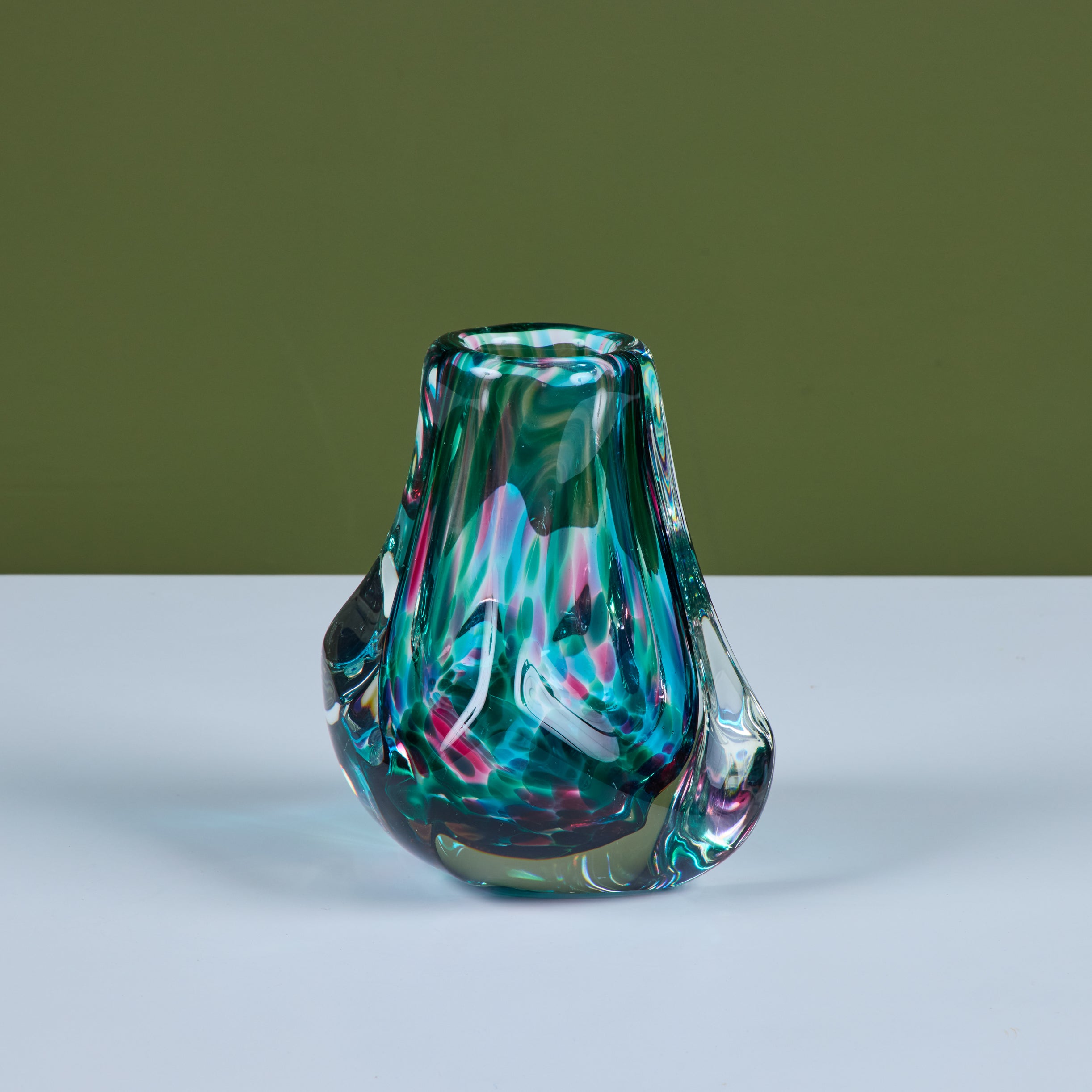 Free form glass vase by Paul Harrie, c.1980s, USA. This thick glass vase is part of Harrie's River Series showcasing varying colors at different angles. Signed by the artist.