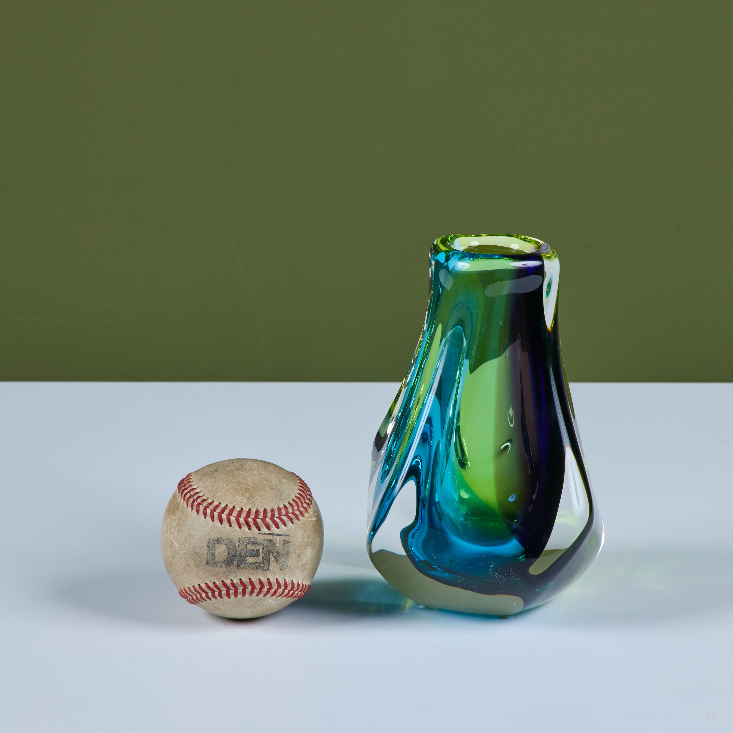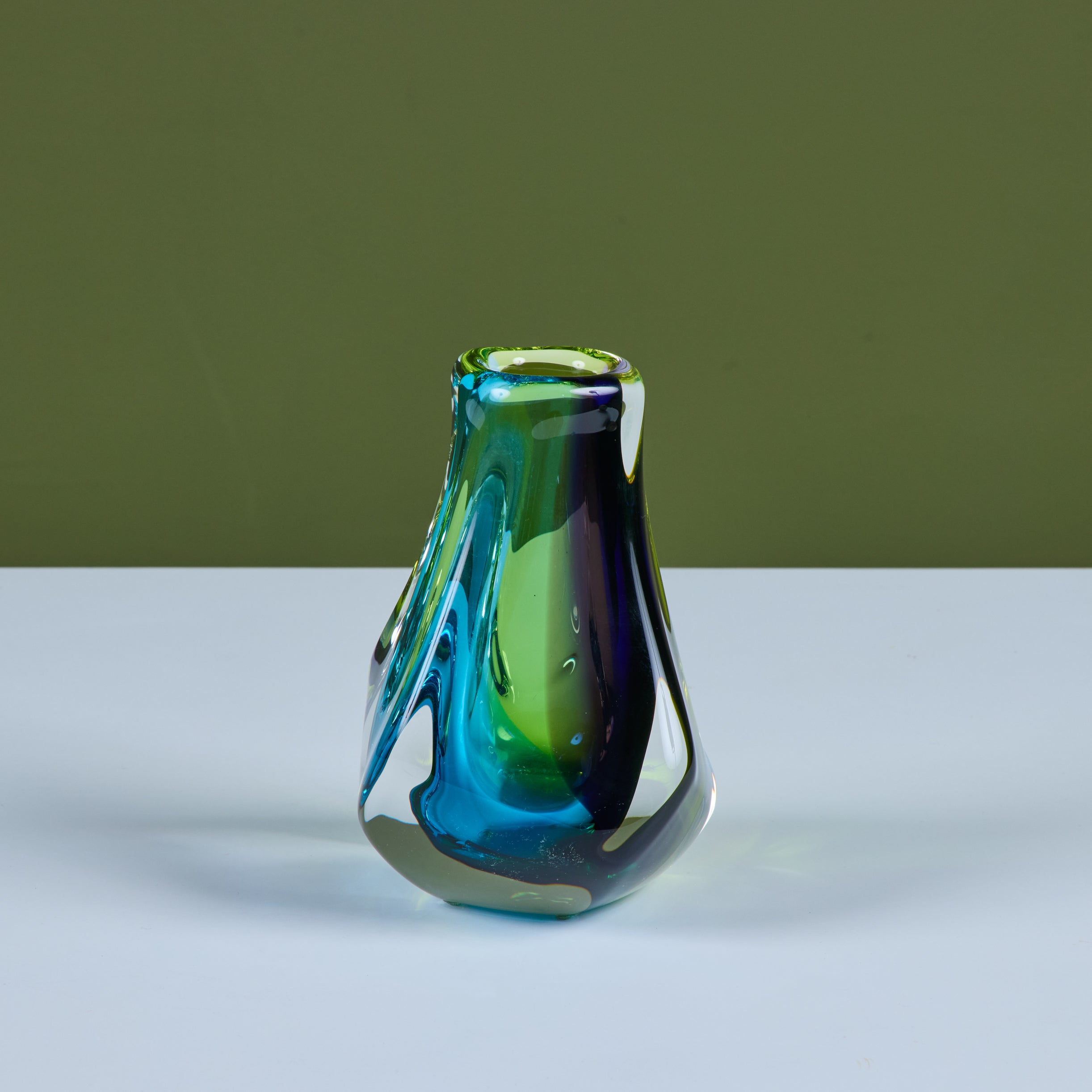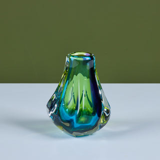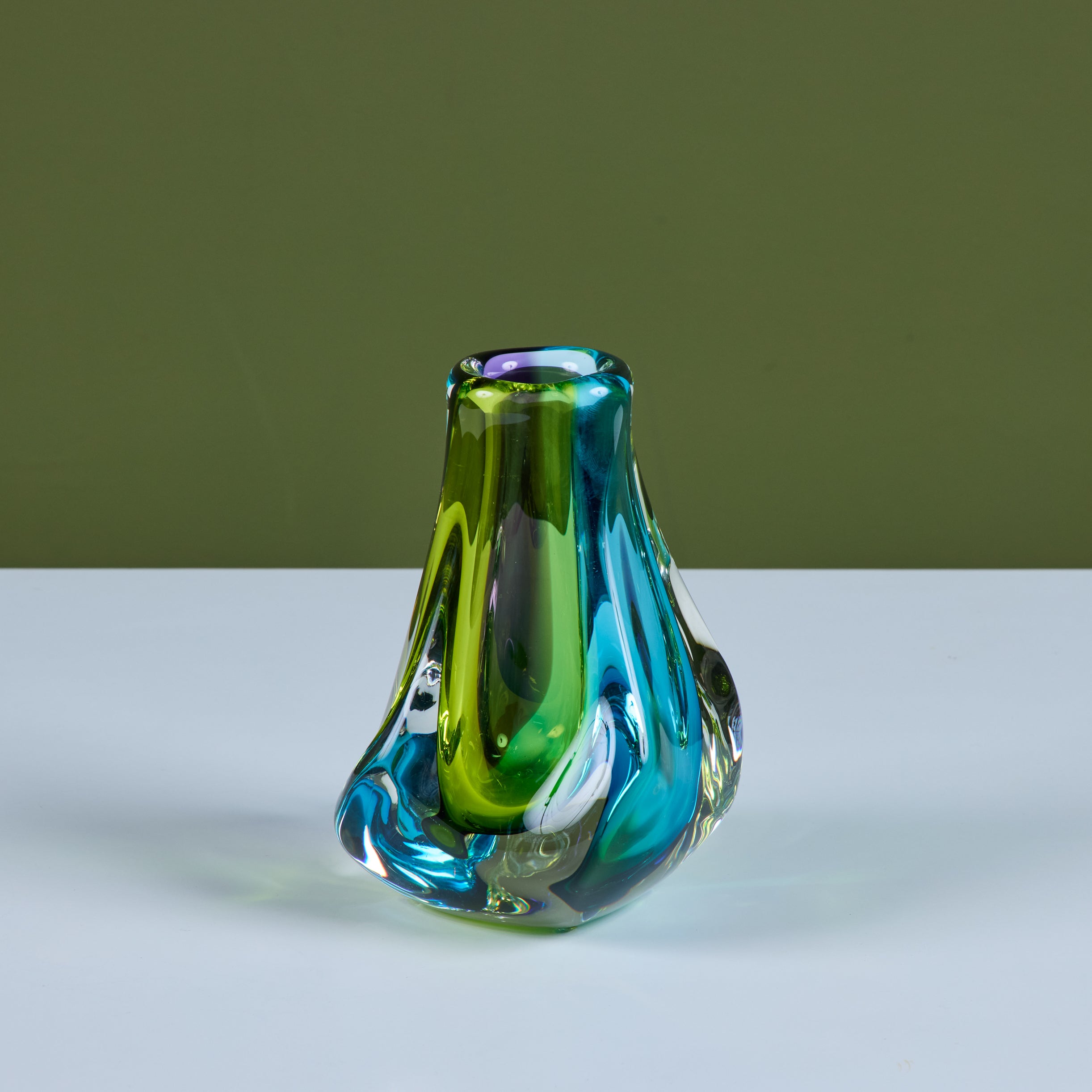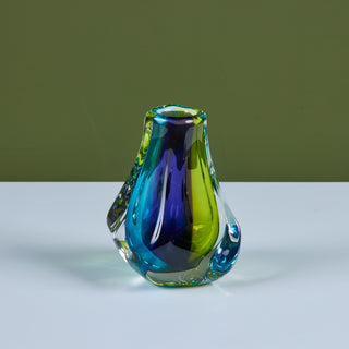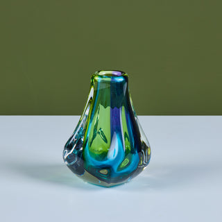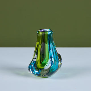 Free form glass vase by Paul Harrie, c.1980s, USA. This thick glass vase is part of Harrie's River Series showcasing varying colors at different angles. Signed by the artist.