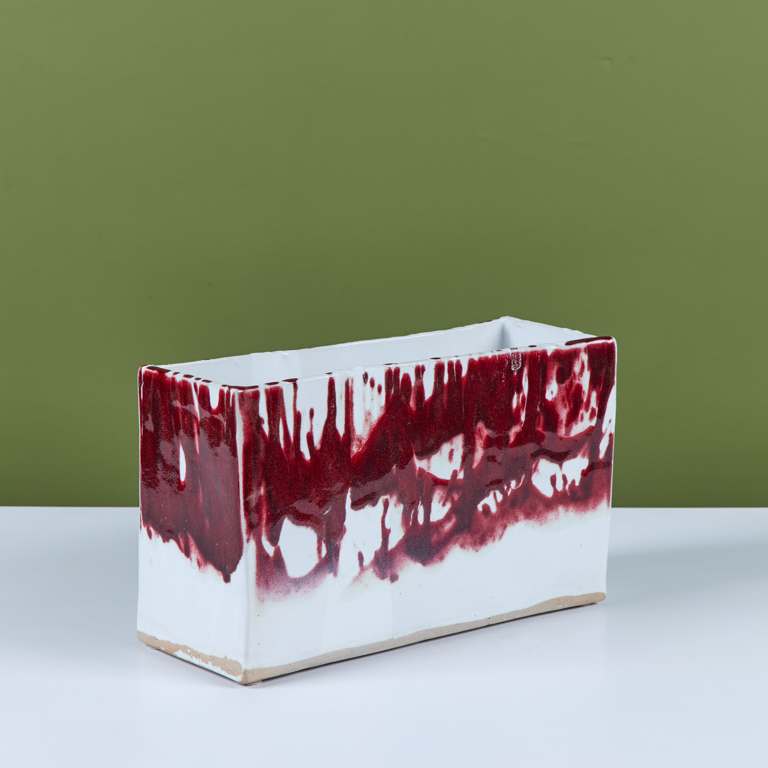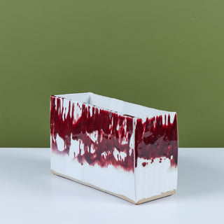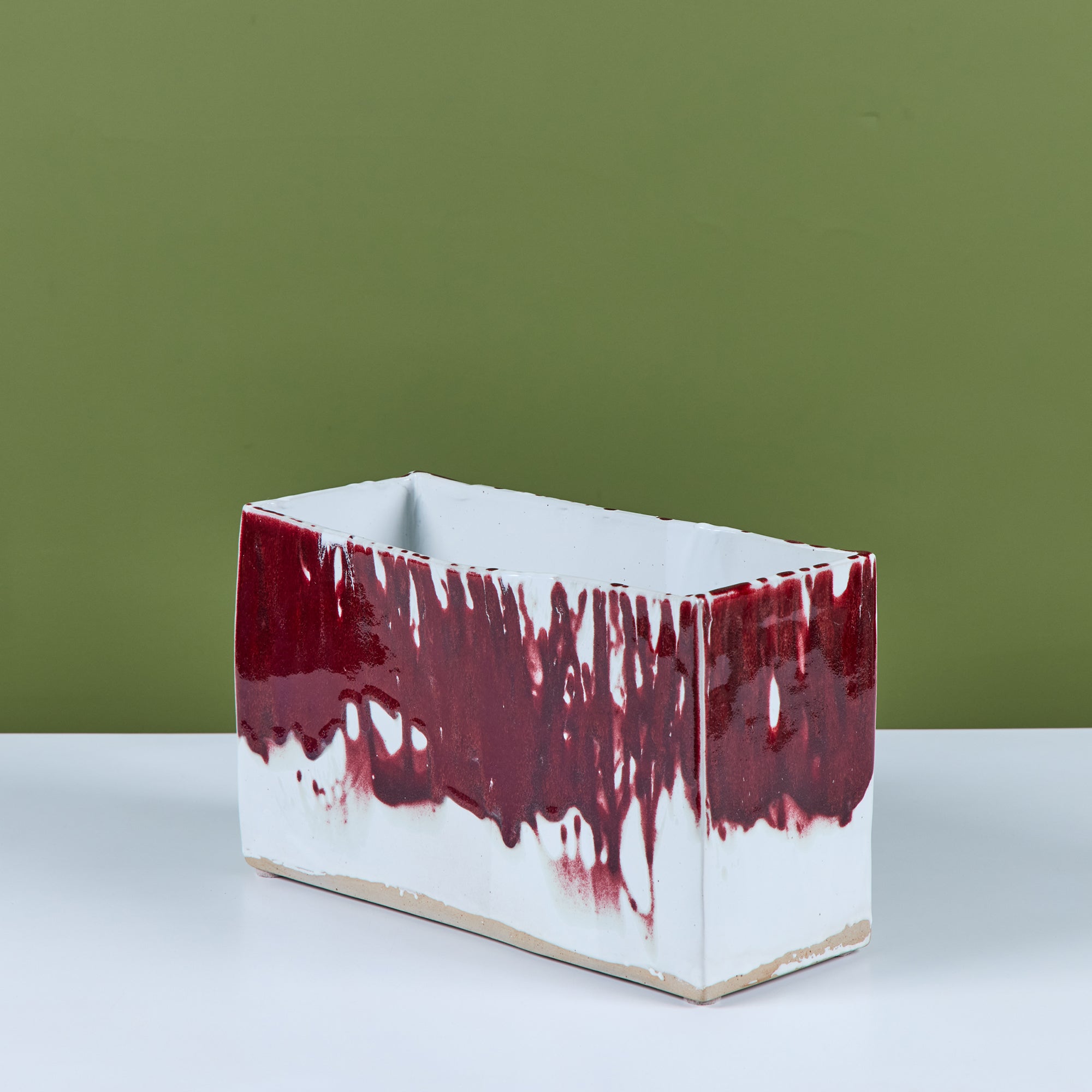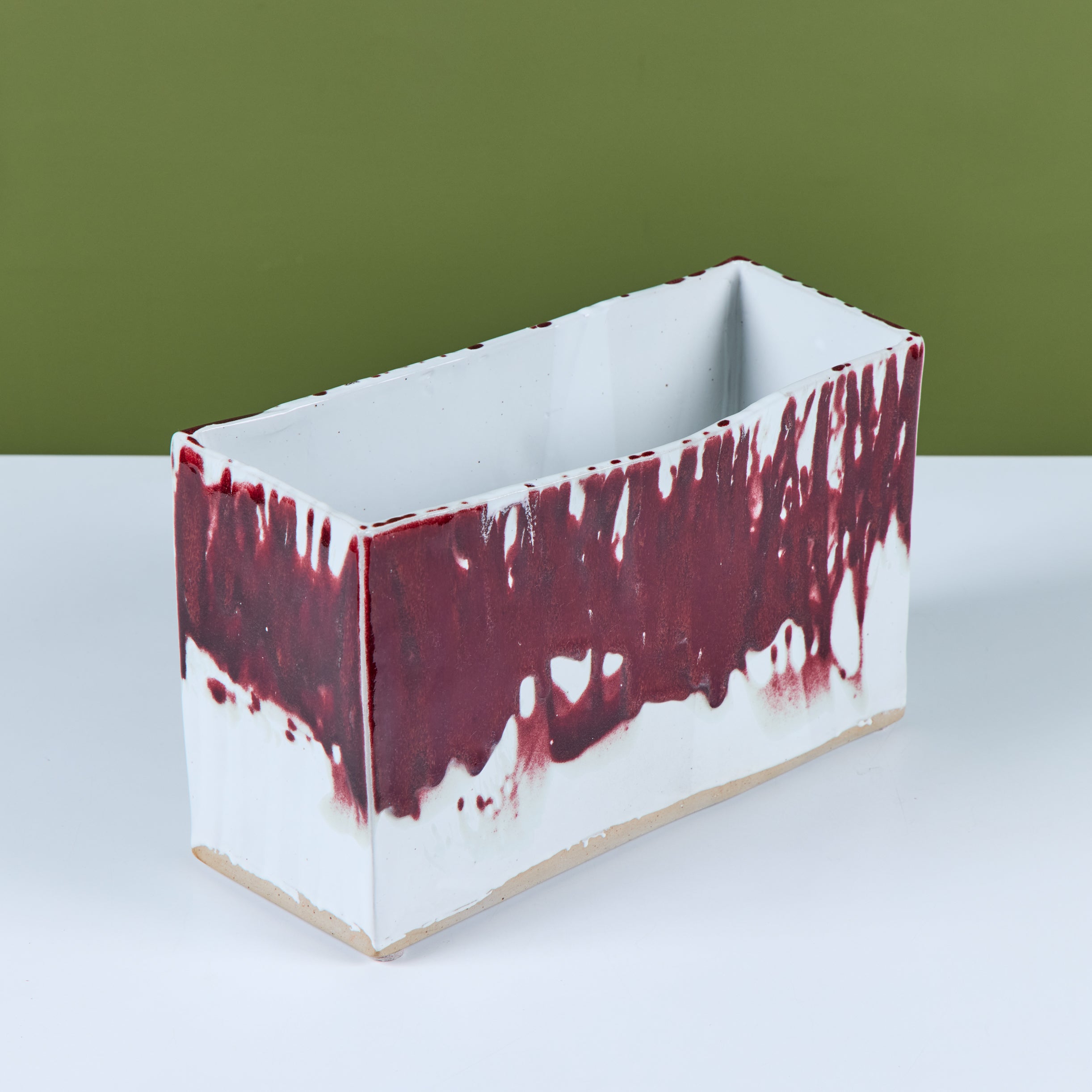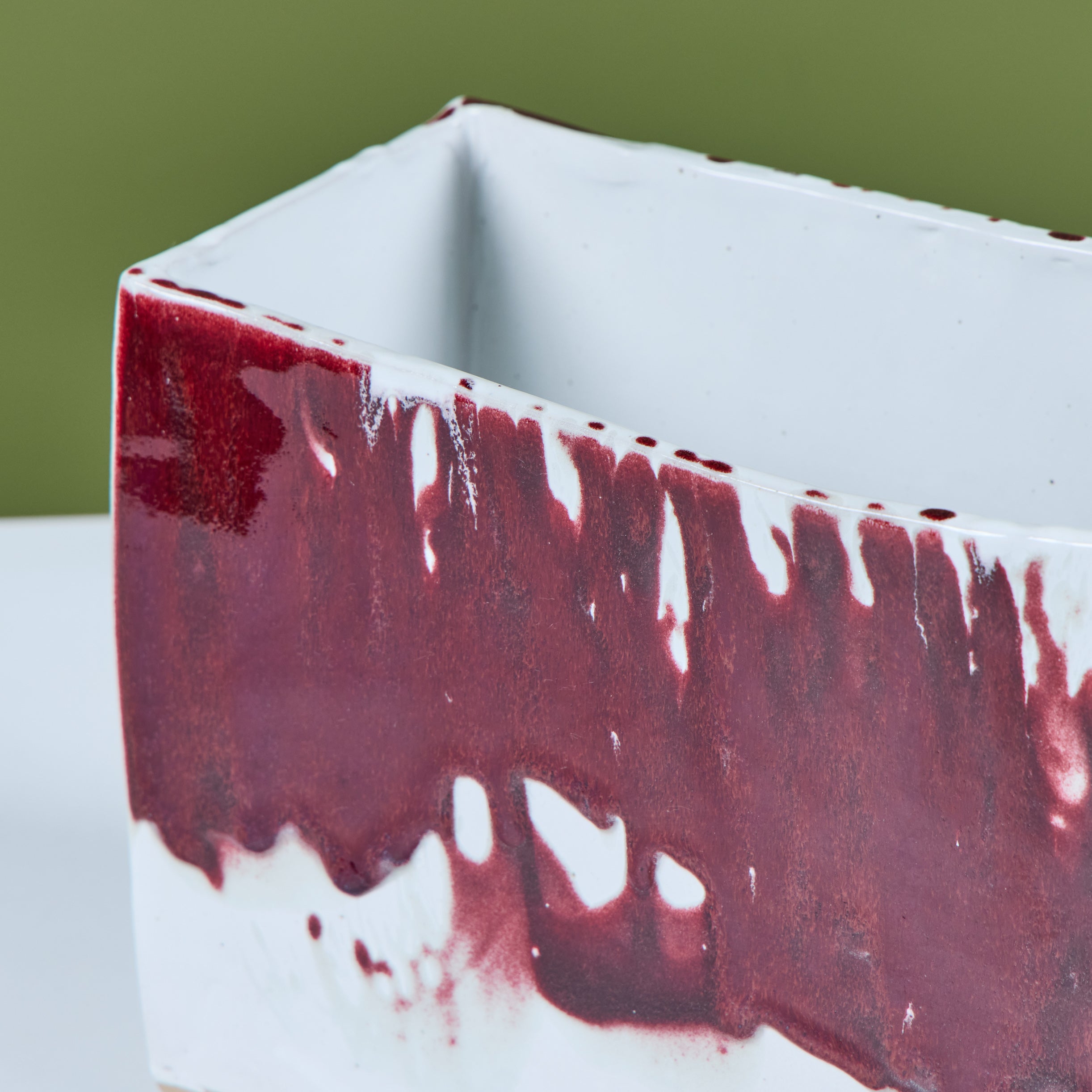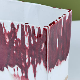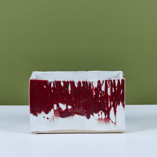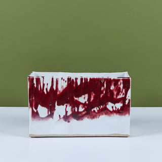 Glazed studio pottery ceramic planter vessel. The rectangular planter features a wide opening for stems or potted plants. The vessel has an all over cream glaze, with a contrasting oxblood drip glaze that starts at the mouth of the piece and cascades down the sides.