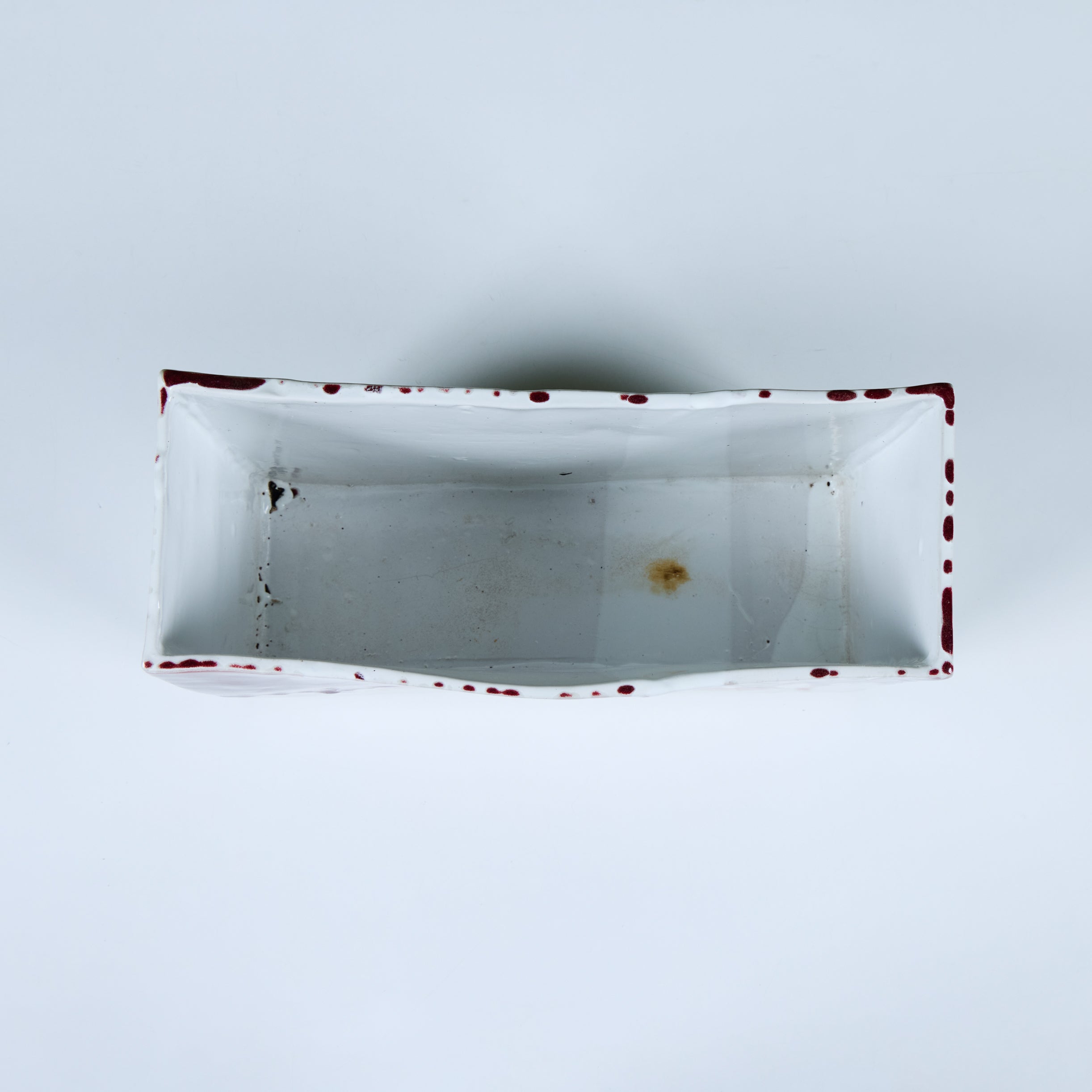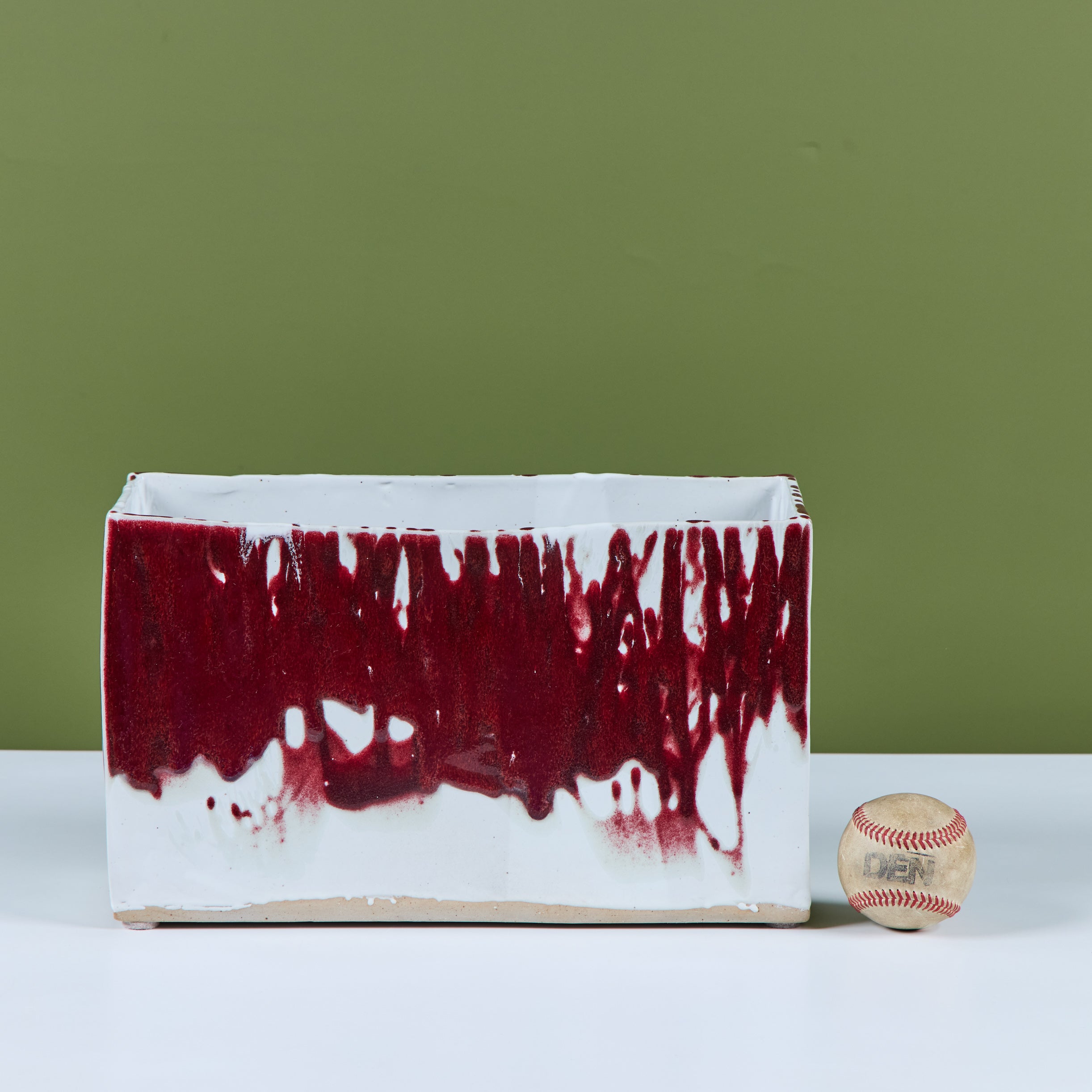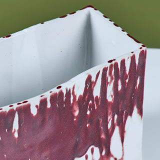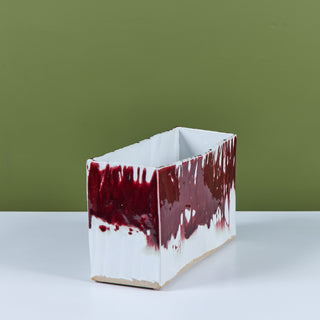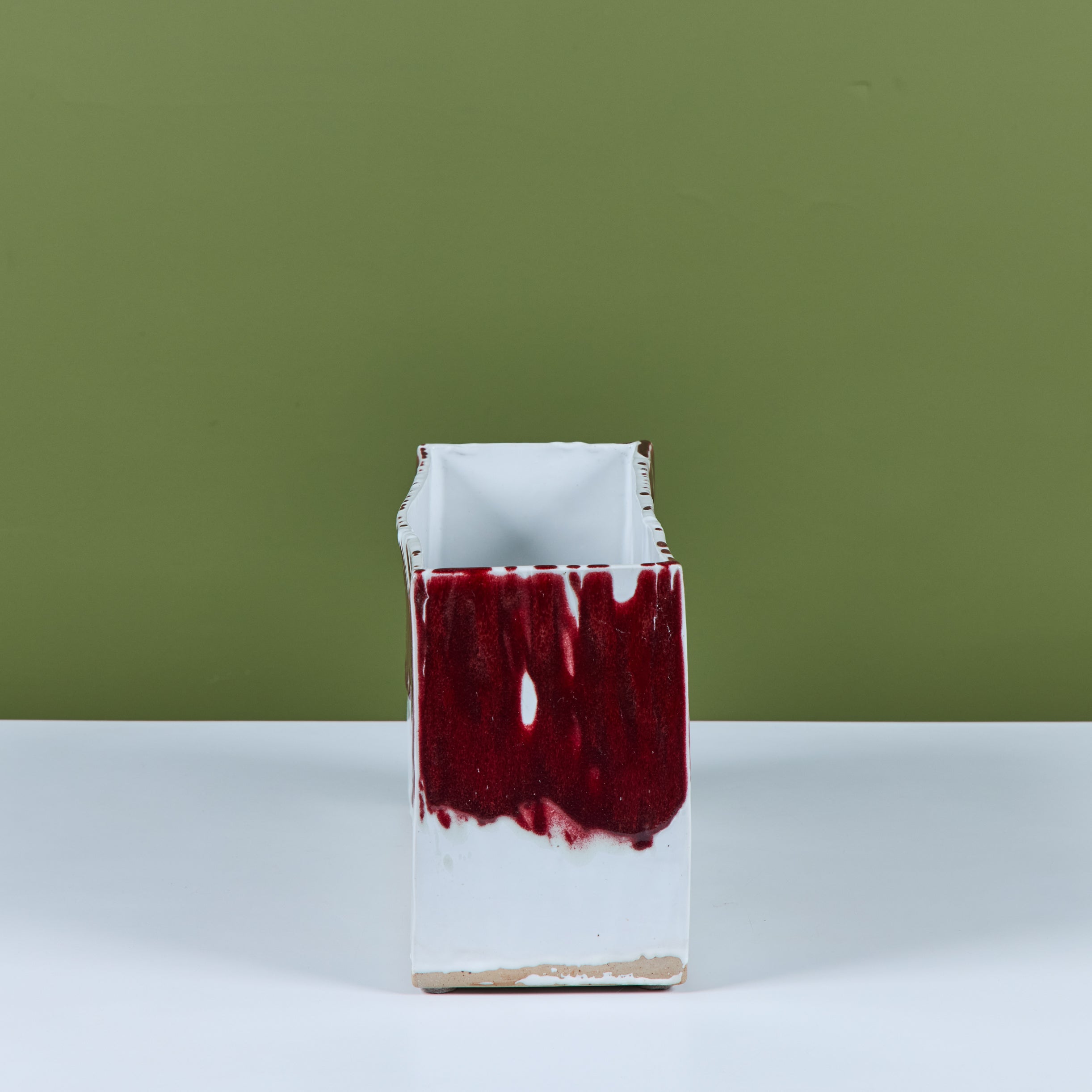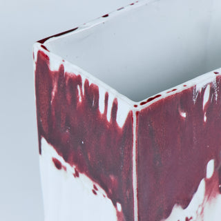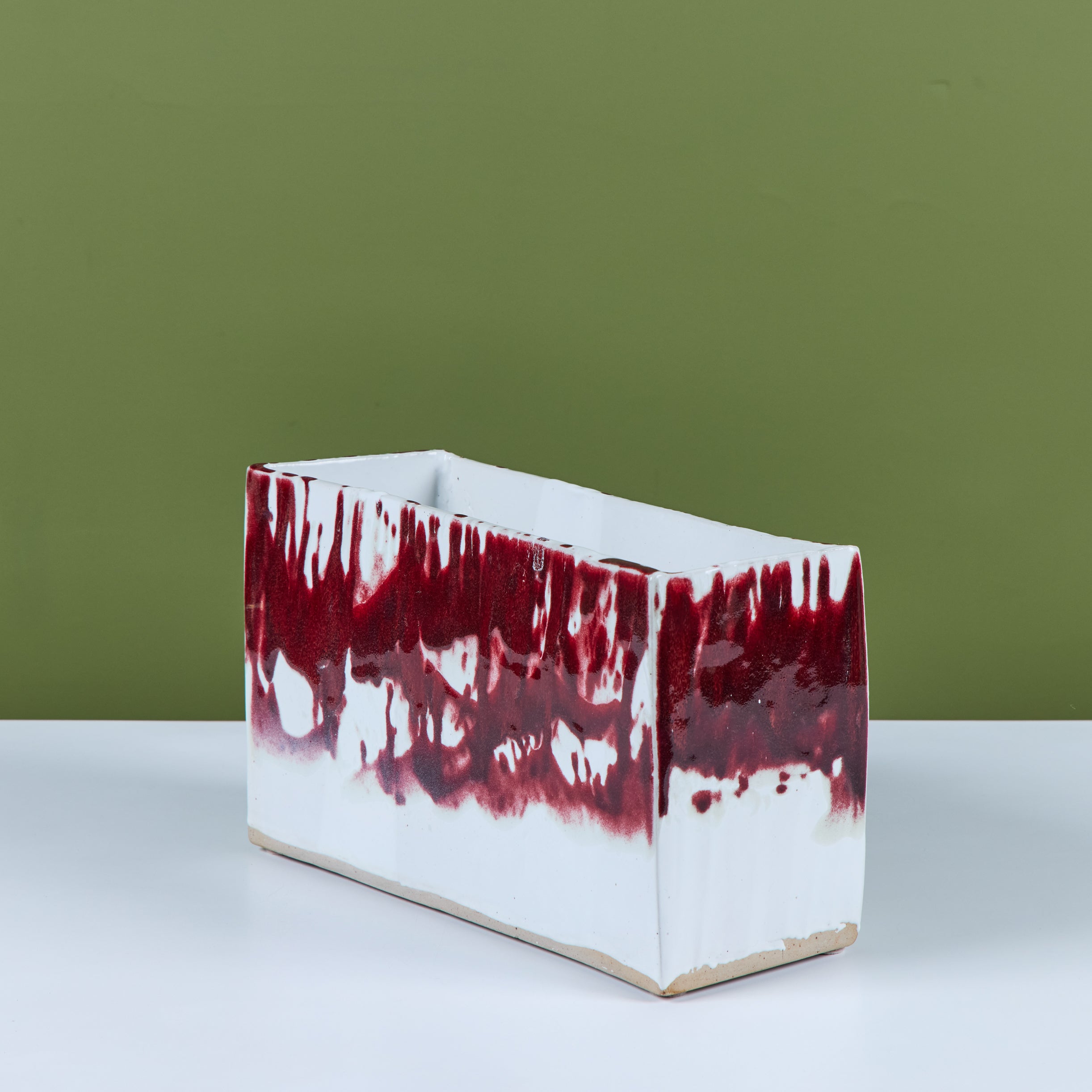 Glazed studio pottery ceramic planter vessel. The rectangular planter features a wide opening for stems or potted plants. The vessel has an all over cream glaze, with a contrasting oxblood drip glaze that starts at the mouth of the piece and cascades down the sides.