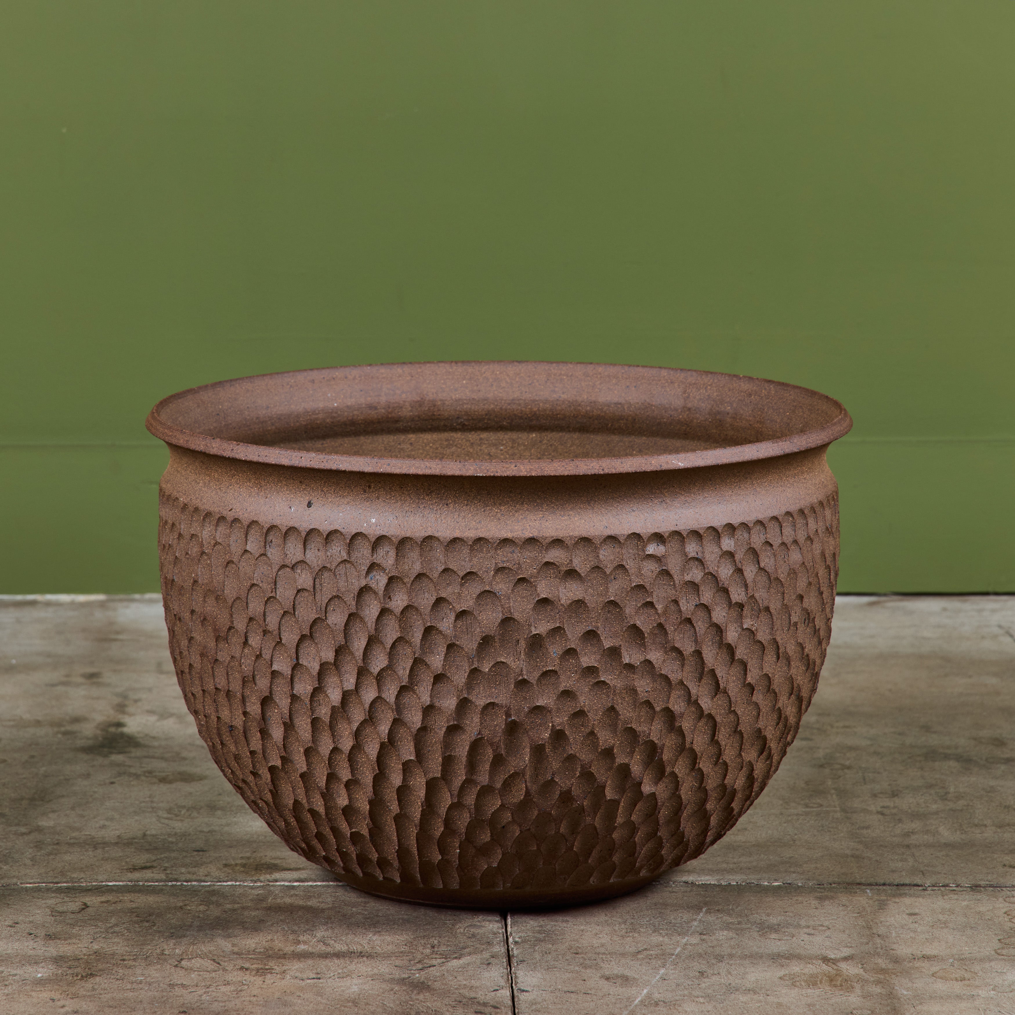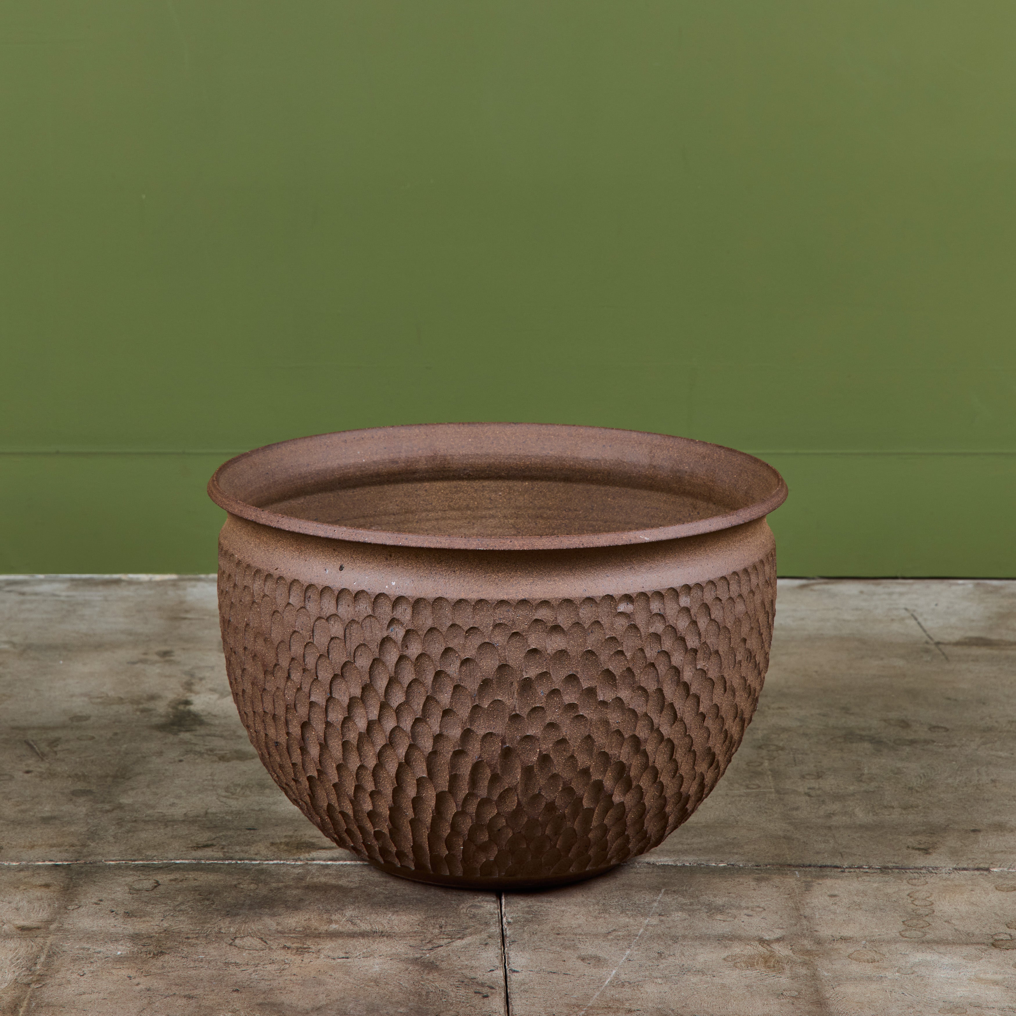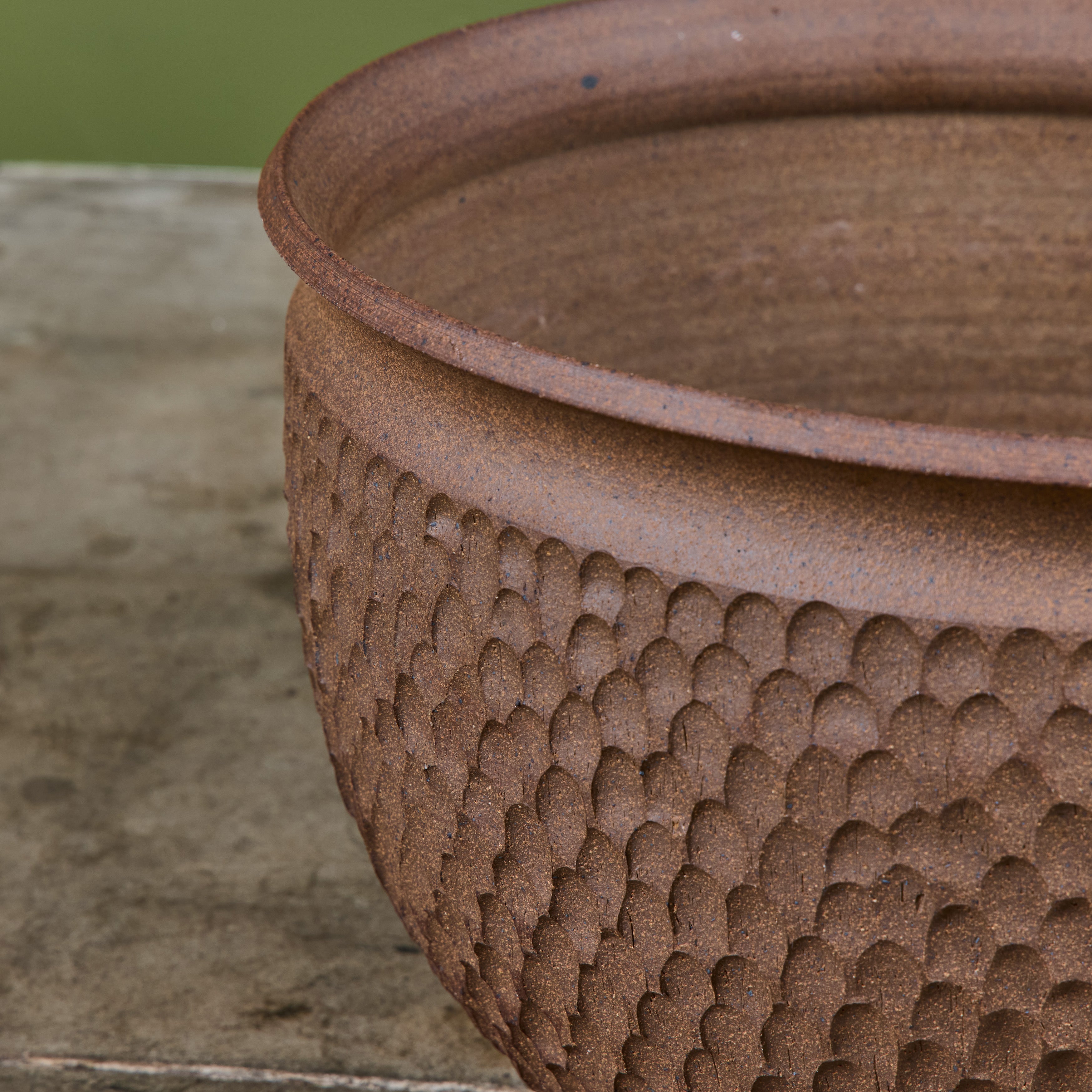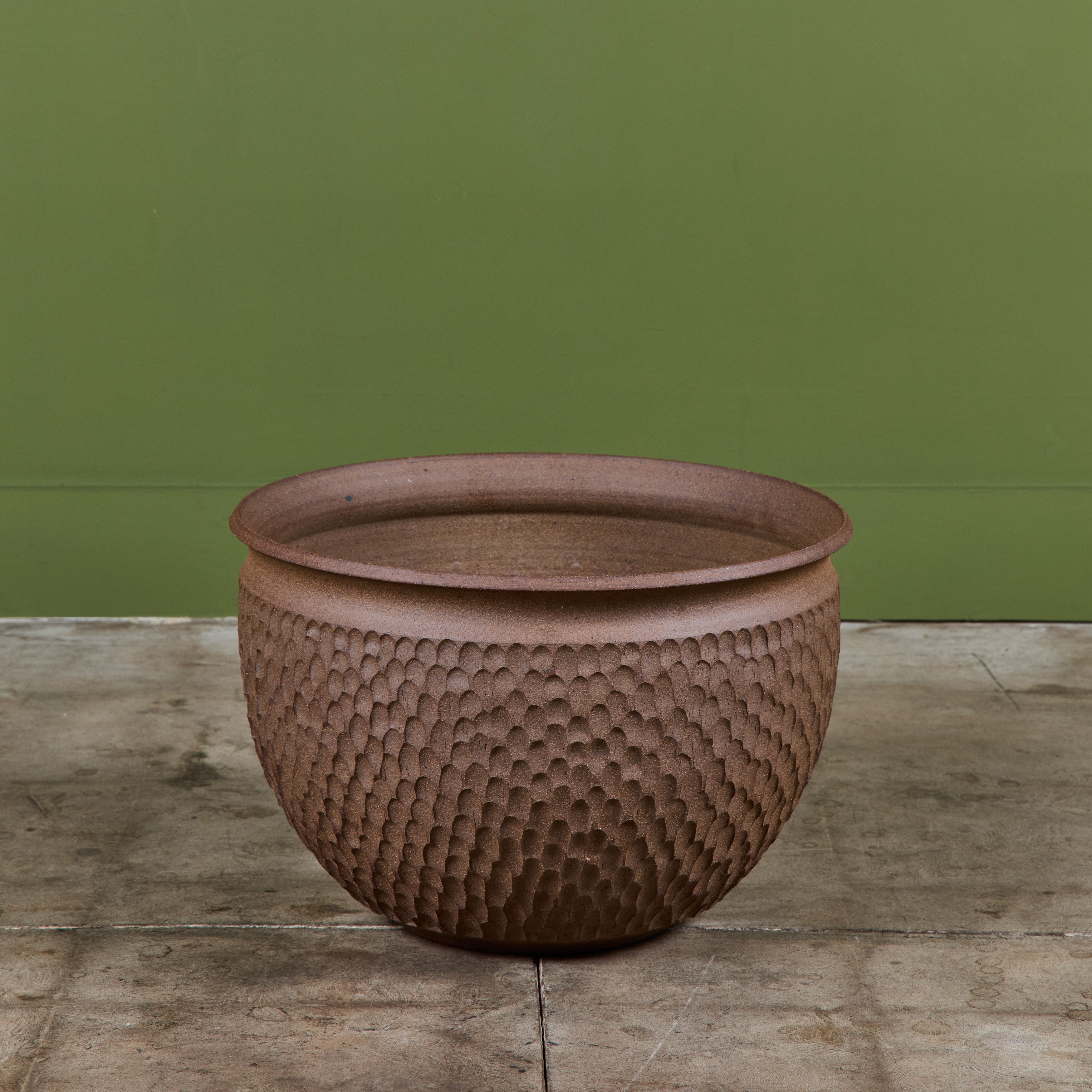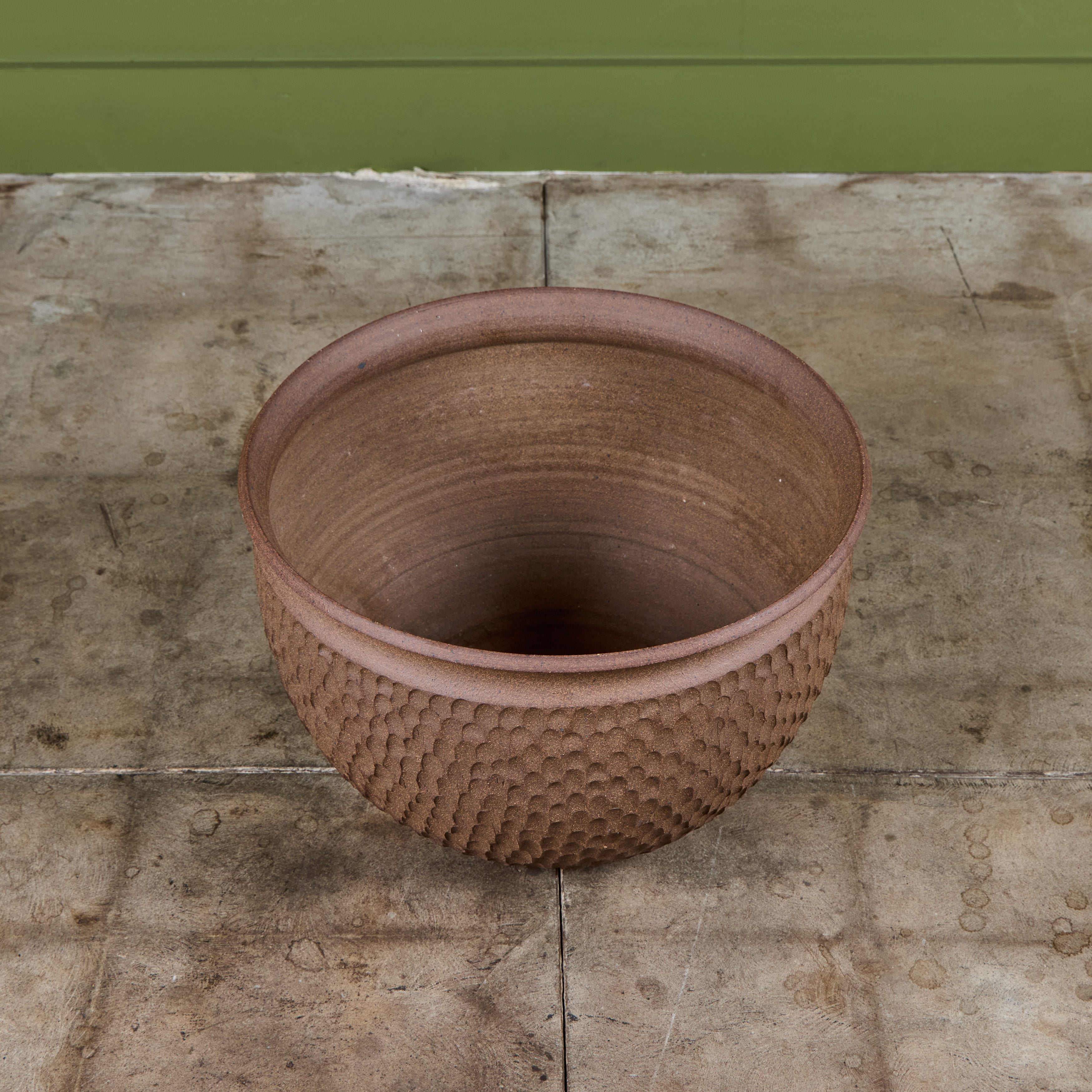 Wide bowl stoneware planter from Robert Maxwell and David Cressey’s 1970s collaboration, Earthgender. One of the less common designs from this partnership, the ‘thumbprint’ pattern has a textured surface of repeating impressed concavities.