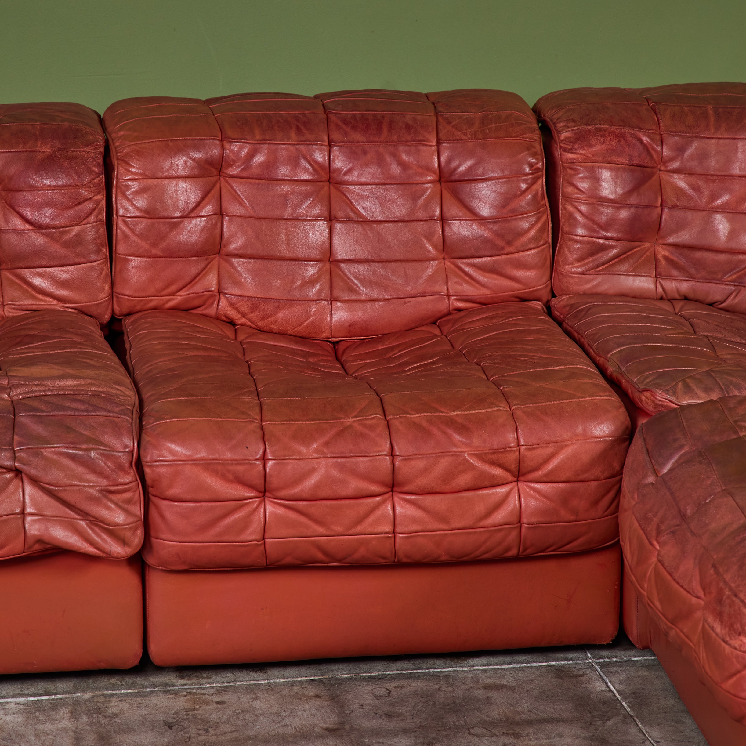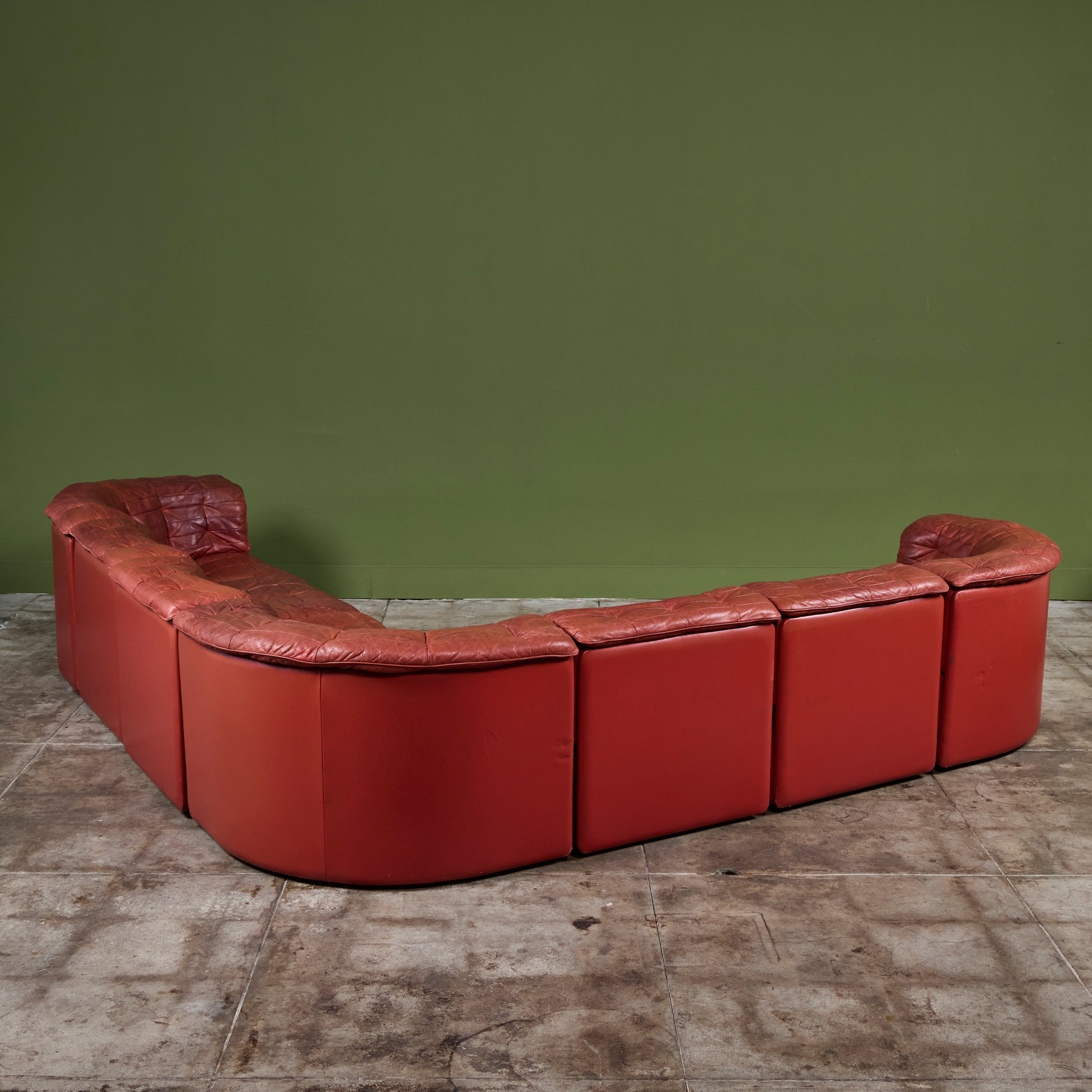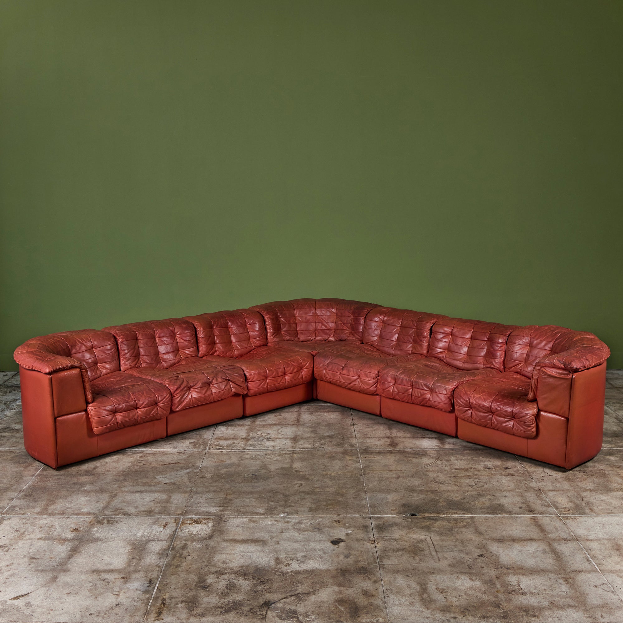 DS-11 seven piece burnt red leather sofa c.1970s, for De Sede, Switzerland. The modular system consists of three corner seats and four center seats all upholstered in the original perfectly patinated leather patchwork upholstery. It can be arranged as one large sectional sofa, two sofas or individual seats.