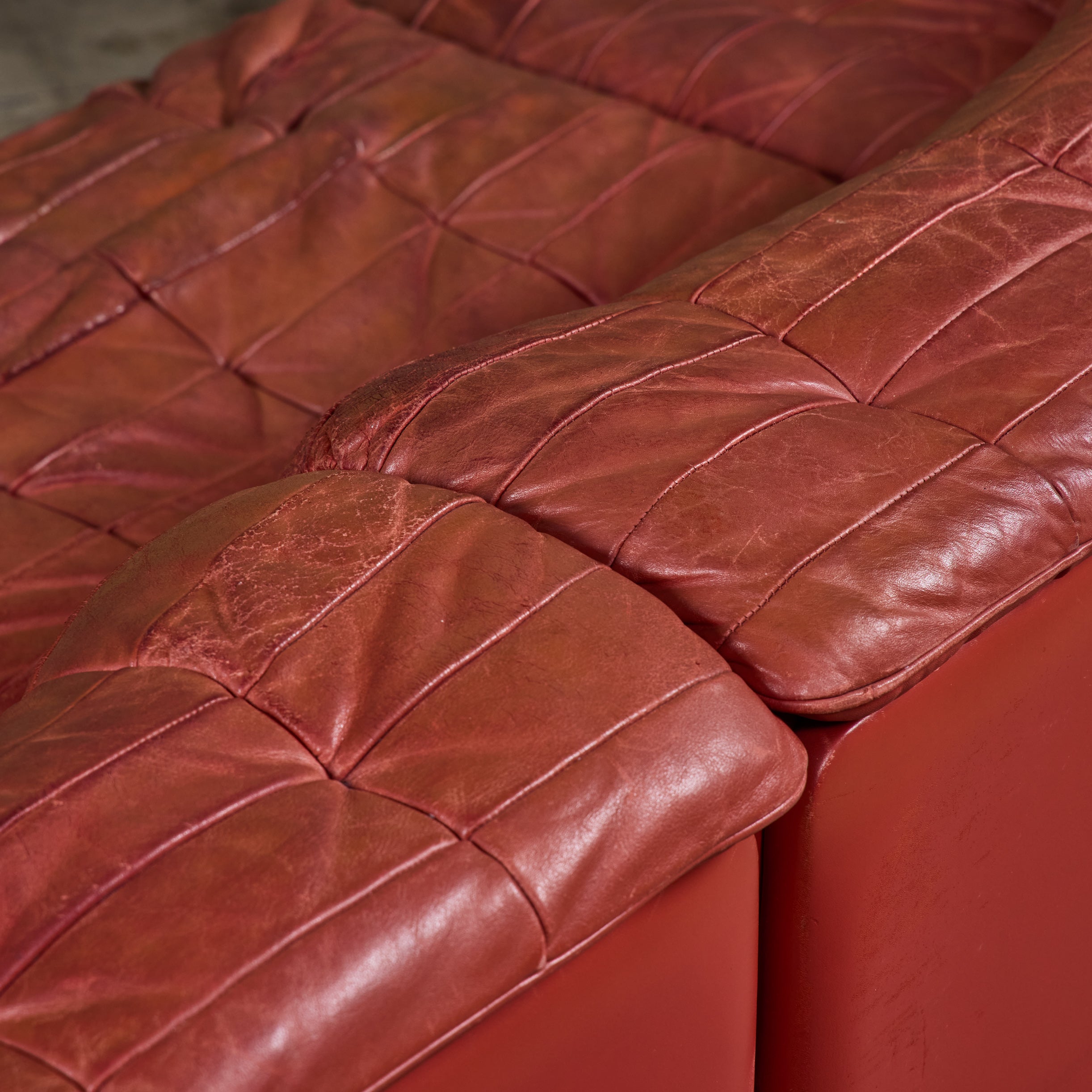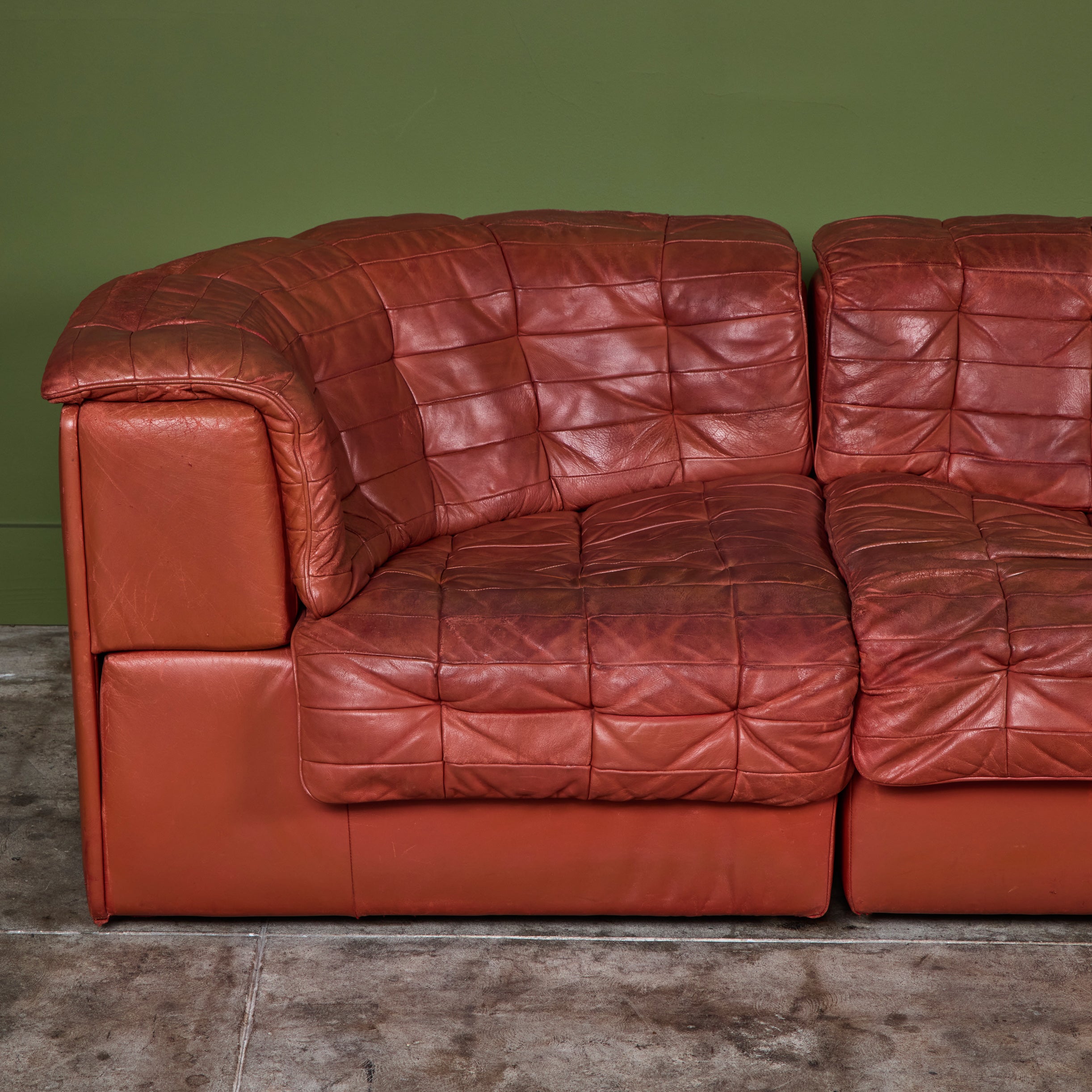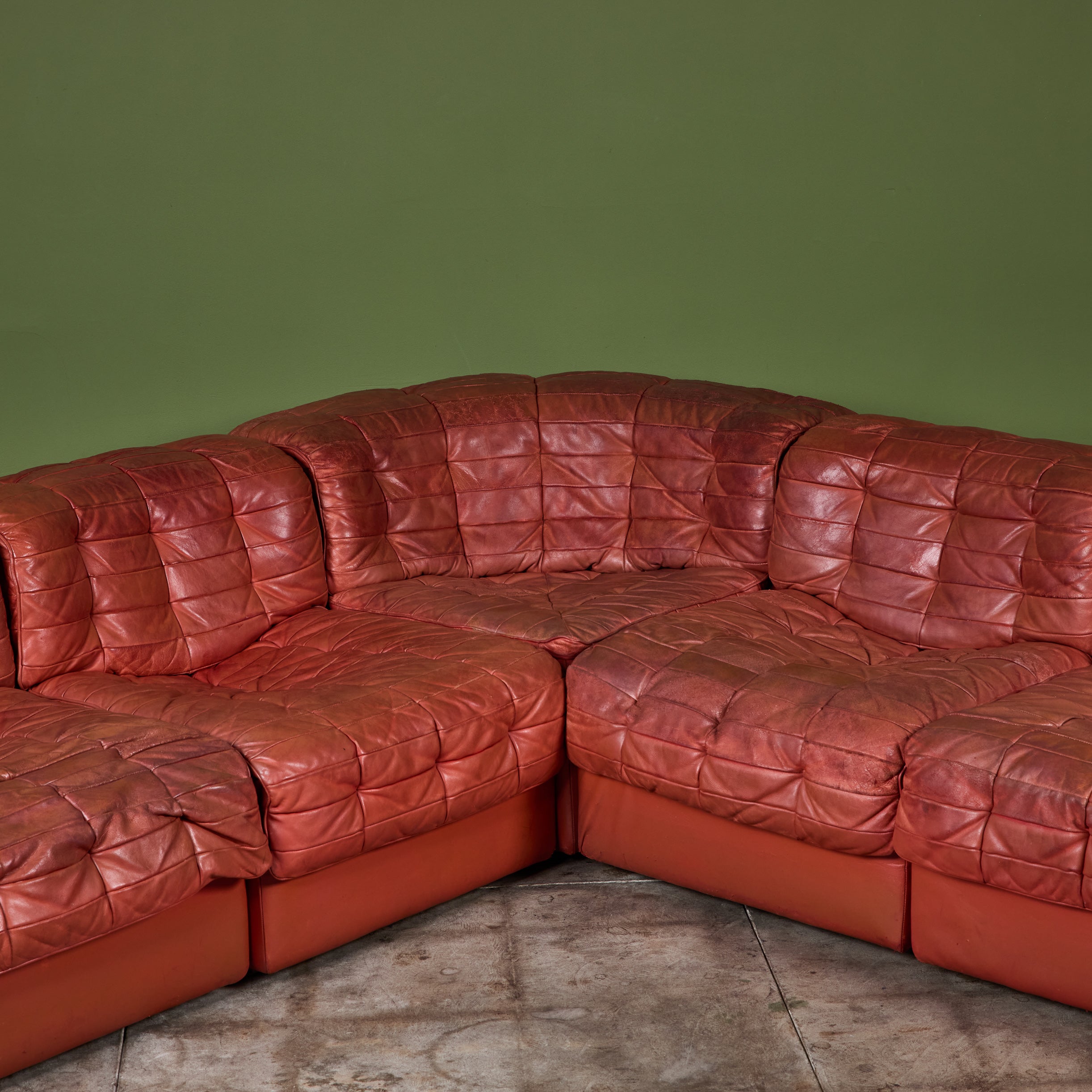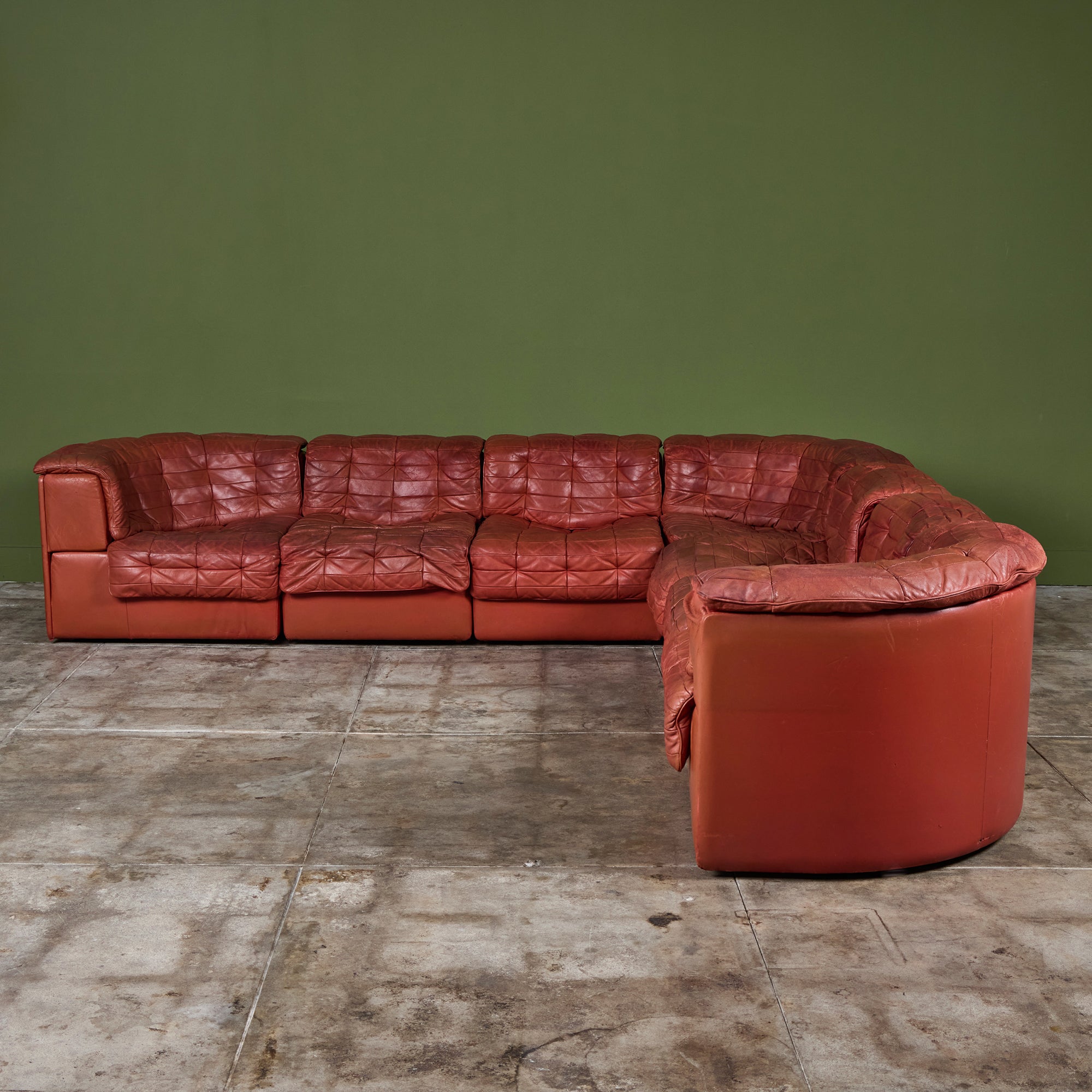 DS-11 seven piece burnt red leather sofa c.1970s, for De Sede, Switzerland. The modular system consists of three corner seats and four center seats all upholstered in the original perfectly patinated leather patchwork upholstery. It can be arranged as one large sectional sofa, two sofas or individual seats.