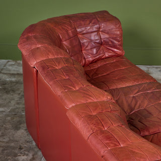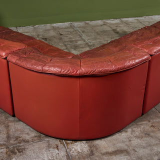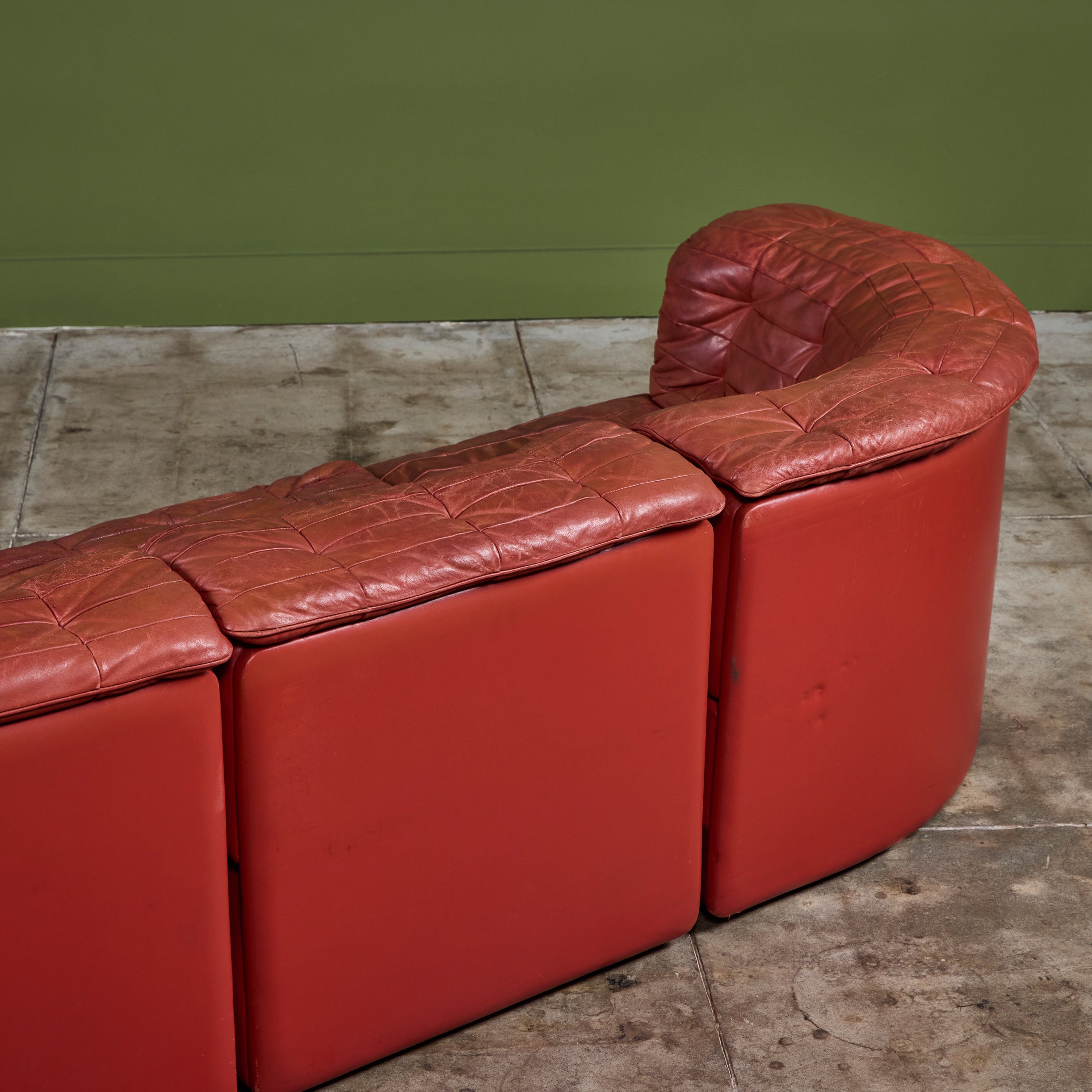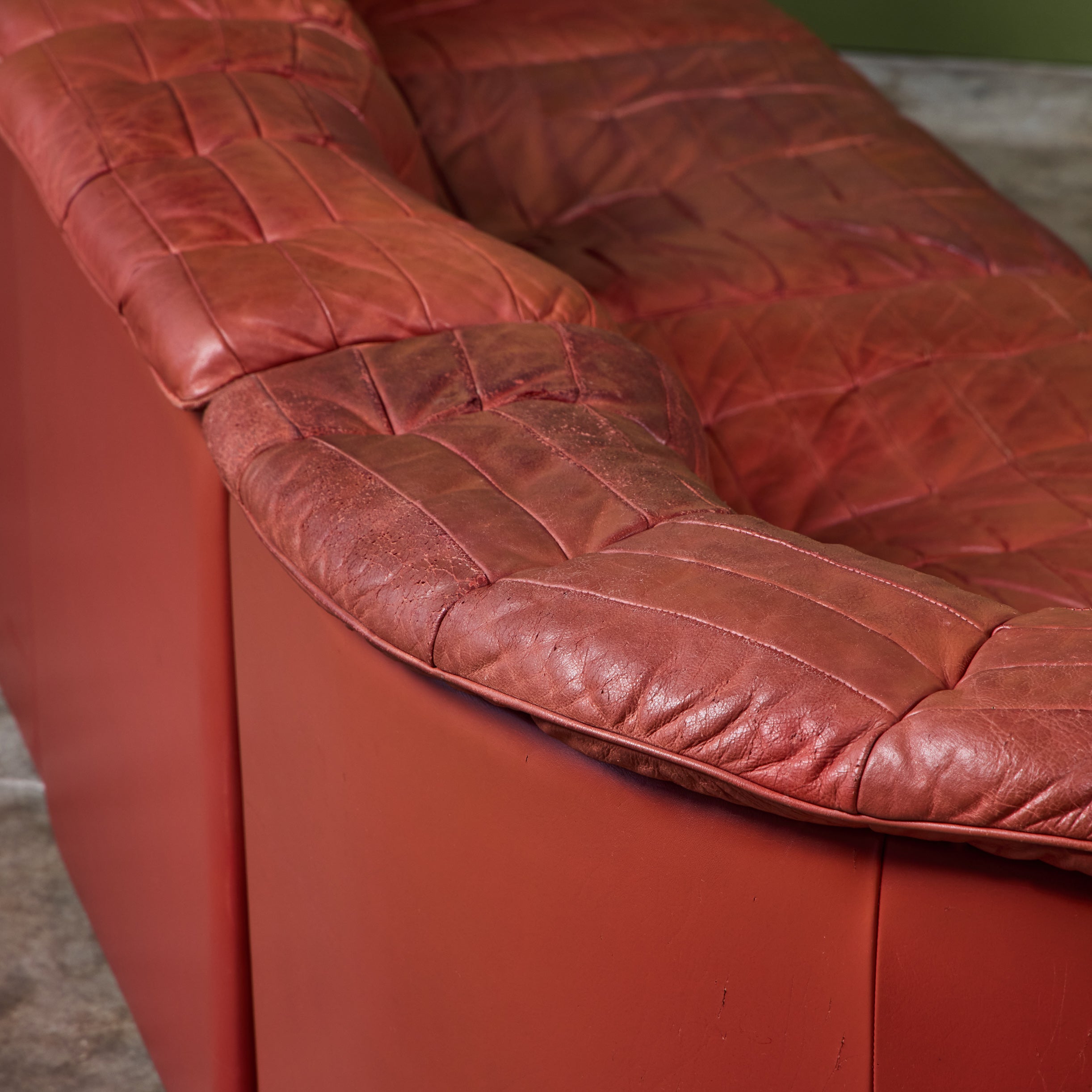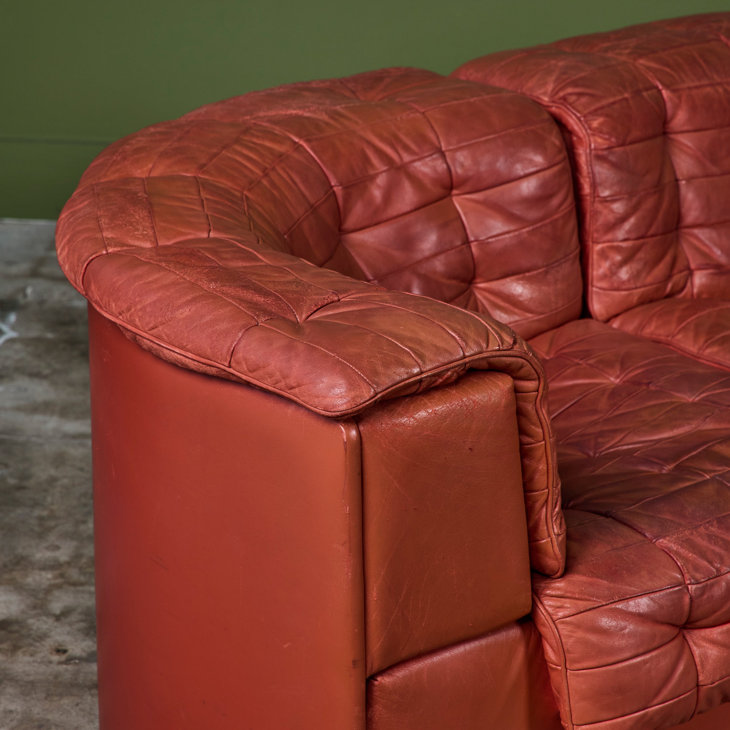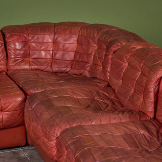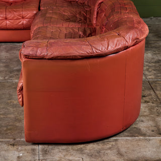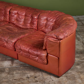 DS-11 seven piece burnt red leather sofa c.1970s, for De Sede, Switzerland. The modular system consists of three corner seats and four center seats all upholstered in the original perfectly patinated leather patchwork upholstery. It can be arranged as one large sectional sofa, two sofas or individual seats.