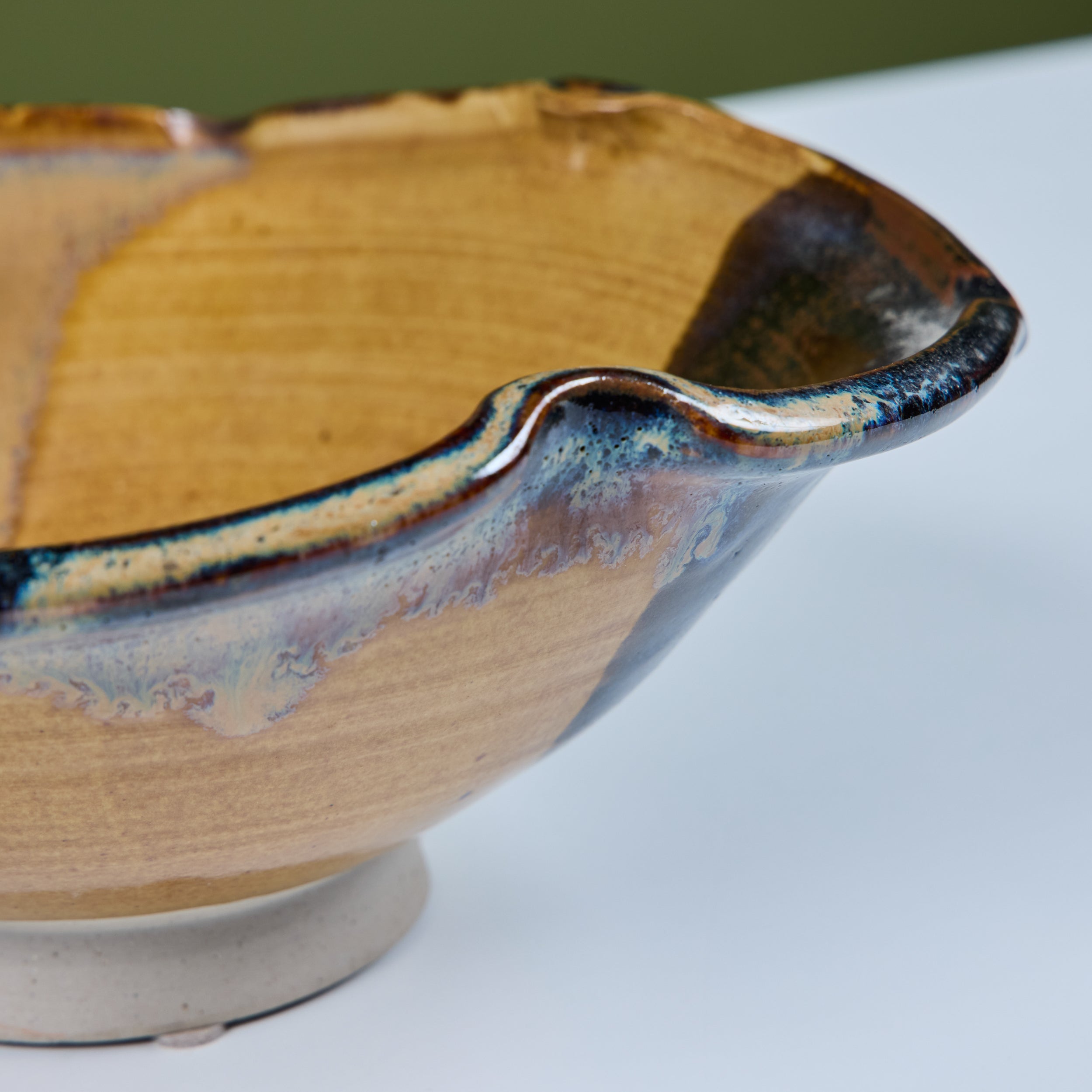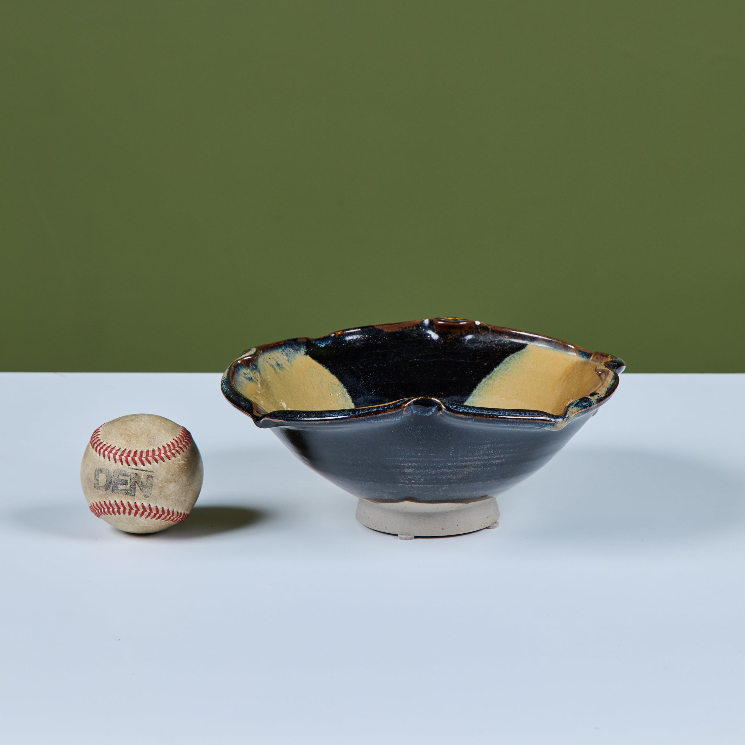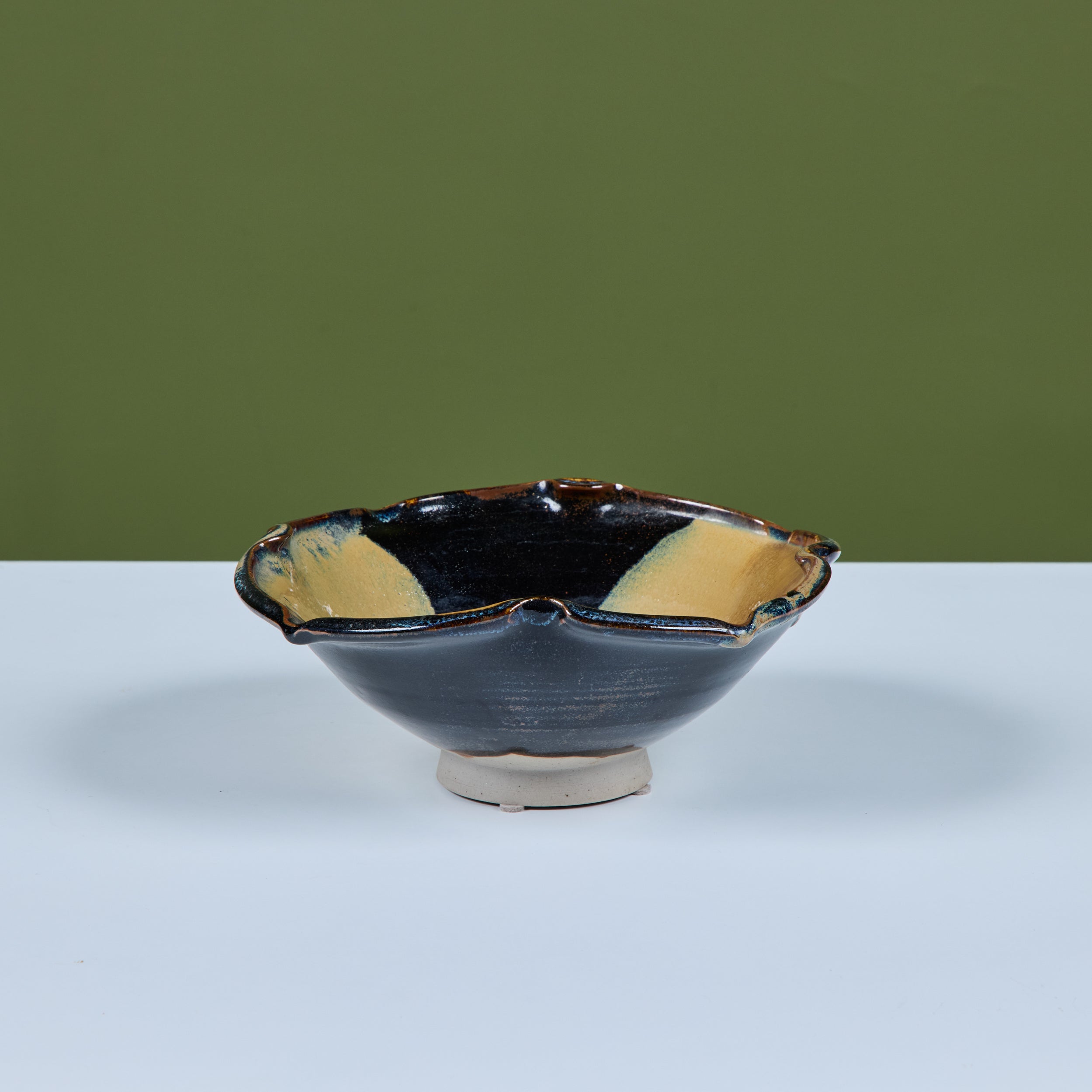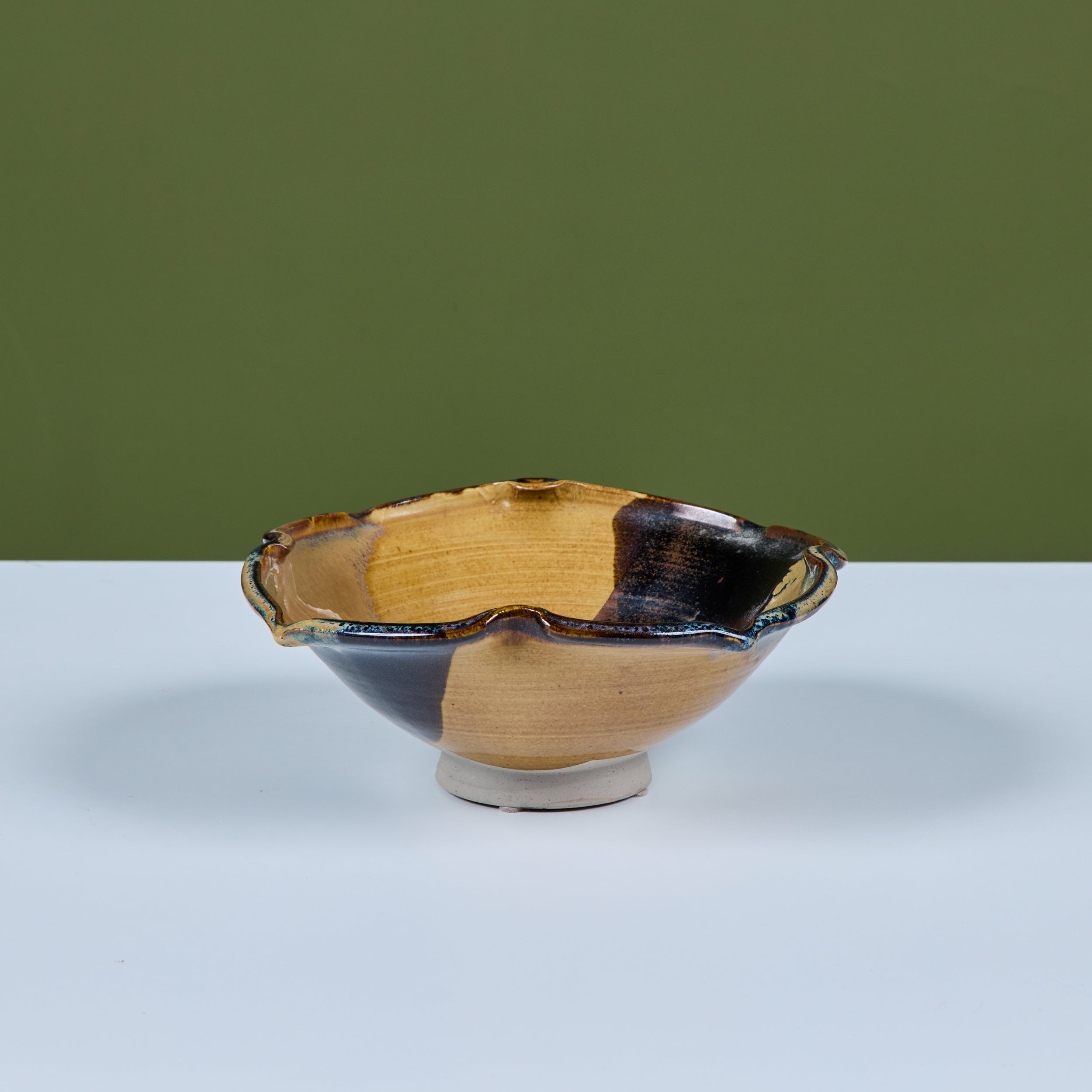 A wheel-thrown studio pottery bowl with steep sides. The rim of the bowl showcases a scalloped detail with a tan and black glaze throughout. The bowl has an unglazed footed bottom and is signed by the artist on the underside.