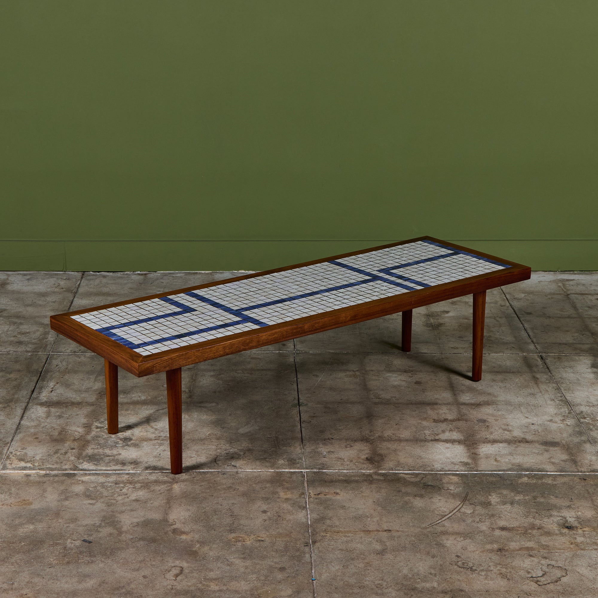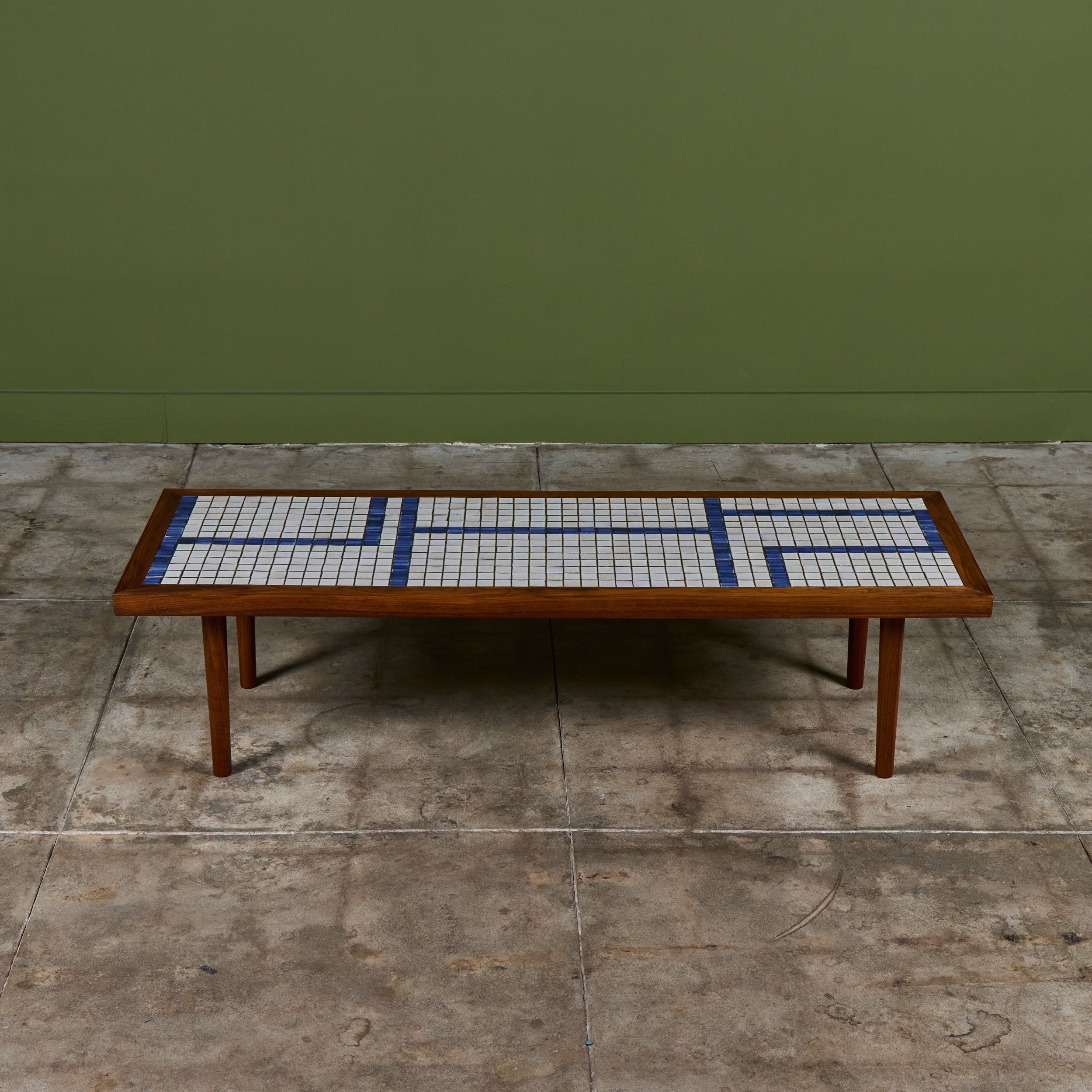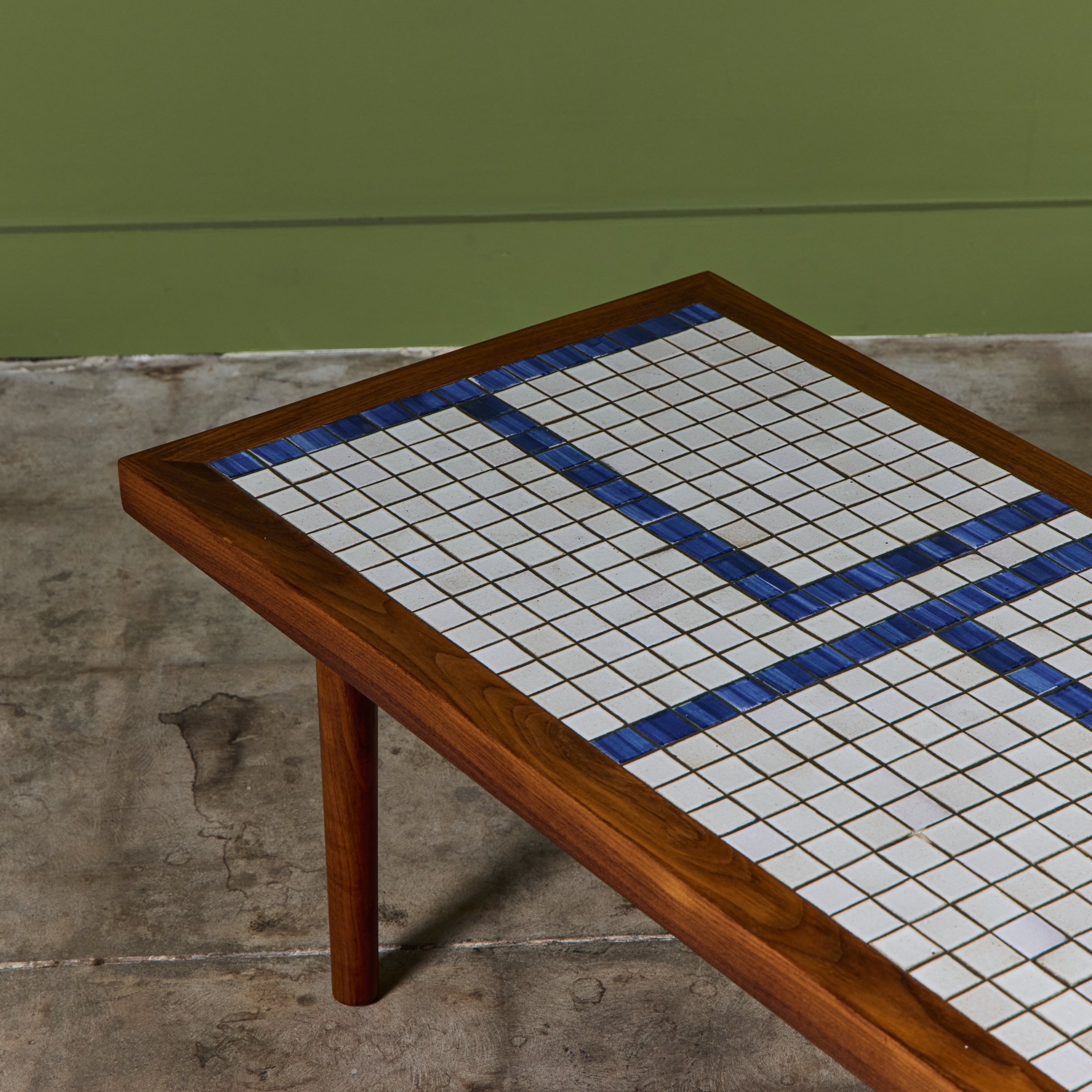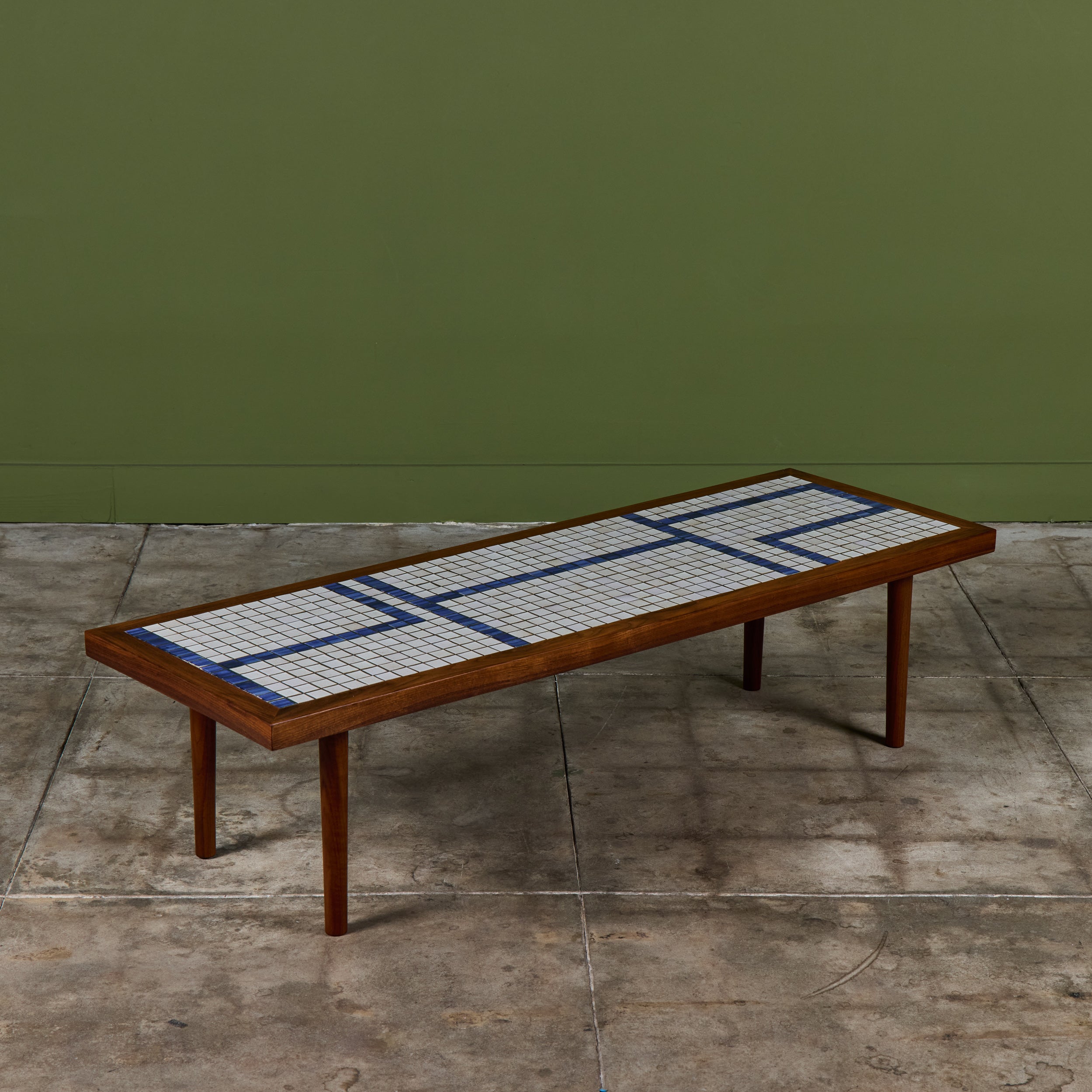 Rectangular coffee table by Gordon & Jane Martz for Marshall Studios. The walnut table top is inlaid with white square ceramic tiles with blue square tiles throughout creating a linear design. The legs and frame of the table are solid walnut.