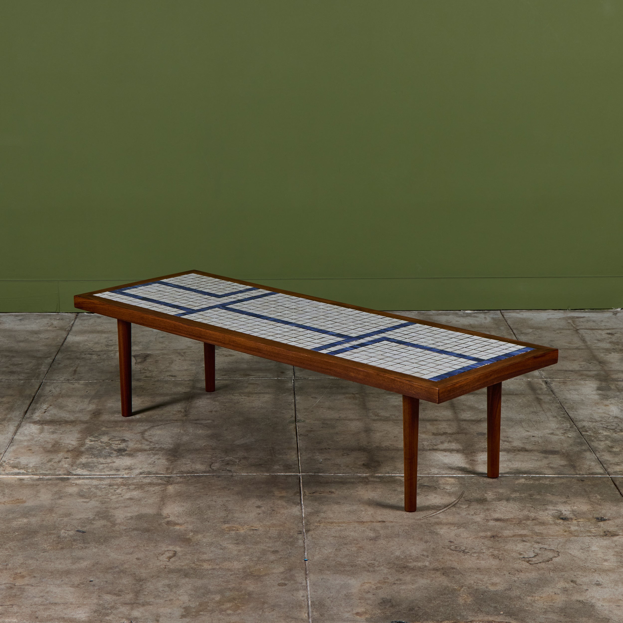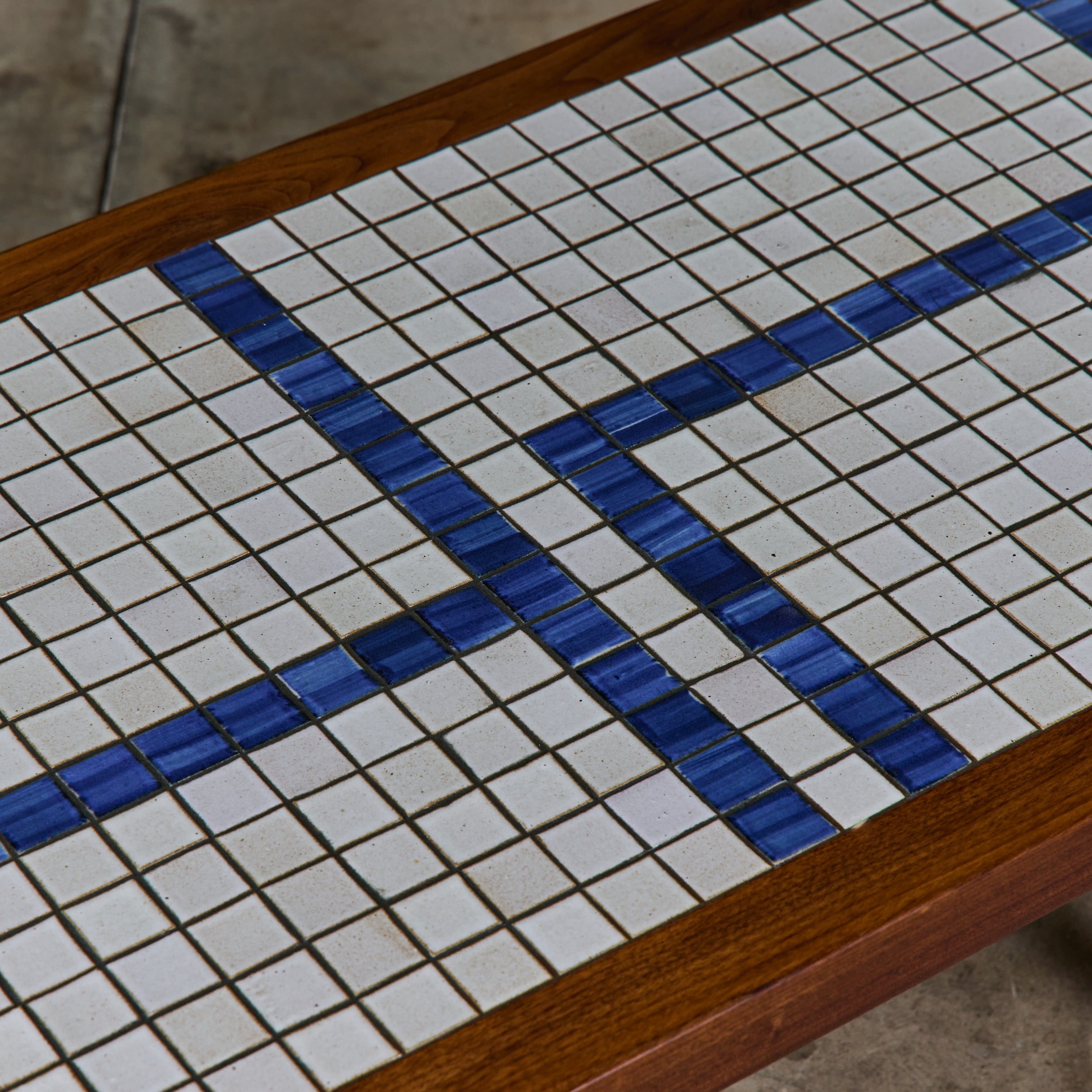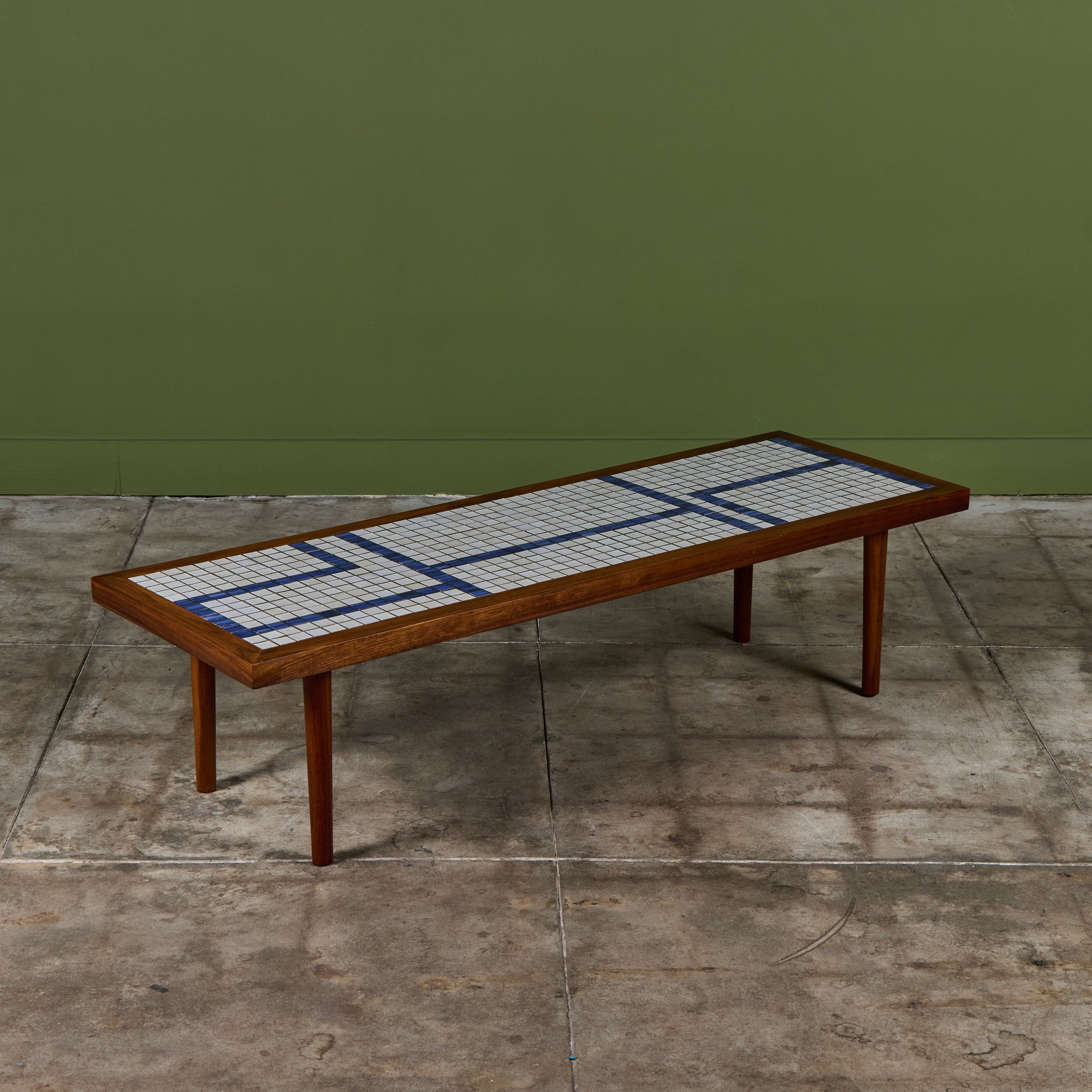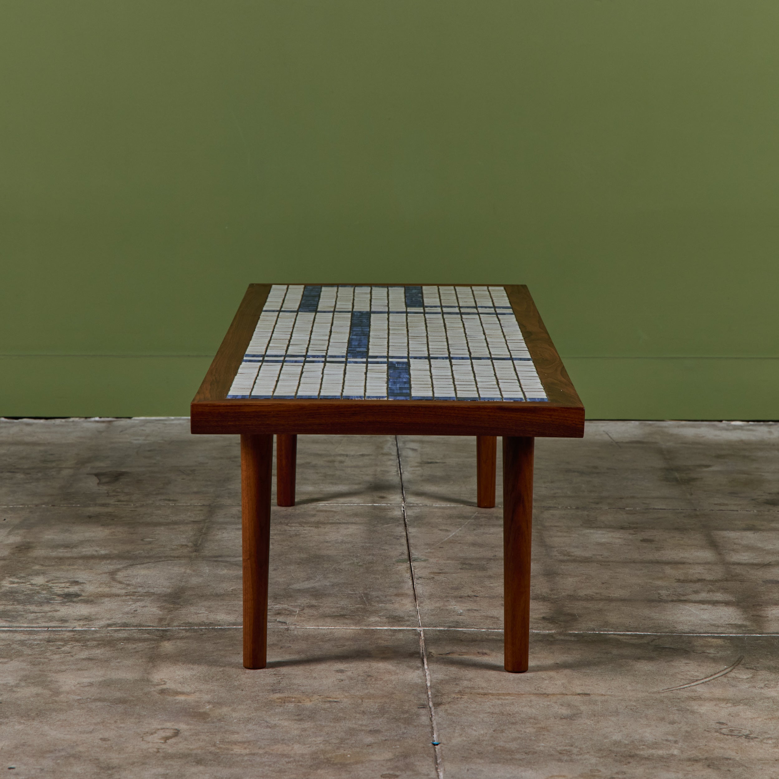 Rectangular coffee table by Gordon & Jane Martz for Marshall Studios. The walnut table top is inlaid with white square ceramic tiles with blue square tiles throughout creating a linear design. The legs and frame of the table are solid walnut.