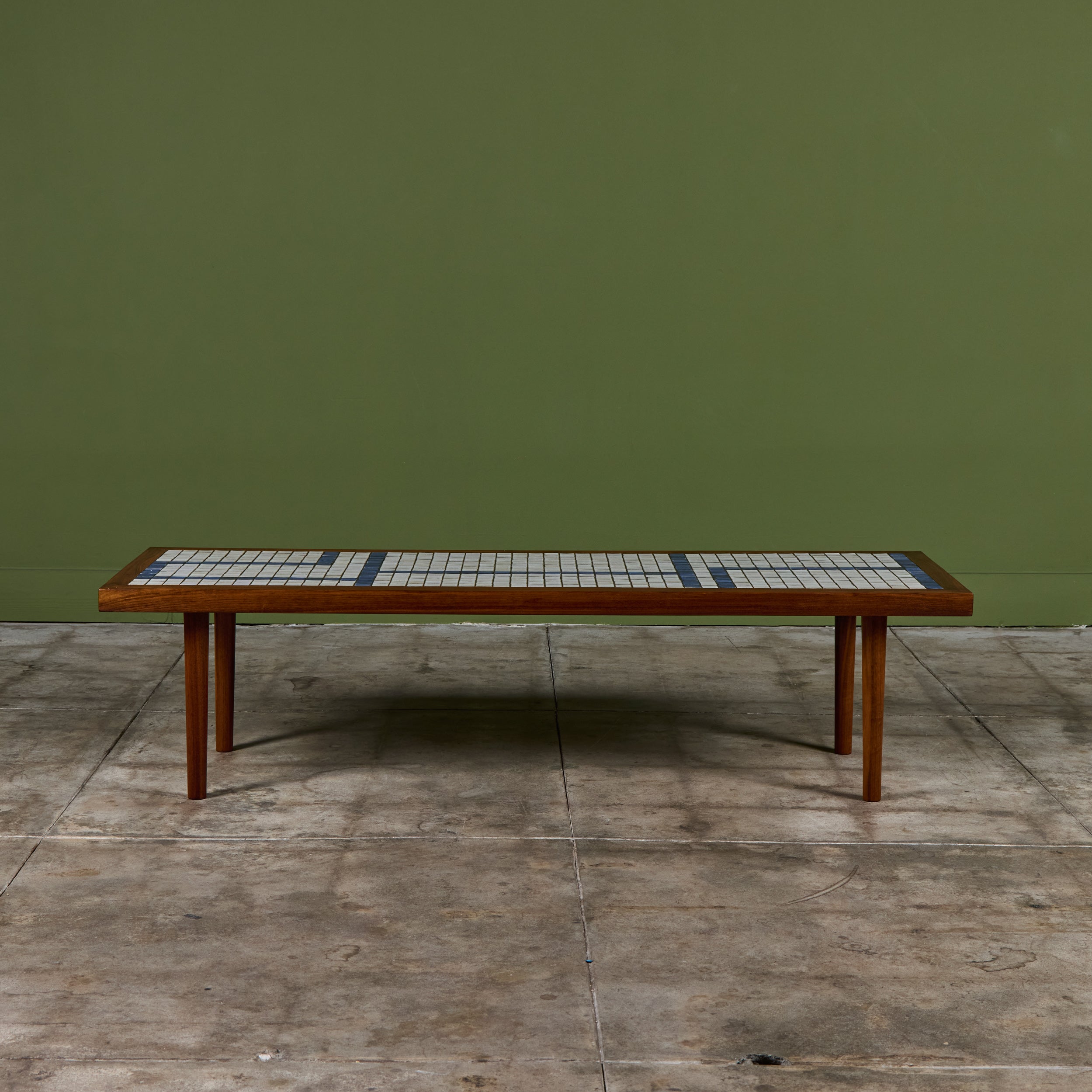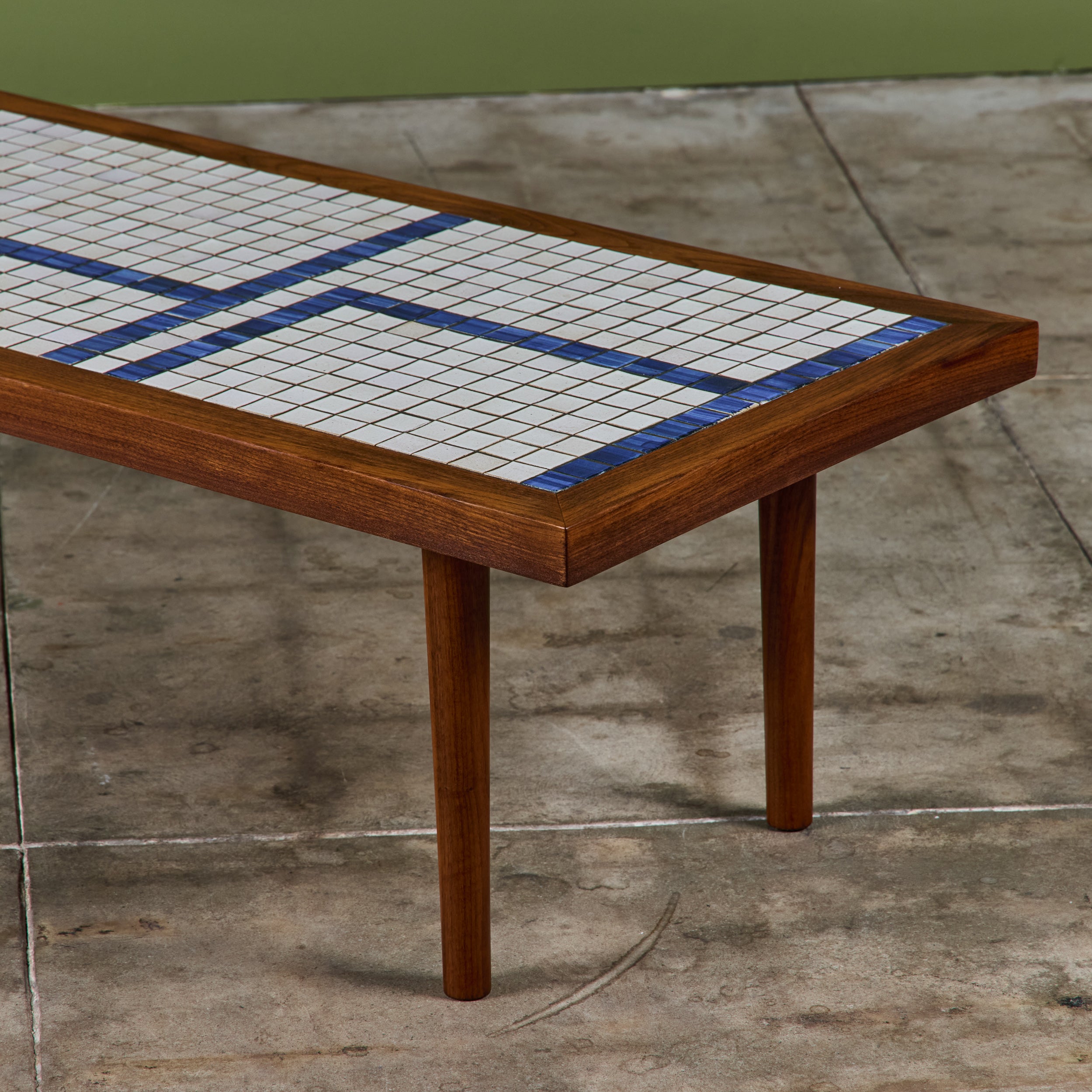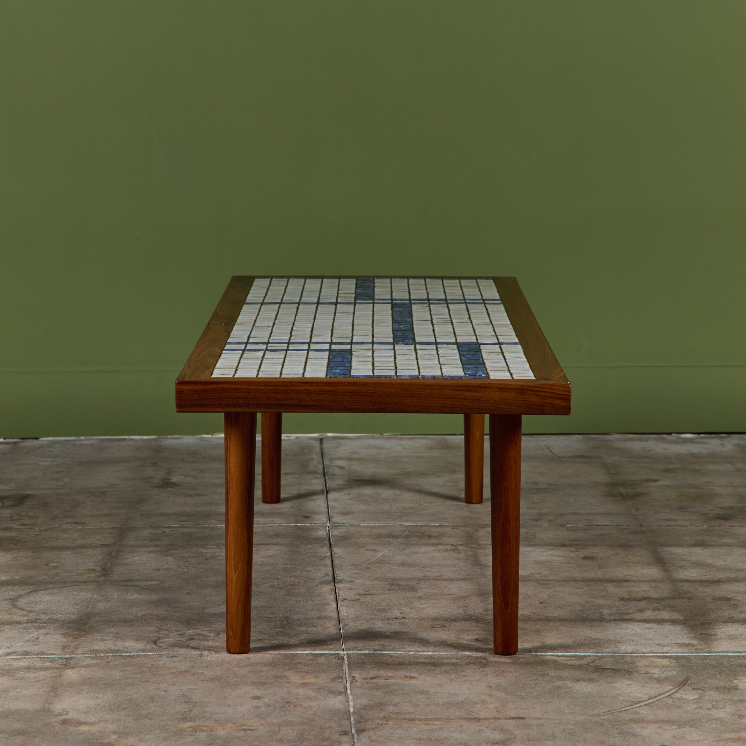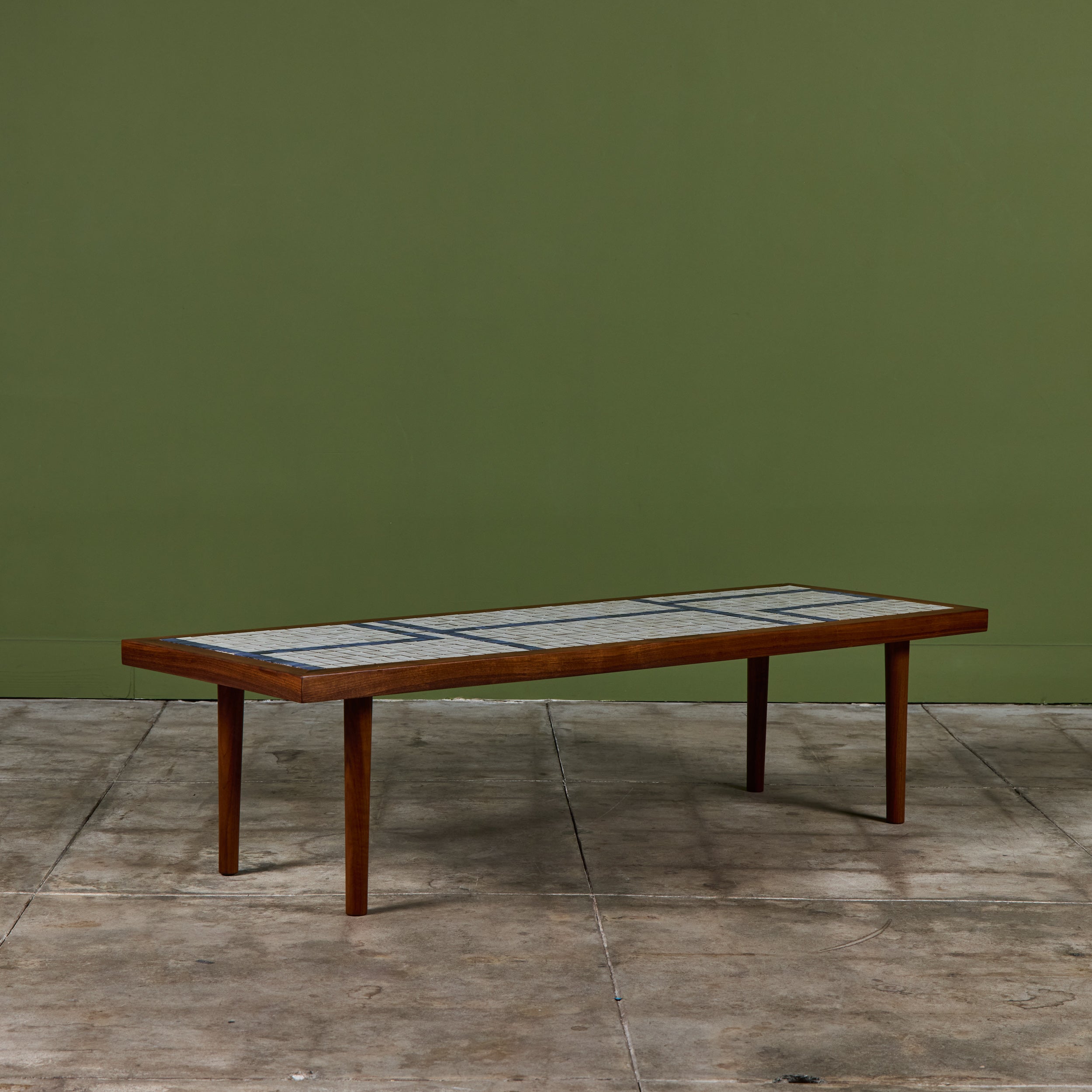 Rectangular coffee table by Gordon & Jane Martz for Marshall Studios. The walnut table top is inlaid with white square ceramic tiles with blue square tiles throughout creating a linear design. The legs and frame of the table are solid walnut.