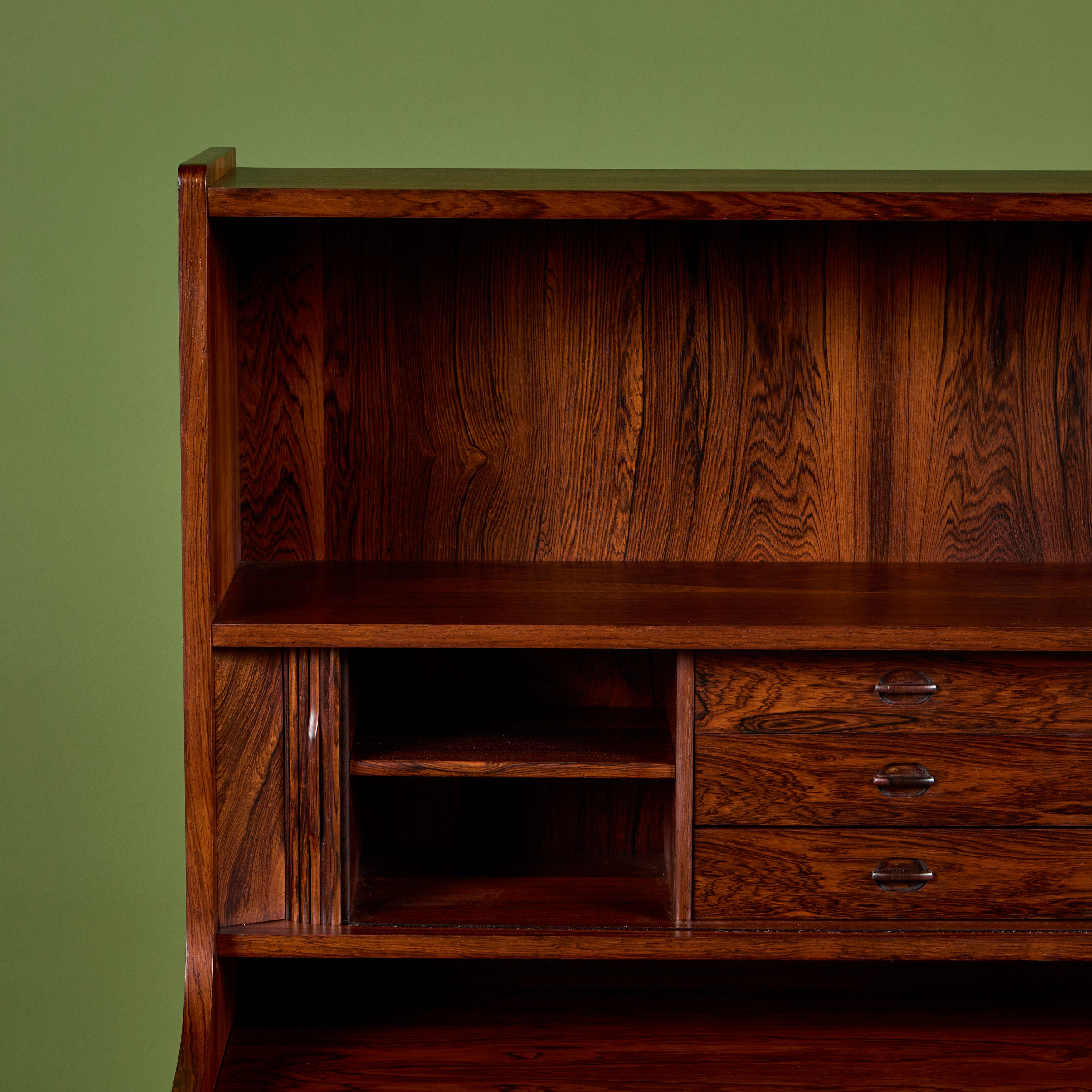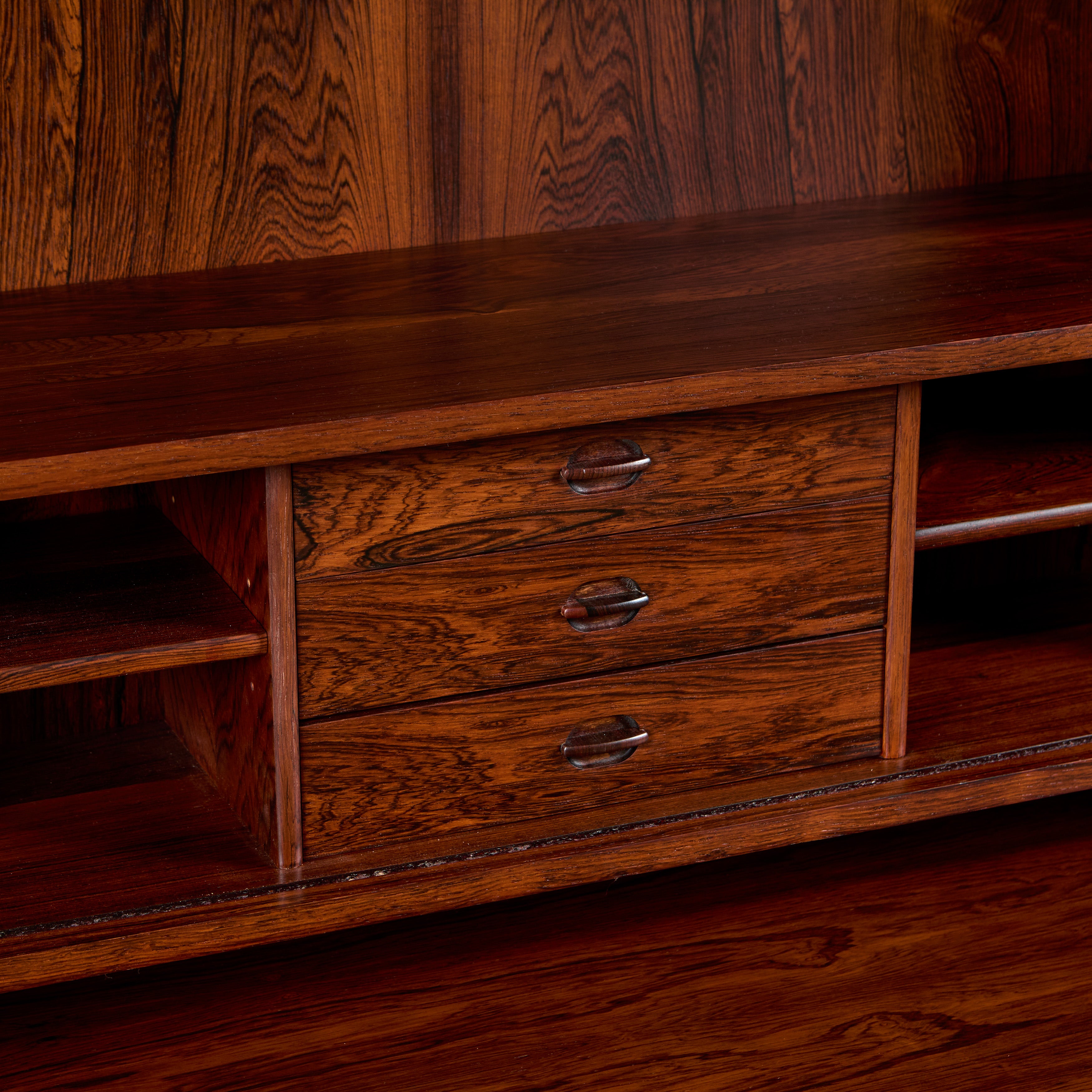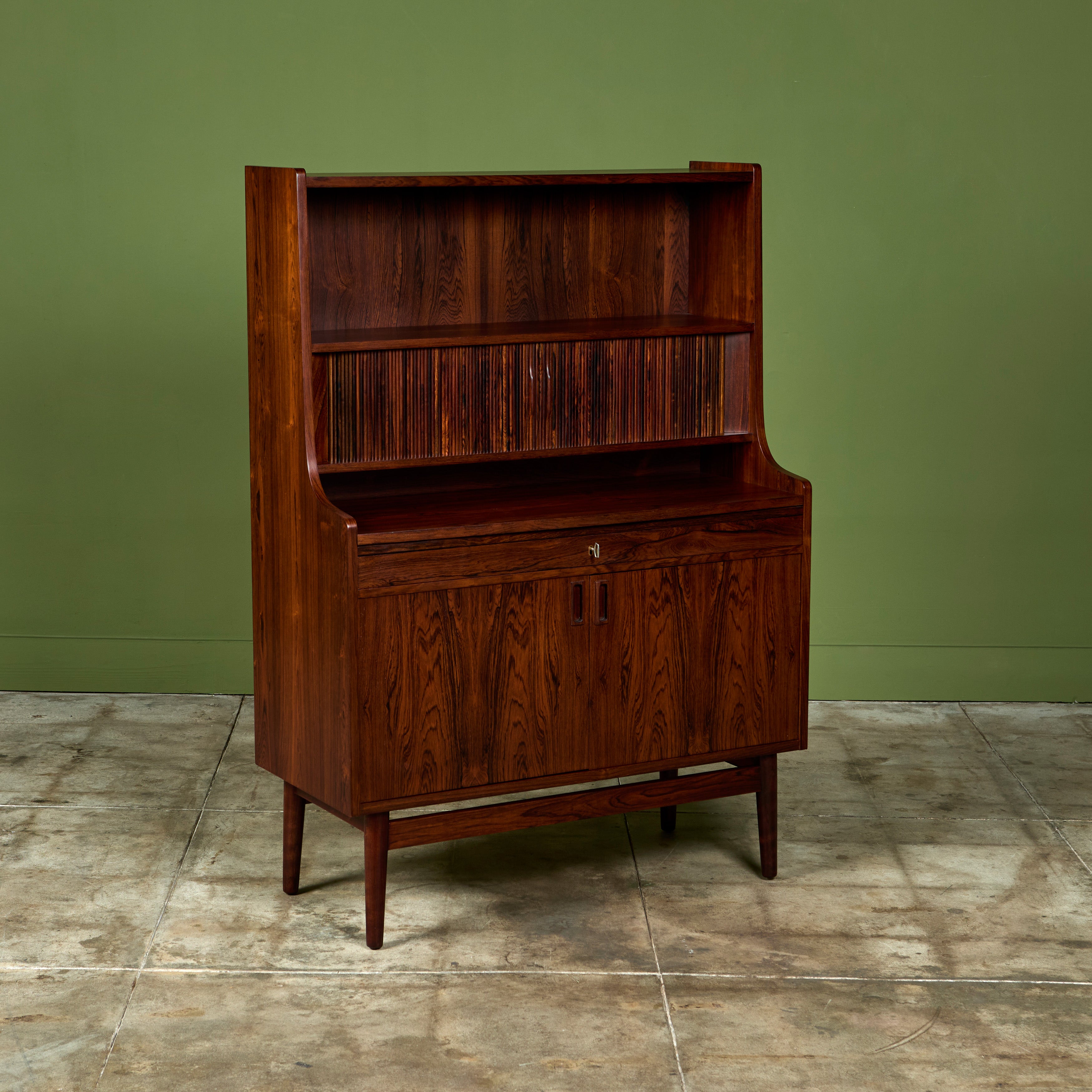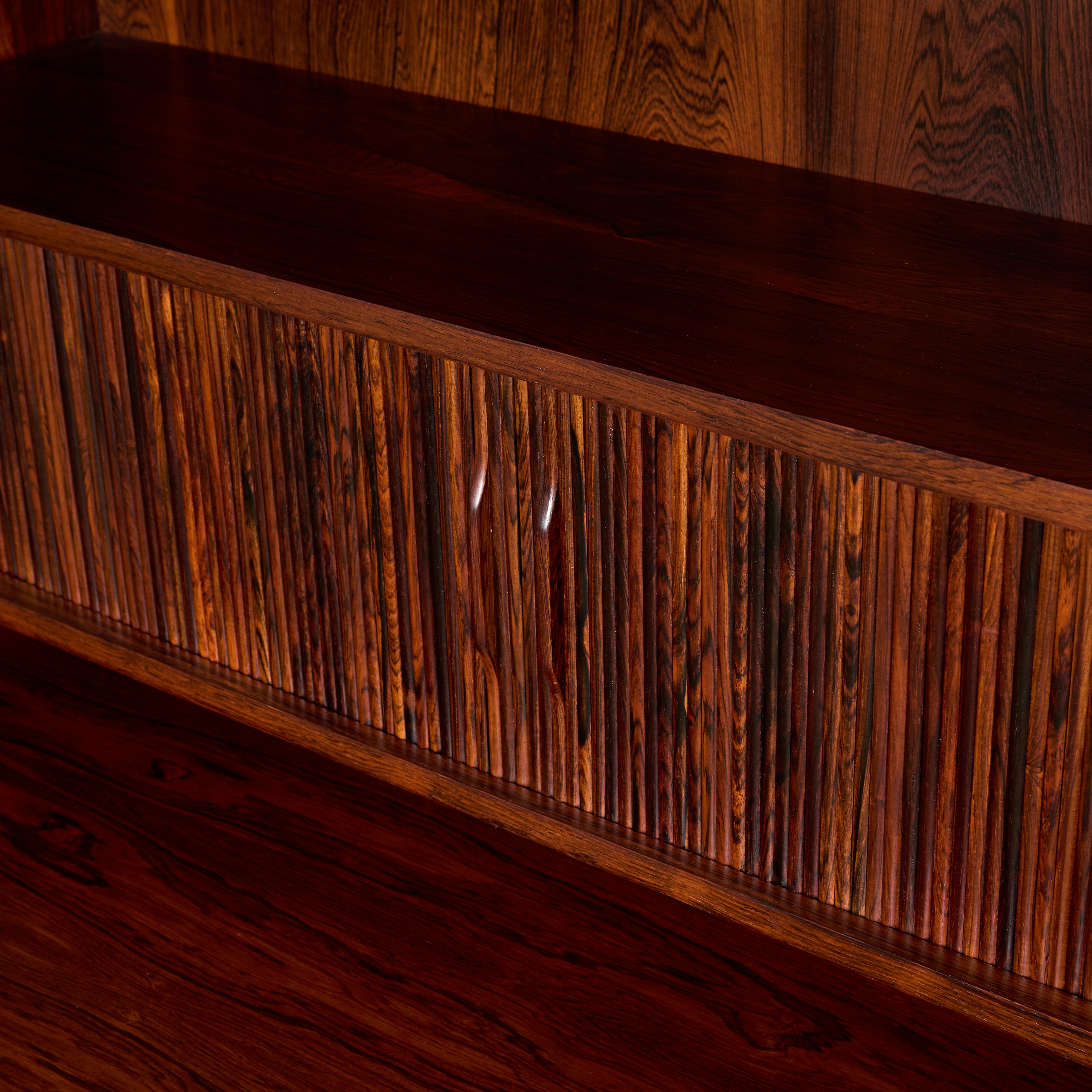 Stunning rosewood cabinet by Johannes Sorth for Bornholm c.1960s, Denmark. The upper section of the piece features an open shelf with tambour sliding doors below. Inside the doors are three center drawers flanked by petite shelving. What looks to be a top drawer is actually a pull out vanity mirror. The bottom portion of the piece showcases a table top with locking drawer below. Finally there are two cabinet doors with one adjustable shelf inside. The entire pieces is supported by four tapered dowel legs.