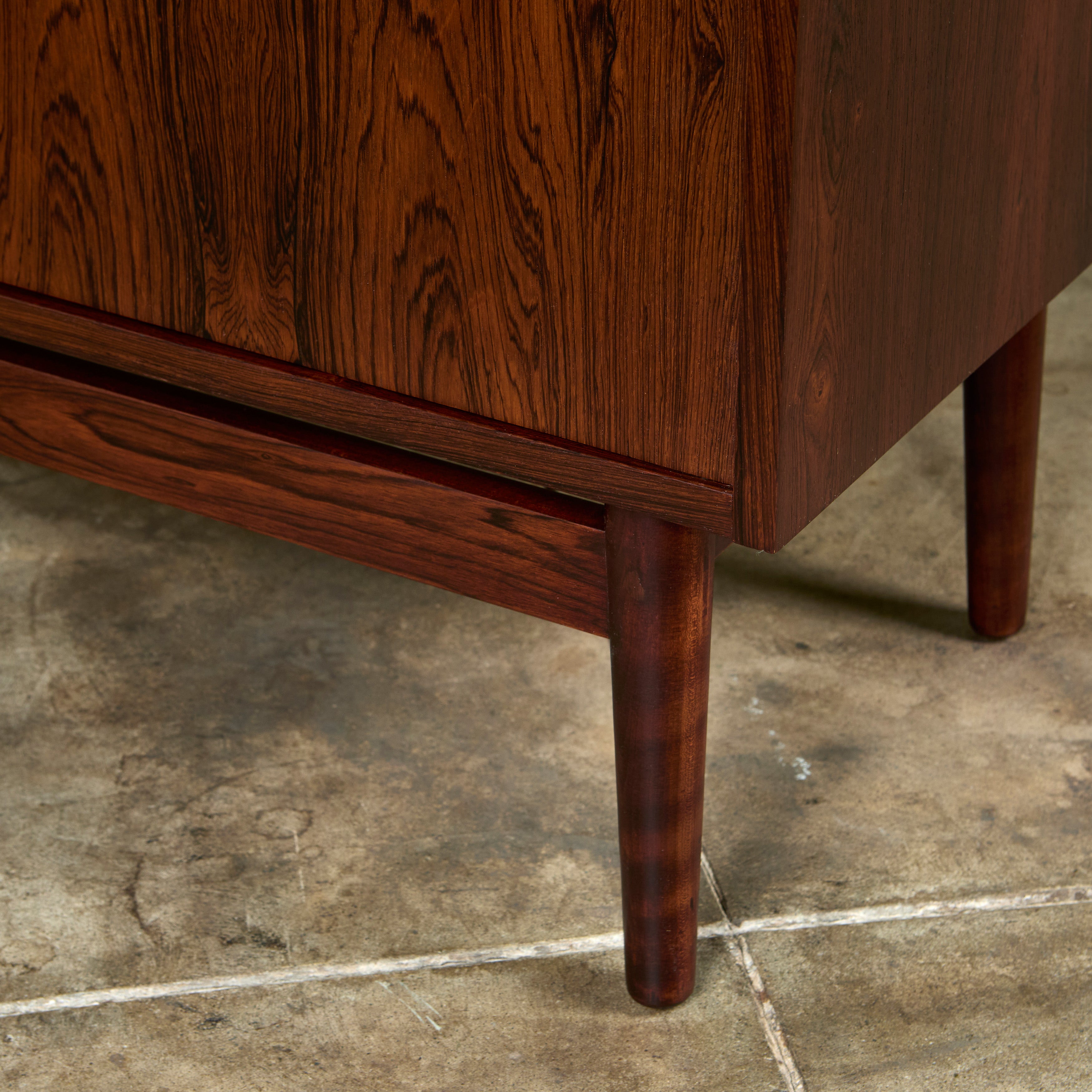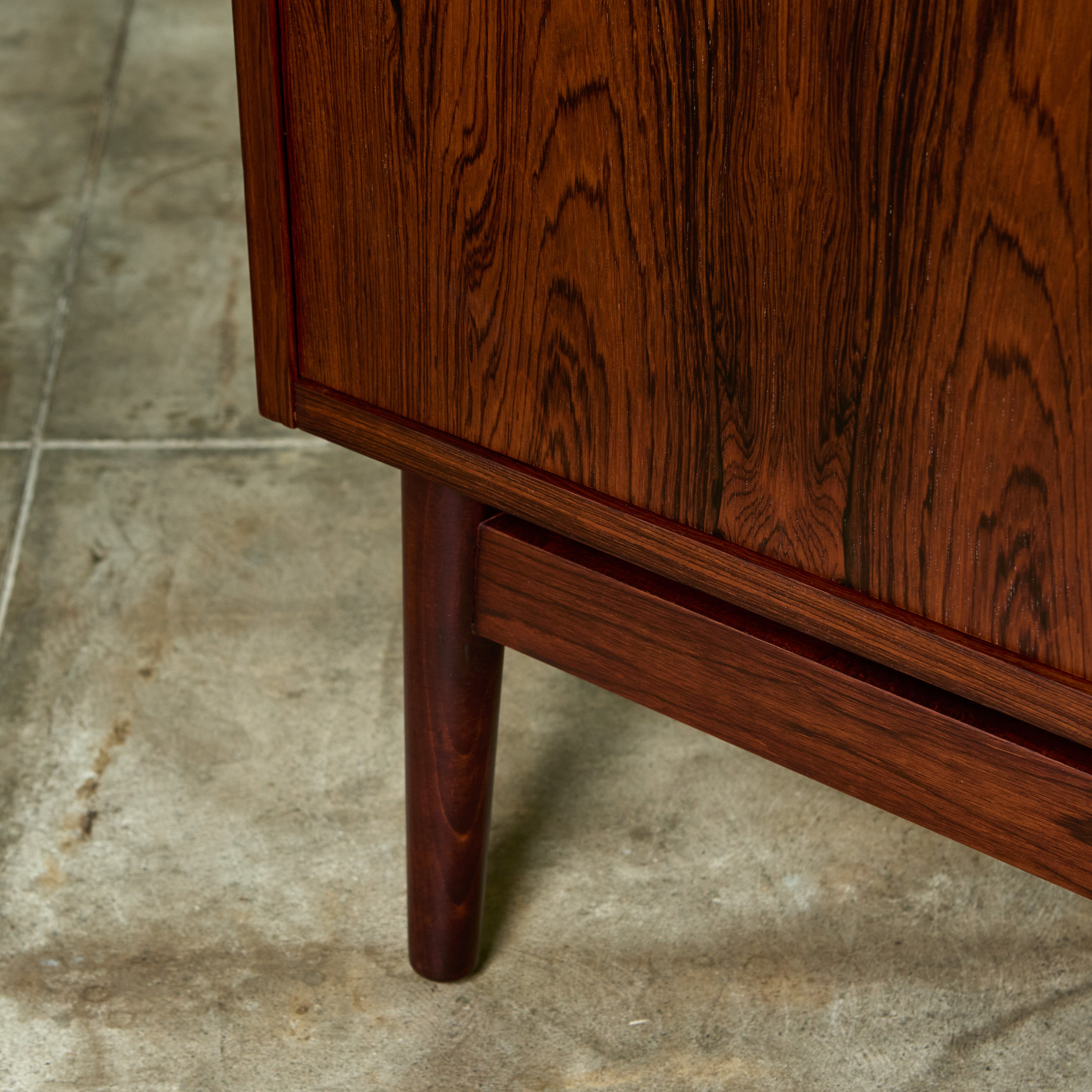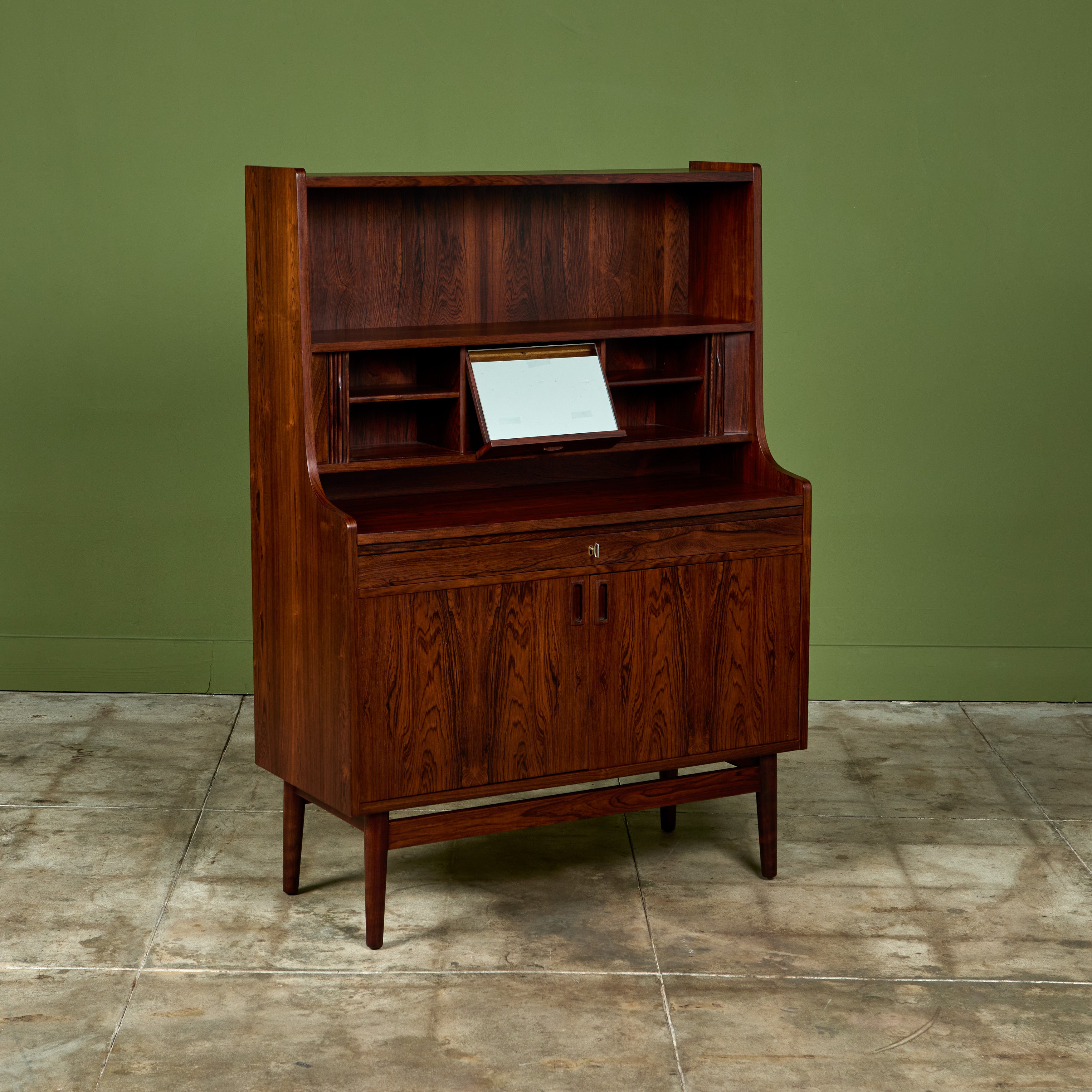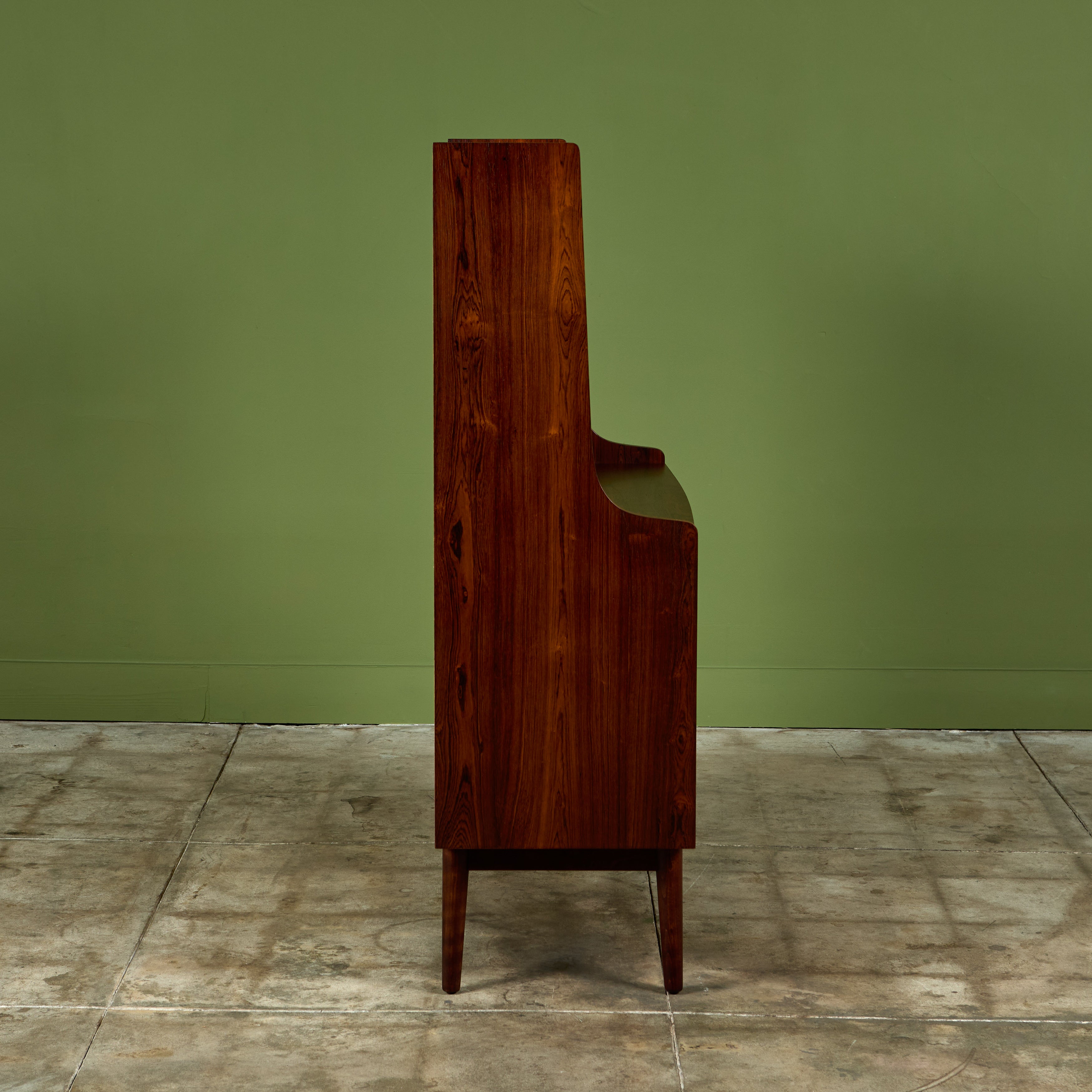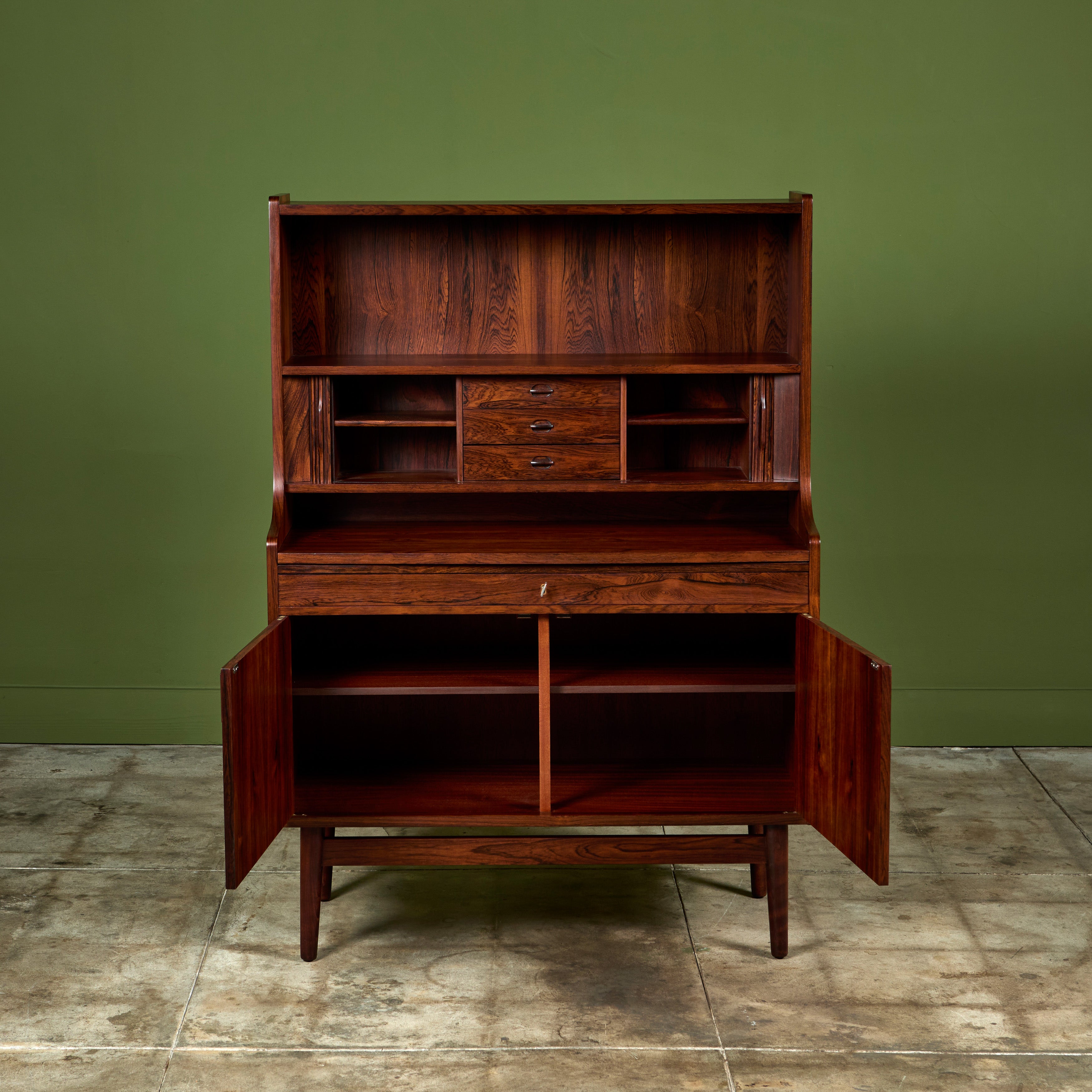 Stunning rosewood cabinet by Johannes Sorth for Bornholm c.1960s, Denmark. The upper section of the piece features an open shelf with tambour sliding doors below. Inside the doors are three center drawers flanked by petite shelving. What looks to be a top drawer is actually a pull out vanity mirror. The bottom portion of the piece showcases a table top with locking drawer below. Finally there are two cabinet doors with one adjustable shelf inside. The entire pieces is supported by four tapered dowel legs.