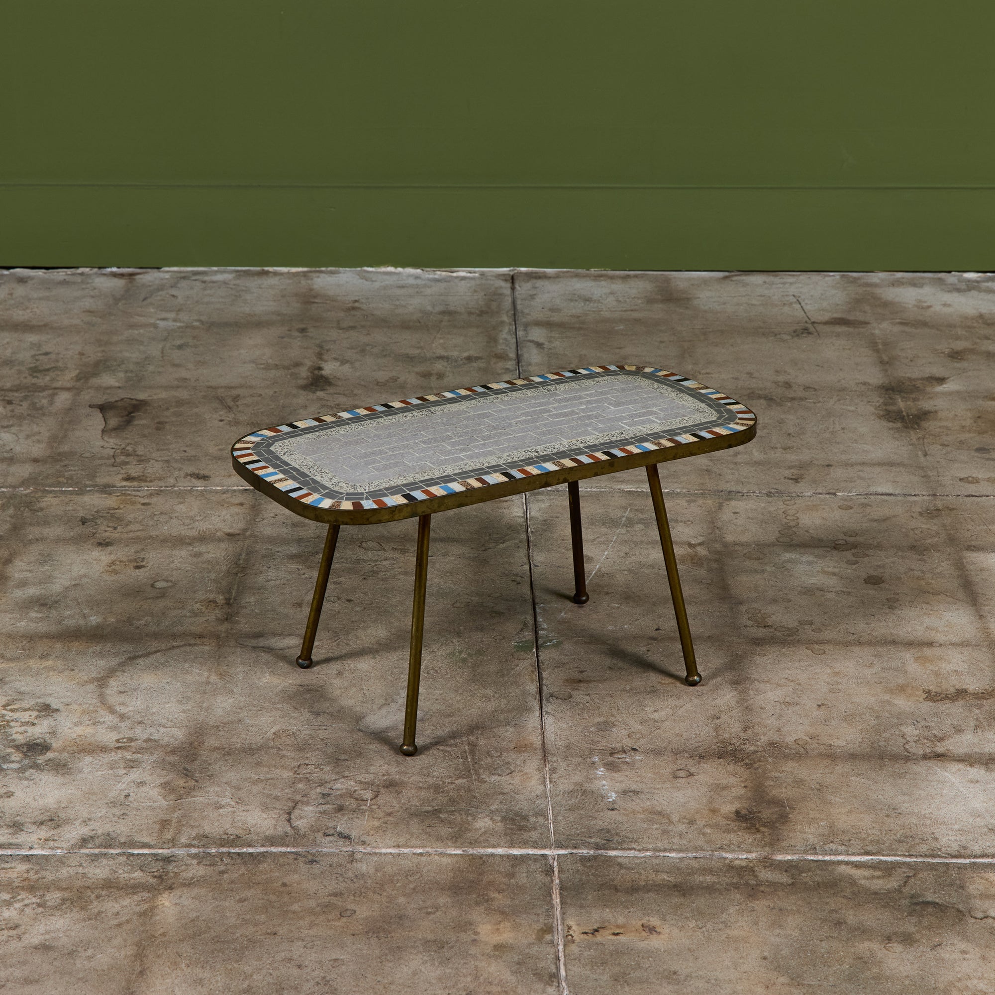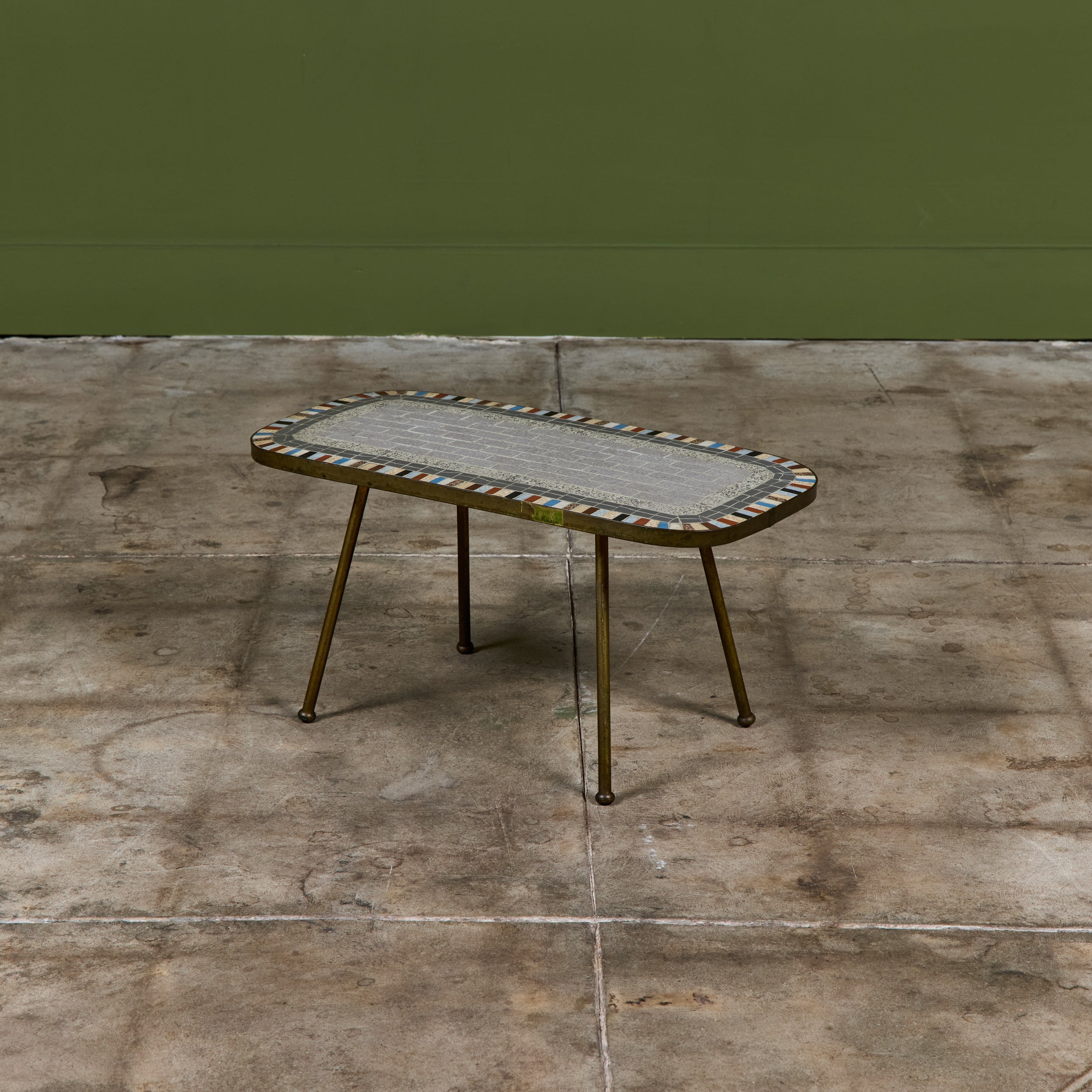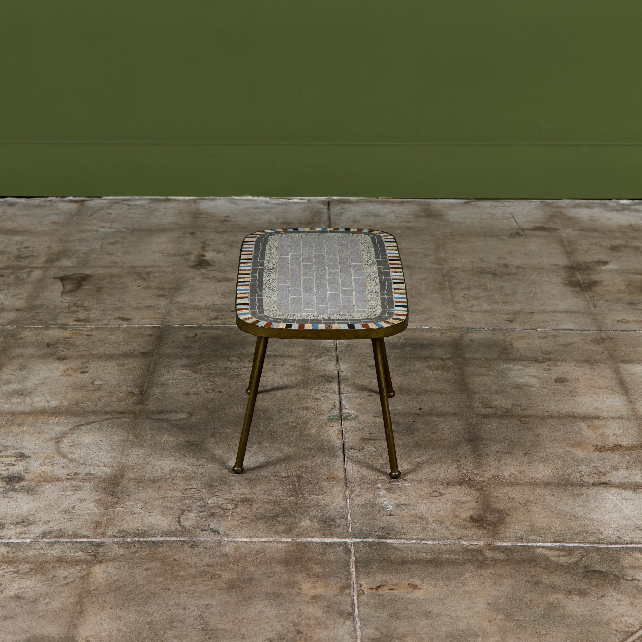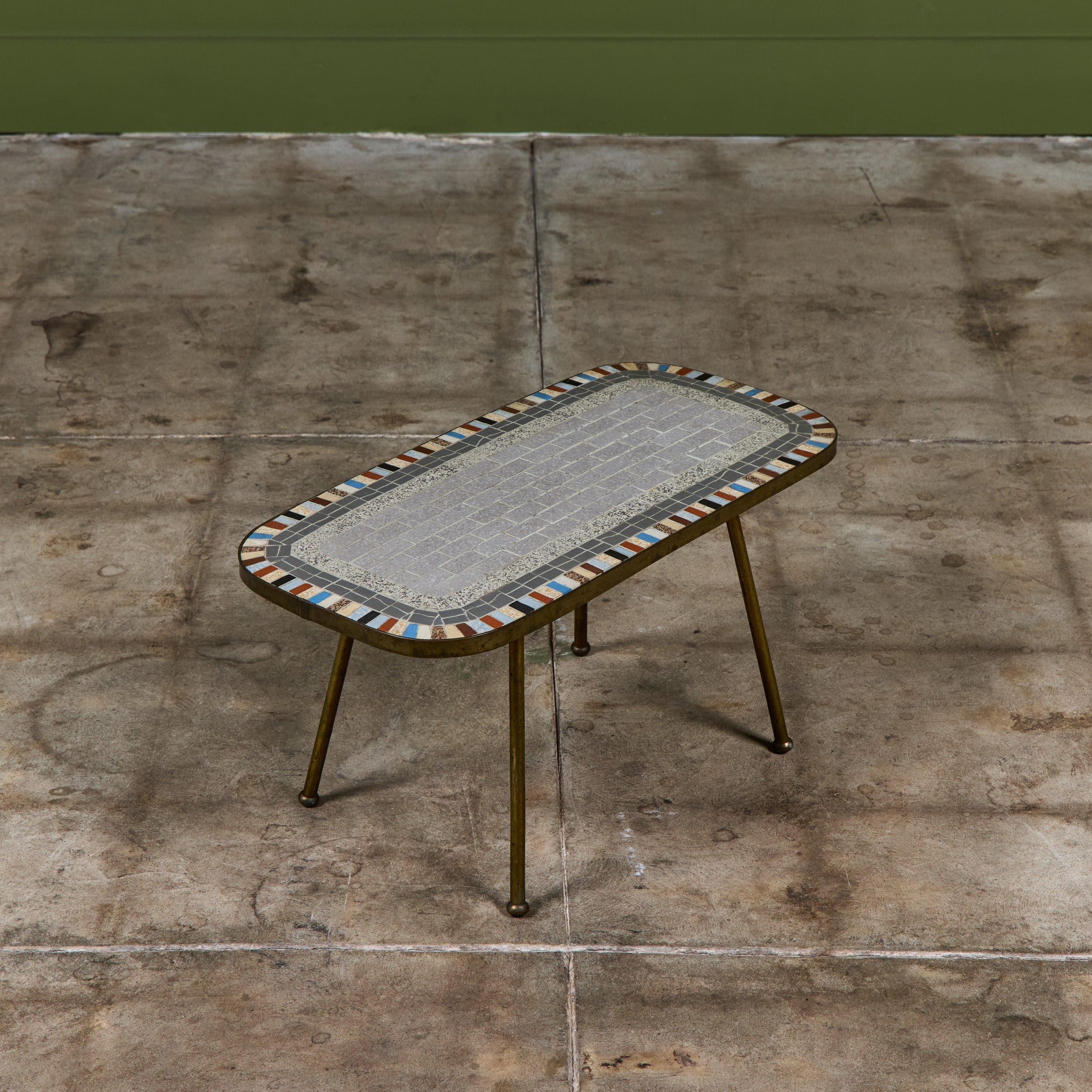Patinated brass side table for Mosaikmöbel, c.1950s, Germany. The table features a mosaic tile table top composed of rectangular and square tiles, with a patinated brass frame and four slender legs.