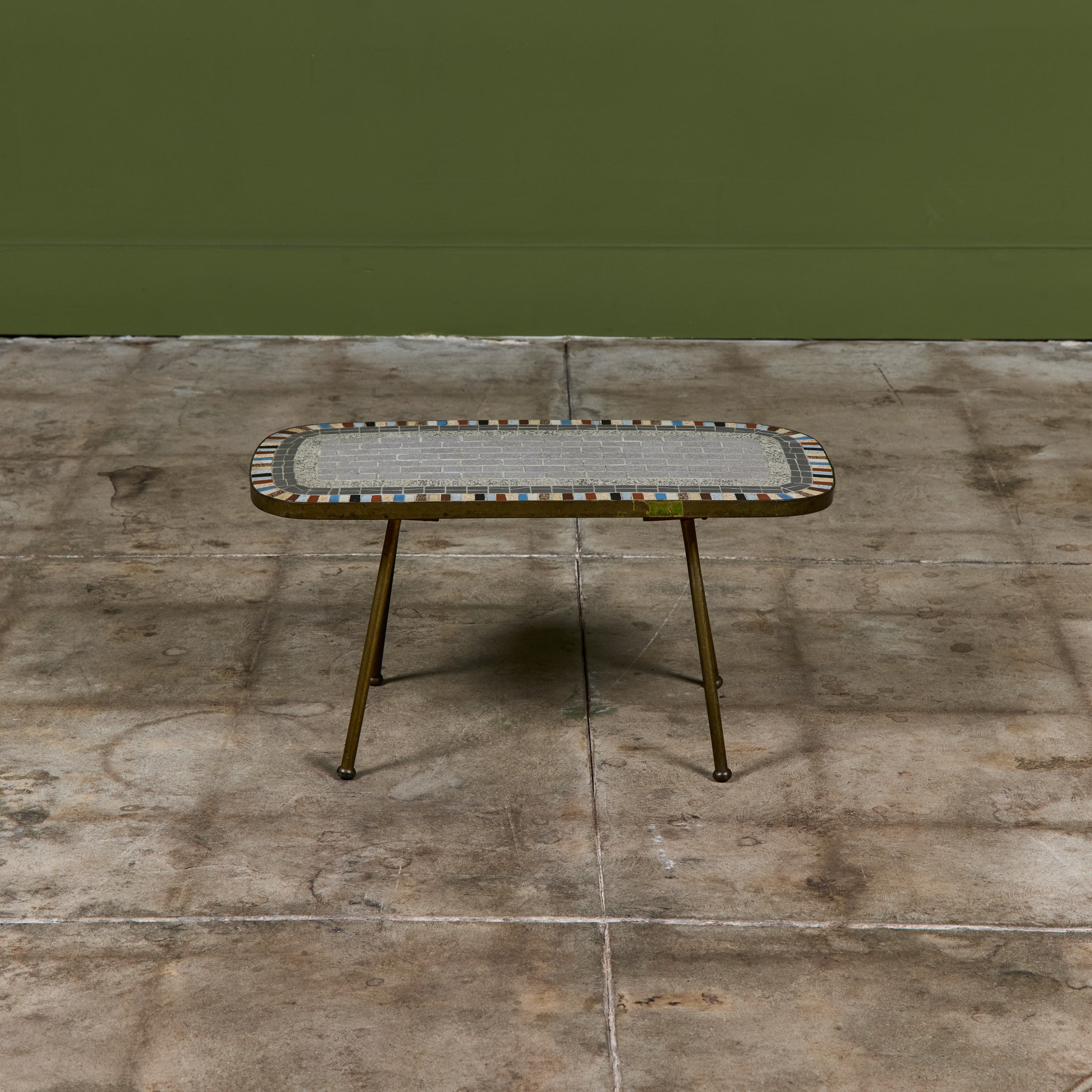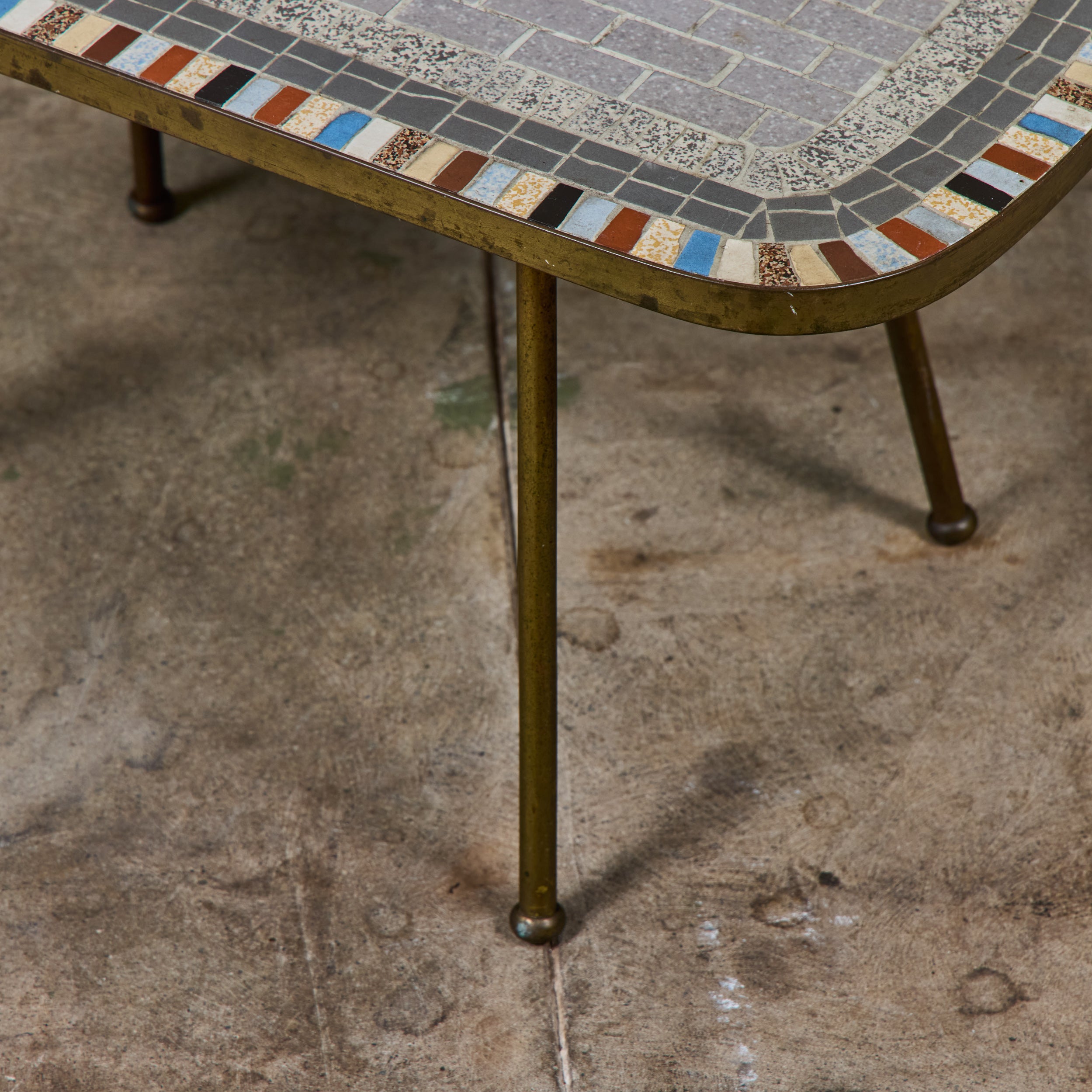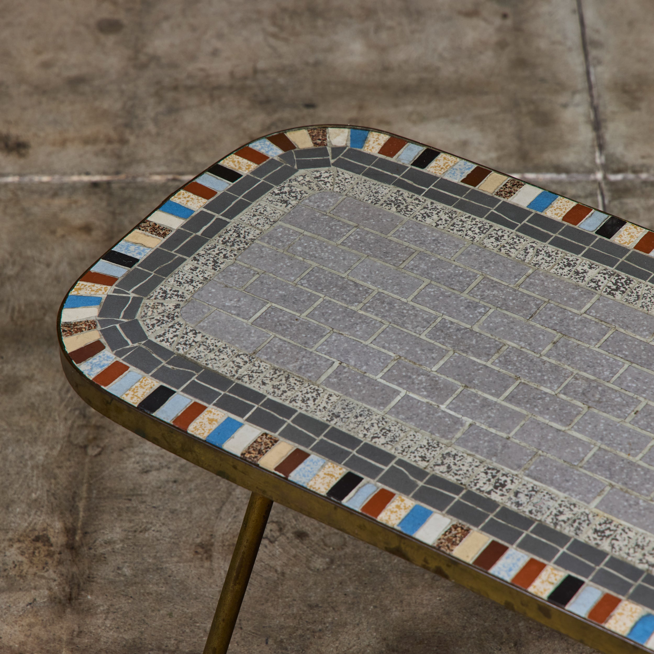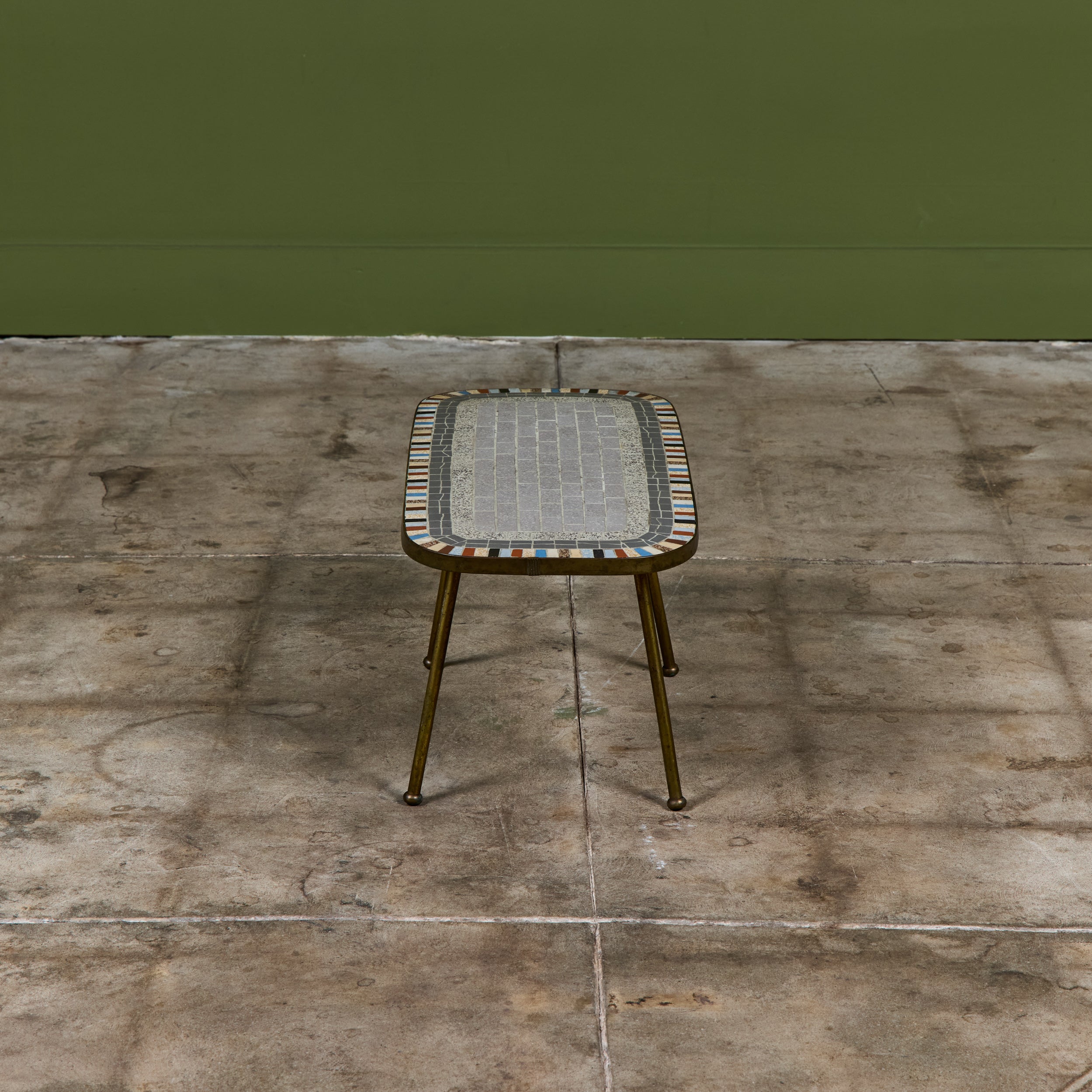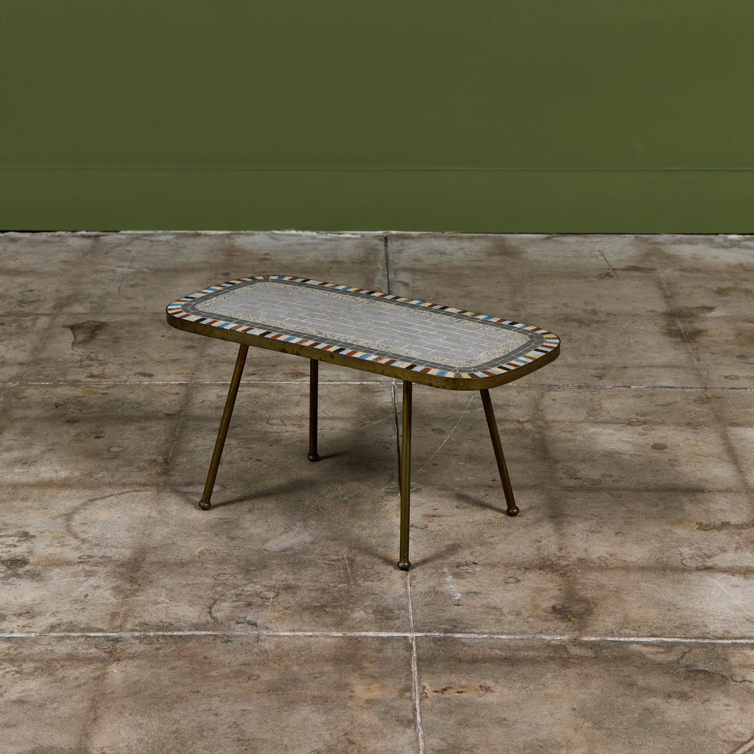 Patinated brass side table for Mosaikmöbel, c.1950s, Germany. The table features a mosaic tile table top composed of rectangular and square tiles, with a patinated brass frame and four slender legs.