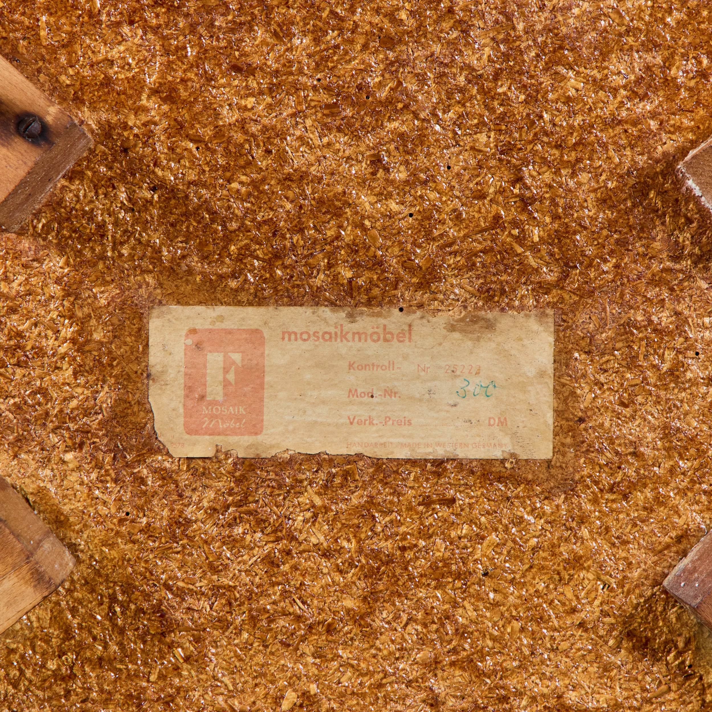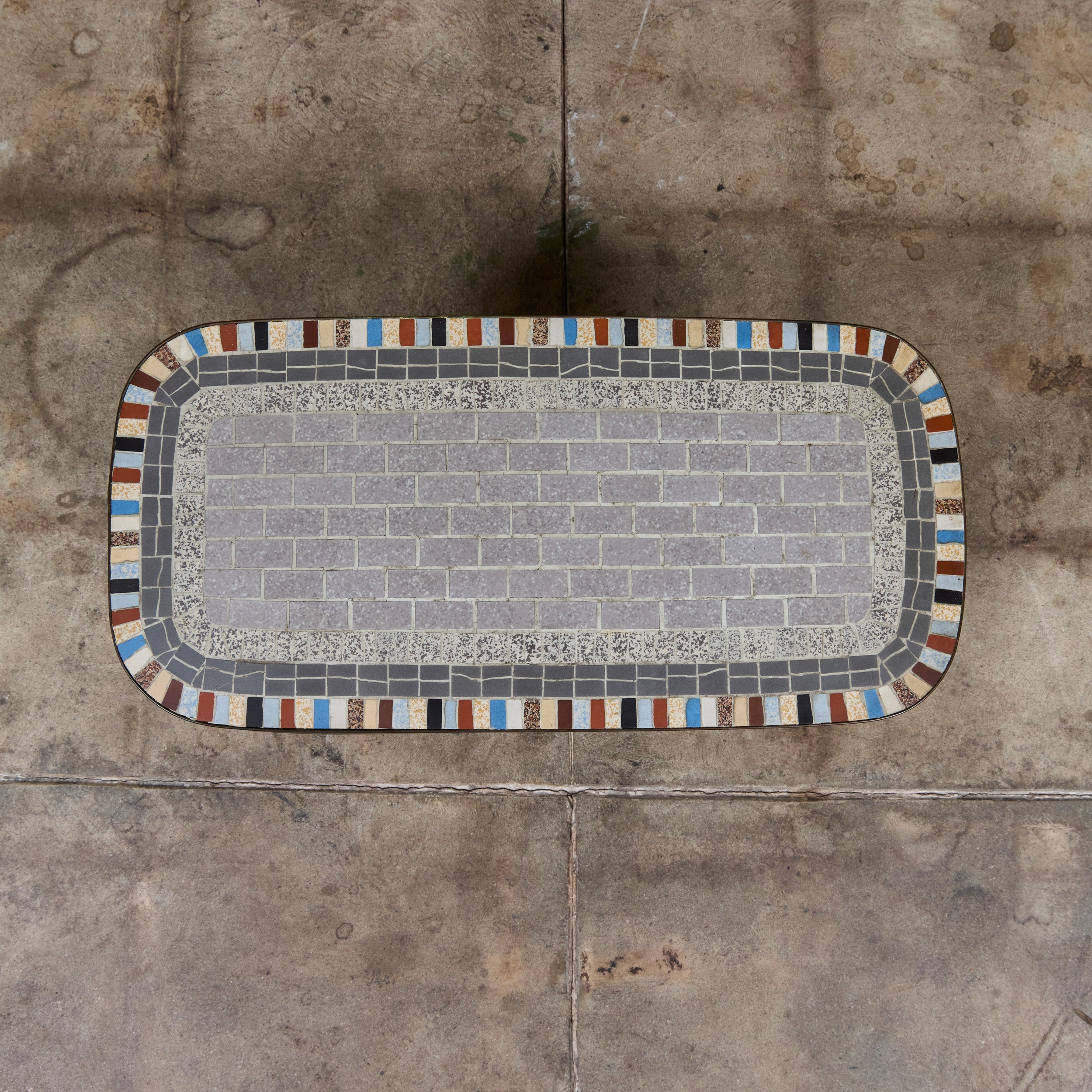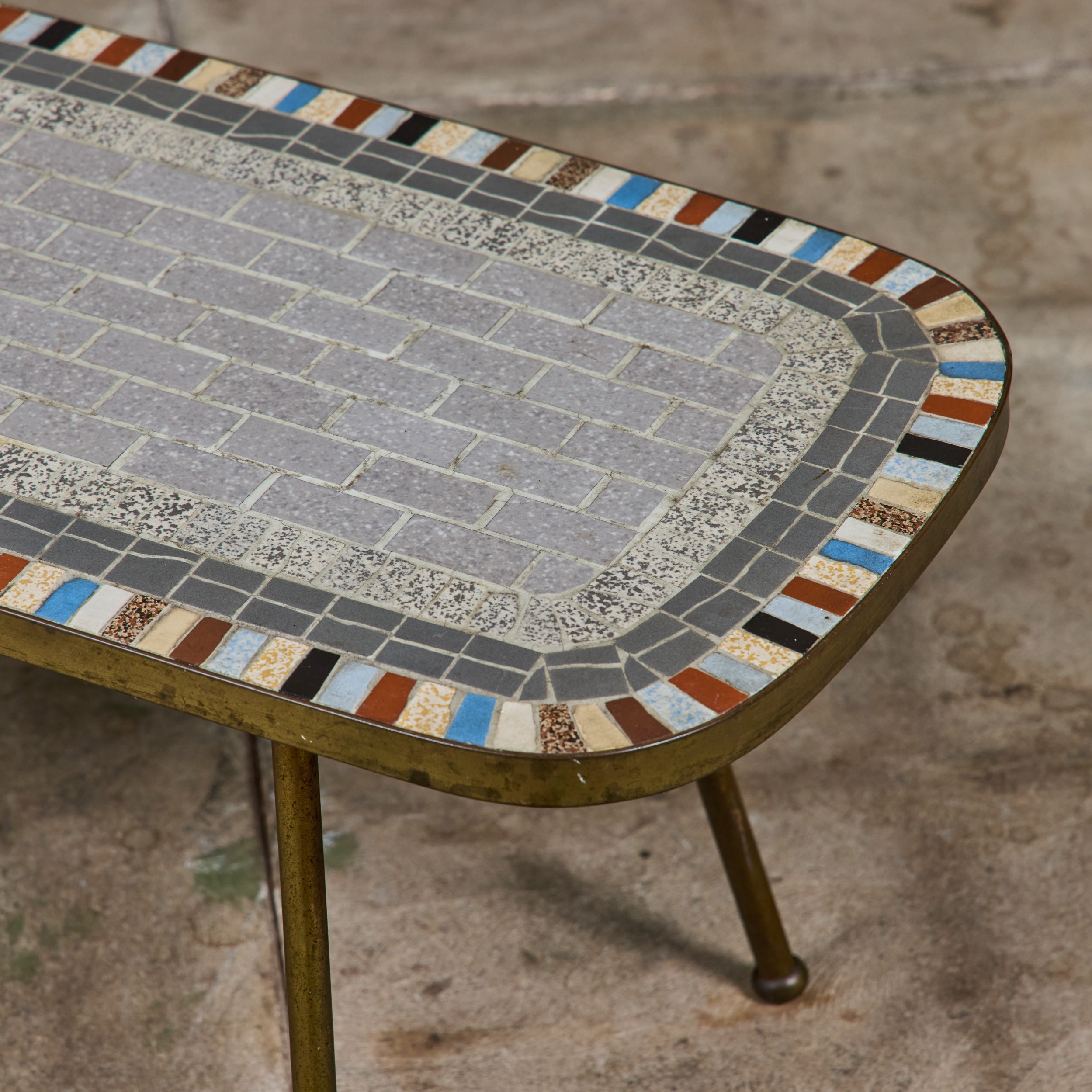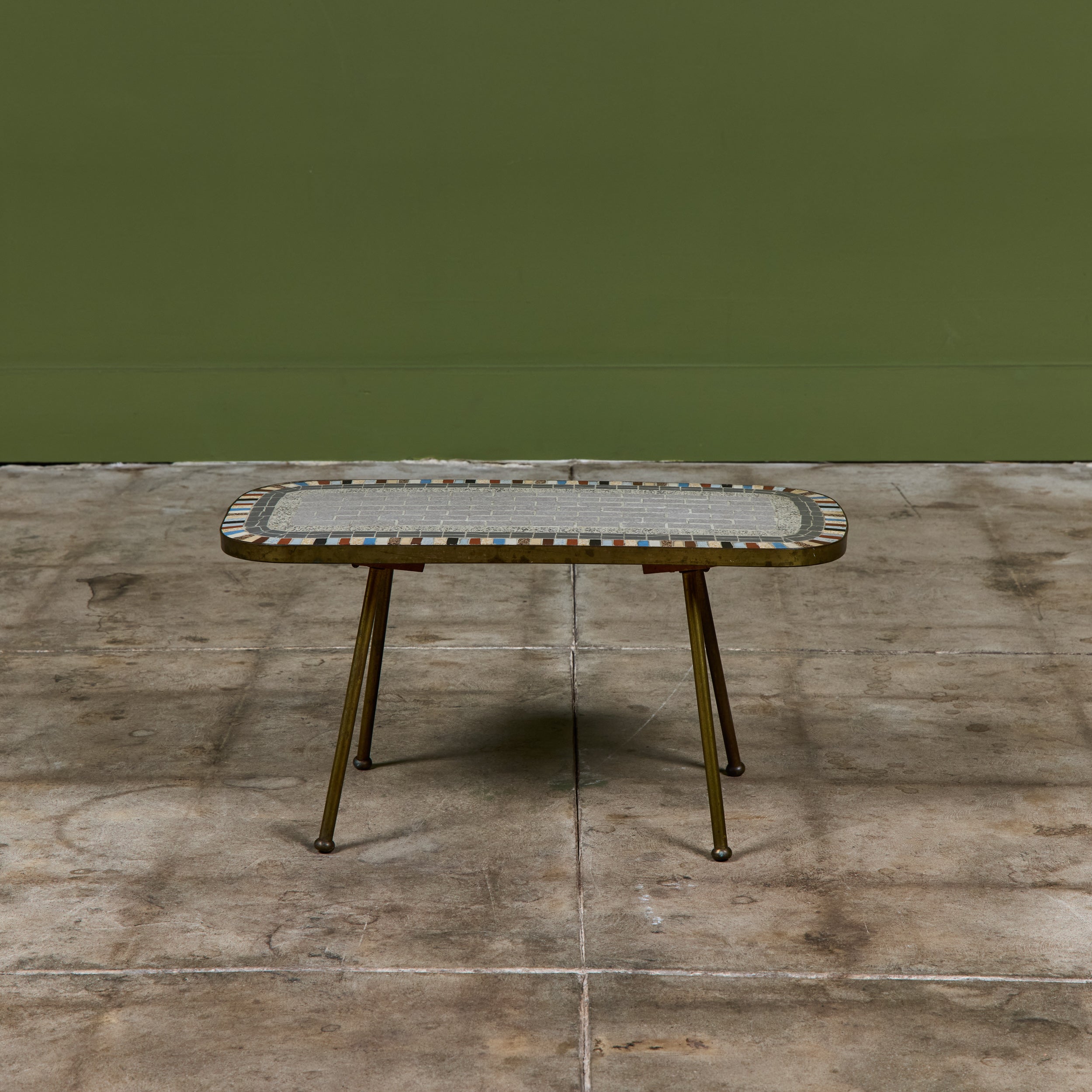 Patinated brass side table for Mosaikmöbel, c.1950s, Germany. The table features a mosaic tile table top composed of rectangular and square tiles, with a patinated brass frame and four slender legs.