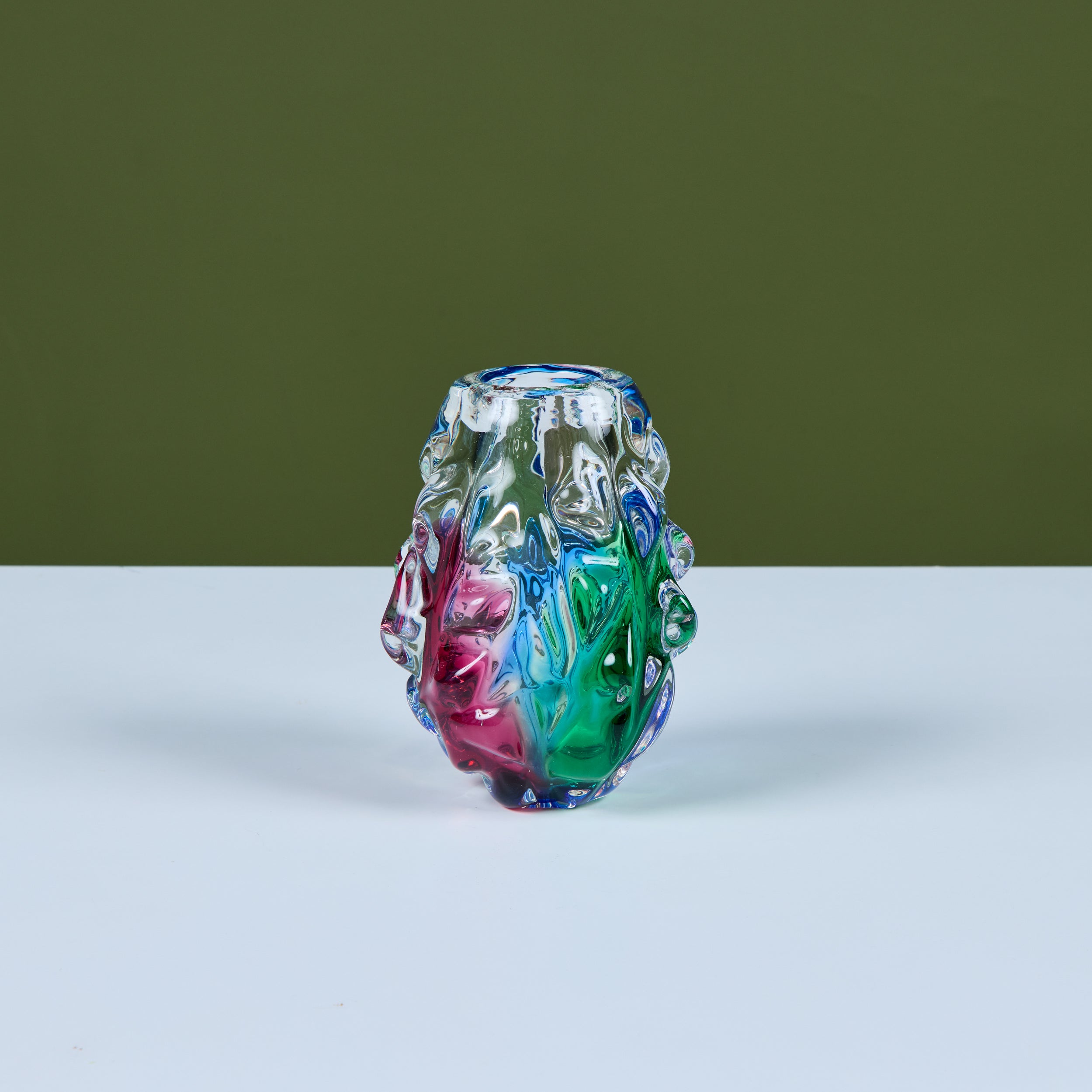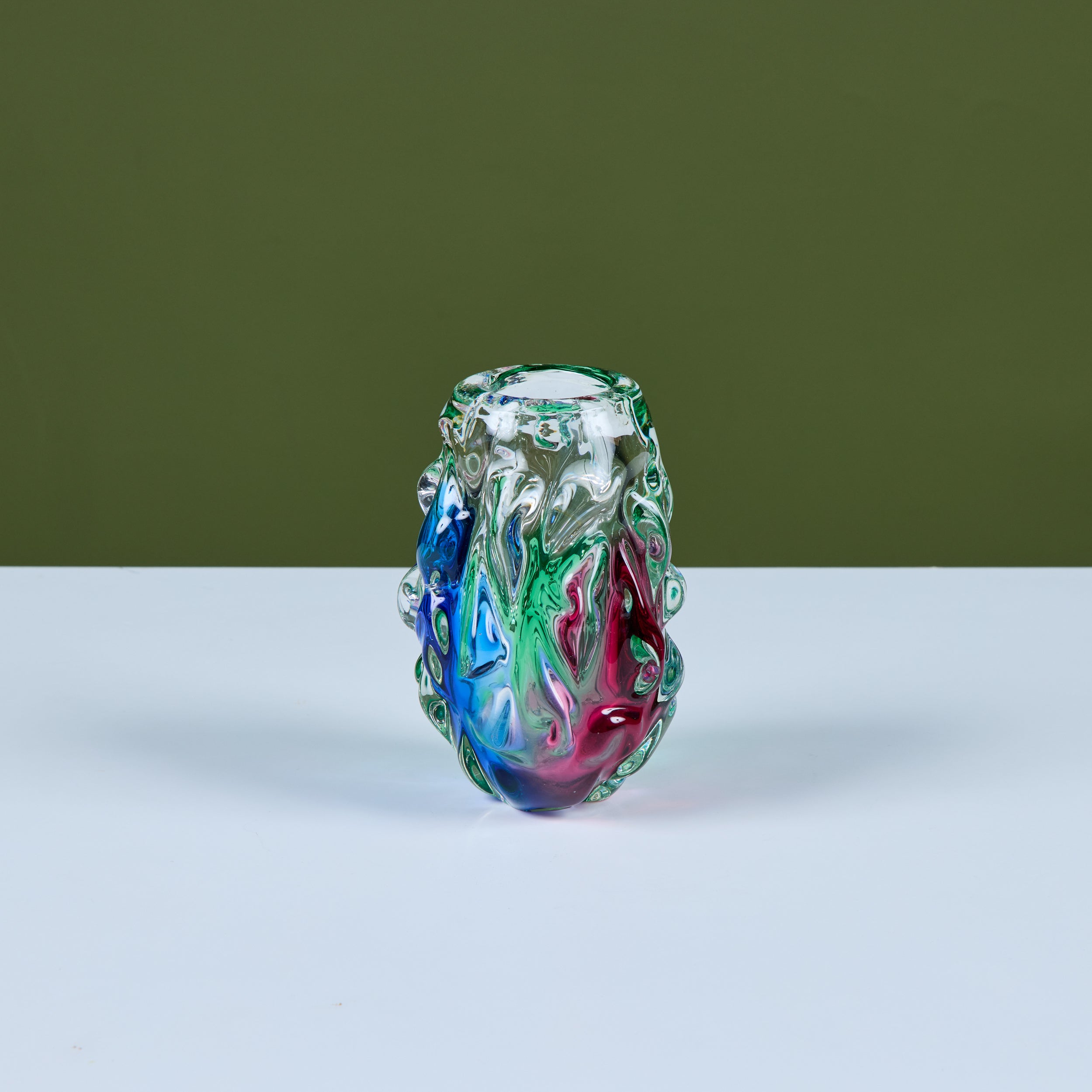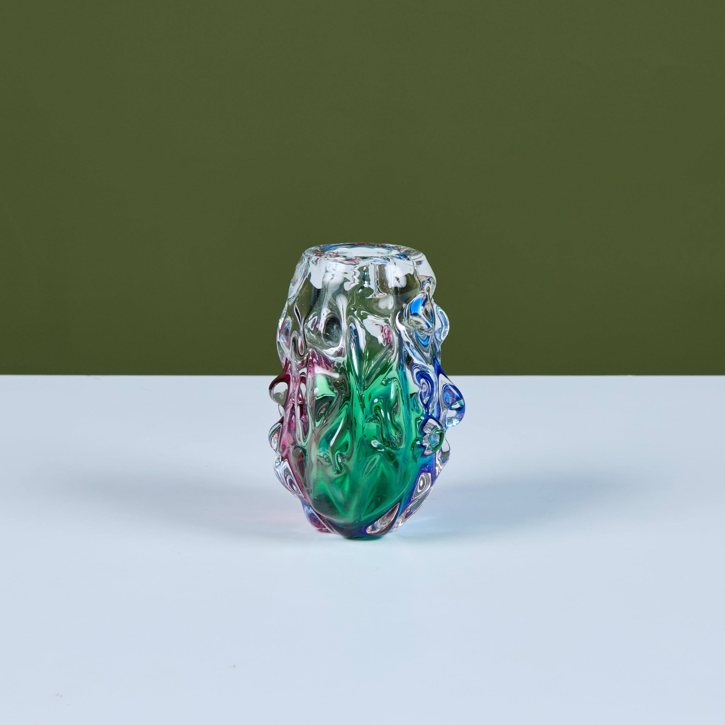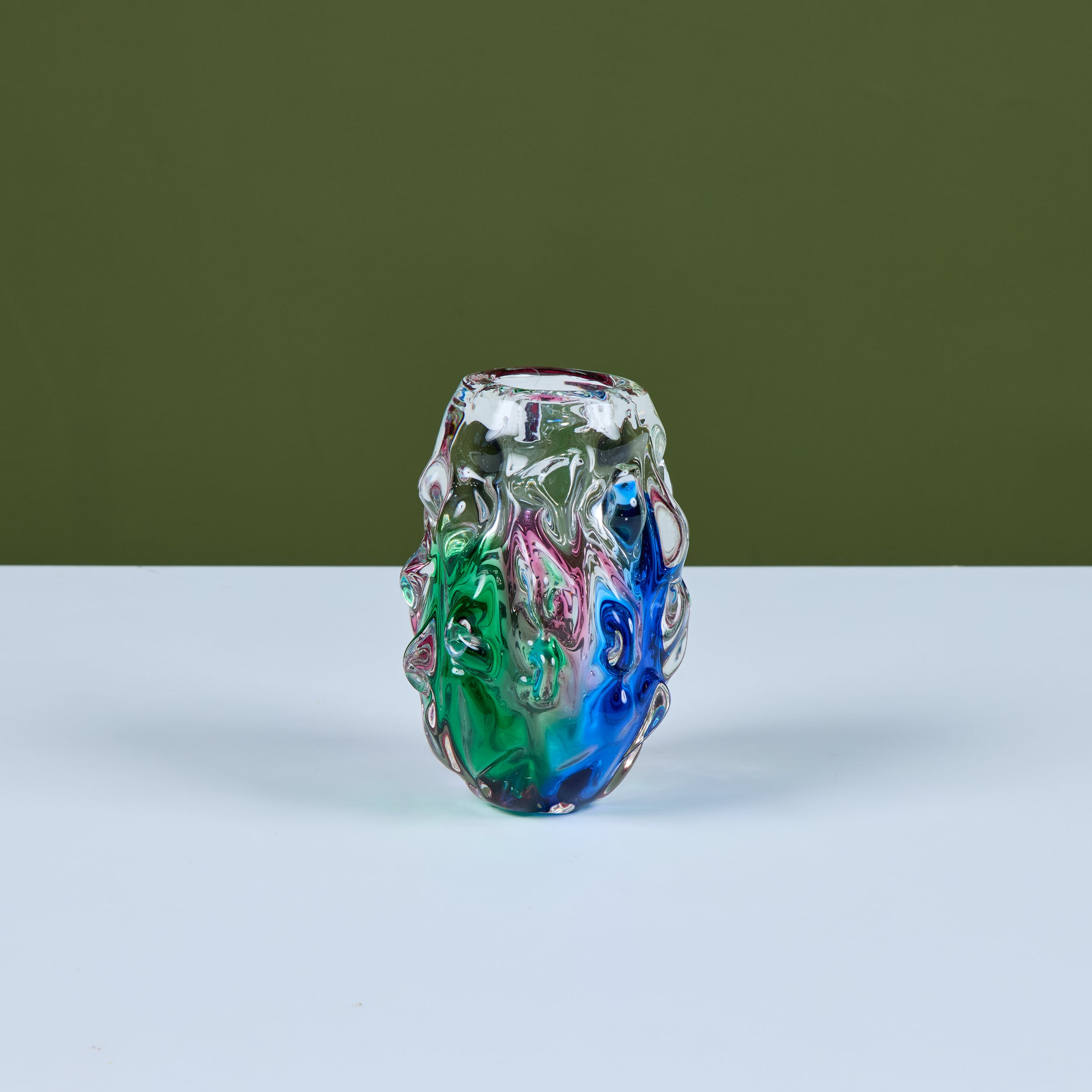 Textured Murano glass vase in the style of Jan Beranek, c.1960s. This small vase features thick layered glass in magenta, blue and green with a round 1.75" opening for buds.