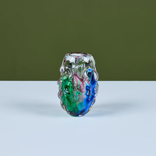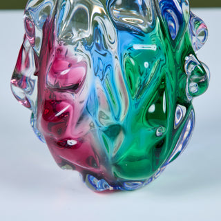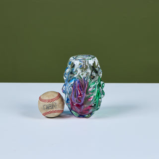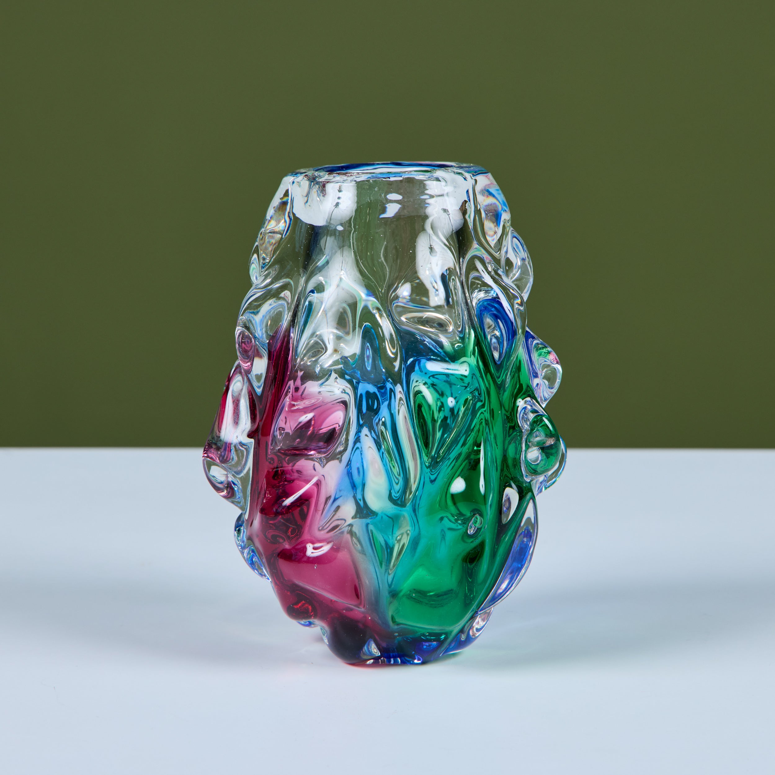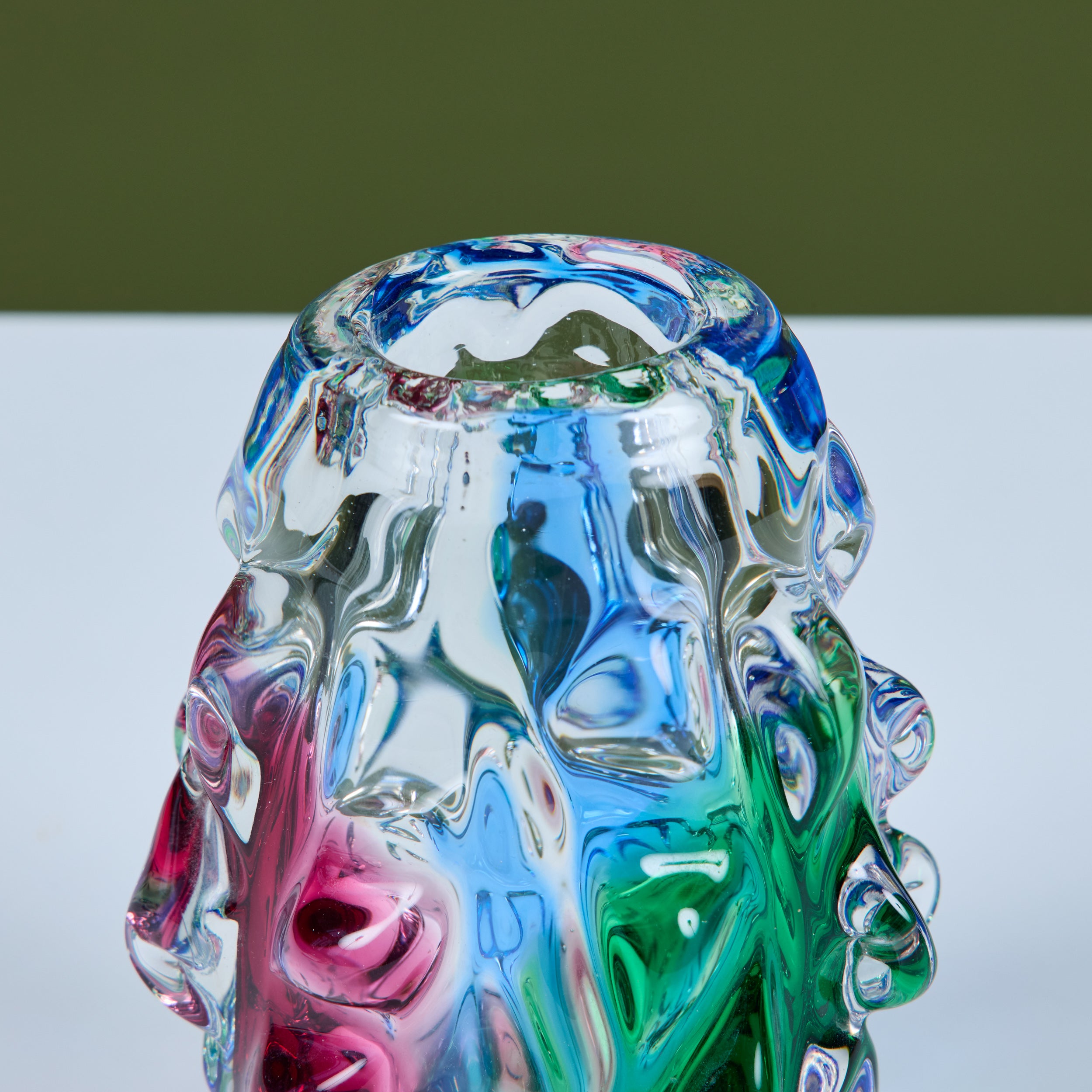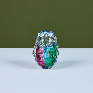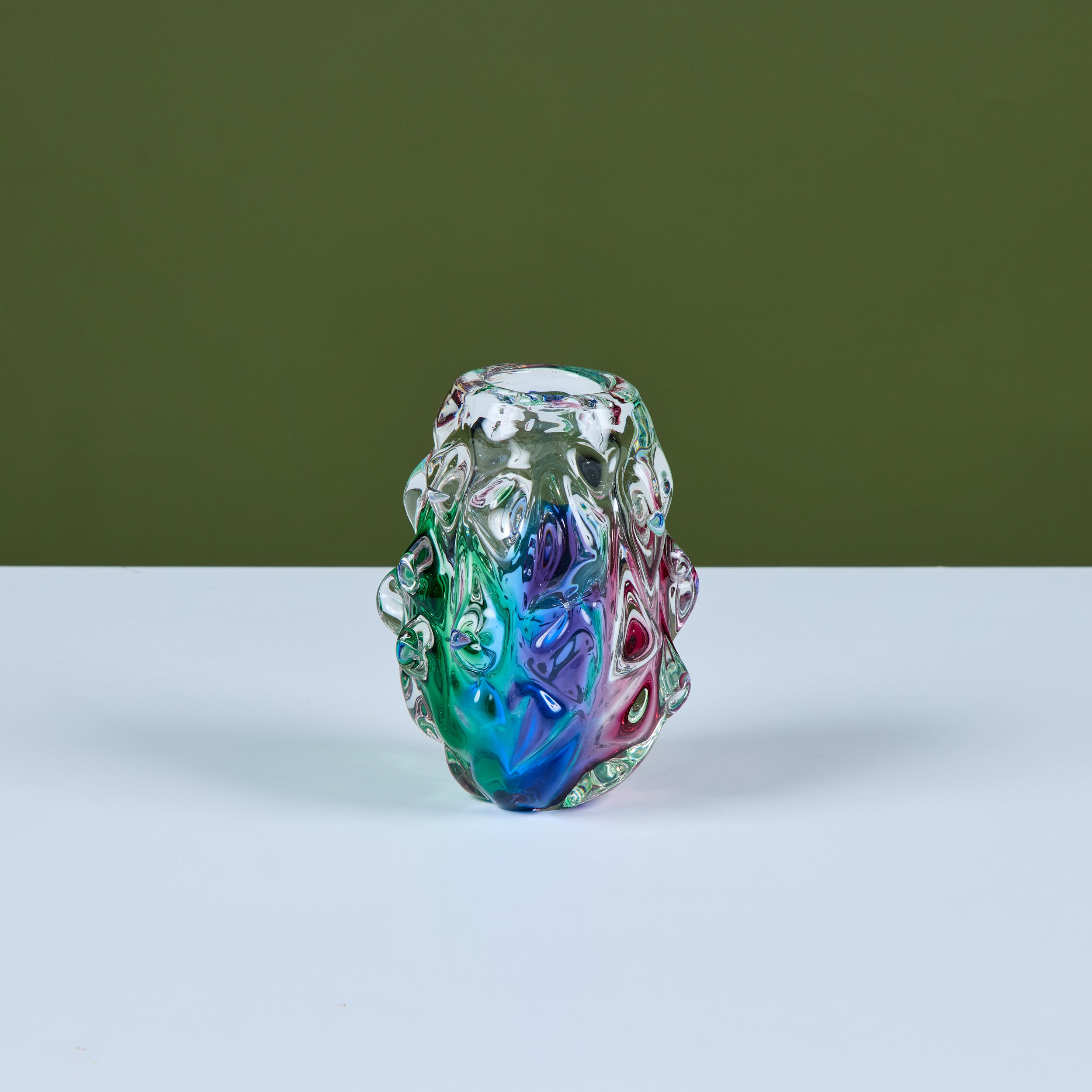 Textured Murano glass vase in the style of Jan Beranek, c.1960s. This small vase features thick layered glass in magenta, blue and green with a round 1.75" opening for buds.