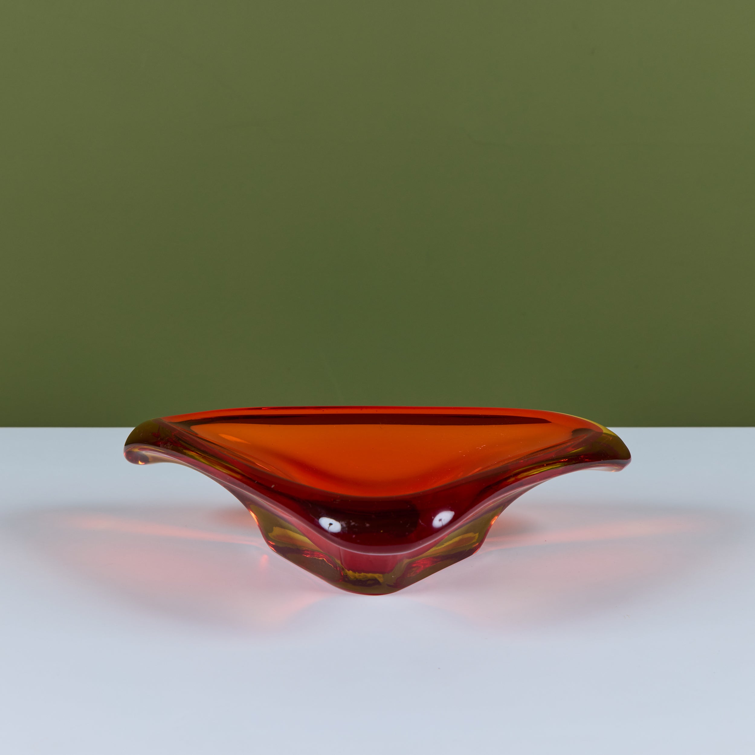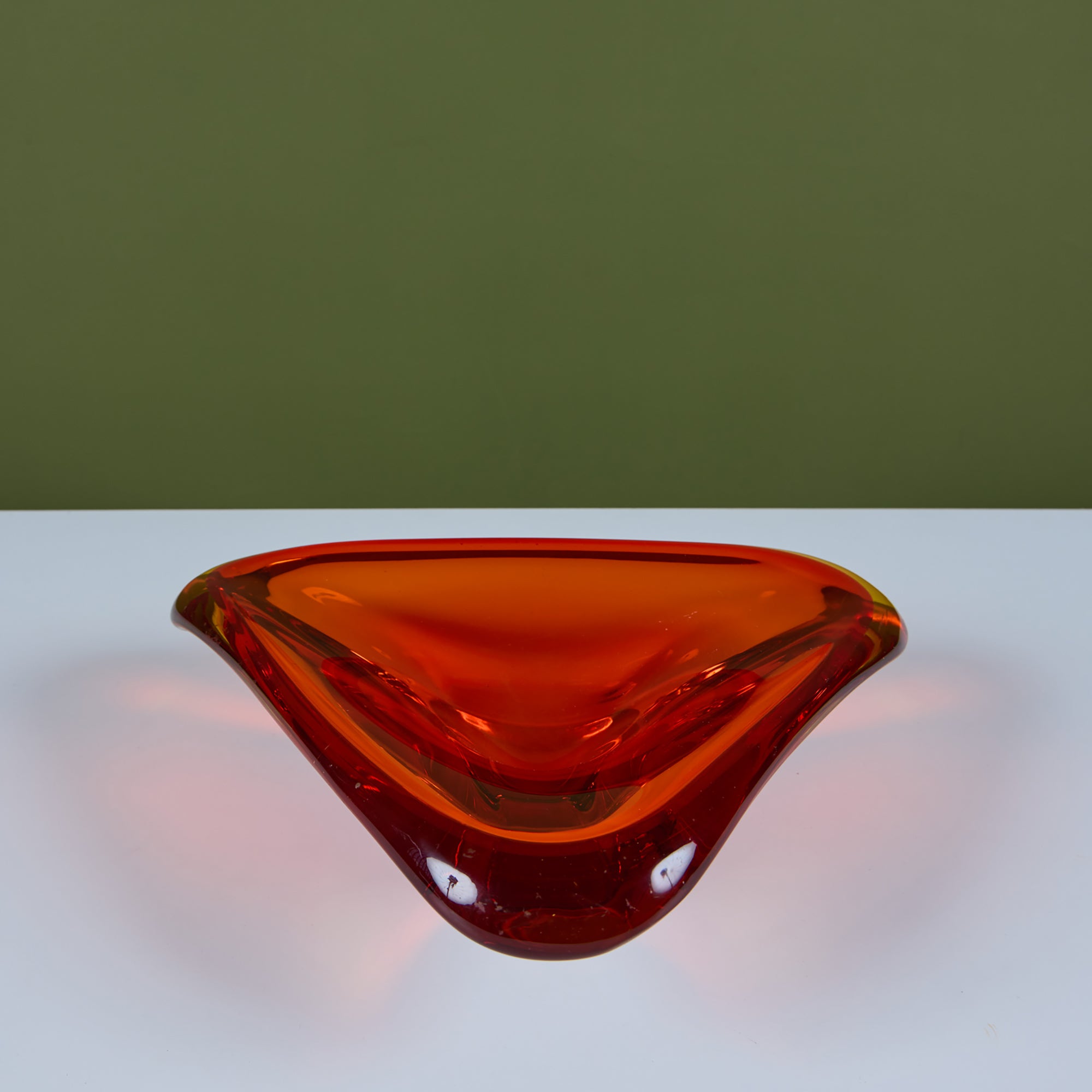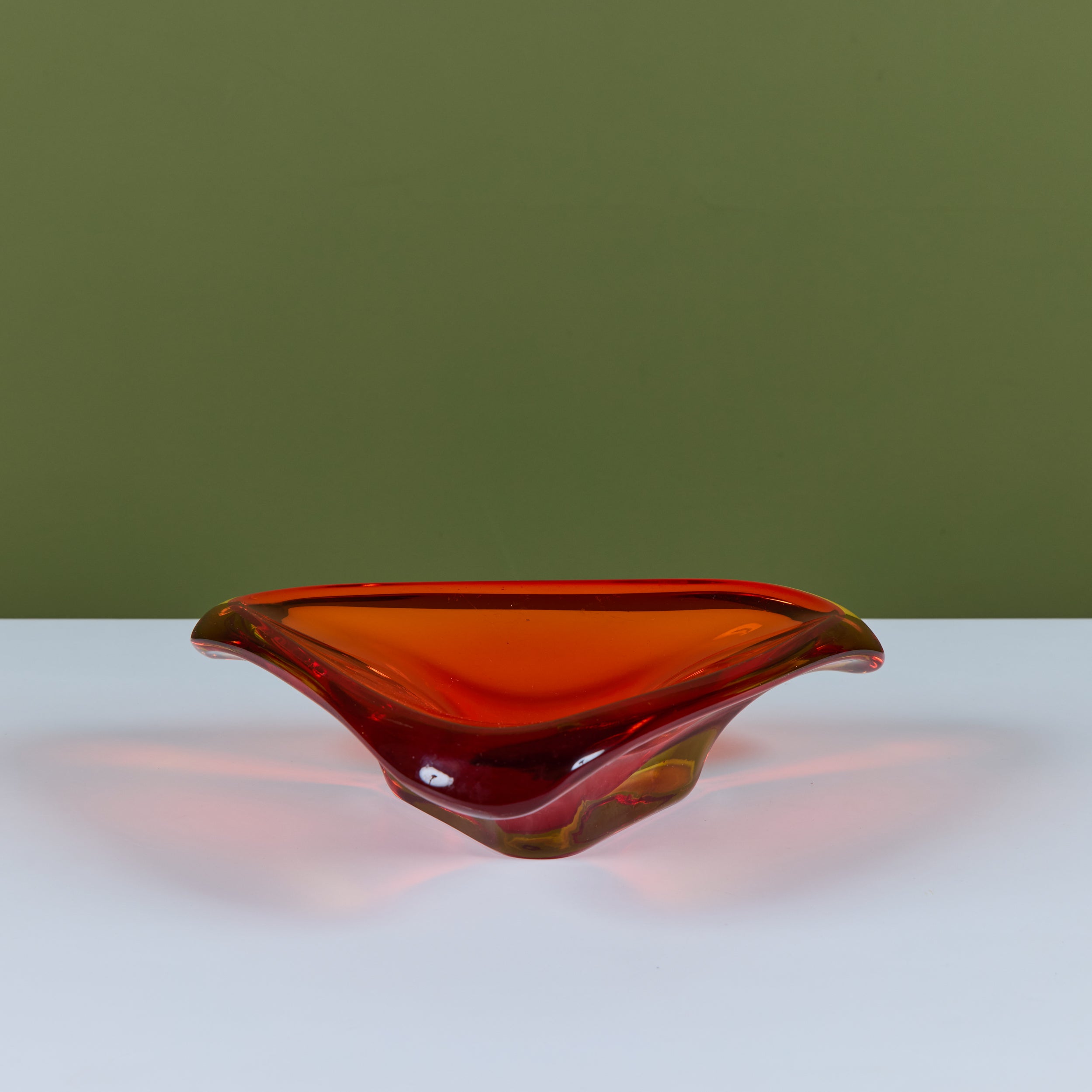 Triangular Murano glass bowl with a rounded edges in an orangish red hue.