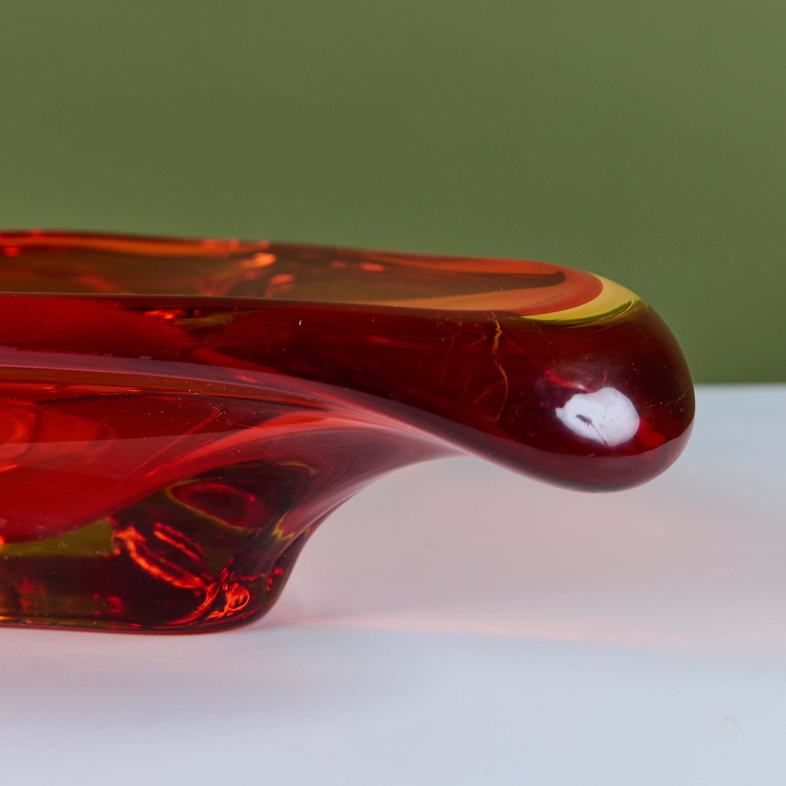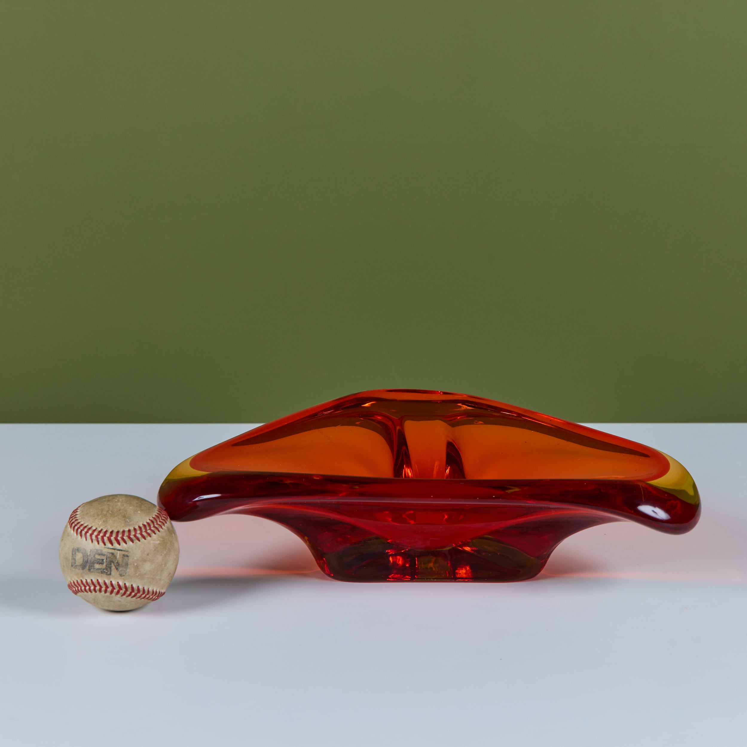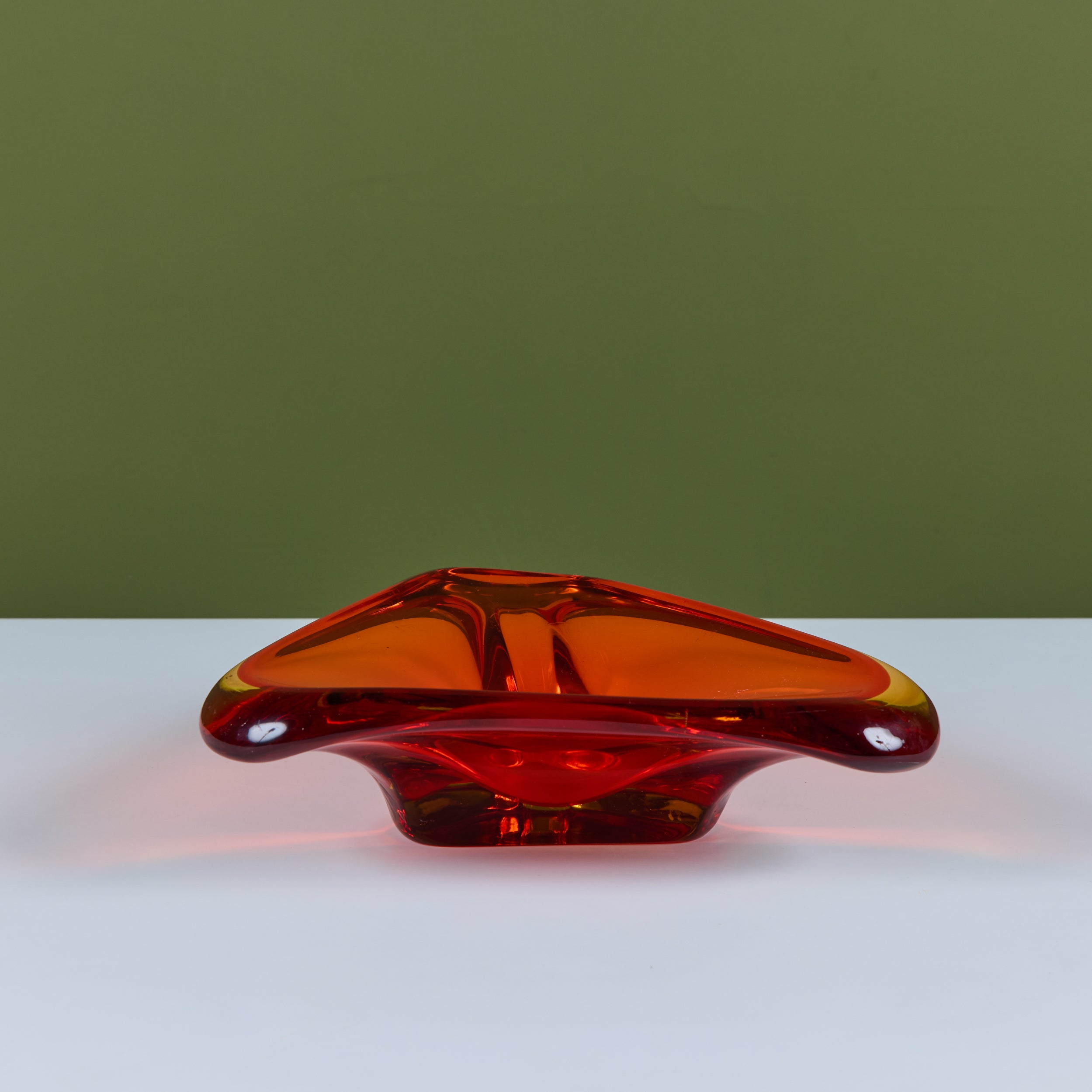 Triangular Murano glass bowl with a rounded edges in an orangish red hue.