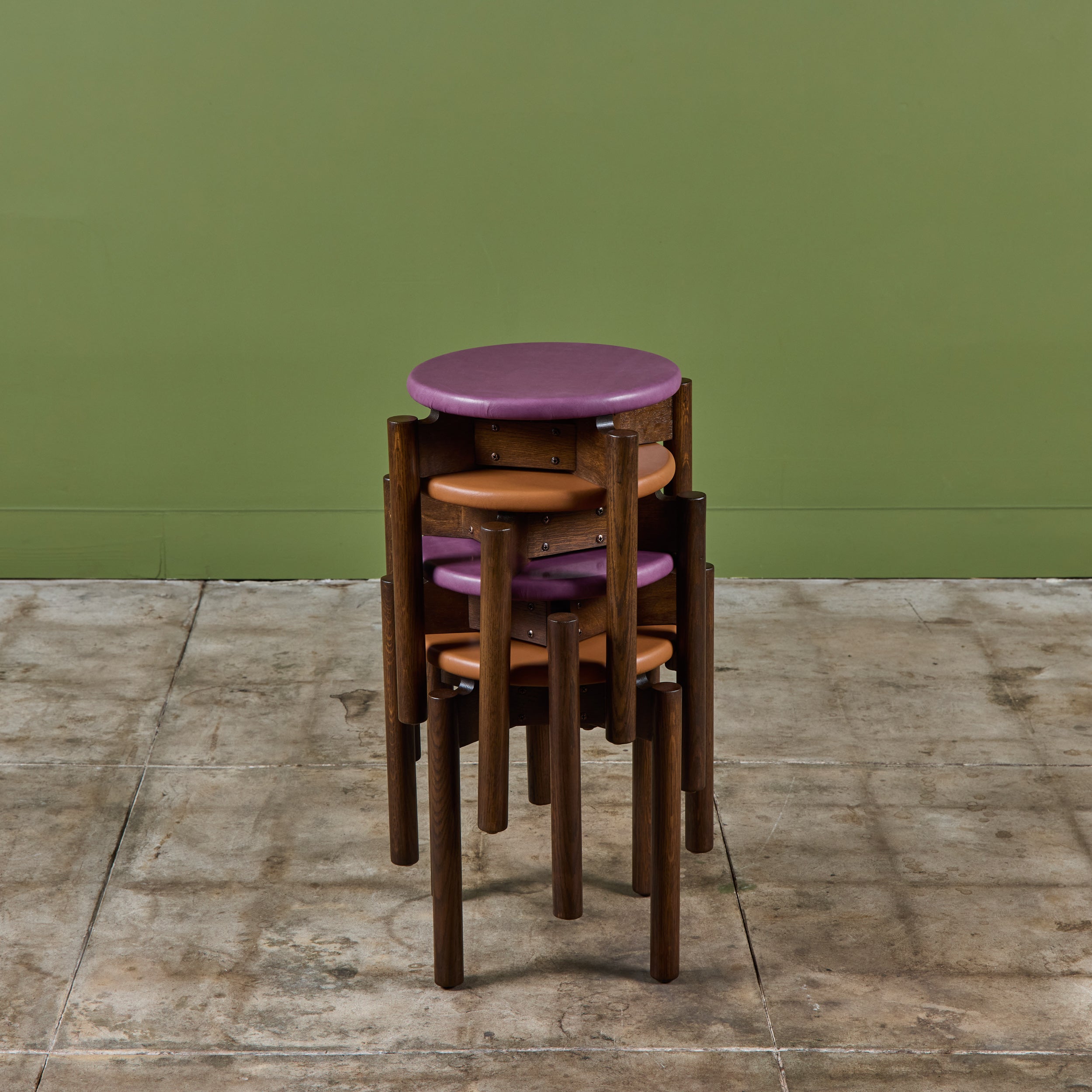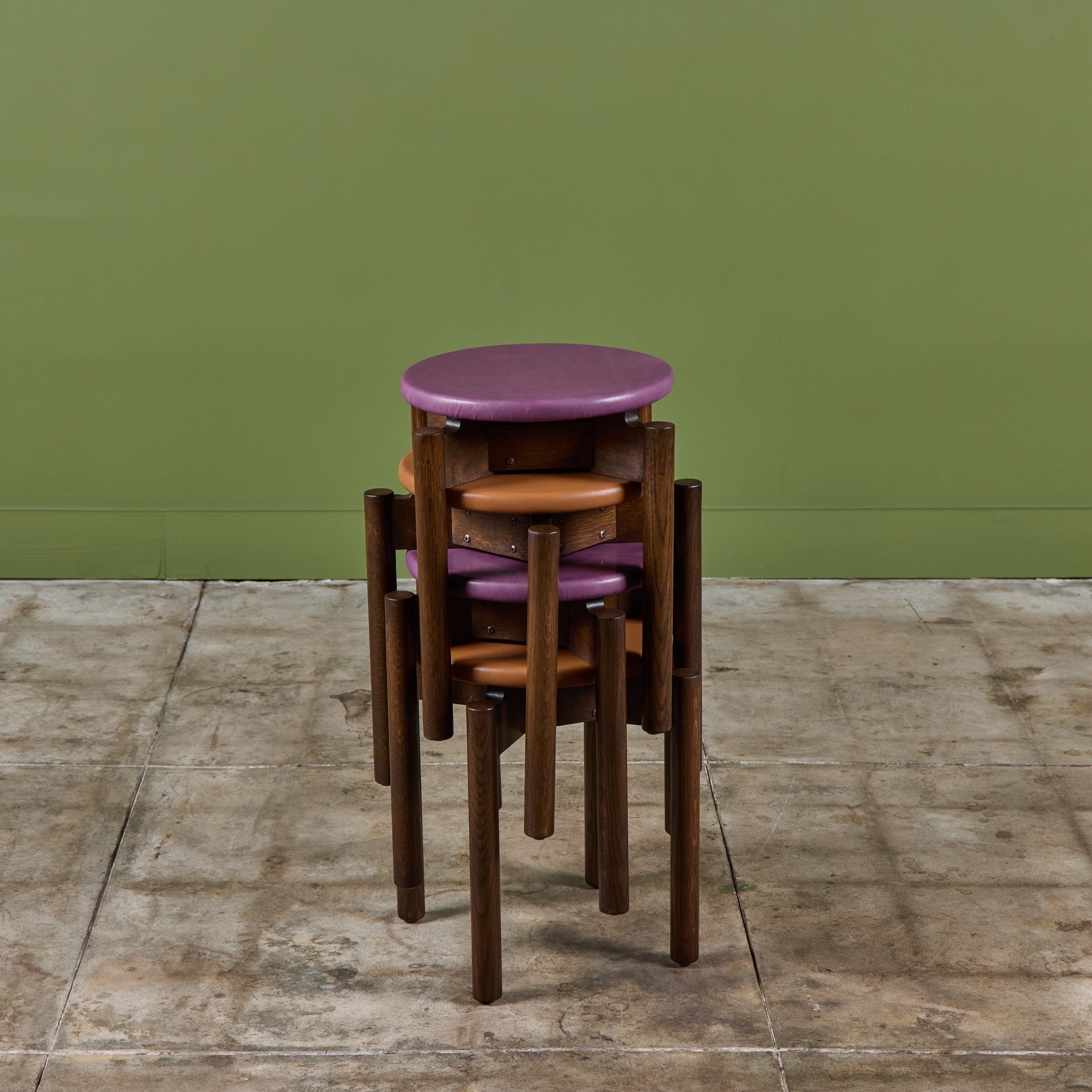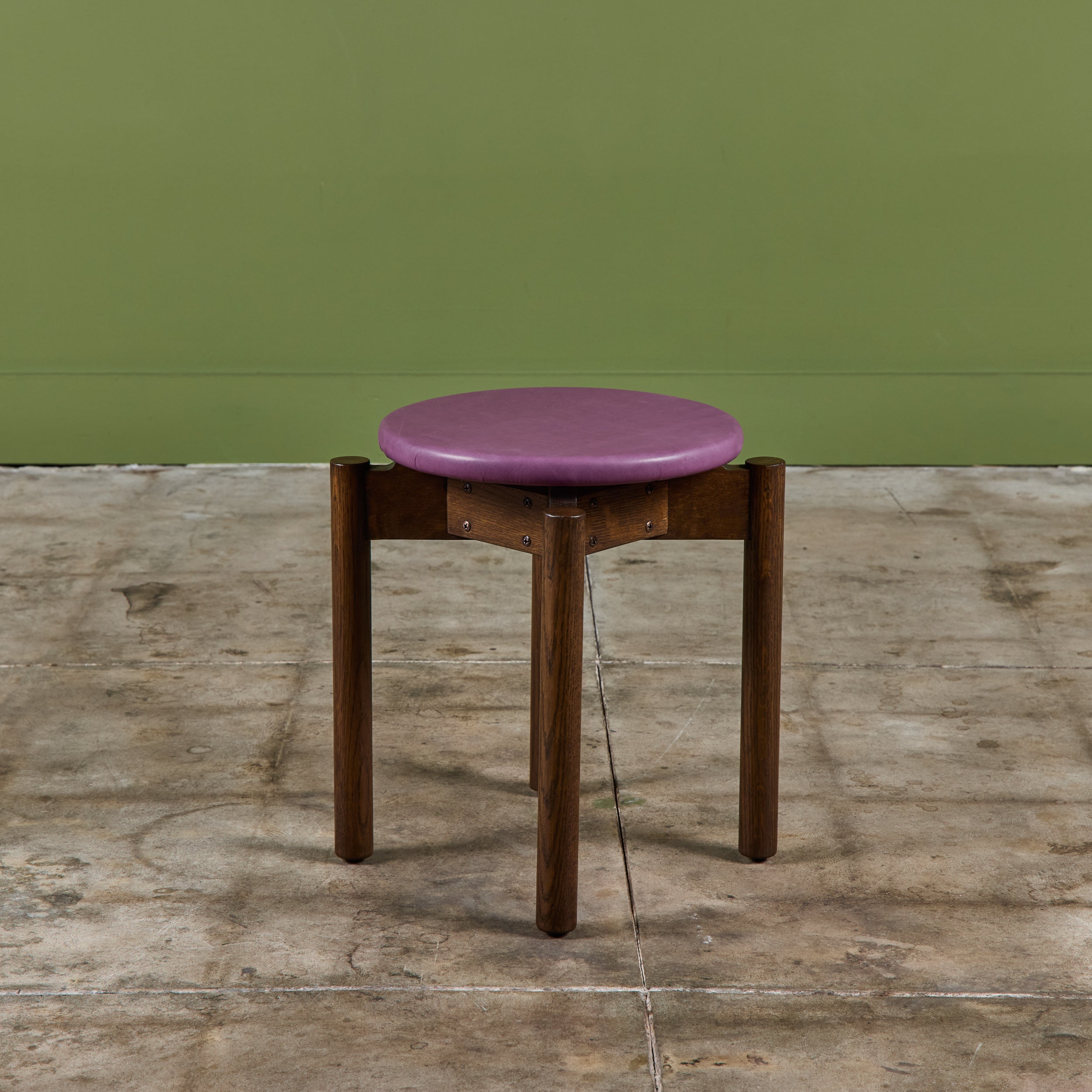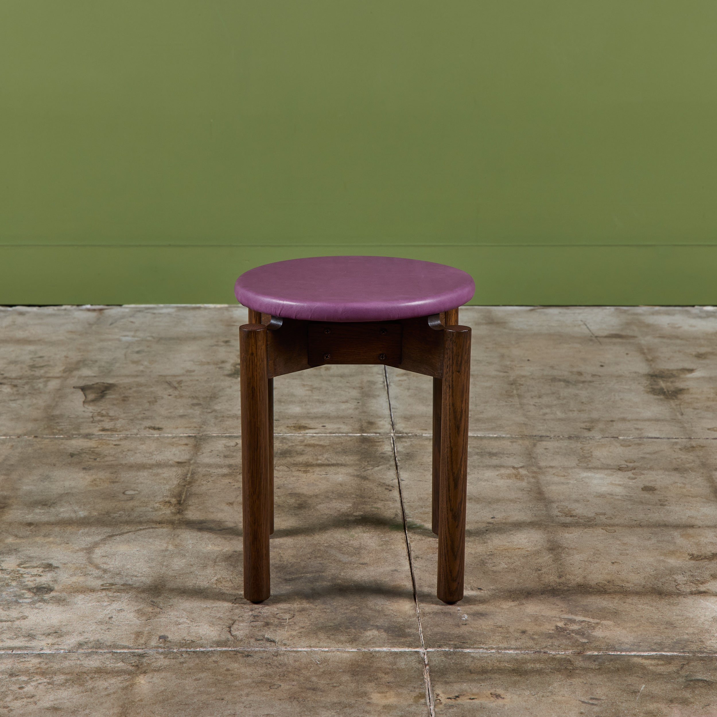 Stacking stool for Marble Imperial Furniture, 1960's, USA. The stool features new leather upholstery in either purple or tan and a walnut frame. The stool can be stacked for easy storage.