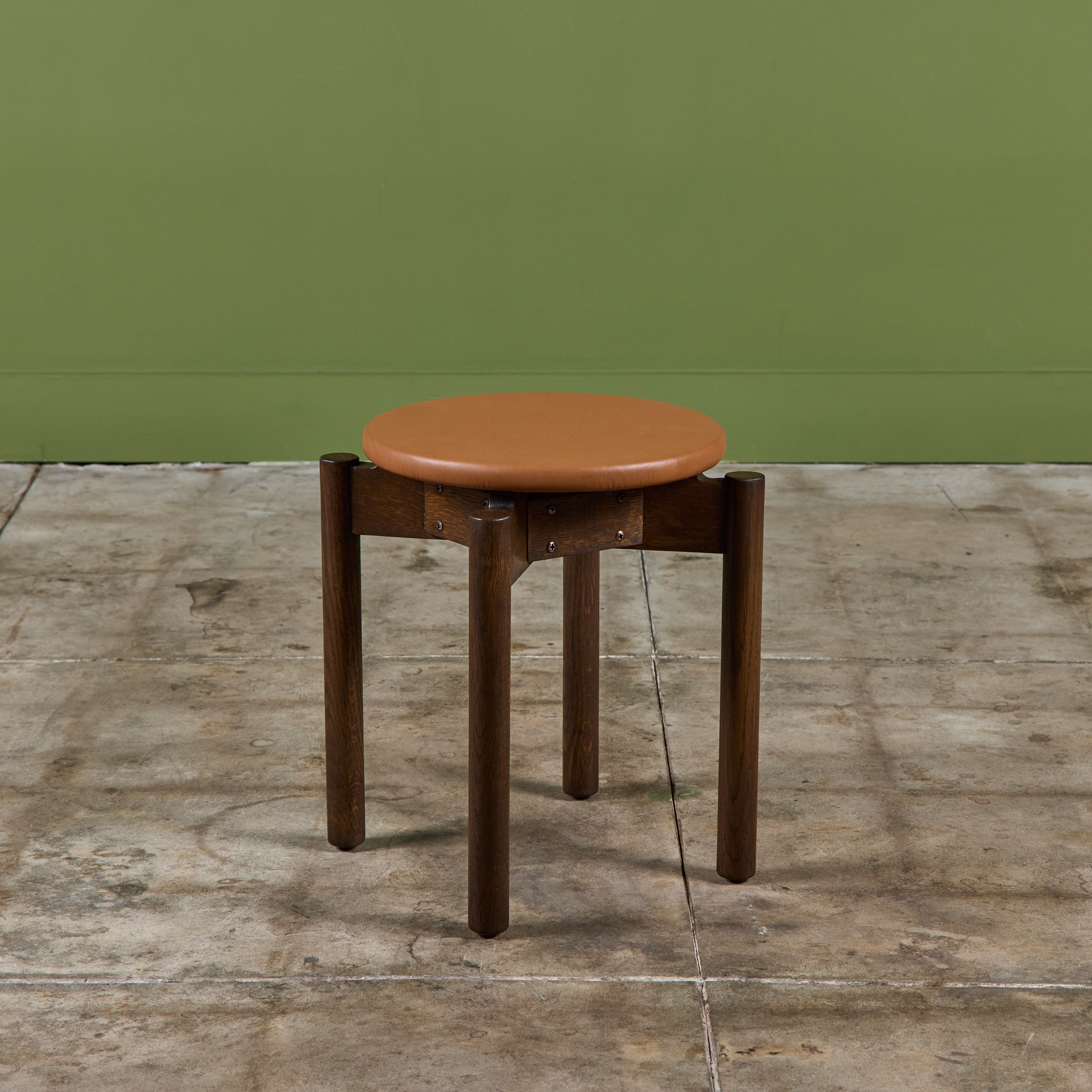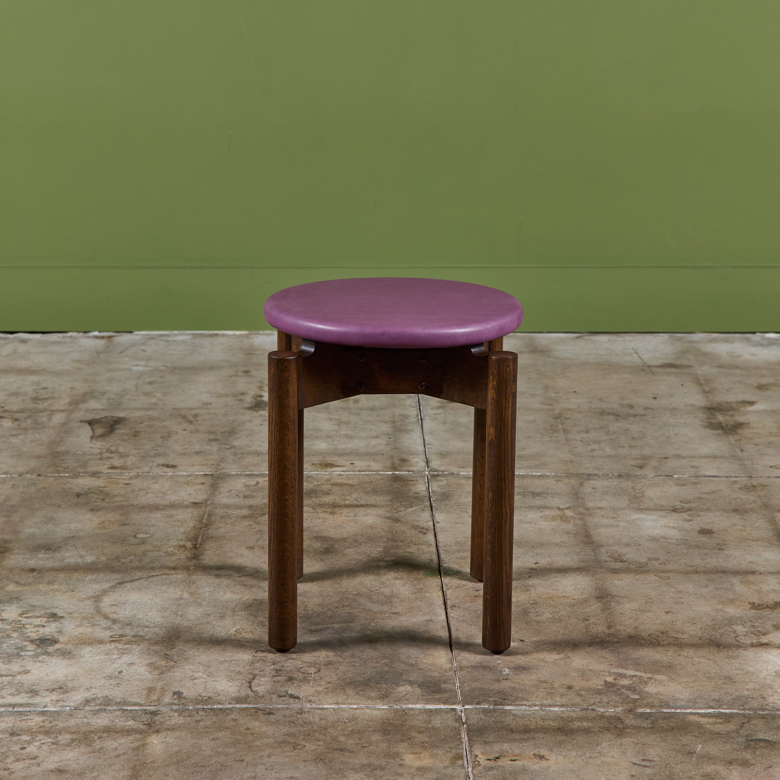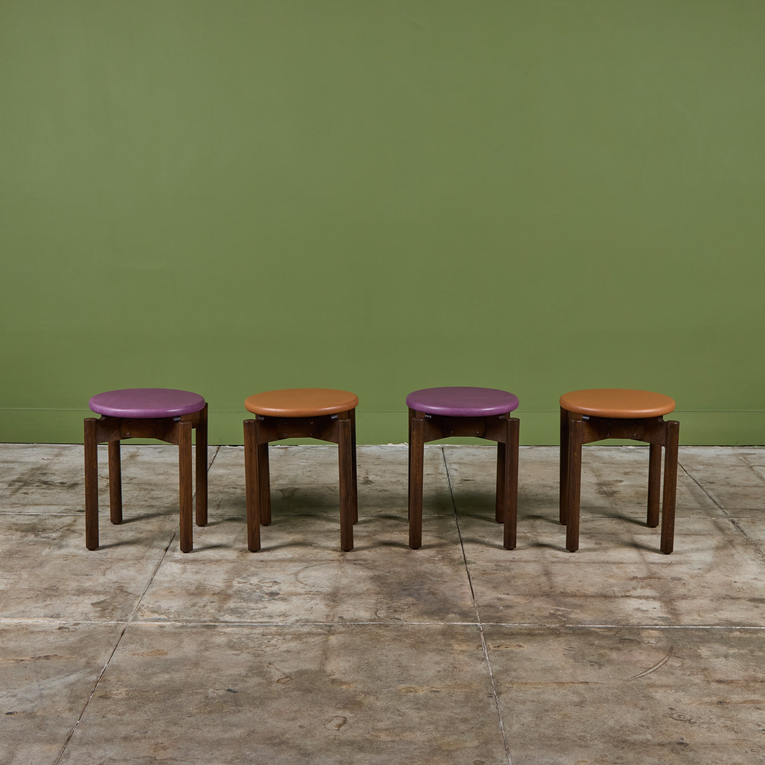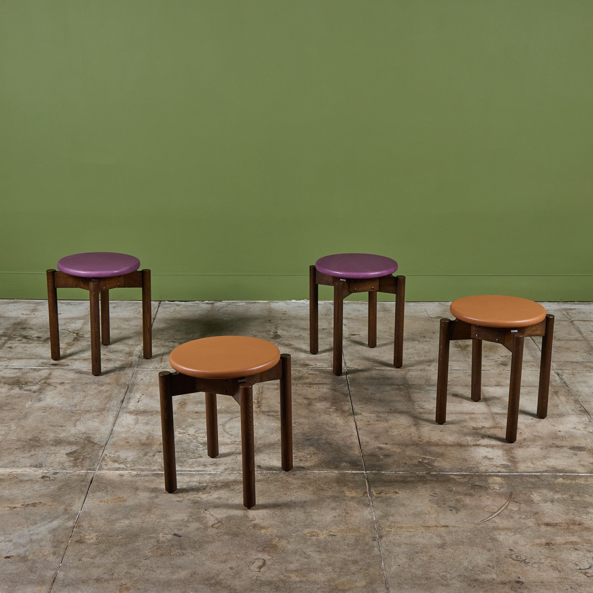 Stacking stool for Marble Imperial Furniture, 1960's, USA. The stool features new leather upholstery in either purple or tan and a walnut frame. The stool can be stacked for easy storage.