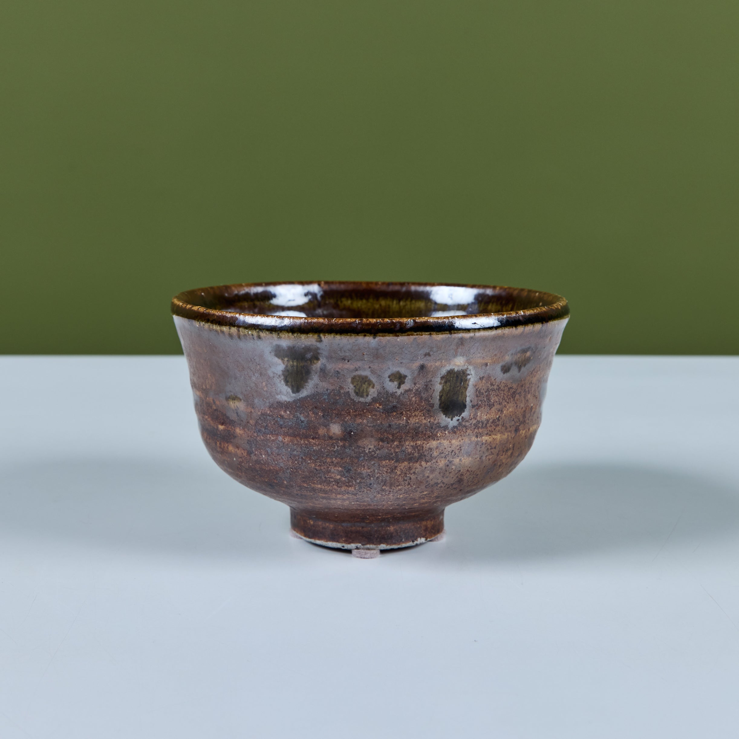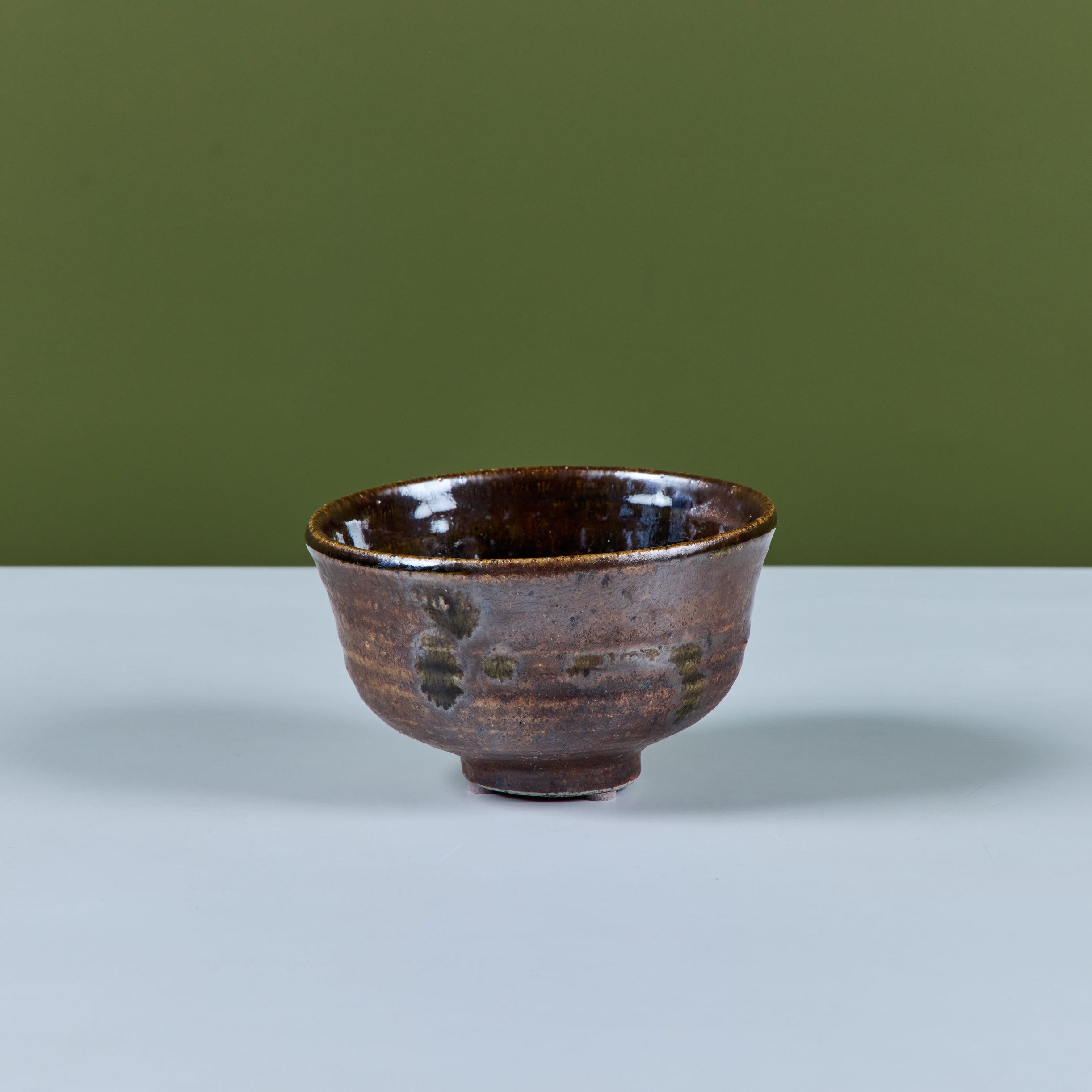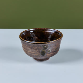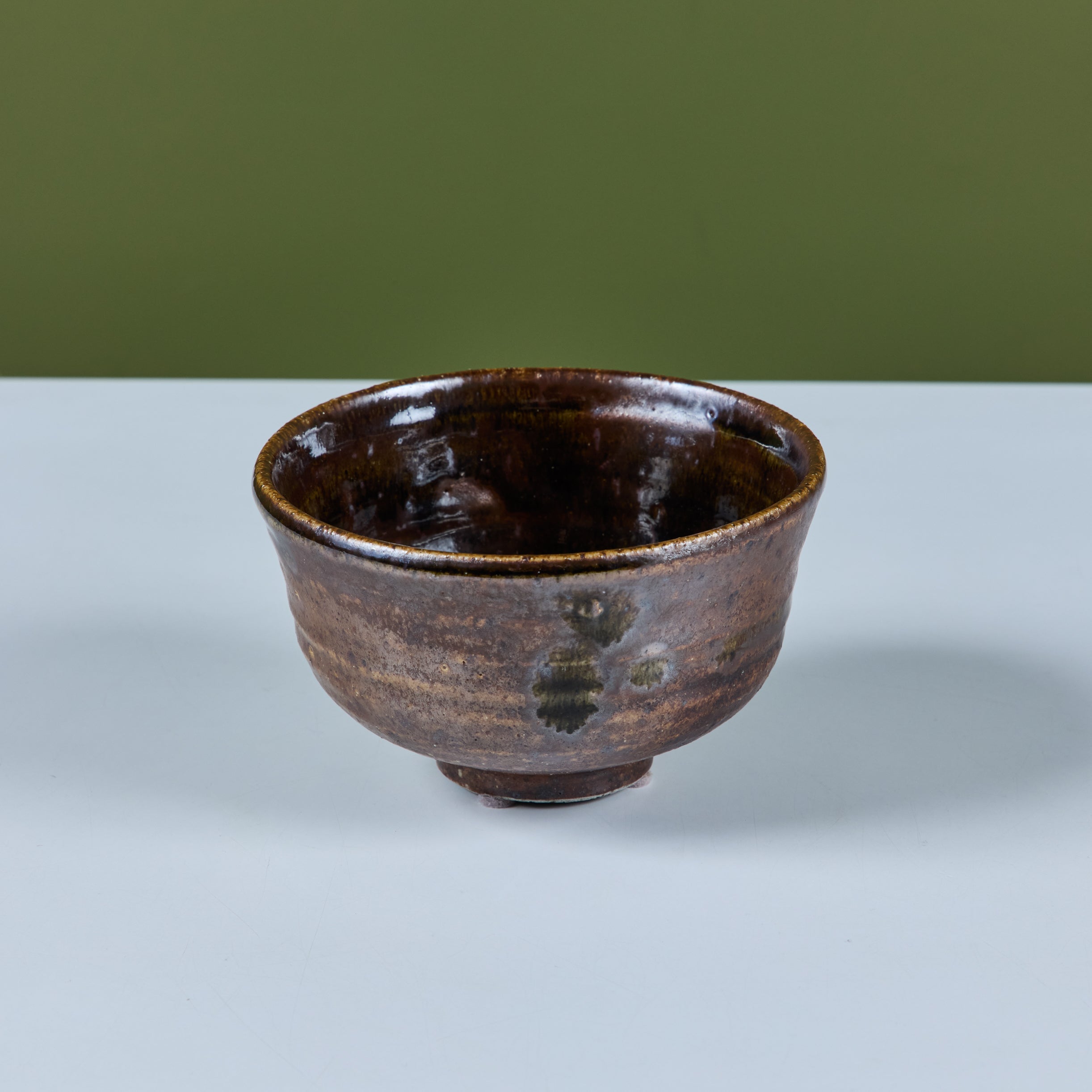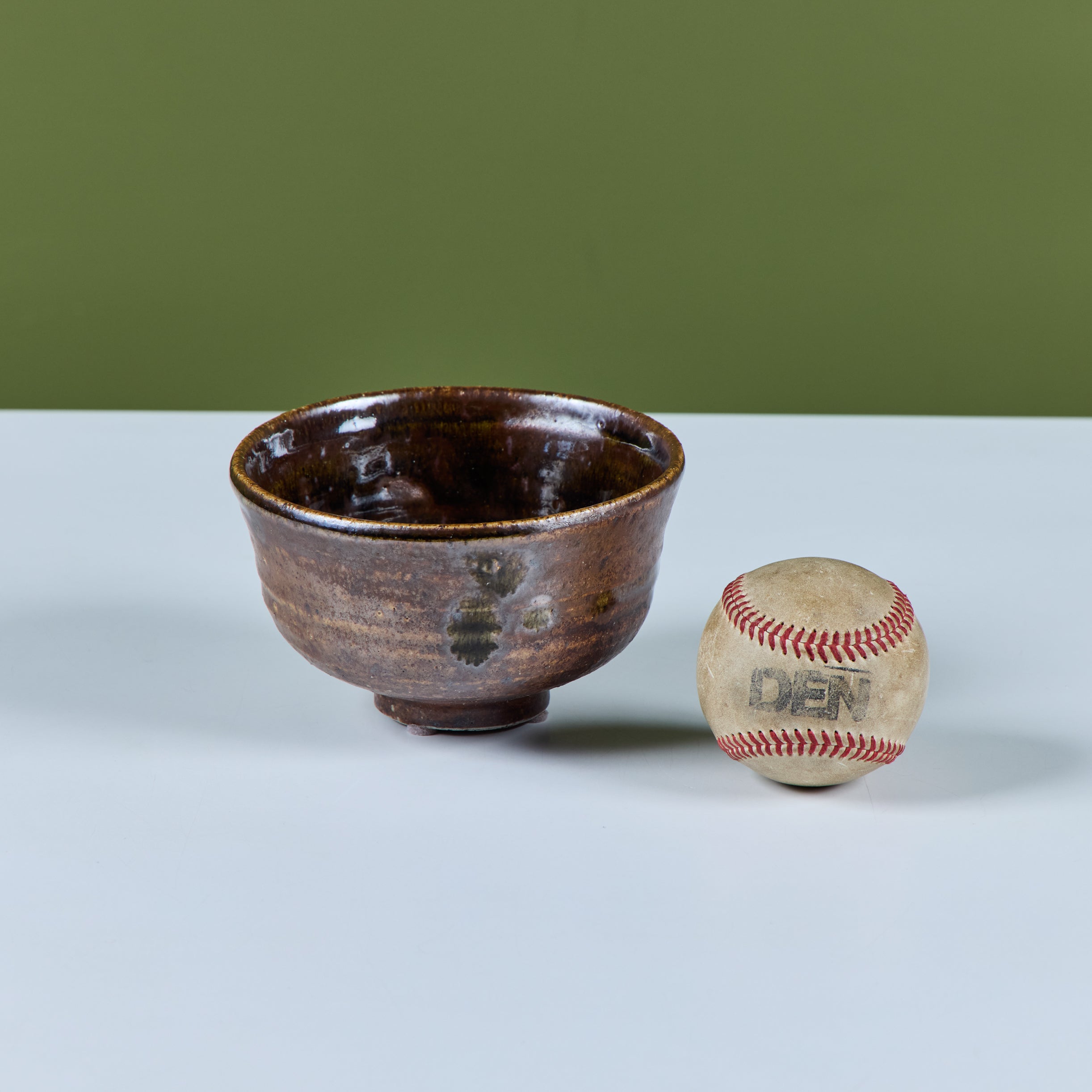From famed Hawaiian ceramicist Toshiko Takaezu, a wheel thrown studio ceramic tea bowl features a dark brown glaze with a footed base.