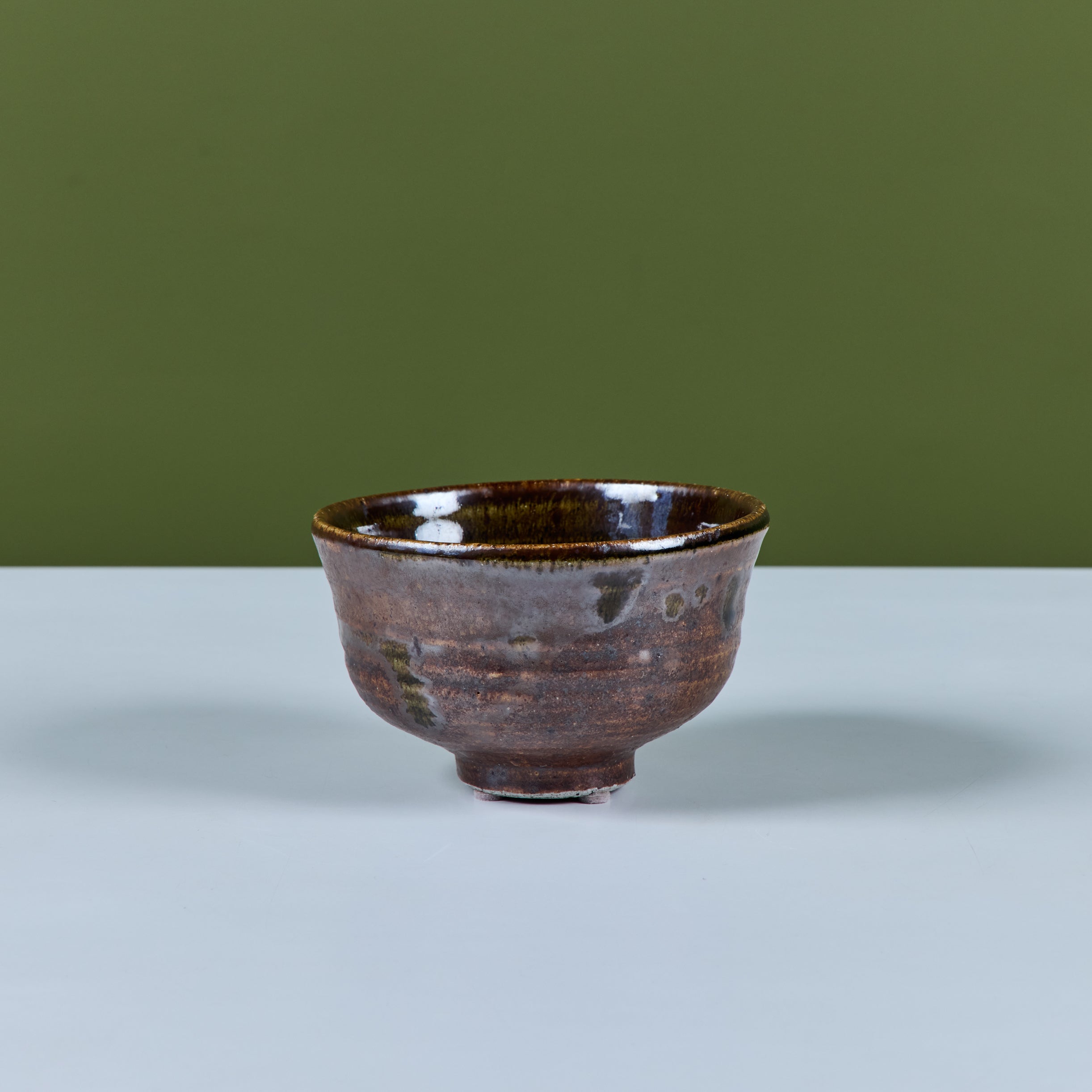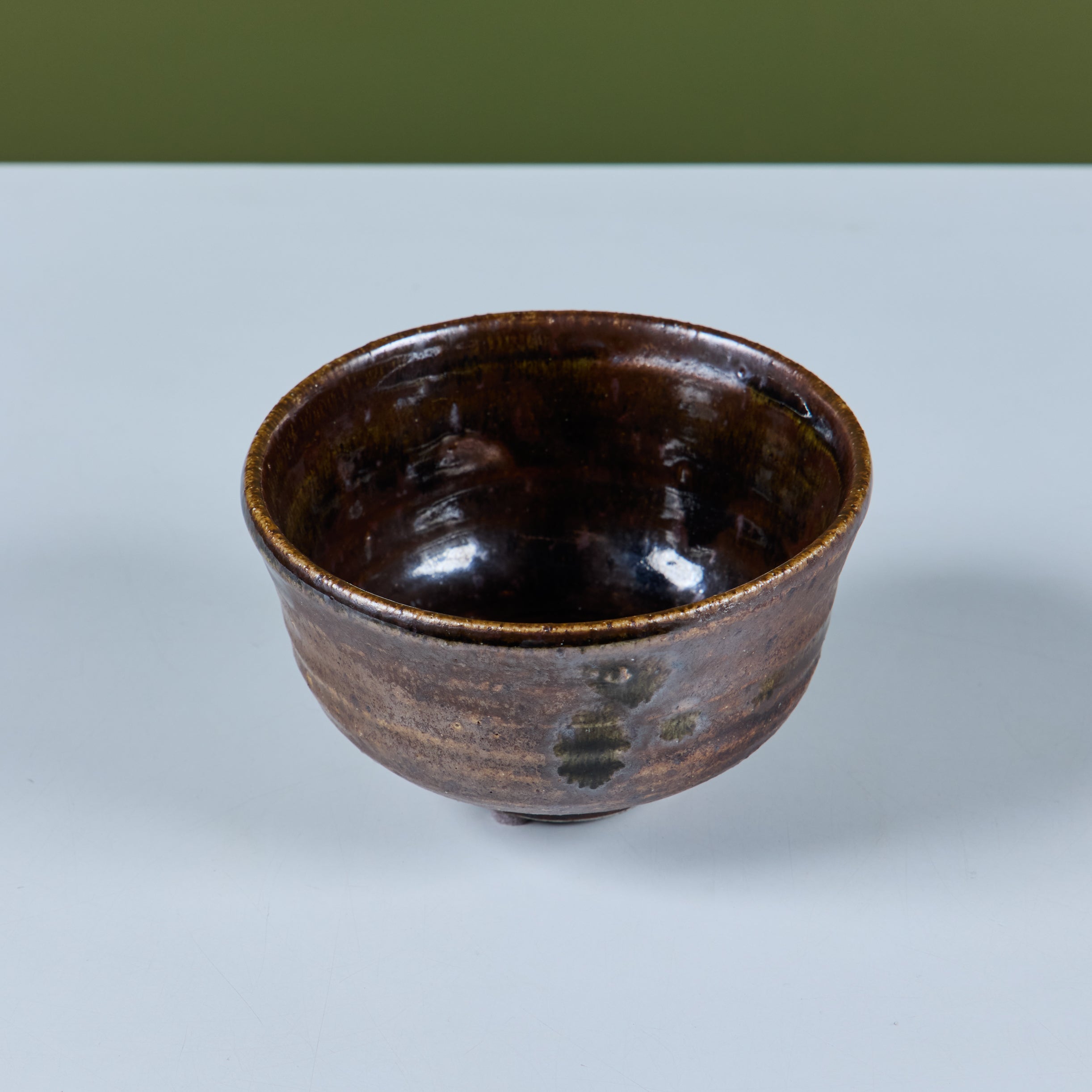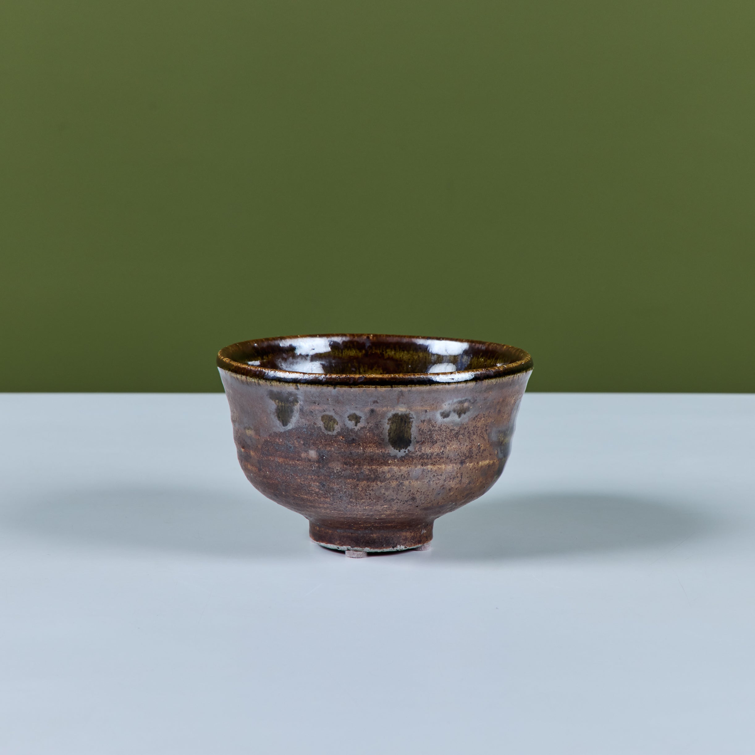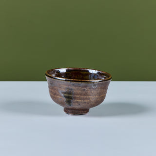 From famed Hawaiian ceramicist Toshiko Takaezu, a wheel thrown studio ceramic tea bowl features a dark brown glaze with a footed base.