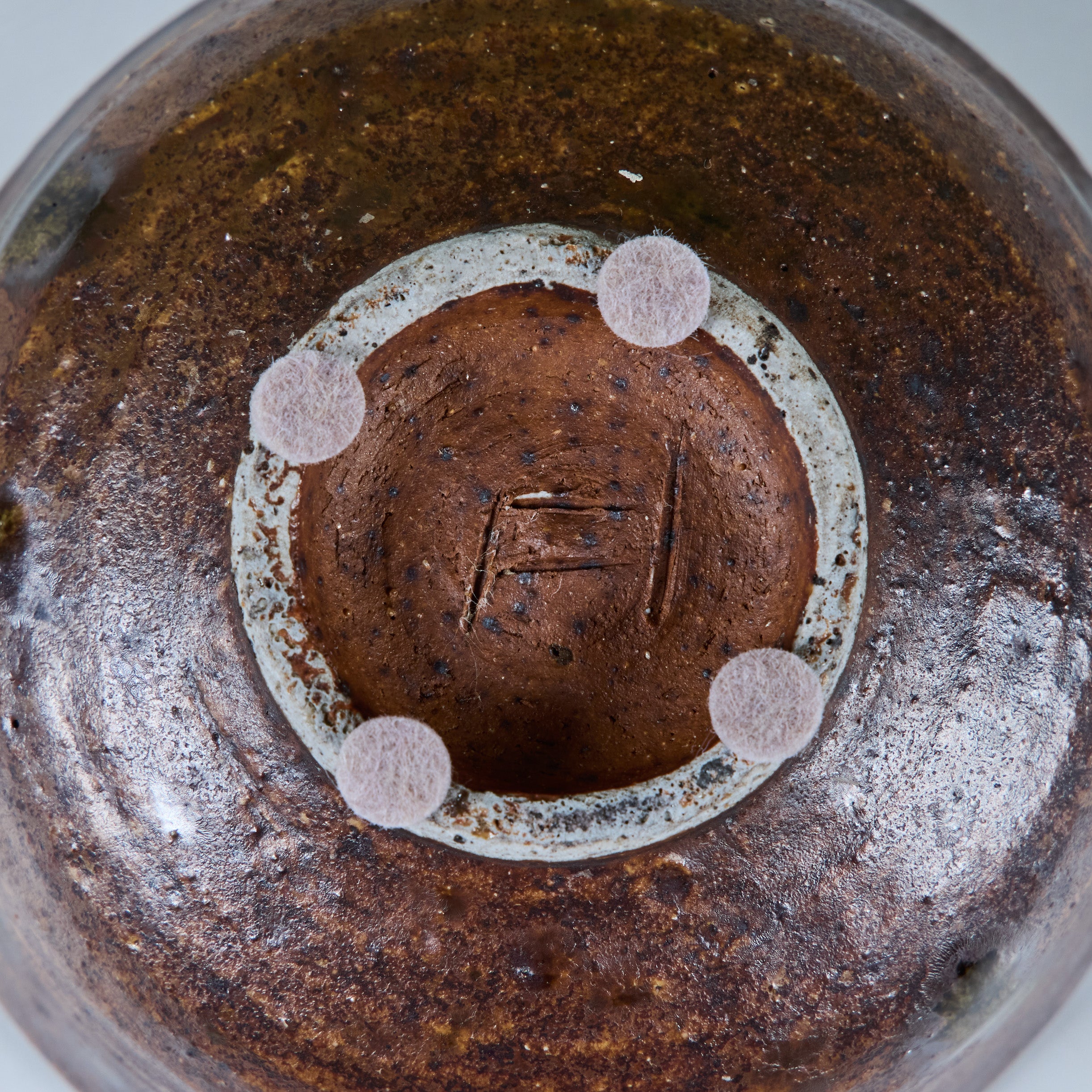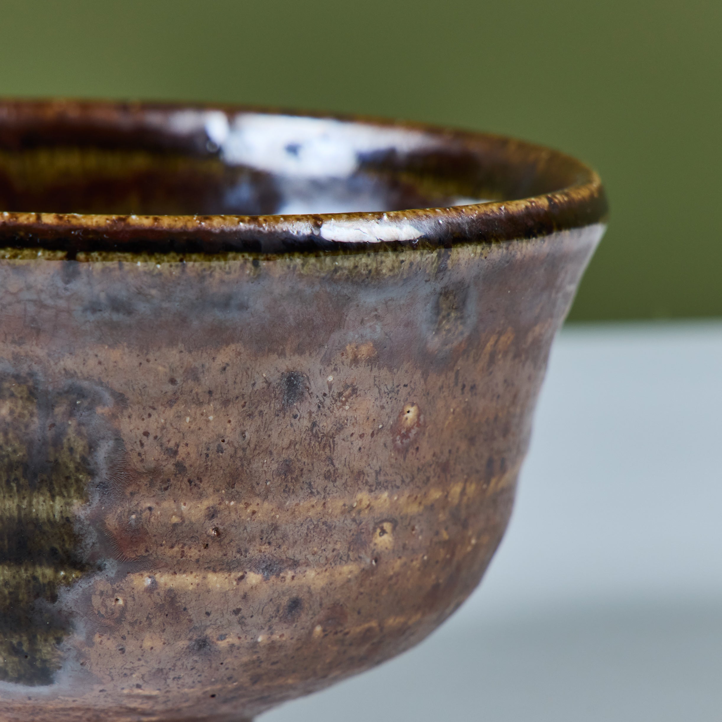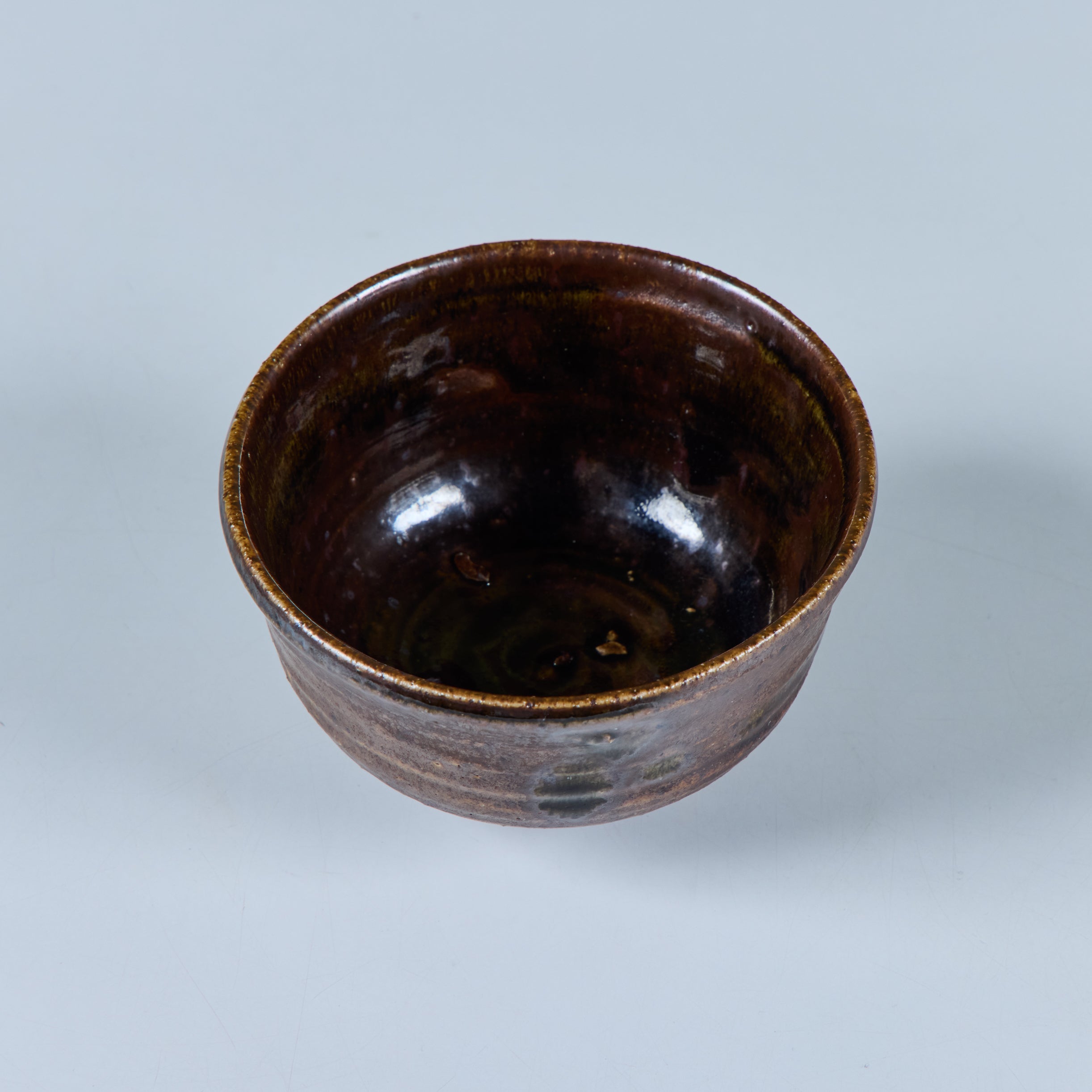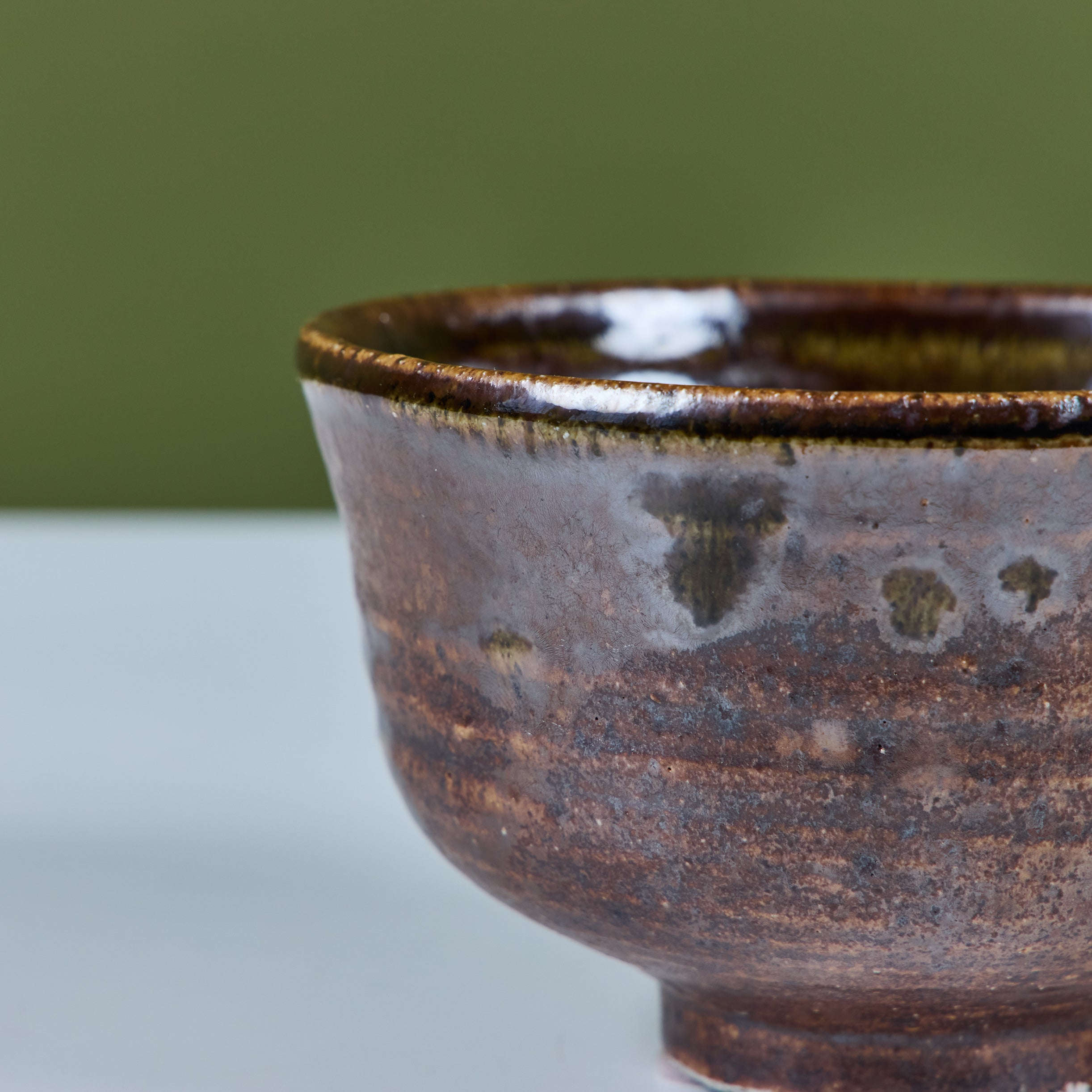 From famed Hawaiian ceramicist Toshiko Takaezu, a wheel thrown studio ceramic tea bowl features a dark brown glaze with a footed base.