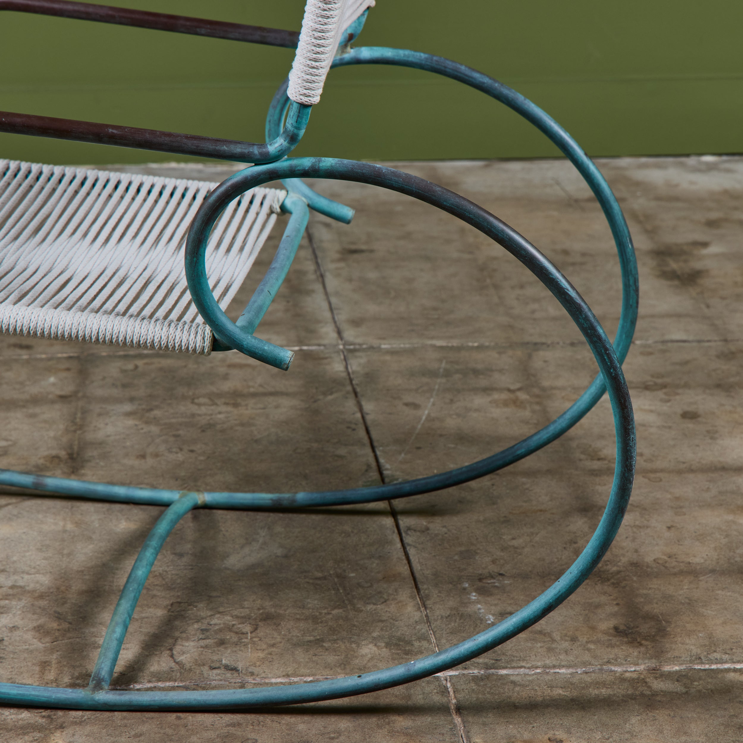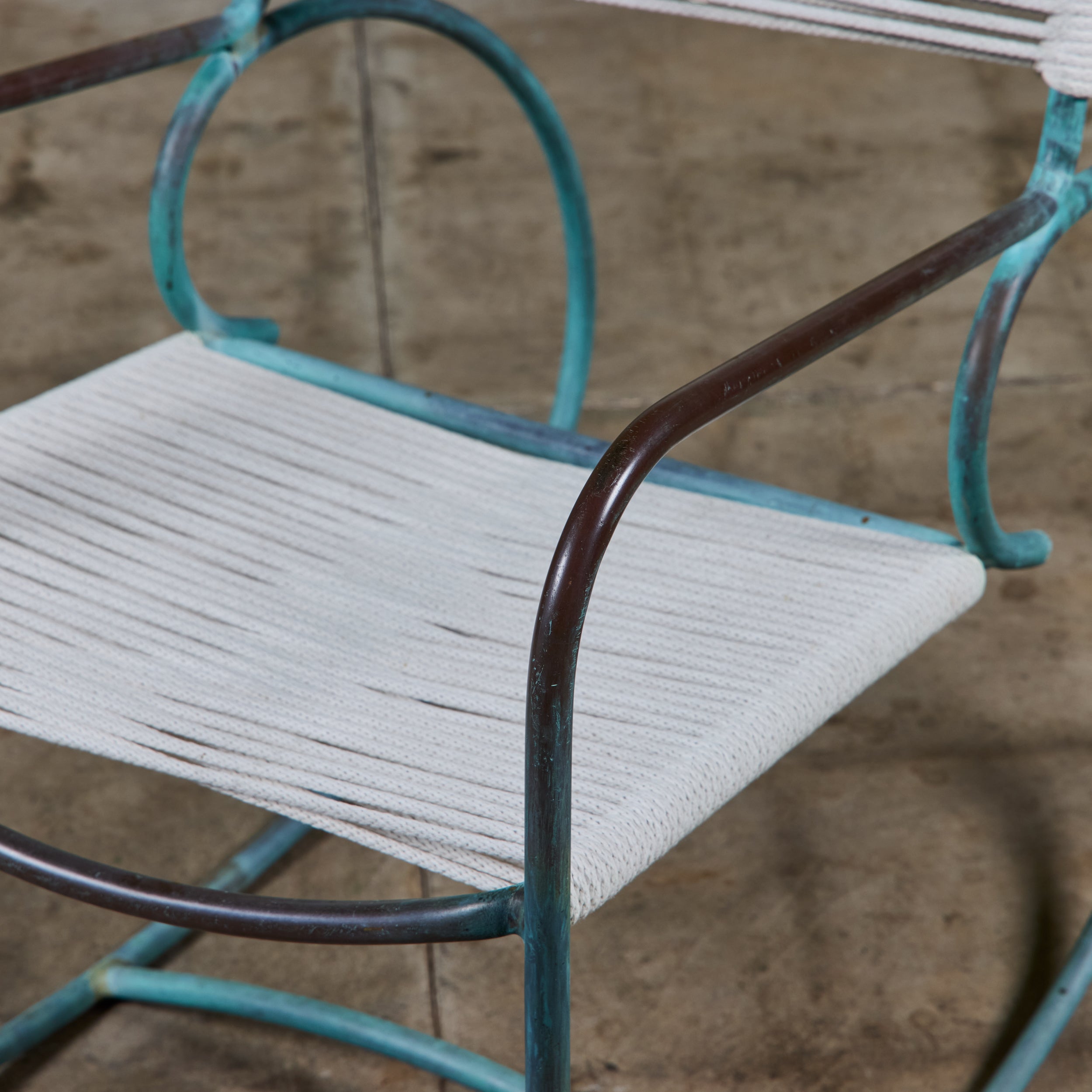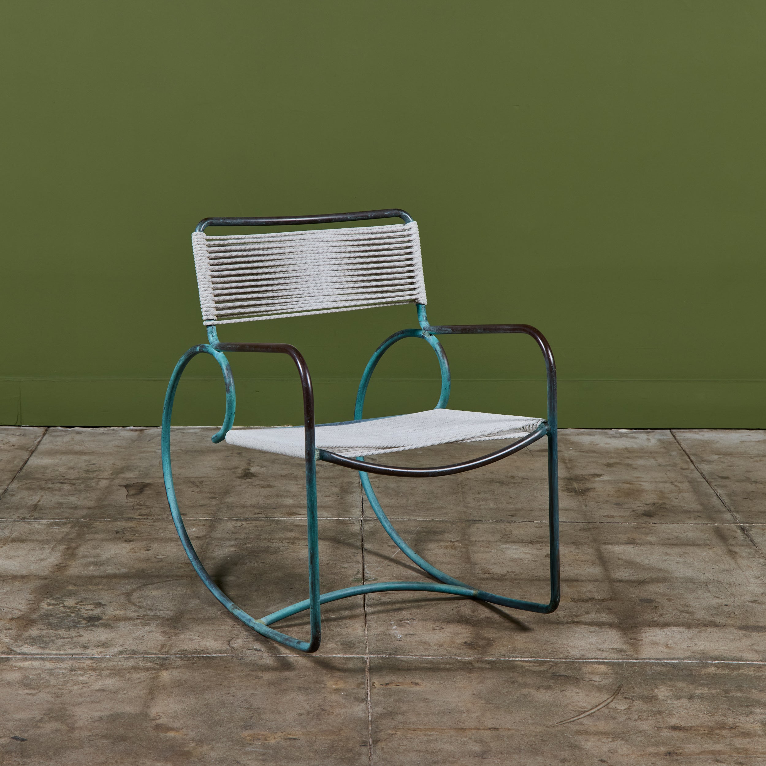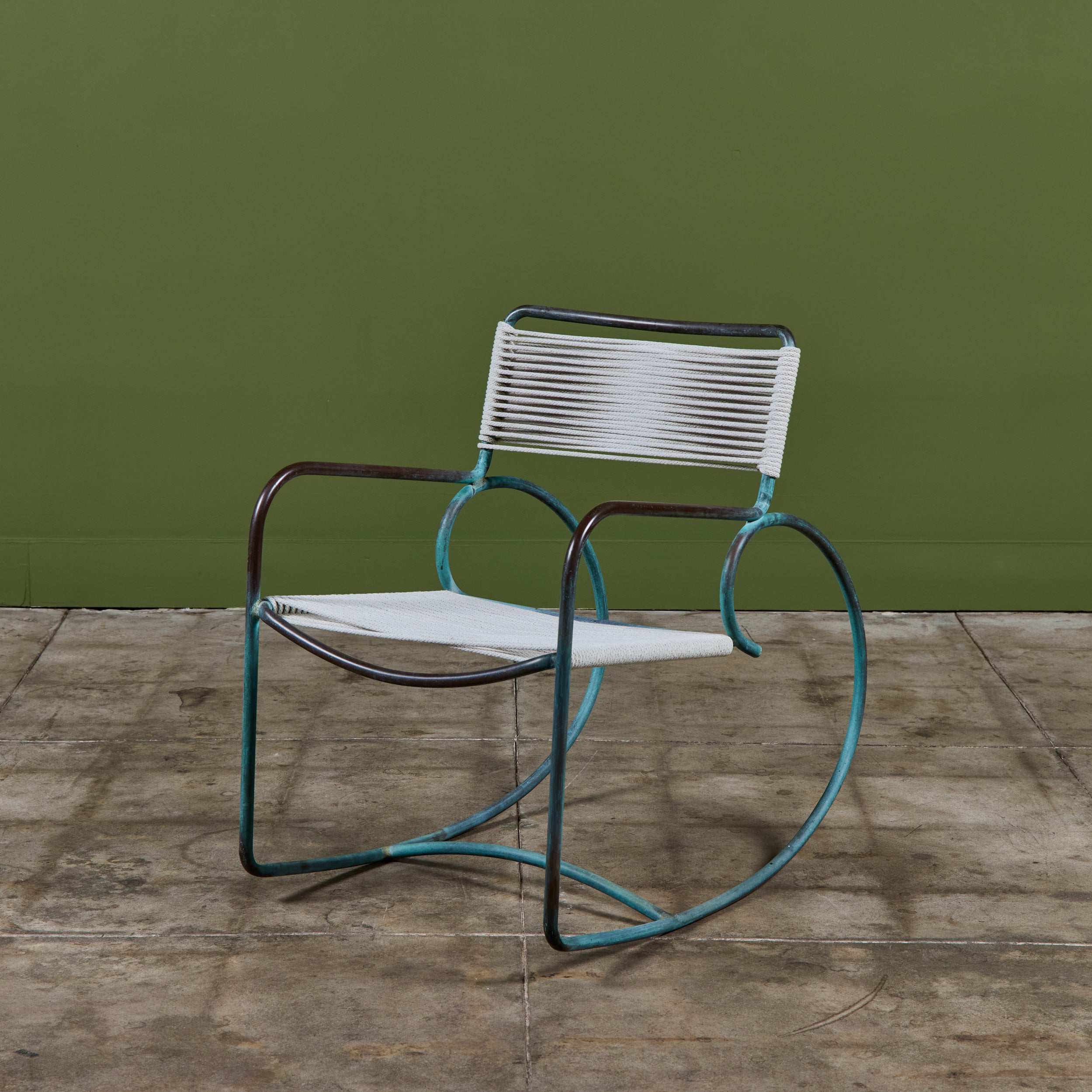 Patio dining set featuring a 48.5" round dining table with four bronze rocking chairs designed by Walter Lamb and produced by Brown Jordan. The chairs have a sculptural shape, with a single formation of tubular bronze forming the backrest, arms, exaggerated round runners, with a stylistic curlicue at each end. The back and seat are strung with cotton rope, lightly glazed to render it suitable for outdoor use. The 48.5" patio dining table in patinated bronze. The round frame is described by two concentric rings of bronze with radial supports and a circular bronze base. The round tabletop is a single piece of hammered glass that fits inside the bronze frame.