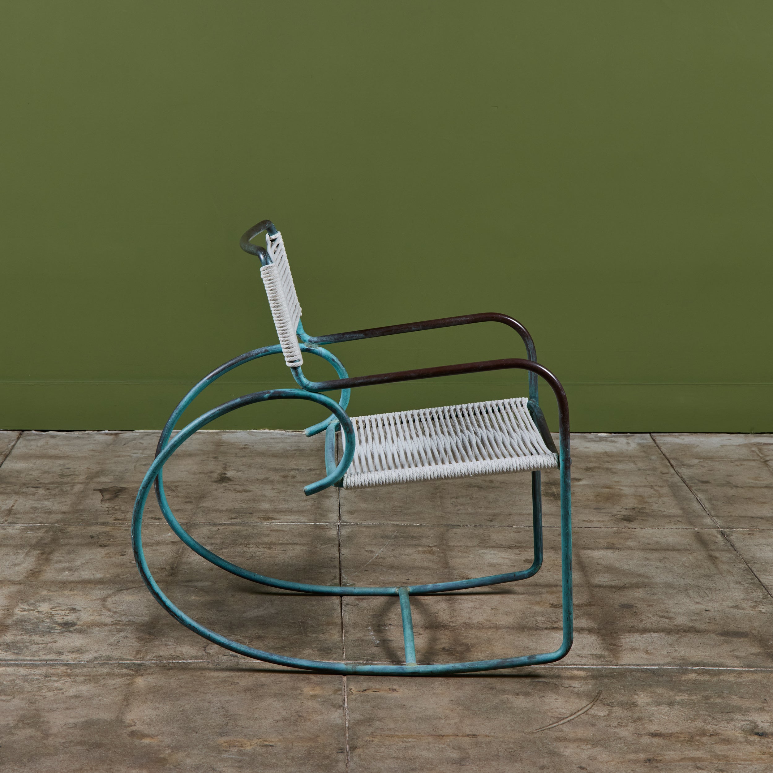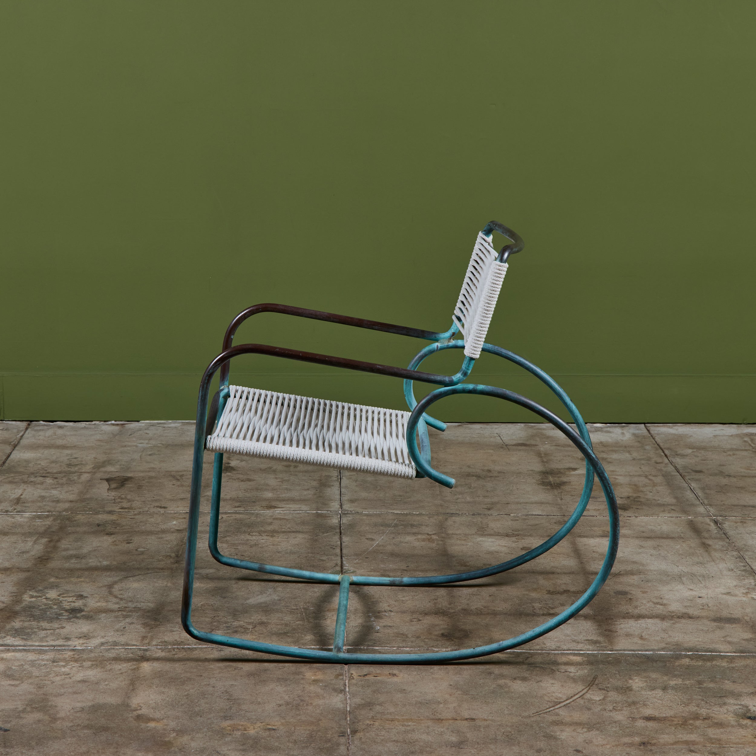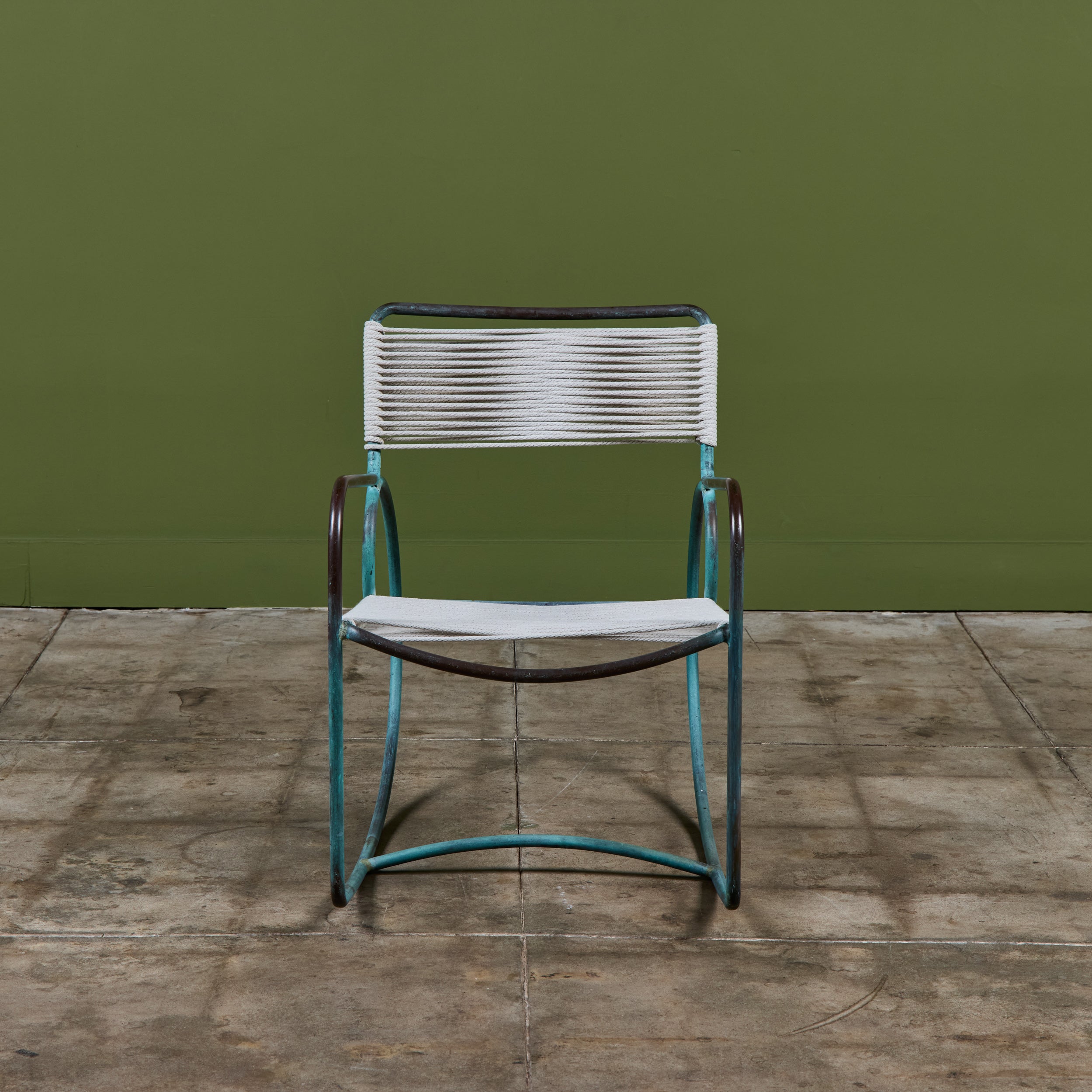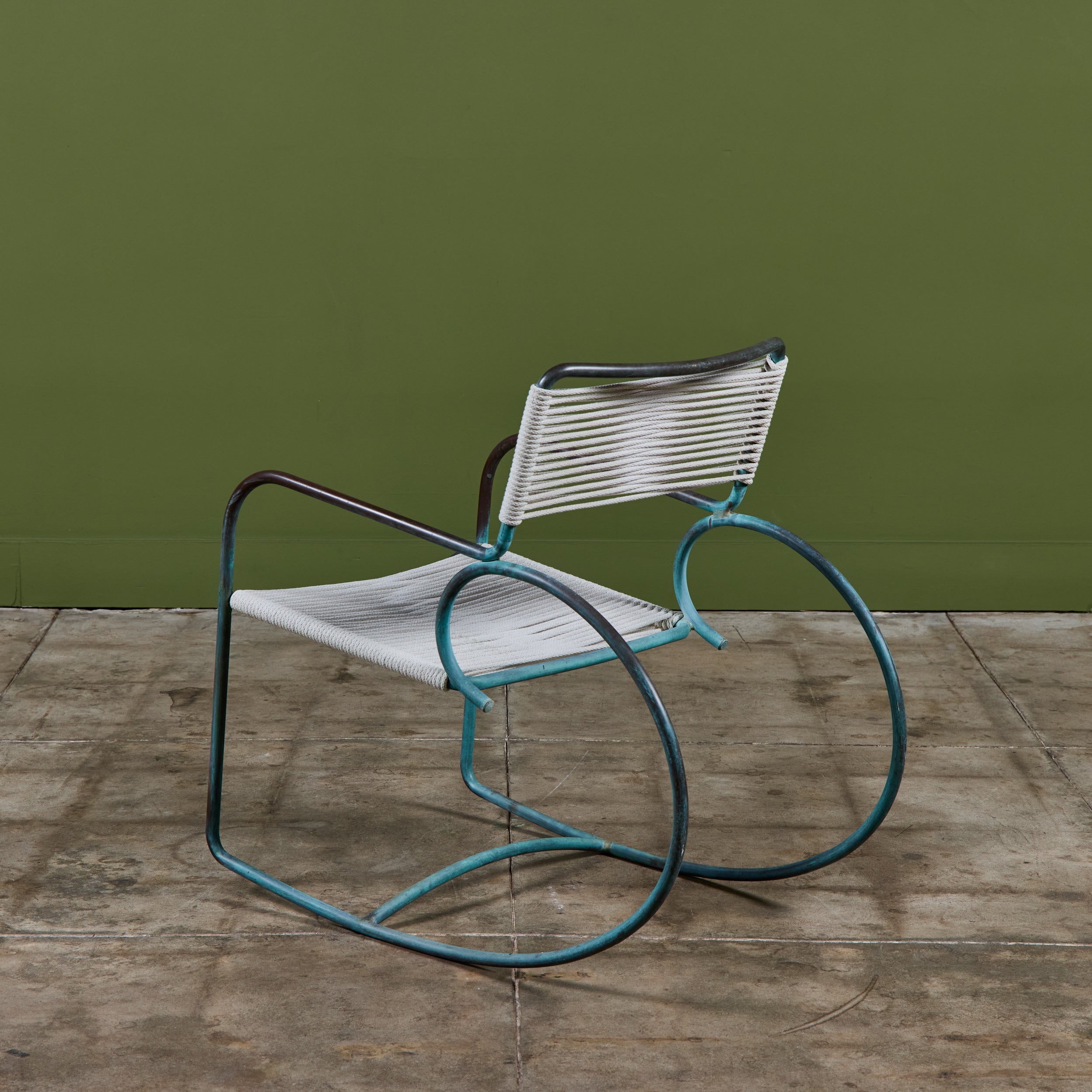 Patio dining set featuring a 48.5" round dining table with four bronze rocking chairs designed by Walter Lamb and produced by Brown Jordan. The chairs have a sculptural shape, with a single formation of tubular bronze forming the backrest, arms, exaggerated round runners, with a stylistic curlicue at each end. The back and seat are strung with cotton rope, lightly glazed to render it suitable for outdoor use. The 48.5" patio dining table in patinated bronze. The round frame is described by two concentric rings of bronze with radial supports and a circular bronze base. The round tabletop is a single piece of hammered glass that fits inside the bronze frame.
