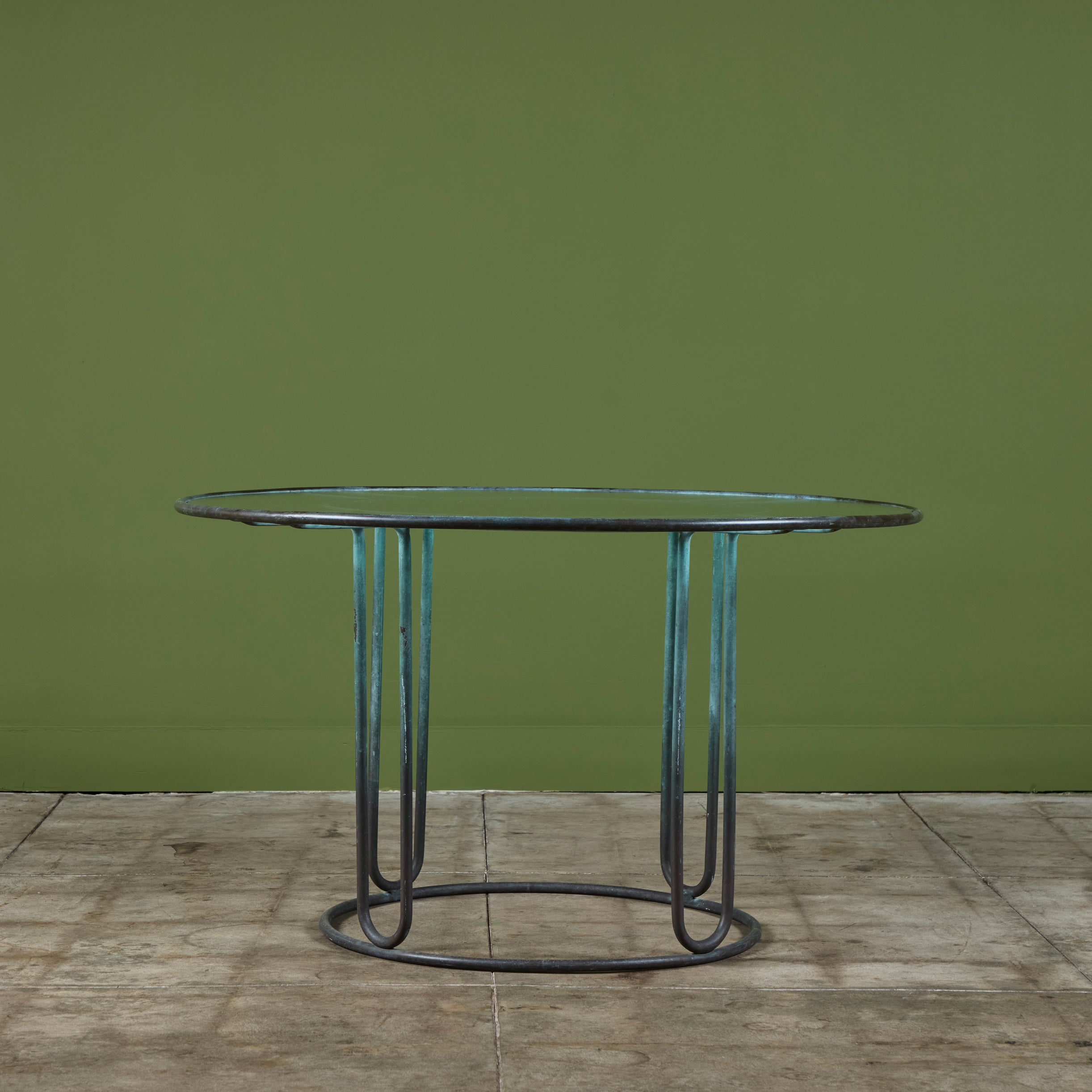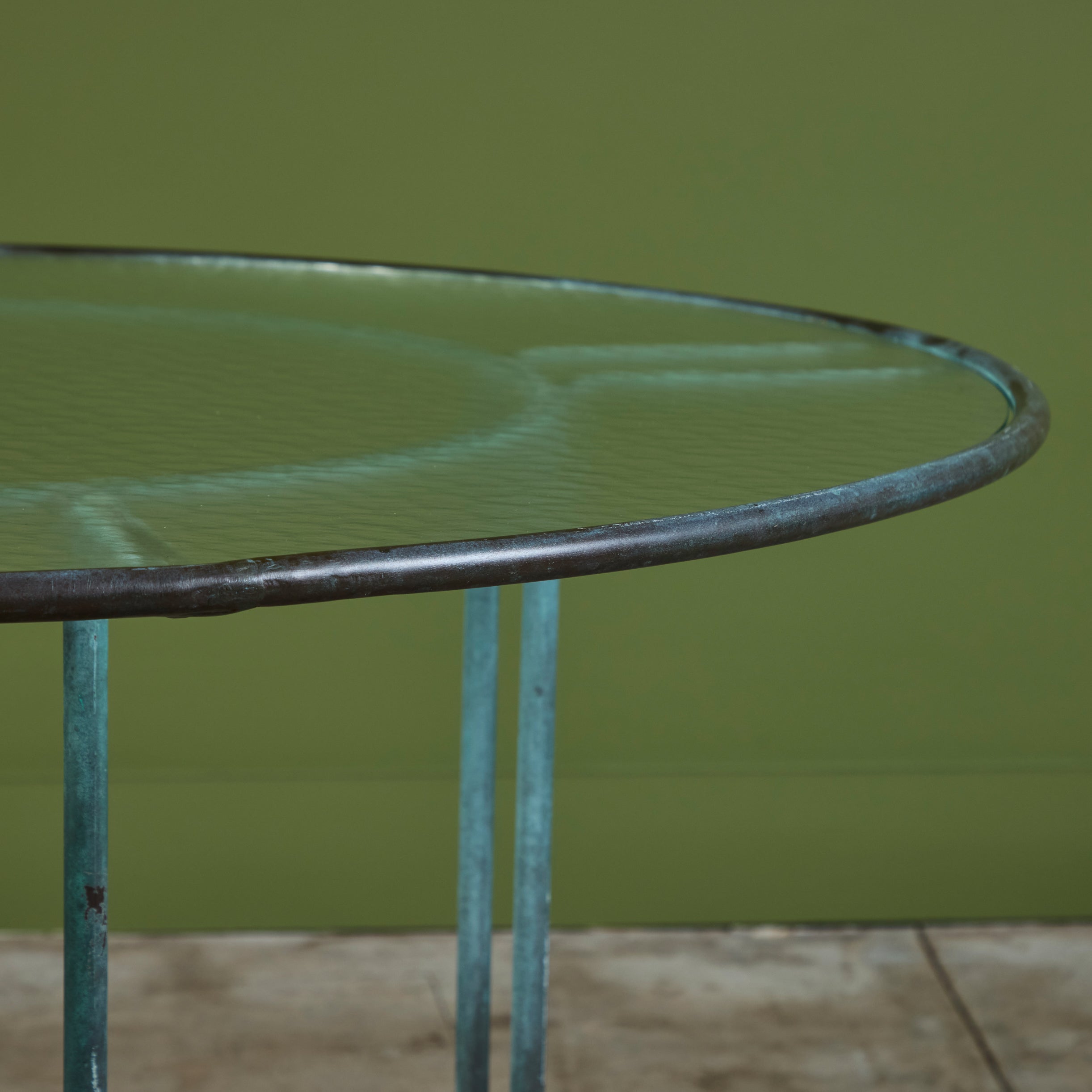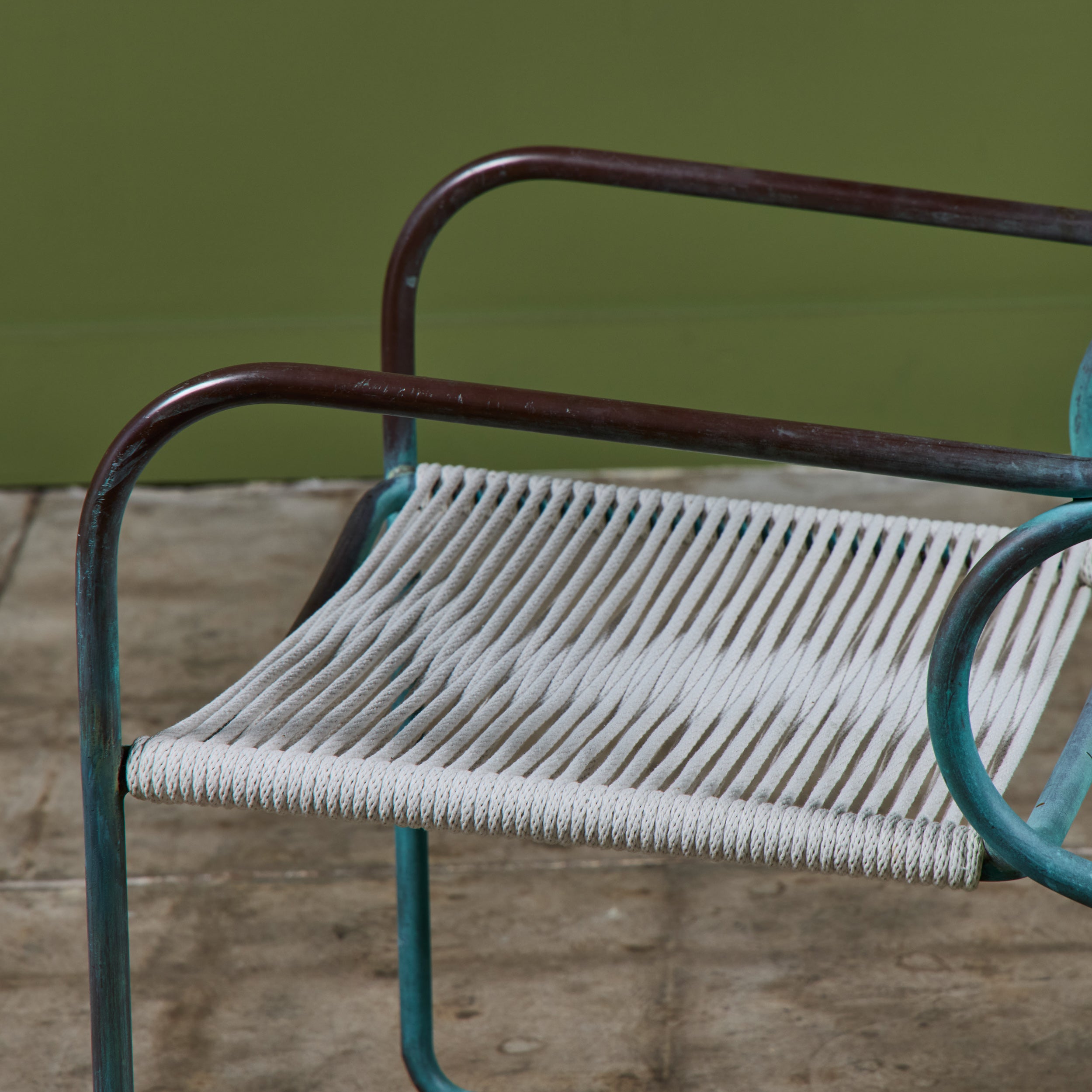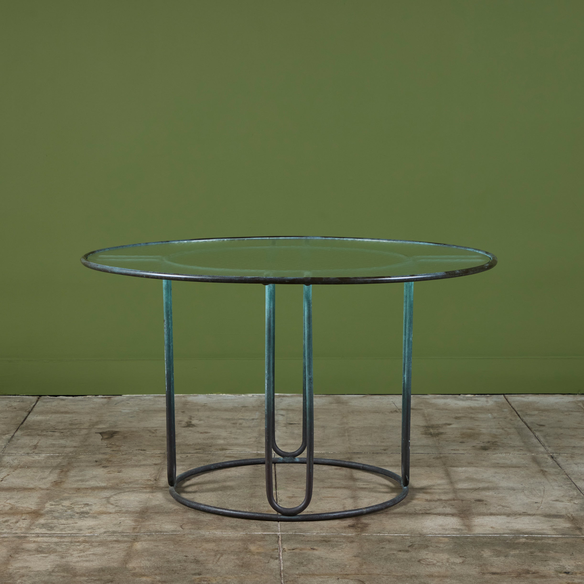 Patio dining set featuring a 48.5" round dining table with four bronze rocking chairs designed by Walter Lamb and produced by Brown Jordan. The chairs have a sculptural shape, with a single formation of tubular bronze forming the backrest, arms, exaggerated round runners, with a stylistic curlicue at each end. The back and seat are strung with cotton rope, lightly glazed to render it suitable for outdoor use. The 48.5" patio dining table in patinated bronze. The round frame is described by two concentric rings of bronze with radial supports and a circular bronze base. The round tabletop is a single piece of hammered glass that fits inside the bronze frame.