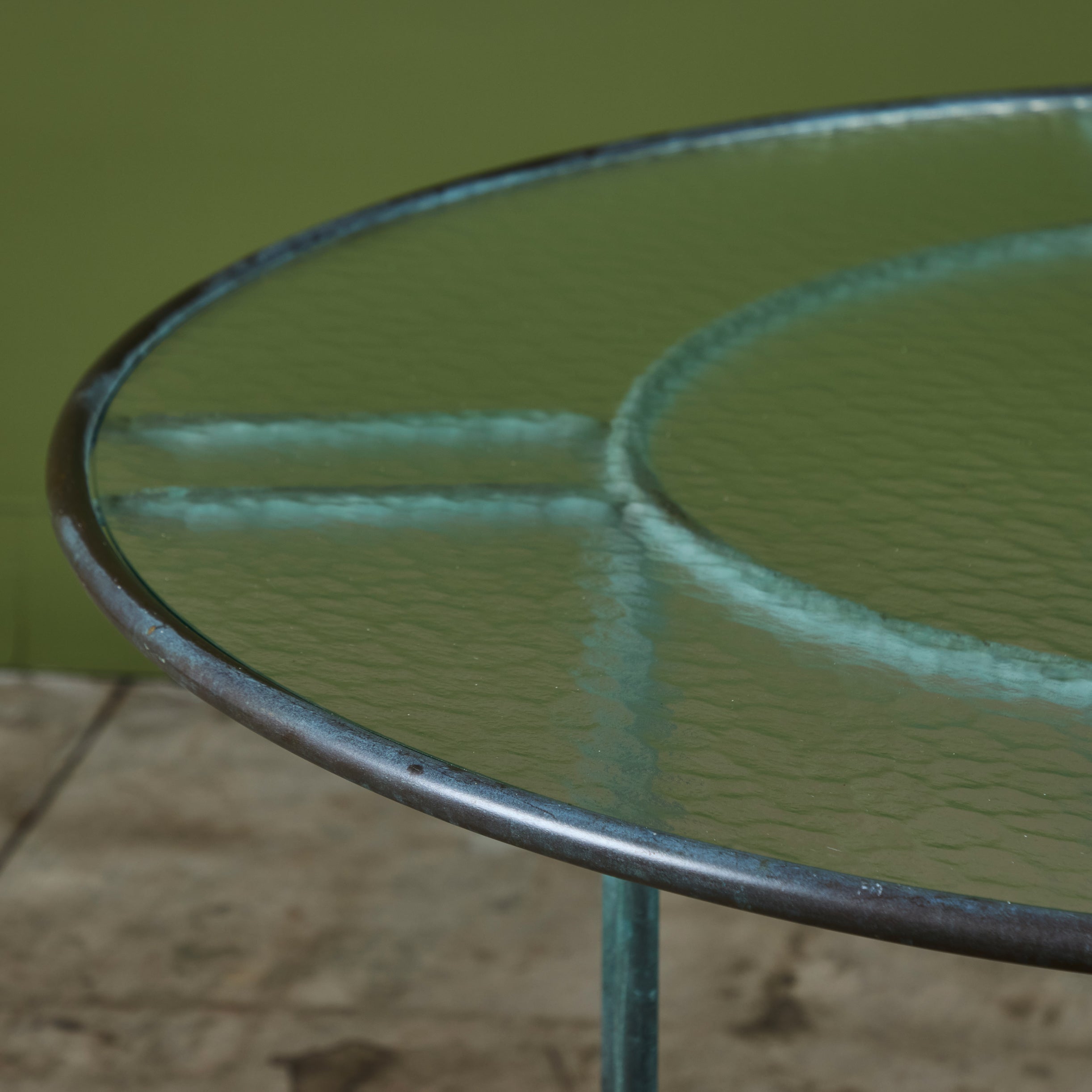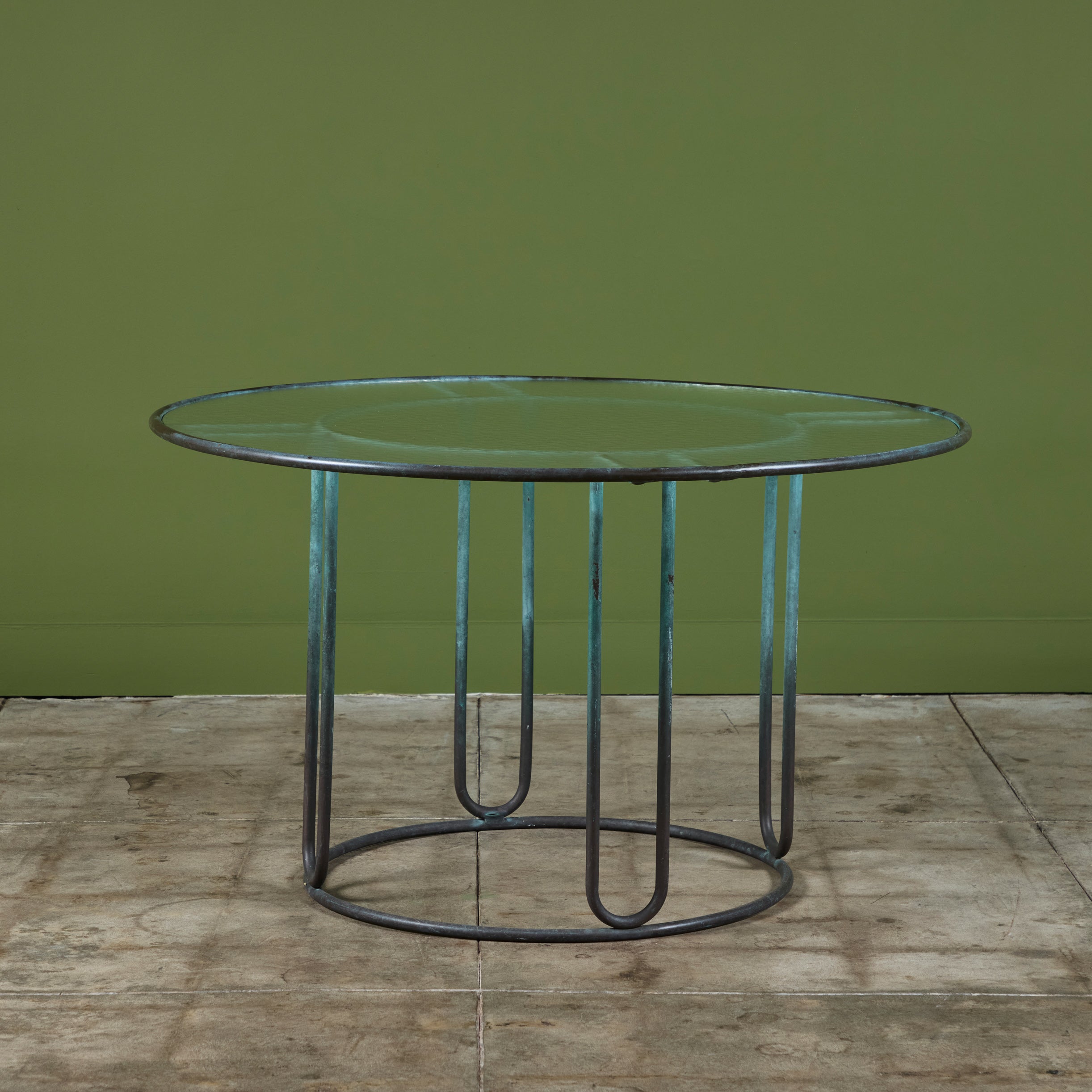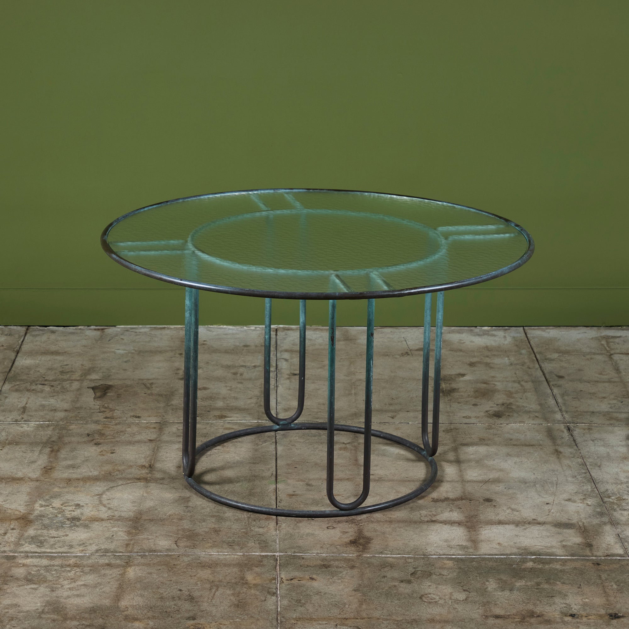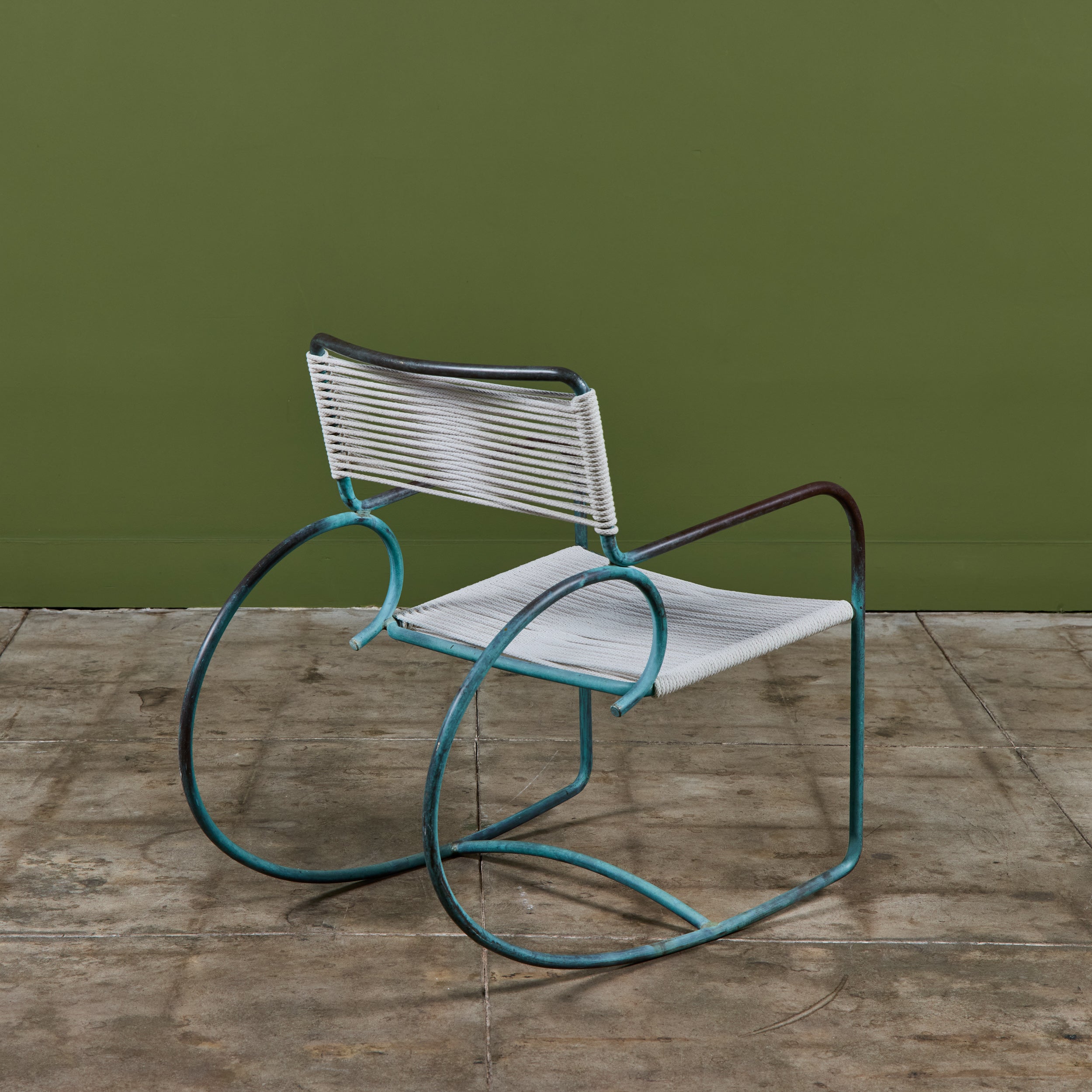 Patio dining set featuring a 48.5" round dining table with four bronze rocking chairs designed by Walter Lamb and produced by Brown Jordan. The chairs have a sculptural shape, with a single formation of tubular bronze forming the backrest, arms, exaggerated round runners, with a stylistic curlicue at each end. The back and seat are strung with cotton rope, lightly glazed to render it suitable for outdoor use. The 48.5" patio dining table in patinated bronze. The round frame is described by two concentric rings of bronze with radial supports and a circular bronze base. The round tabletop is a single piece of hammered glass that fits inside the bronze frame.