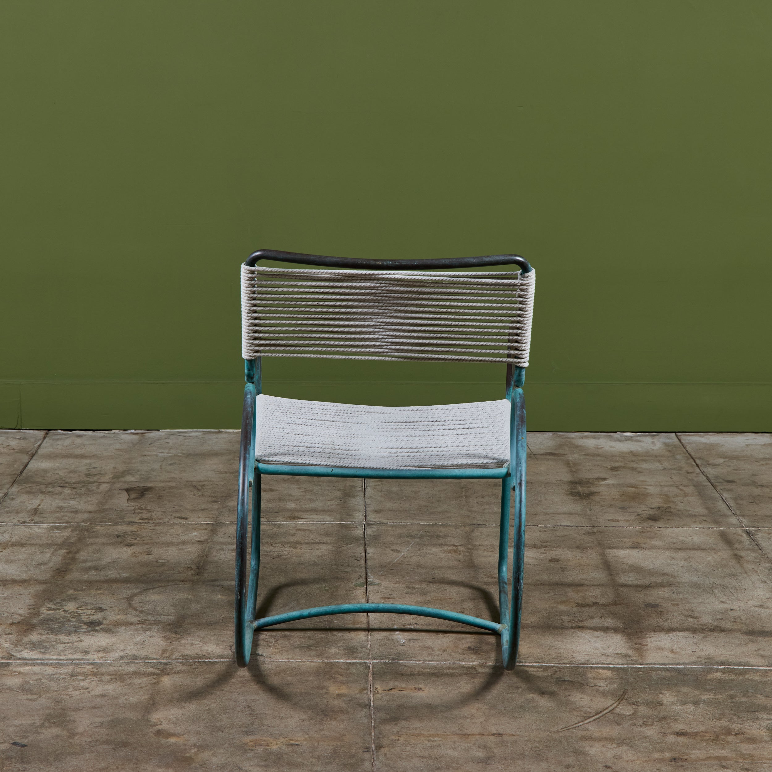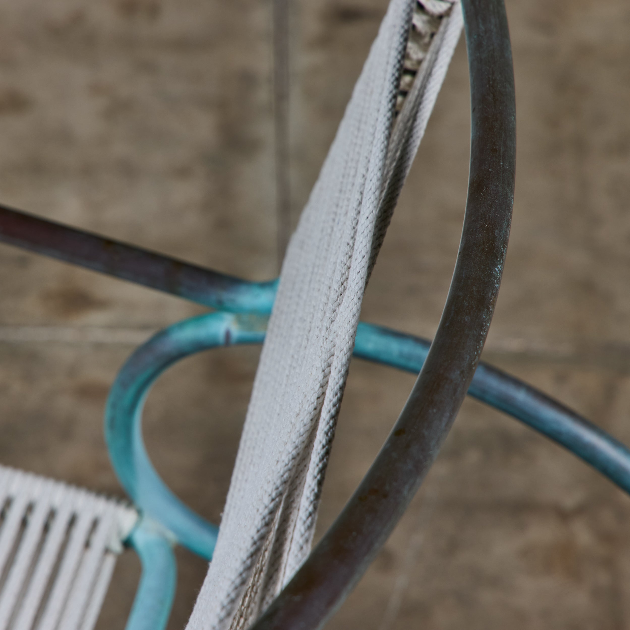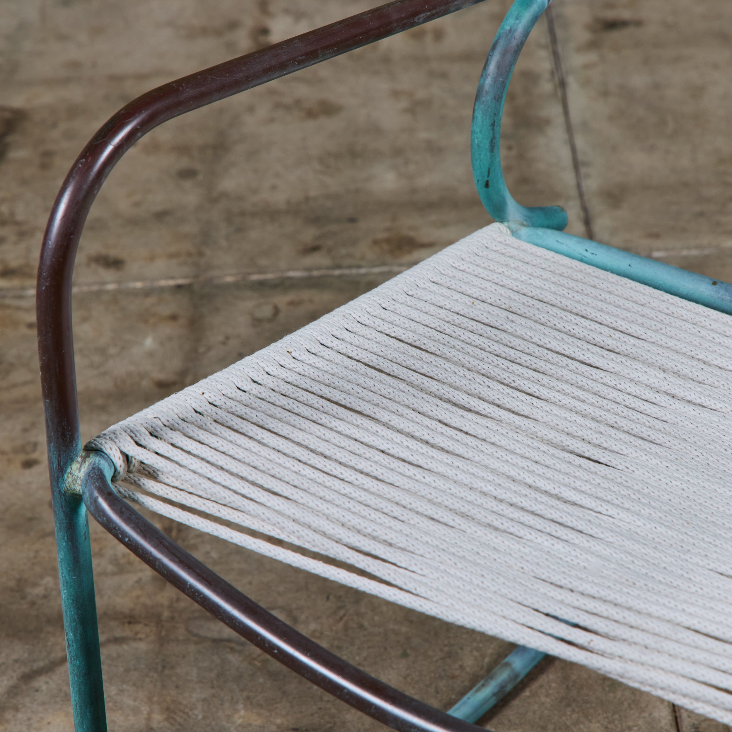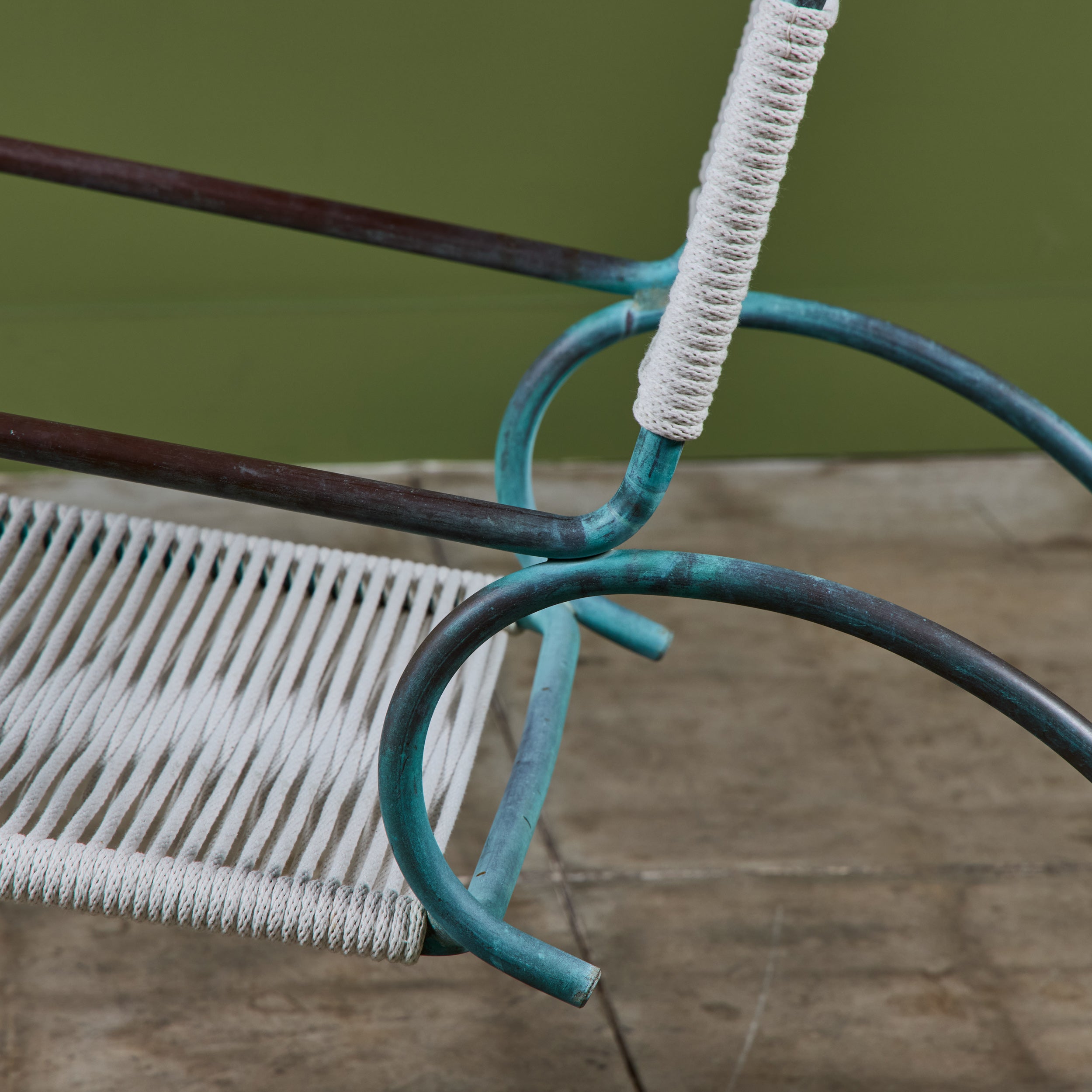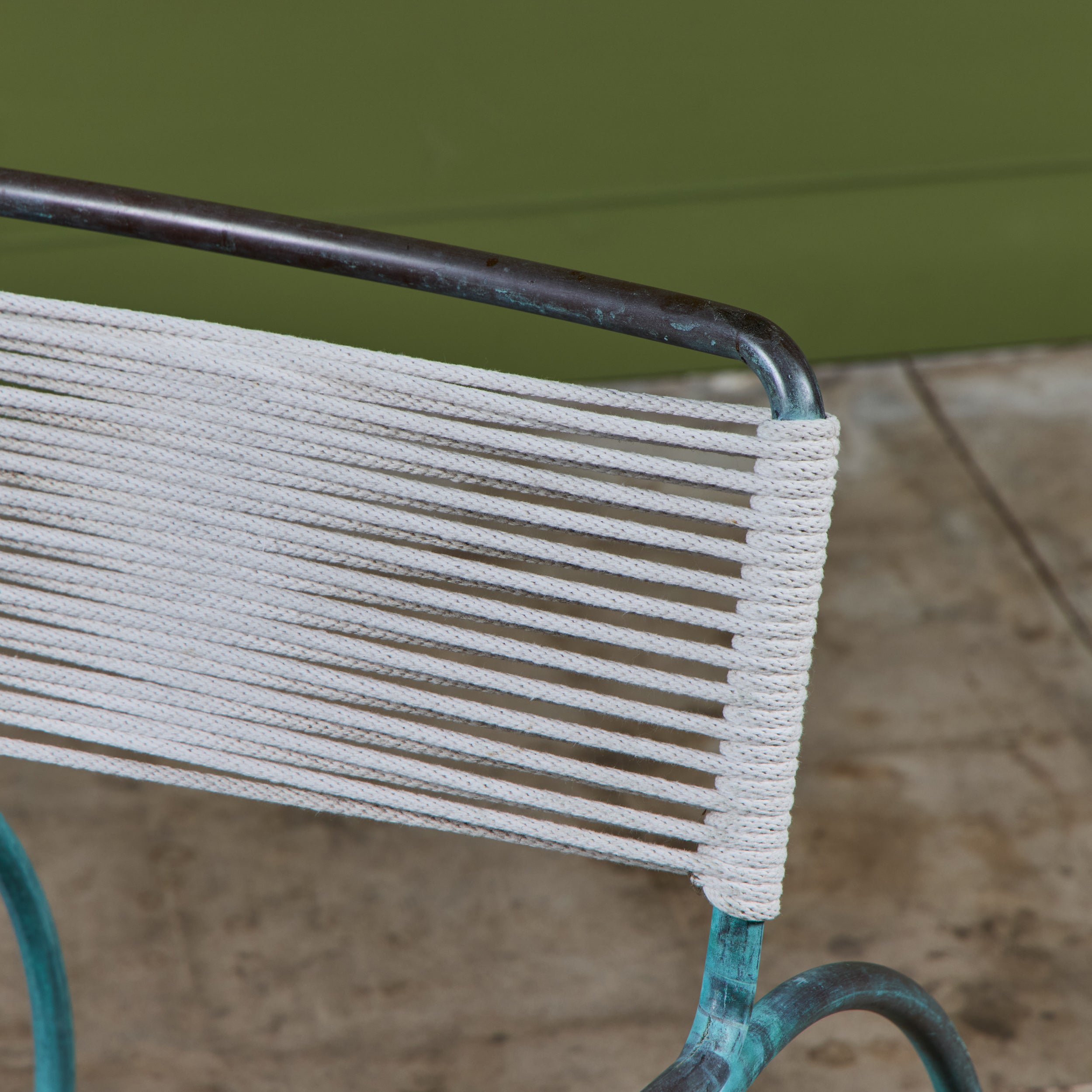 Excellent restored condition; The bronze carries an age-appropriate patina and the seat has been re-strung with yacht cord according to the original design. Dining table has new glass.