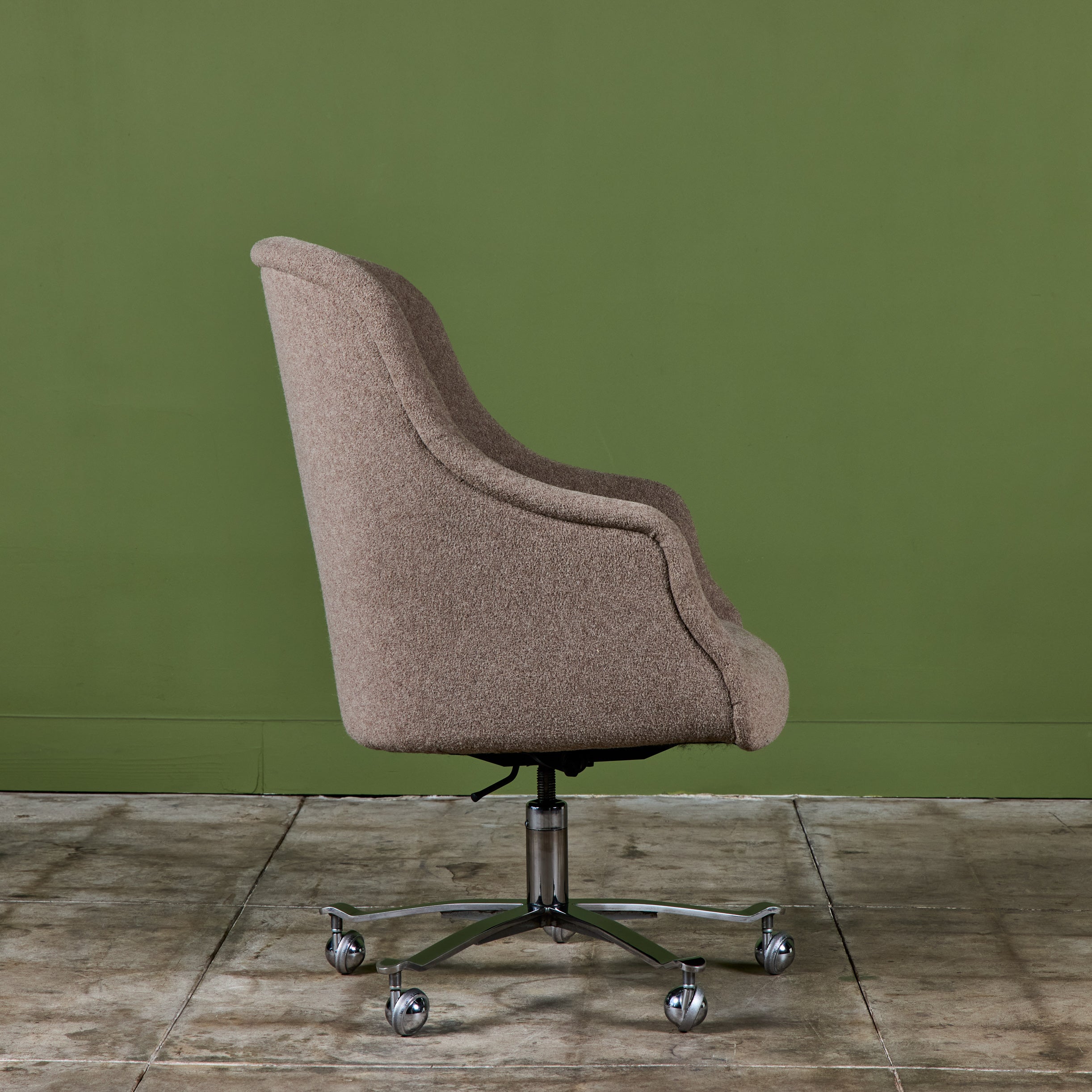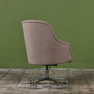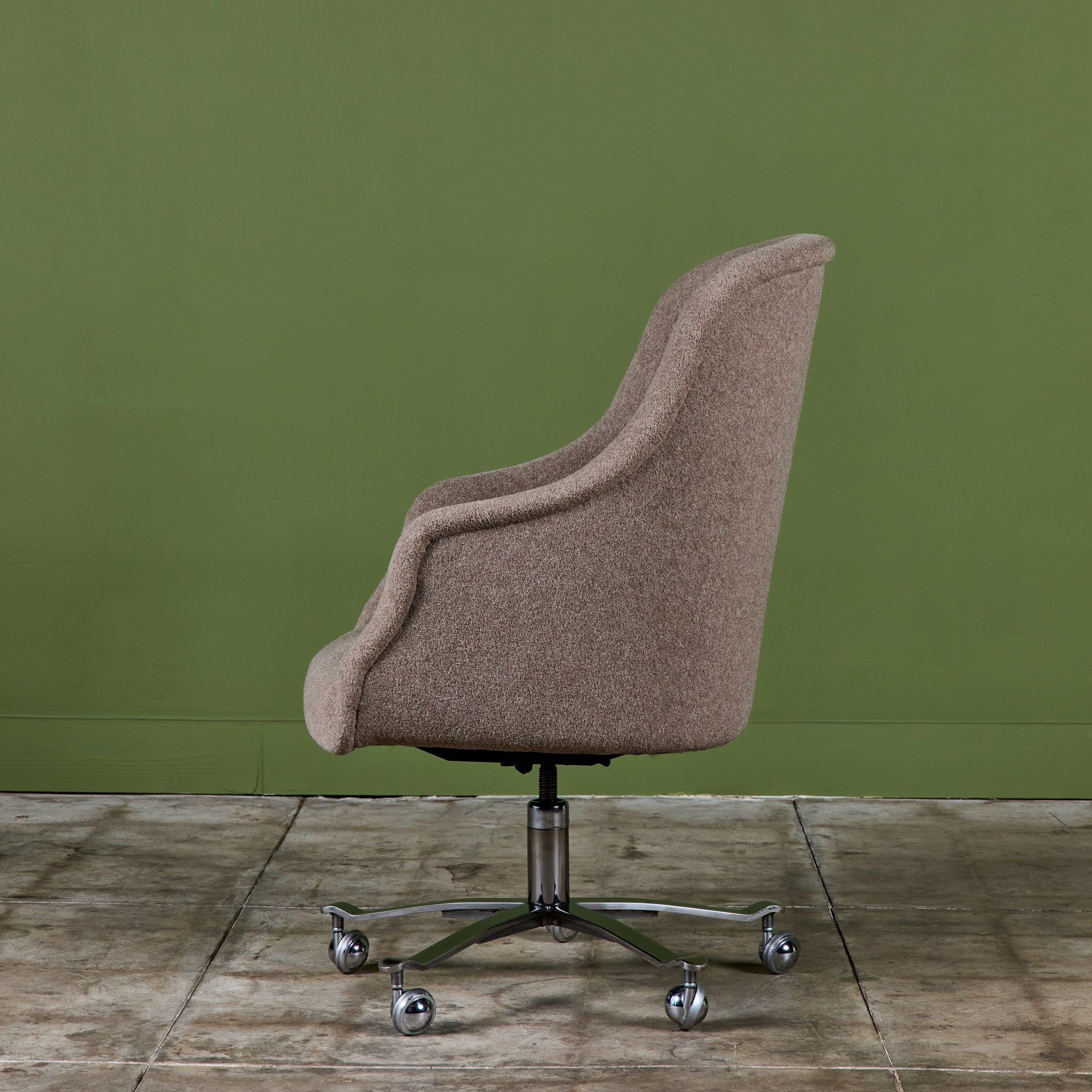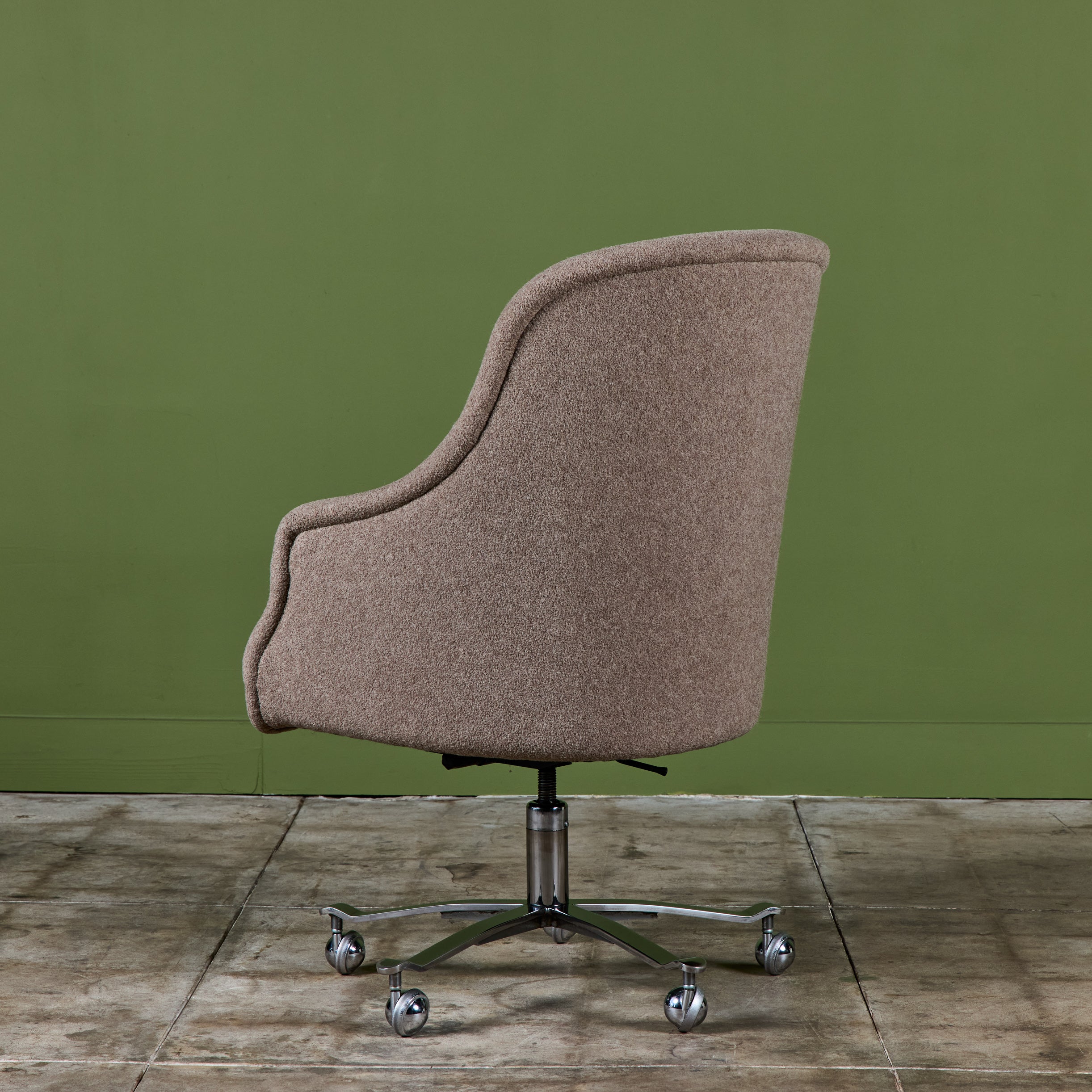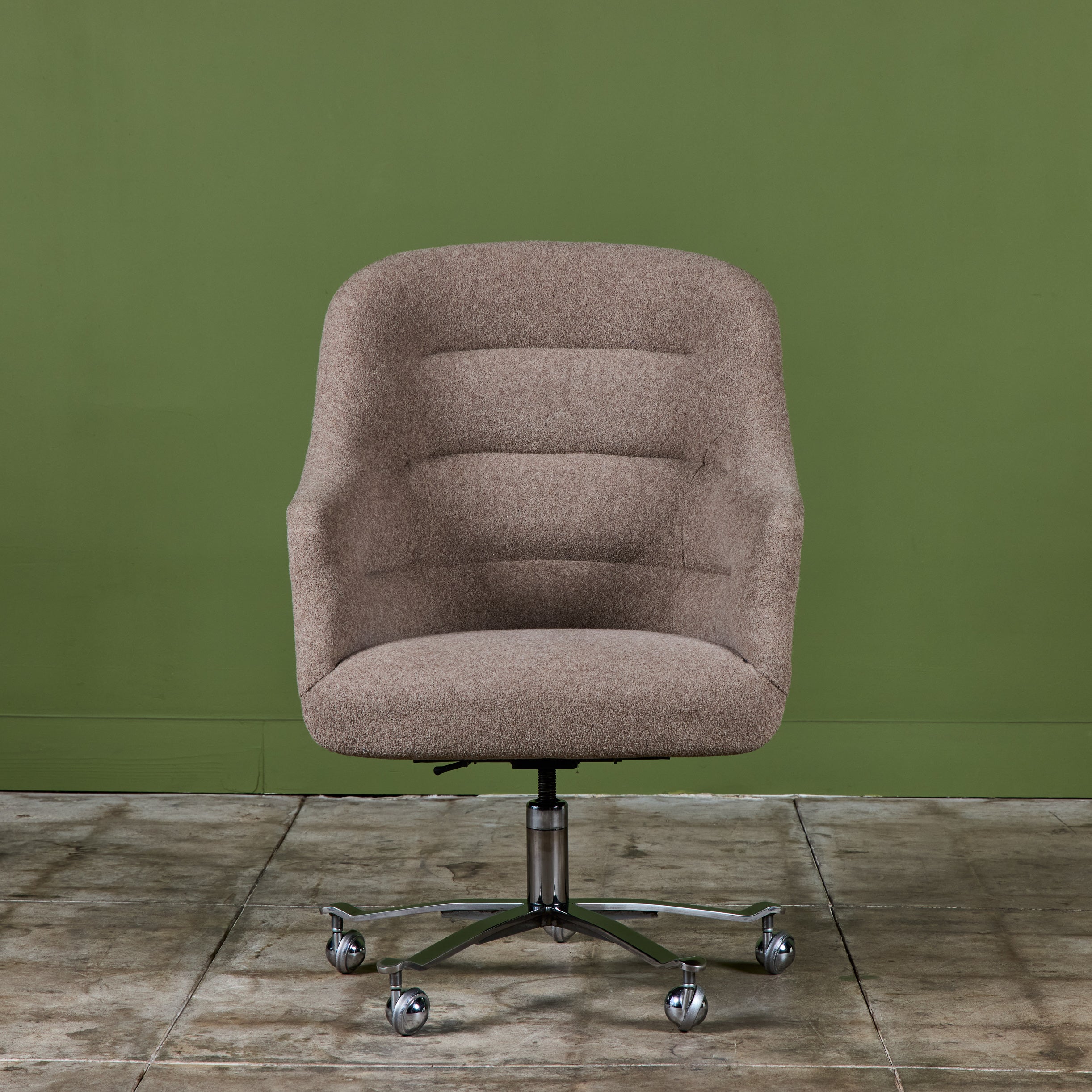 Ward Bennett upholstered Desk Chair for Brickel Associates, c.1960s, USA. This chair features a curved frame and all over upholstery. The chair has both a tilt and swivel mechanism and rests on a five star stainless steel caster.